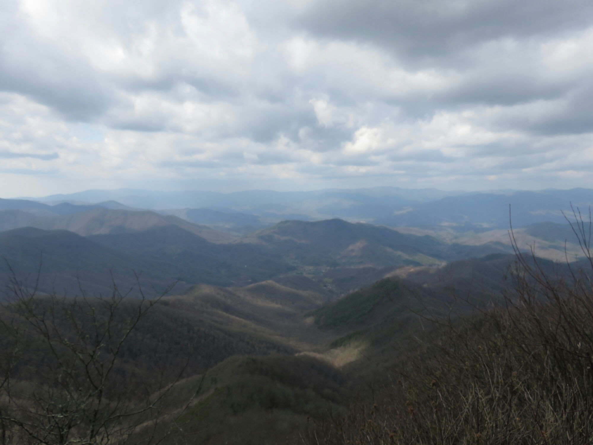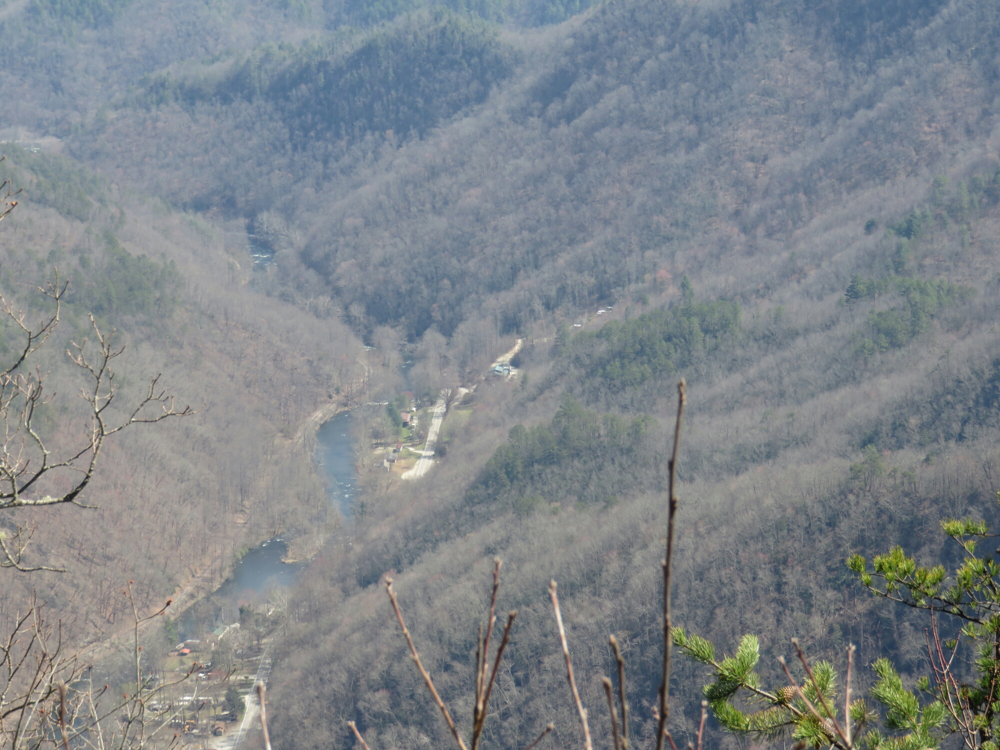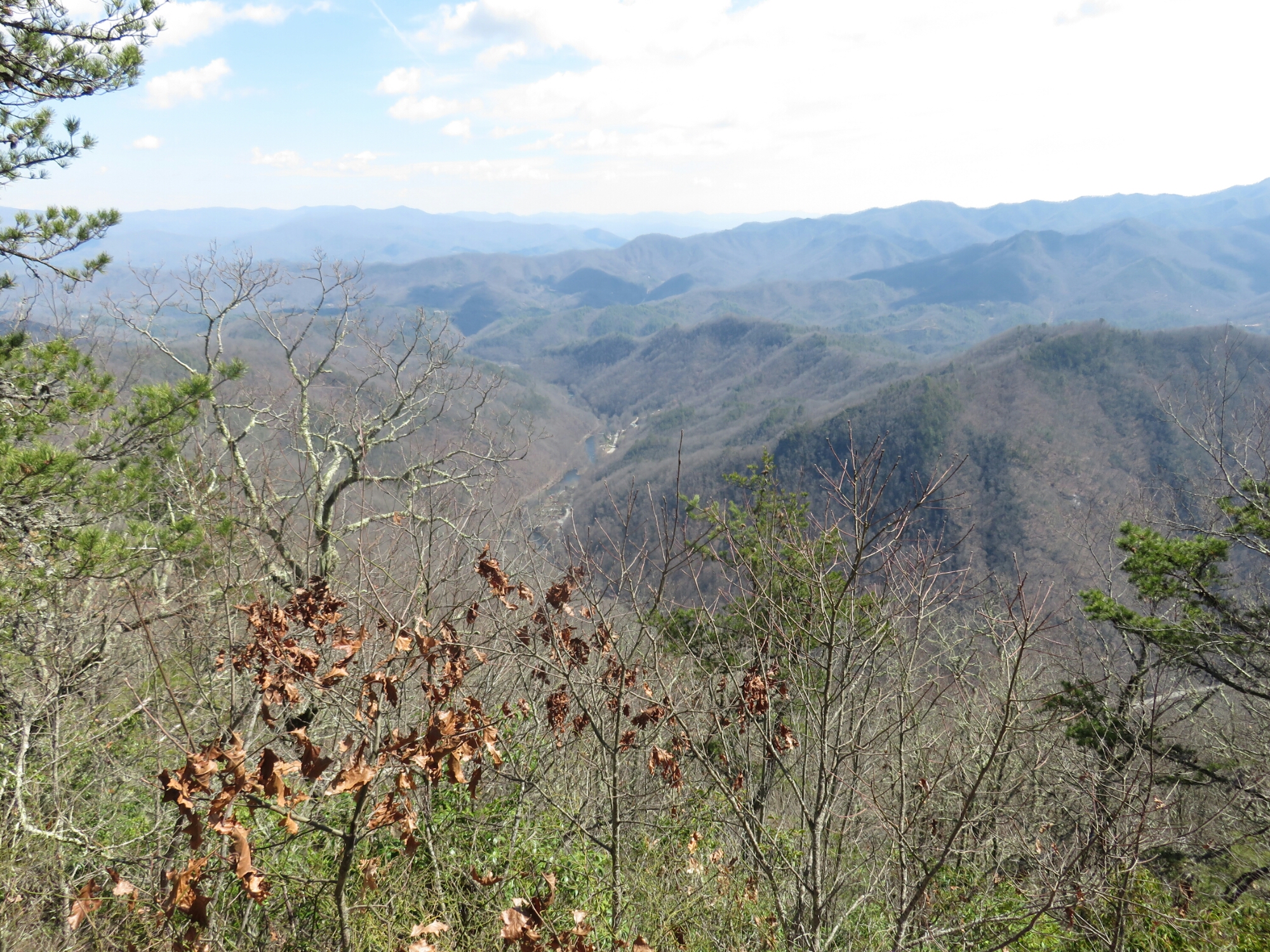 Zuerst wieder trockenes laub und unerträgliche Hitze. Am Anfang dachte ich, das wird so nichts heute. Aber irgendwann findet man sich damit ab und freut sich wieder einen kleinen Hügel erklommen zu haben, um dann festzustellen, dass dahinter noch ein größerer liegt. Das wiederholt sich hier ständig. Also mach Laubwald, kamen wir auf der anderen Seite des Berges in einen grünen Tunnel. Hier war dann auch endlich die Quelle. Beide eingezeichneten Wasserquellen davor konnten wir nicht finden und ich war schon 2 Milen ohne unterwegs. Sehr erlösend. Doch dann ging es richtig los. Keine Serpentinen mehr sondern direkt bergauf. Das war wirklich steil, 45Grad, vielleicht?! Ab und zu ein Blick zurück ins Tal und das NOC bevor der Cheoah Bald erreicht wurde.