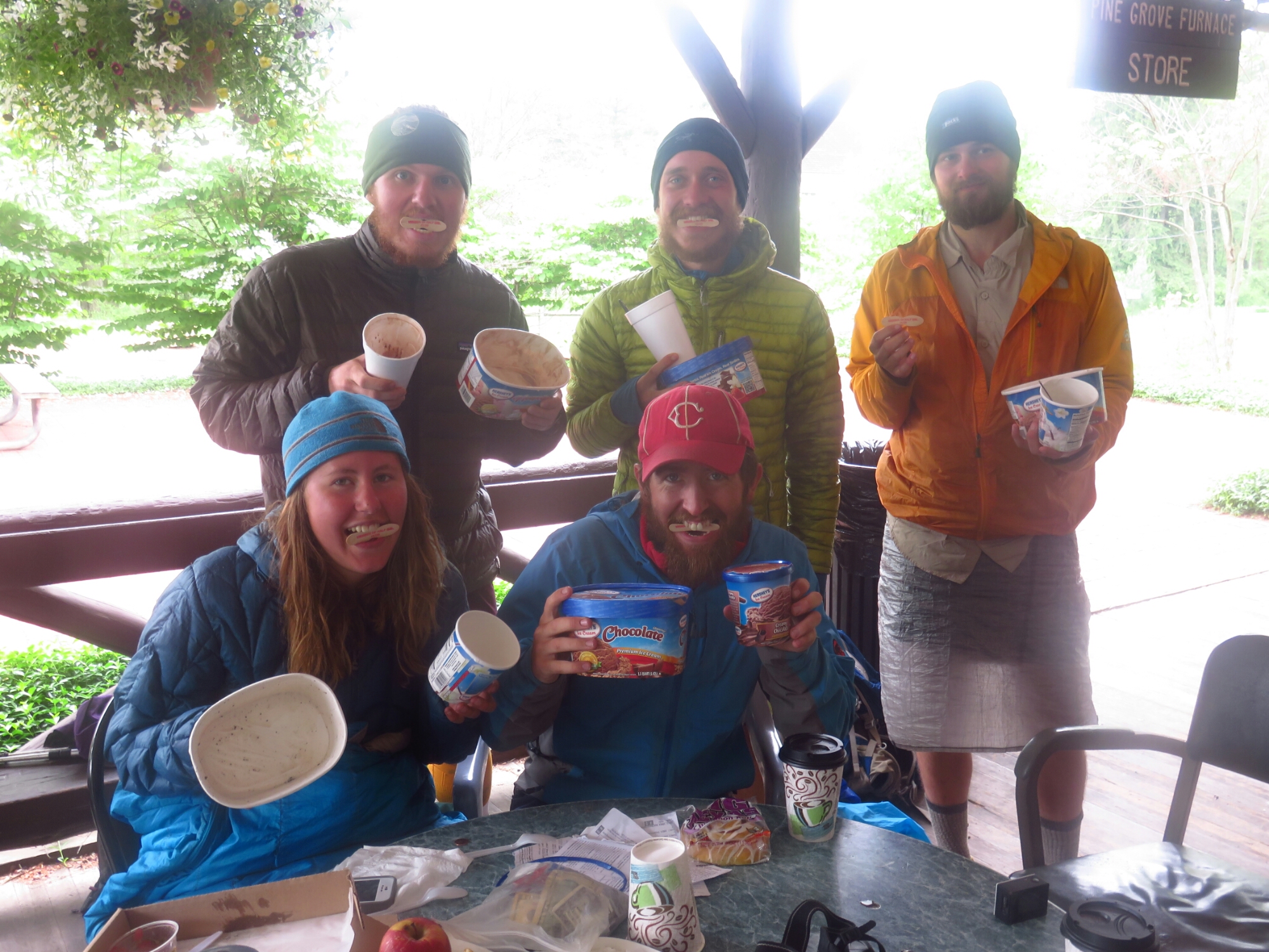 Der Plan um 7 aufzustehen schlägt fehl. Es regnet und keiner ist Motiviert genug der Erste zu sein, die Luft frei zugeben. Naja, irgendwann kommt Regung in den Haufen. Es ist kalt und ein wenig ungemütlich. Aber gegen 8 bin ich unterwegs. Mit Musik geht es mit Lichtgeschwindigkeit zur Half Gallon Challenge. Am Shelter zwischendurch liegt noch der Geruch von Verbranntem in der Luft. Eins der zwei ist abgebrannt. Wir kreuzen auch den HalfWay Point. Nicht so spektakulär wie die letztes Jahre, aber für ein Foto reichts. Am kommenden alten Schild mache ich noch ein Foto. Am Pine Grove Furnance State Park warte ich noch auf den Rest vom Shelter. Ich wähle Schoko, Vanille & Erdbeere. Es ist kalt und wir ziehen an was wir haben. Doch nach einem Liter Eis hilft auch das nichts mehr. Ich schlüpfe in meinen Schlafsack und vollende die ca. 1.9 Liter so. Ich musste wirklich kämpfen und habe über eine Stunde gebraucht. Danach war nichts angesagt. So wenig Bewegung wie möglich, bevor wir nach einiger Zeit ins AT Museum gegangen sind. Recht interessante Ausstellungsstücke über die überall bekannten Wanderer. Gratis Wlan. Also schnell noch etwas hochladen und skypen. Die letzten beiden Tage waren leider noch nicht fertig. Sry.