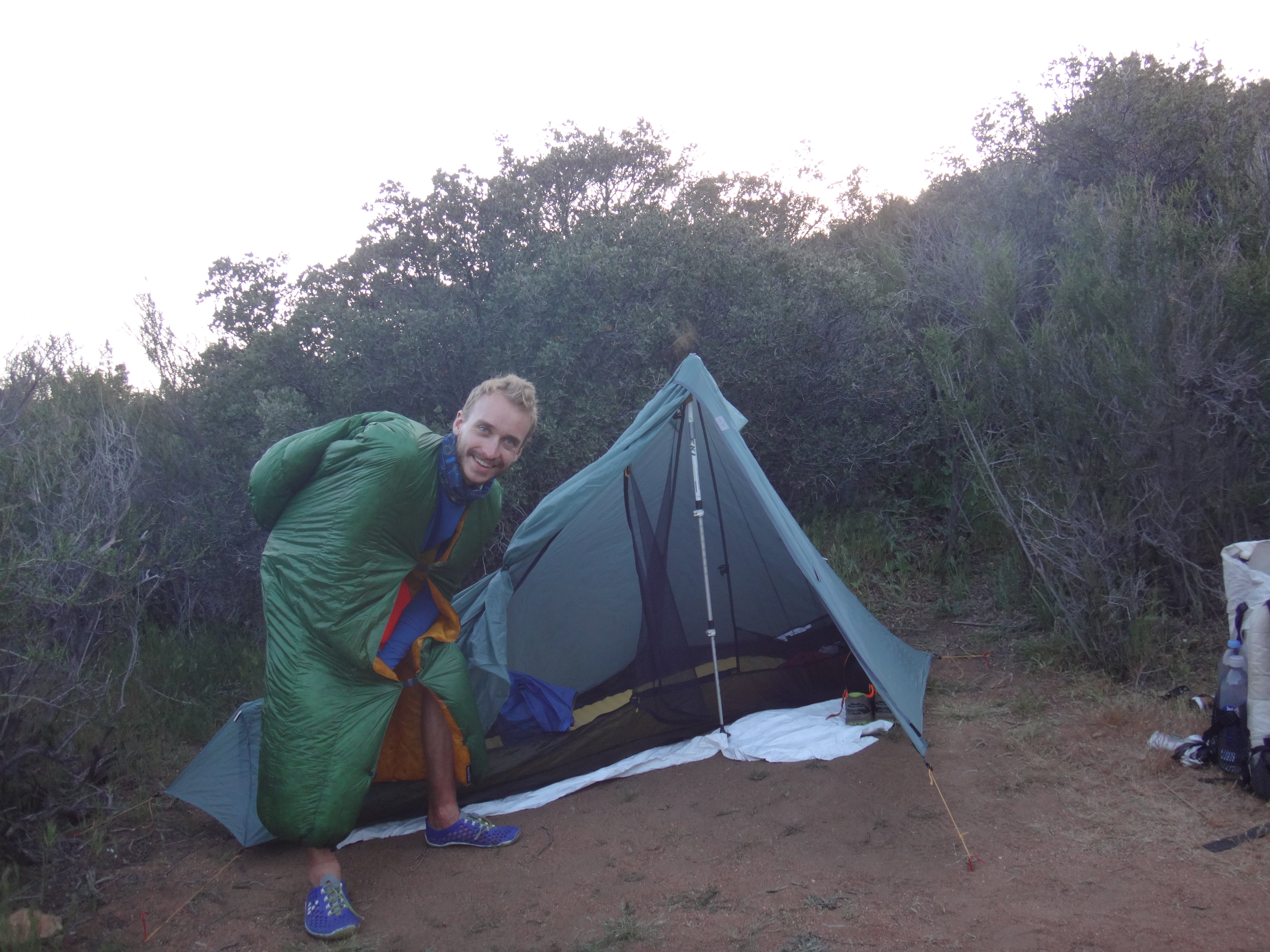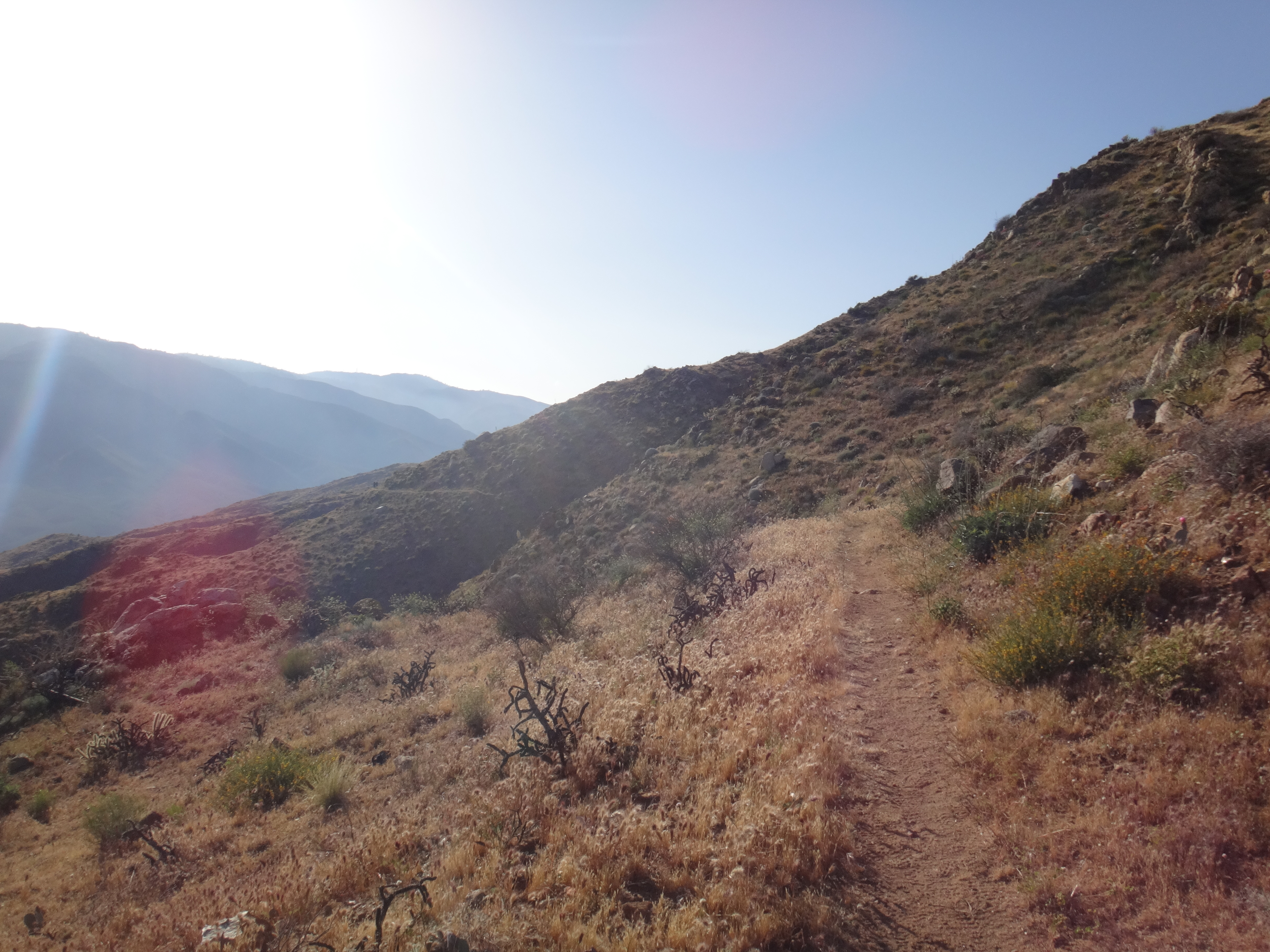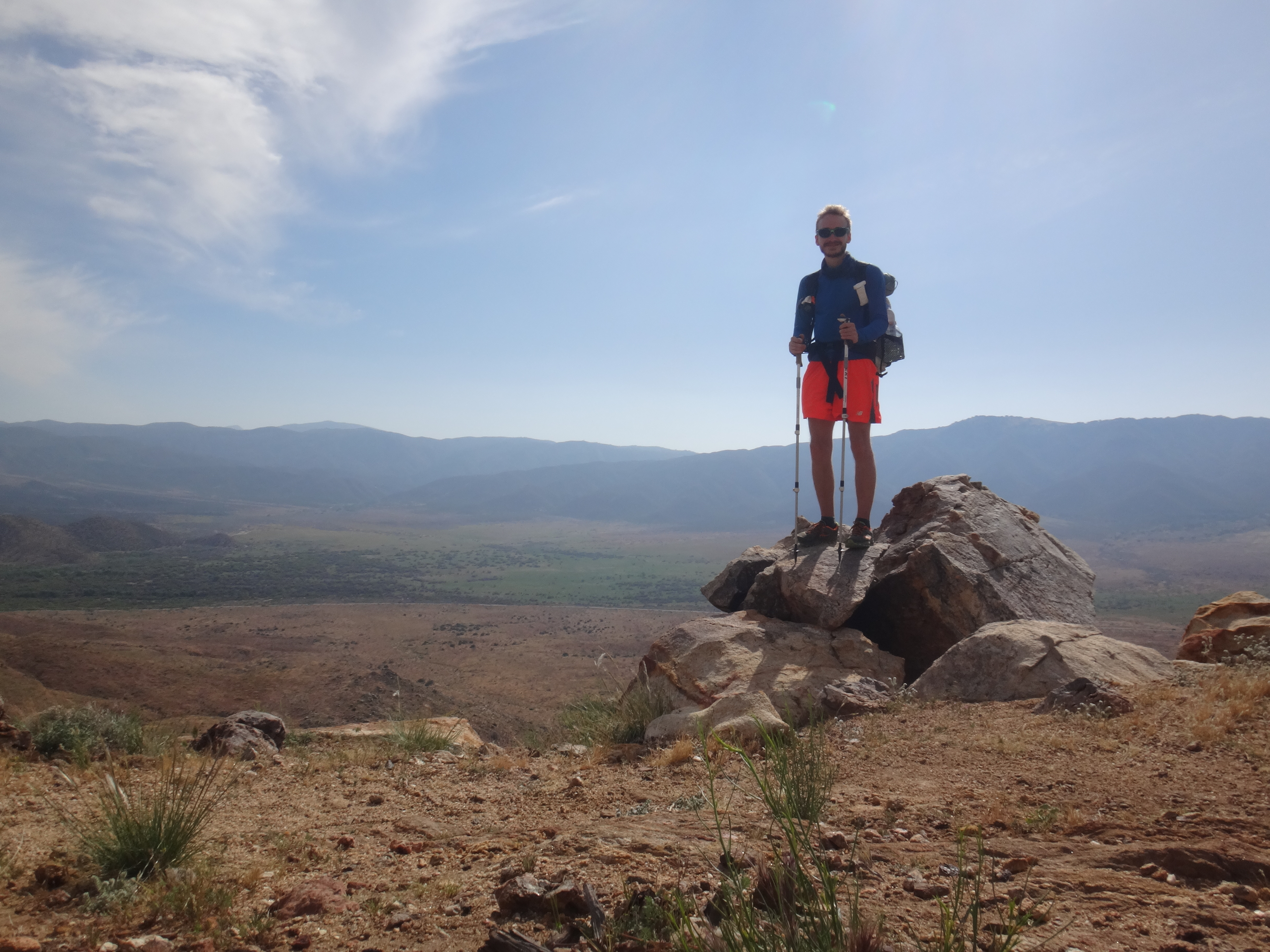 Die sonne bruzelt und ich bin ein wenig in Zeit Not. Wollte eigentlich früher starten und vor Sonnenuntergang ankommen und im Bettchen liegen. Also Füße in die Hände und ab die Luzi. Nach 5 Minuten der erste Notstopp. Akku der Kamera muss gewechselt und Blase geleert werden. Da muss man aber auch an einer Bergflanke Glück haben ein nicht all zu offenes Plätzchen zu finden ;). Dann aber wirklich mit vollem Tatendrang und frisch gestärkt hinauf. Es ist nicht steil, dafür lang. In hunderten Kurven wir der Aufstieg zu einer Achterbahnfahrt. Rechts runter, links geradeaus, welle, scharfe Rechtskurve, looping, ach wie auch sonst geht es wie ein betrunkener auf einem leeren riesigen Parkplatz in vielen schlangenlinien den Berg hinauf. Zum ersten Mal sehe ich auch dickere Kakteen. Es blühen viele Blumen und meine Nase läuf unaufhaltsam. Schon im Hotel hab ich geblutet wie ein abgestochenes Schwein. Es wollte einfach nicht aufhören. Vielleicht bin ich gegen etwas allergisch. Naja, die Sabber im Ärmel verstauend geht es weiter wie ein betrunkener. Nach 2 Stunden unaufhaltsamer Höhenerklimmung lege ich eine Pause im so ersehnten Schatten ein. Kurz einen halben Liter gekippt und weiter gehts. Es ist unbeschreiblich wie man 22 Kilometer in zehn geradlinige Kilometer verstauen kann. Aber es geht. Man denke an den Parkplatz. Nachdem die Höhenmeter fallen fallen auch die Kakteen. Abgestorben und schwarz zieren sie den Wegesrand. Erinnert mich an Oktupusse. Mit ihren vielen Armen und verzweigungen. Aber auch die meisten restlichen Pflanzen haben das Handtuch geworfen. Im Sonnenschein geht es immer weiter. Ich halte noch zwei mal. Für Fotos von Mozart sowie den restlichen Tropfen. So langsam wünsche ich mir den ersten markanten Weg Punkt herbei. Ein Pipegate (Zauntür). Irgendwann, als der letzte große Berg nicht mehr fern war erschien auch das Pipegate. Yeahhh. Nur noch 8 Kilometer und es ist erst 16:40. Ich kann es also noch schaffen. Das gibt mir Kraft und meine müden geschundenen Beine bringen wieder 105% Auslastung. Es geht nun in ein Tal. Lang Leistung. Dichte kratzige Büsche wachsen in den Trail. Hier könnte auch jederzeit eine Klapperschlange sitzen. Wenn man dann einen erschrockenen hops macht kann man an manchen Stellen such das zeitliche segnen. Es geht hier teilweise schon sehr steil und tief hinab. Die Talsohle dem Rücken zugewandt kraxel ich nun wieder bergauf. Ganz oben sehe ich einen hiker und drei weitere dahinter. Die kriege ich noch. Trotz müden Füßen habe ich mein Ziel vor augen. Auch das zweite Pipegate kommt nach dem erfolgreichen Anstieg zum Vorschein. Soweit kann es nun ja nicht mehr sein. Soetwas darf man nie denken, erst wenn man das Ziel anfassen kann sollte man das sagen. Selbst wenn man das Ziel auf der anderen Seite der Bergflanke sieht, kann man trotzdem nochmmal 2 stunden irgendwo achterbahn fahren gehen. Also ich bin natürlich erleichtert bald am ziel zu sein, aber es zieht sich elendig. Die drei Mädels überhole ich. Ich kenn sie von gestern an der Wasserquelle am Mittag. Dann hole ich noch ein österreichisches Pärchen, sowie einen Amerikaner ein. Ich puste aus allen Löchern. Meine Knie tun weh und meine Füße sind hundsmüde. Wieso renn ich dann eigentlich noch so über den Trail? Keine Ahnung, weils immer noch geht und eigentlich auch recht spaßig ist. Manchmal schnellt irgend ein Geäst vom Boden gegen meine unterschenkel. Das brennt wie hölle. Direkt über meinen Socken hab ich Sonnenbrand oder eine Hautreizung, was auch immer. Einmal musste ich sogar aufschreien. Morgen werde ich meine leichten Gamaschen anziehen. Der letzte rest geht an einer steilen Flanke entlang. Umzingelt von hohen Fahnen geht es die letzten meter. Dann senkt sich der Trail in ein grünes buschiges Tal und das erlösende dritte Pipegate öffnet sich vor mir. Es ist 18:15Uhr. Nun geht es im Pinguinschritt zum nächst besten Zeltplatz direkt am Trail. Ich verdrücke erstmal zwei Stück Pizza von gestern die ich in ein Ziplogbag gequetscht hatte. Kann man essen wie Wassereis. Einfach immer drücken, dann bleiben die Hände auch einigermaßen sauber. Danach einen Liter Wasser filtern und zelt aufbauen. Ich ziehe meinen Schlafsack über und säubere meine Socken von den ganzen Pflanzensamen und Dornen. Dann richte ich den Rest und leg mich schnell hin. Meine füße wollen nicht mehr. Ich fange an zu bloggen und gegen 20:00 Uhr kommen auch 2 meiner Kollegen die mit mir im Auto saßen. Vom rest keine Spur. Ich ess jetzt vielleicht noch ein paar Chips oder fall einfach in den Schlaf. Aktuelle Höhe 1022. Angefangen bei 689m.