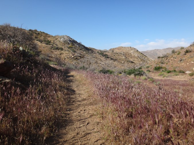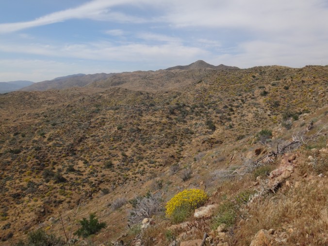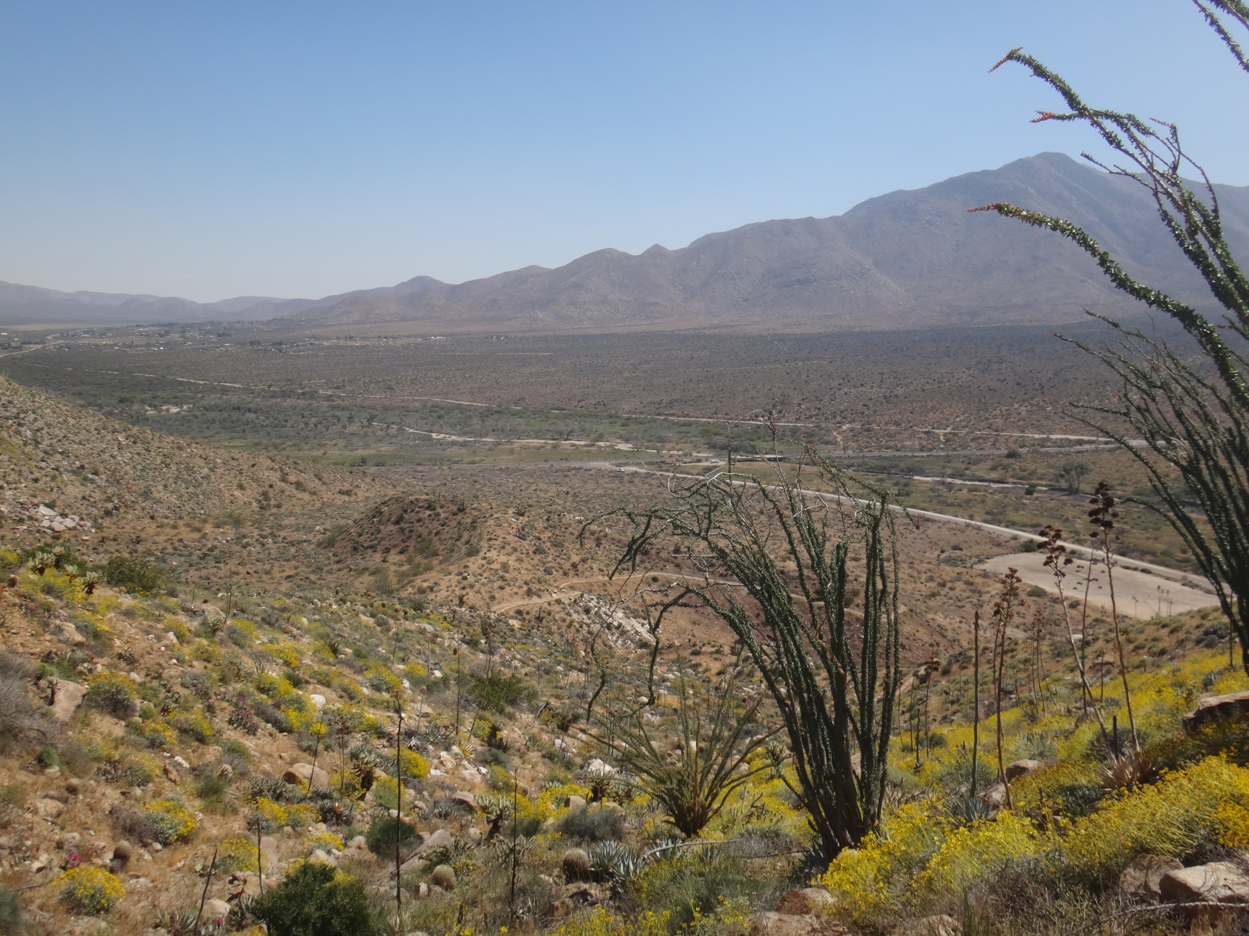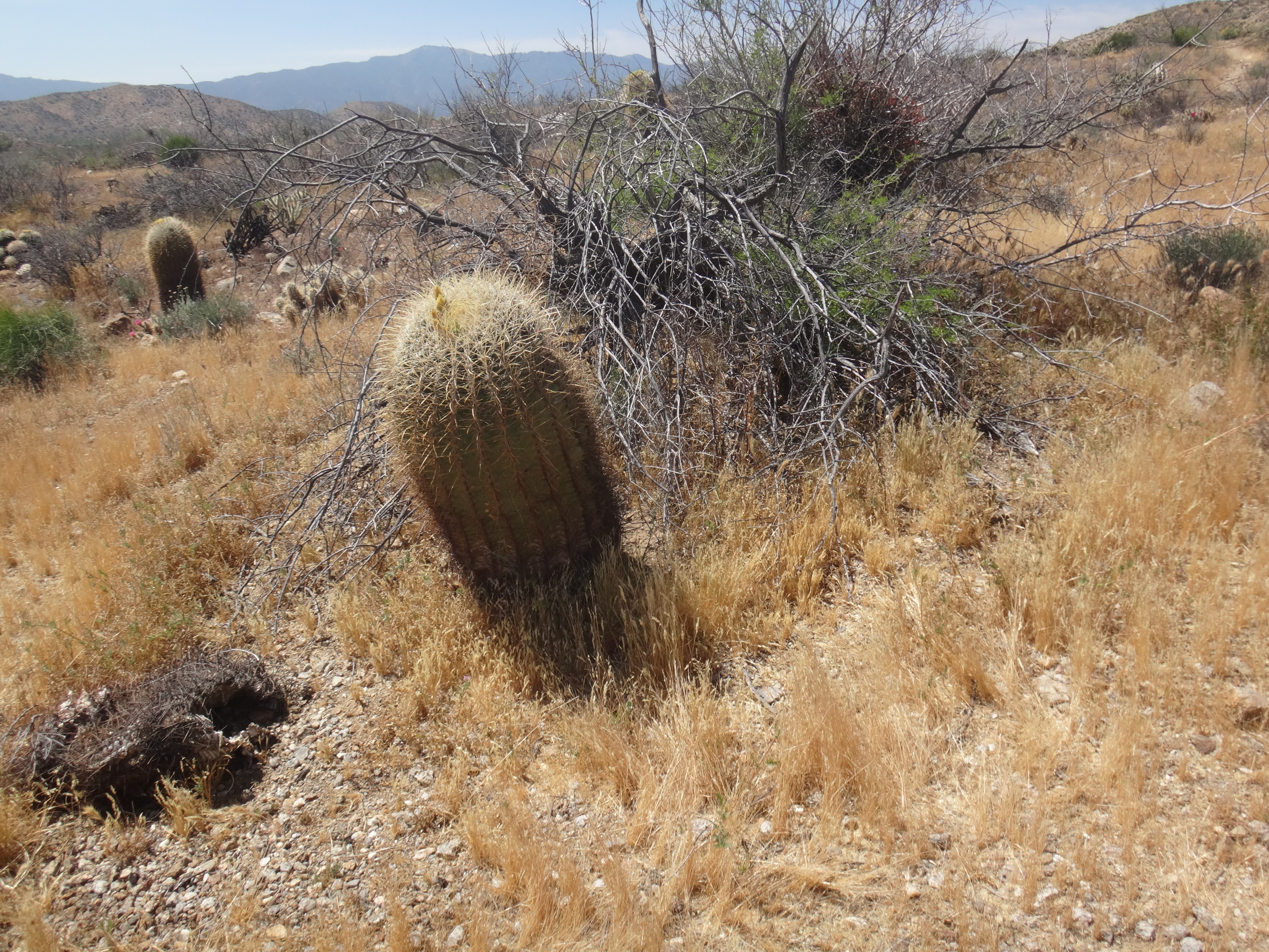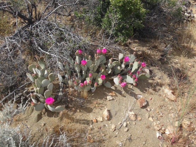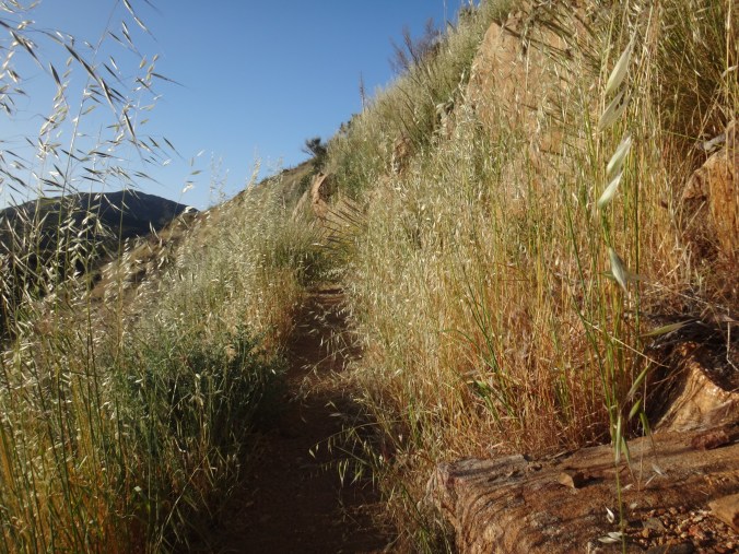 Die sonne bruzelt und ich bin ein wenig in Zeit Not. Wollte eigentlich früher starten und vor Sonnenuntergang ankommen und im Bettchen liegen. Also Füße in die Hände und ab die Luzi. Nach 5 Minuten der erste Notstopp. Akku der Kamera muss gewechselt und Blase geleert werden. Da muss man aber auch an einer Bergflanke Glück haben ein nicht all zu offenes Plätzchen zu finden ;). Dann aber wirklich mit vollem Tatendrang und frisch gestärkt hinauf. Es ist nicht steil, dafür lang. In hunderten Kurven wir der Aufstieg zu einer Achterbahnfahrt. Rechts runter, links geradeaus, welle, scharfe Rechtskurve, looping, ach wie auch sonst geht es wie ein betrunkener auf einem leeren riesigen Parkplatz in vielen schlangenlinien den Berg hinauf. Zum ersten Mal sehe ich auch dickere Kakteen. Es blühen viele Blumen und meine Nase läuf unaufhaltsam. Schon im Hotel hab ich geblutet wie ein abgestochenes Schwein. Es wollte einfach nicht aufhören. Vielleicht bin ich gegen etwas allergisch. Naja, die Sabber im Ärmel verstauend geht es weiter wie ein betrunkener. Nach 2 Stunden unaufhaltsamer Höhenerklimmung lege ich eine Pause im so ersehnten Schatten ein. Kurz einen halben Liter gekippt und weiter gehts. Es ist unbeschreiblich wie man 22 Kilometer in zehn geradlinige Kilometer verstauen kann. Aber es geht. Man denke an den Parkplatz. Nachdem die Höhenmeter fallen fallen auch die Kakteen. Abgestorben und schwarz zieren sie den Wegesrand. Erinnert mich an Oktupusse. Mit ihren vielen Armen und verzweigungen. Aber auch die meisten restlichen Pflanzen haben das Handtuch geworfen. Im Sonnenschein geht es immer weiter. Ich halte noch zwei mal. Für Fotos von Mozart sowie den restlichen Tropfen. So langsam wünsche ich mir den ersten markanten Weg Punkt herbei. Ein Pipegate (Zauntür). Irgendwann, als der letzte große Berg nicht mehr fern war erschien auch das Pipegate. Yeahhh. Nur noch 8 Kilometer und es ist erst 16:40. Ich kann es also noch schaffen. Das gibt mir Kraft und meine müden geschundenen Beine bringen wieder 105% Auslastung. Es geht nun in ein Tal. Lang Leistung. Dichte kratzige Büsche wachsen in den Trail. Hier könnte auch jederzeit eine Klapperschlange sitzen. Wenn man dann einen erschrockenen hops macht kann man an manchen Stellen such das zeitliche segnen. Es geht hier teilweise schon sehr steil und tief hinab. Die Talsohle dem Rücken zugewandt kraxel ich nun wieder bergauf. Ganz oben sehe ich einen hiker und drei weitere dahinter. Die kriege ich noch. Trotz müden Füßen habe ich mein Ziel vor augen. Auch das zweite Pipegate kommt nach dem erfolgreichen Anstieg zum Vorschein. Soweit kann es nun ja nicht mehr sein. Soetwas darf man nie denken, erst wenn man das Ziel anfassen kann sollte man das sagen. Selbst wenn man das Ziel auf der anderen Seite der Bergflanke sieht, kann man trotzdem nochmmal 2 stunden irgendwo achterbahn fahren gehen. Also ich bin natürlich erleichtert bald am ziel zu sein, aber es zieht sich elendig. Die drei Mädels überhole ich. Ich kenn sie von gestern an der Wasserquelle am Mittag. Dann hole ich noch ein österreichisches Pärchen, sowie einen Amerikaner ein. Ich puste aus allen Löchern. Meine Knie tun weh und meine Füße sind hundsmüde. Wieso renn ich dann eigentlich noch so über den Trail? Keine Ahnung, weils immer noch geht und eigentlich auch recht spaßig ist. Manchmal schnellt irgend ein Geäst vom Boden gegen meine unterschenkel. Das brennt wie hölle. Direkt über meinen Socken hab ich Sonnenbrand oder eine Hautreizung, was auch immer. Einmal musste ich sogar aufschreien. Morgen werde ich meine leichten Gamaschen anziehen. Der letzte rest geht an einer steilen Flanke entlang. Umzingelt von hohen Fahnen geht es die letzten meter. Dann senkt sich der Trail in ein grünes buschiges Tal und das erlösende dritte Pipegate öffnet sich vor mir. Es ist 18:15Uhr. Nun geht es im Pinguinschritt zum nächst besten Zeltplatz direkt am Trail. Ich verdrücke erstmal zwei Stück Pizza von gestern die ich in ein Ziplogbag gequetscht hatte. Kann man essen wie Wassereis. Einfach immer drücken, dann bleiben die Hände auch einigermaßen sauber. Danach einen Liter Wasser filtern und zelt aufbauen. Ich ziehe meinen Schlafsack über und säubere meine Socken von den ganzen Pflanzensamen und Dornen. Dann richte ich den Rest und leg mich schnell hin. Meine füße wollen nicht mehr. Ich fange an zu bloggen und gegen 20:00 Uhr kommen auch 2 meiner Kollegen die mit mir im Auto saßen. Vom rest keine Spur. Ich ess jetzt vielleicht noch ein paar Chips oder fall einfach in den Schlaf. Aktuelle Höhe 1022. Angefangen bei 689m.