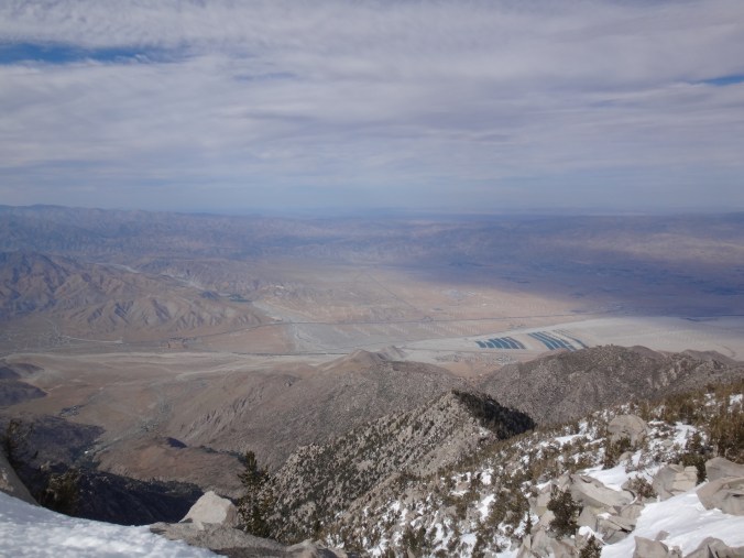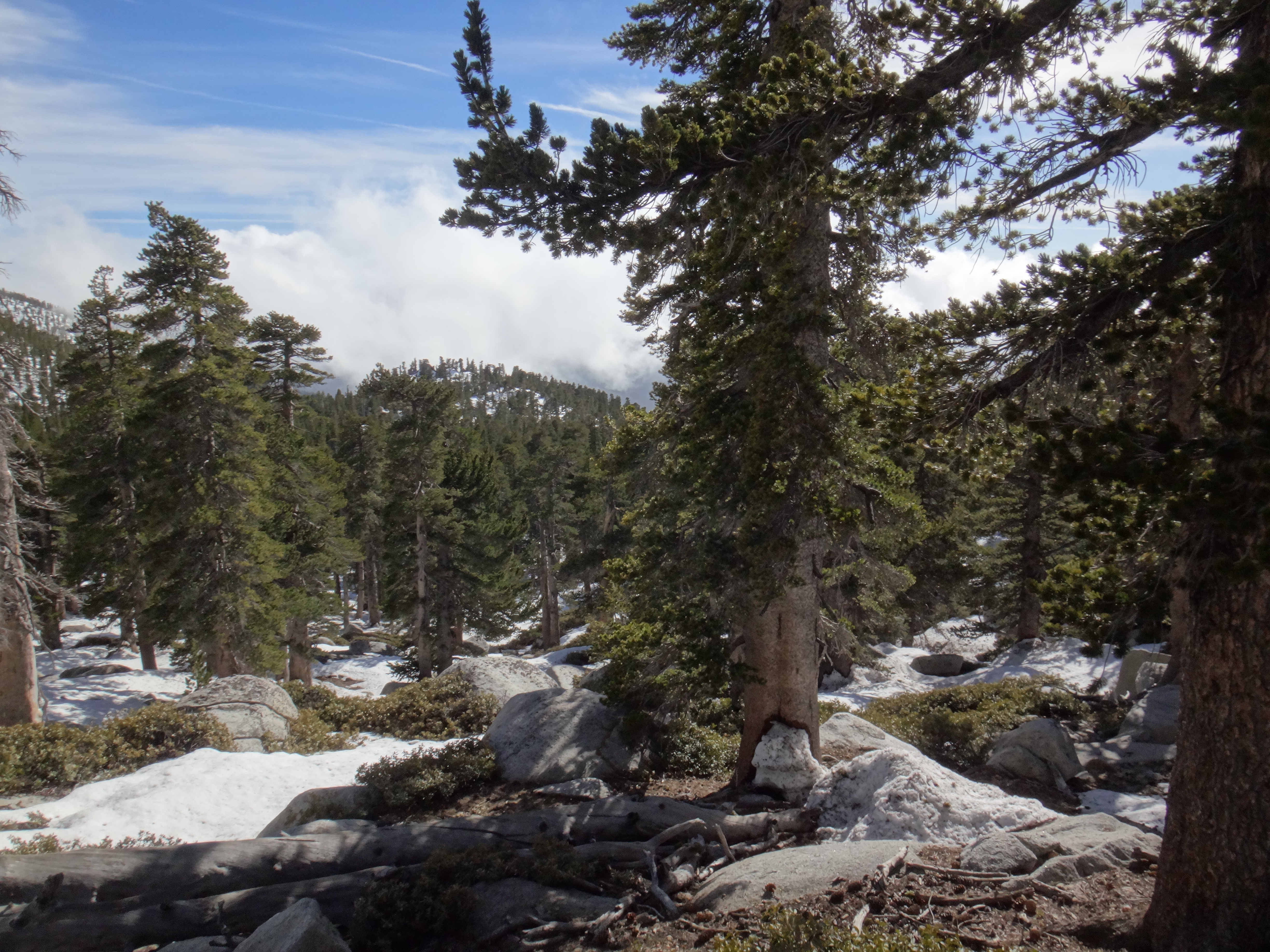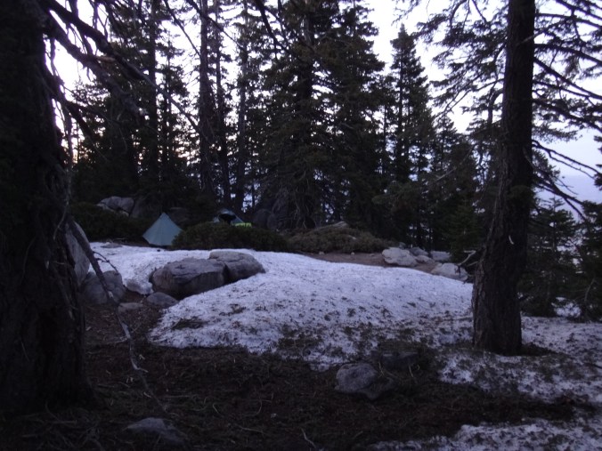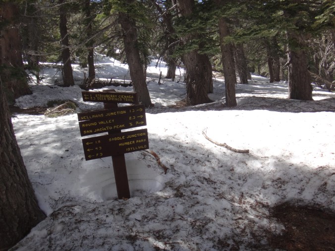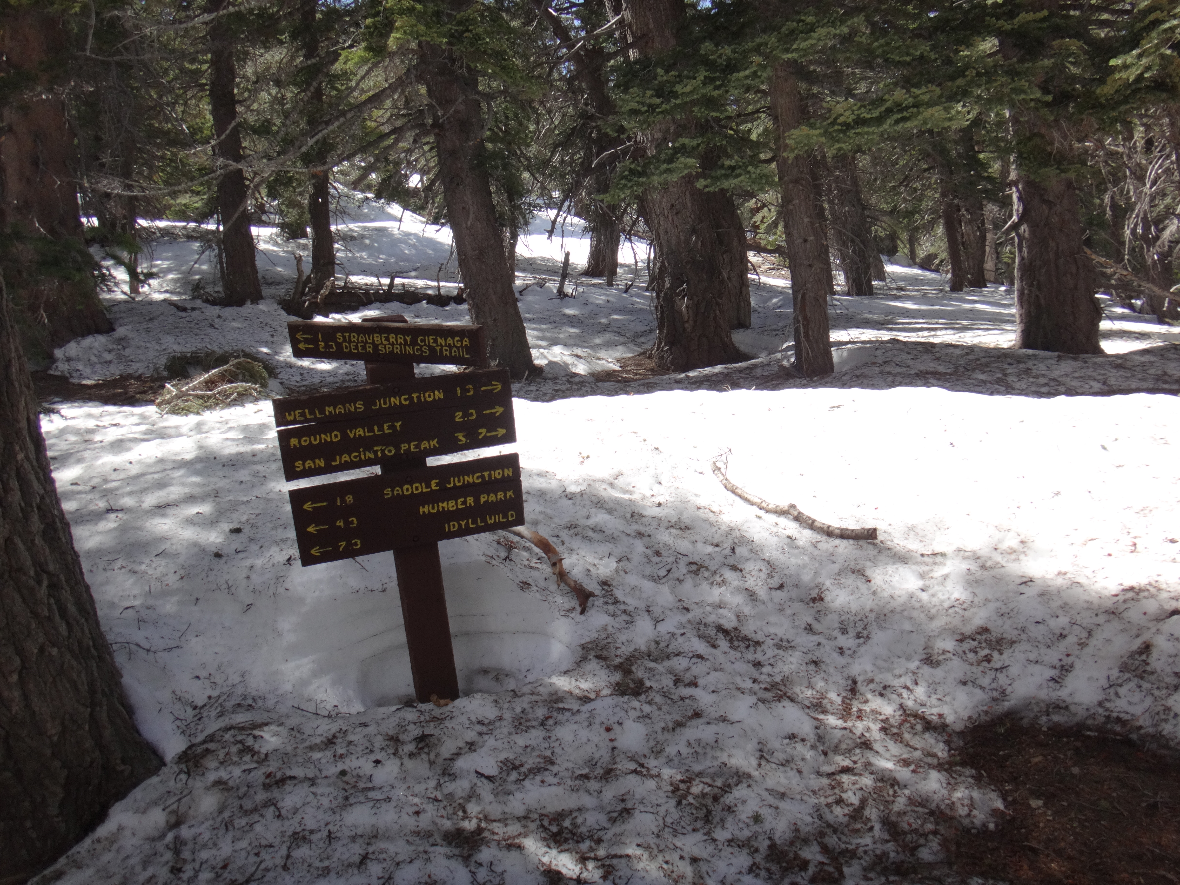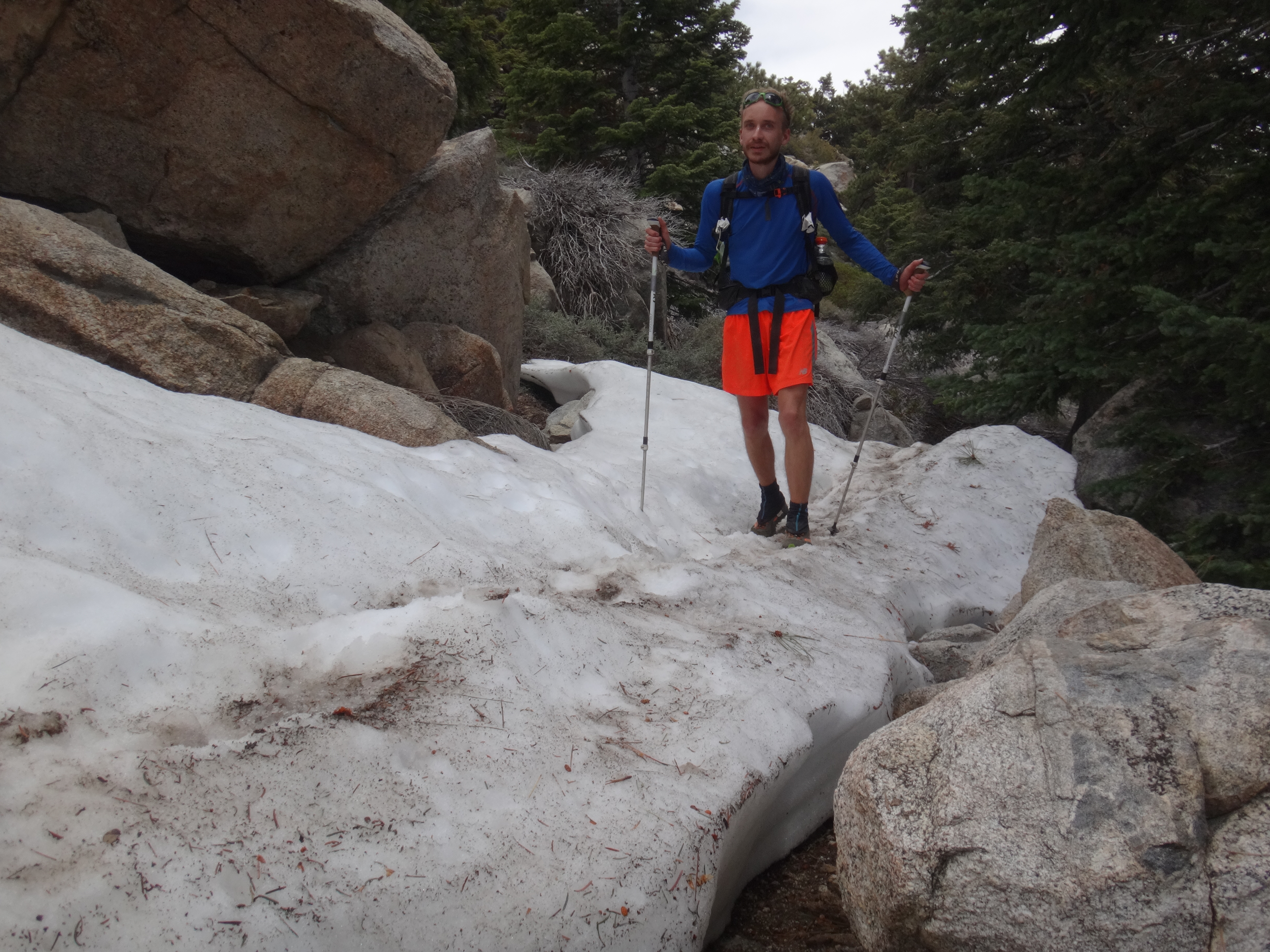 Heute morgen ging es gemütlich los. Frühstücken, telefonieren, einkaufen, Steigeisen von der Post holen. Um 11 bin ich dann los Richtung Humber Park. Von hier geht der Devil Slide Trail 500 Höhenmeter in 4 km hinauf. War recht angenehm zu laufen und hatte schöne Ausblicke auf das Tal. 300 weitere Höhenmeter hatte ich bereits bis zum Parkplatz zurück gelegt. Zurück auf dem PCT habe ich erstmal eine ausgiebige Mittagspause eingelegt. 200g Tunfisch in Wraps verpack und meinen Zeh in ein Pflaster. Habe bei meinem 50km Marsch eine kleine Blase zwischen zwei Zehen bekommen. Aber nur wegen dem ganzen Dreck. Dann ging es um 13.30 weiter auf dem PCT. Steil hinauf mit großen felsigen Stufen. Die ersten Schnee Felder waren bereits im Weg. Bis auf den schweren Rucksack und gewisser Müdigkeit ging es ganz normal vorwärts. Es hat auf jeden Fall länger als gedacht gedauert bis die 3 km hinfällig waren. Dann bin ich allein zum San Jacinto aufgebrochen. Auf der sonnenabgewandten Seite lag noch viel Schnee. Ich zog meine Steigeisen an. Der Trail war nicht mehr zu erkennen. Verschiedene Spuren führten überall hin. Ich kam vom weg ab und bin per gps irgendwann wieder auf den Trail gestoßen. Es ist mega anstrengend. Man rutscht die ganze Zeit. Versinkt tief oder schliddert einen kleine Hügel hinab. Den Gipfel habe ich gegen 16:00 Uhr erreicht. Auch den 1Weg dorthin habe ich quer Feld ein bestritten. Einfach gerade aus hoch. Man konnte nichts erkennen. Mit jedem Höhenmeter schwand auch der Sauerstoff. Ich war ganz ordentlich am pusten und musste jede 10 Schritte am Hang pause machen. Der Mund und Rachen wurden ganz trocken. Naja, ich stand irgendwann oben habe die verdiente aussicht genossen und mich ehrlich gesagt schnell verpisst. Es war mega windig und super spät. Für die restlichen ca. 3km Abstieg habe ich 2 Stunden gebraucht. Ich dachte auf der Sonnenseite wird nicht mehr so viel liegen. Pustekuchen. Alles weiß. Ich bin wie ein Blinder auf einem Parkplatz die eine Laterne suchend so gut es ging dem trail gefolgt. Das handy stets in der hand jede minute den standort checkend. Zum Schluss bin ich dann soweit abgekommen das ich einfach dem flusslauf bis auf den pct gefolgt bin. Da kam mir gerad eine Gruppe entgegen die ich erstmal nach dem weg gefragt habe. Ich stand wirklich auf dem richtigen trail und hatte es geschafft. Alter war ich froh das ich wieder unter leuten war. Das war dann zeitweise doch unangenehm. Vor allem wenn es dunkel wird. Na ja ich bin den leuten dann erstmal gemütlich und glücklich hinterher geschlappt. Nach dem sich einige lang gemacht haben bin ich dann vornweg und wollte Rattler einholen. Der wollte irgendwo 5km entfernt schlafen. Ich wieder in den 1 Gang und ab die Post. Das hat dieses mal echt Kraft gekostet. Dieses schneelaufen ist der fettbrenner schlecht hin. Ich schlag mich also wieder durch den Schnee nachdem ein größerer Teil gut zu laufen war und komme gerade aus dem Busch steht Rattler schon da. Dick eingepackt verdrückt er die letzten reste vom abendessen. Tolles Gefühl ihn zu sehen. Wir fallend uns grinsend und freudig in die Arme. Ein anderer Hiker ist auch bei ihm. Ich berichte von meinen Strapazen auf dem Gipfel. Baue mein Zelt auf und fange an zu kochen. Meine Schuhe sind total nass. Meine socken hängen zum trocknen. Nach und nach schaut auch die andere Gruppe vorbei und sucht sich Zeltplätze. Die können auch nicht mehr und es ist schon 7 uhr durch. Bis zum nächsten Zeltplatz ist es noch mehr als 5km. Das bei Schnee und Eis. Nein danke. Ich bin einfach froh wieder bei meinen Homies zu sein. So einen Ausritt brauch ich nicht nochmal. Wenn man keine Wege sieht ist man allein mindestens einer zu wenig. Jetzt schlafen wir hier auf 2640m weil wir es nicht weiter geschafft haben. Der Wind bläst sehr stark. Es sind immer hin noch 4 Grad Plus. Hoffentlich halten die Heringe und uns fällt kein Baum auf den Kopf. Morgen gehts um 6 los. Damit wir den scheiss hier hinter uns bringen. Muss noch irgendwo wasser finden. Die nächsten 30 kilometer soll es anscheinend nichts geben. Ich hab noch 1,5 Liter. Könnte gehen aber wird ungemütlich.