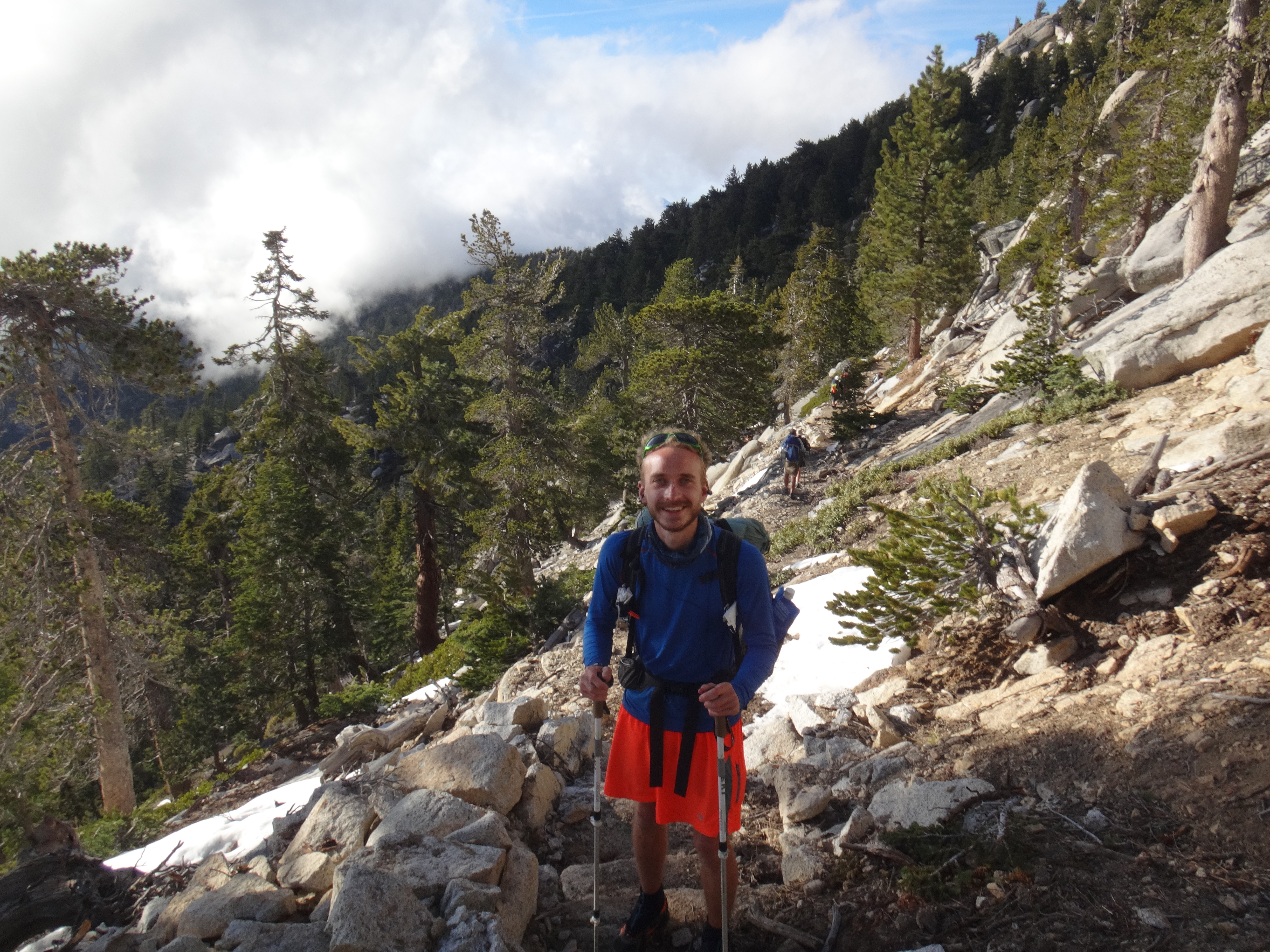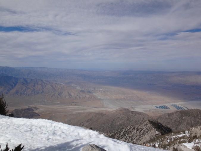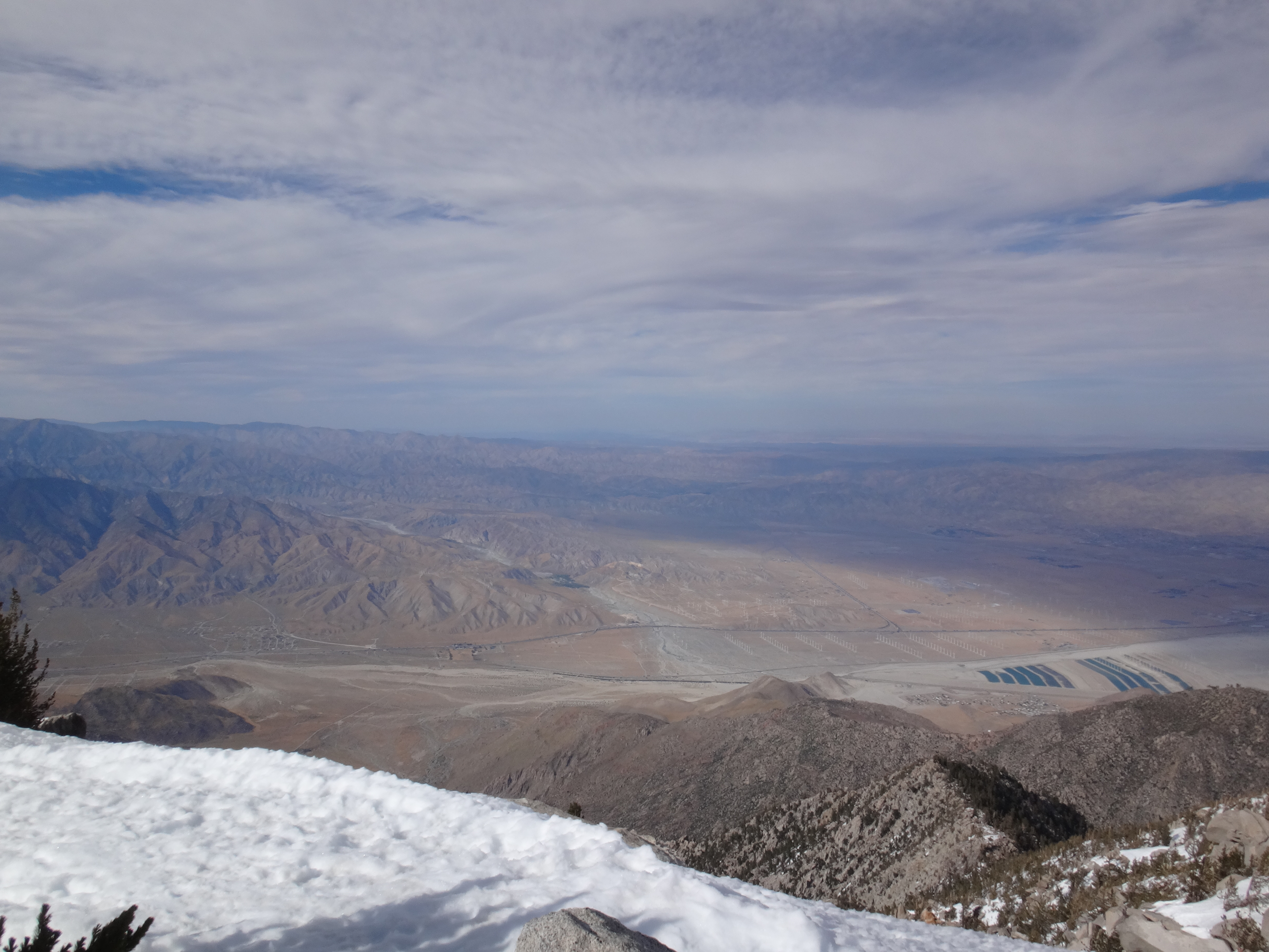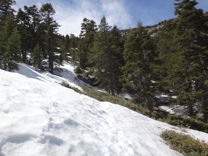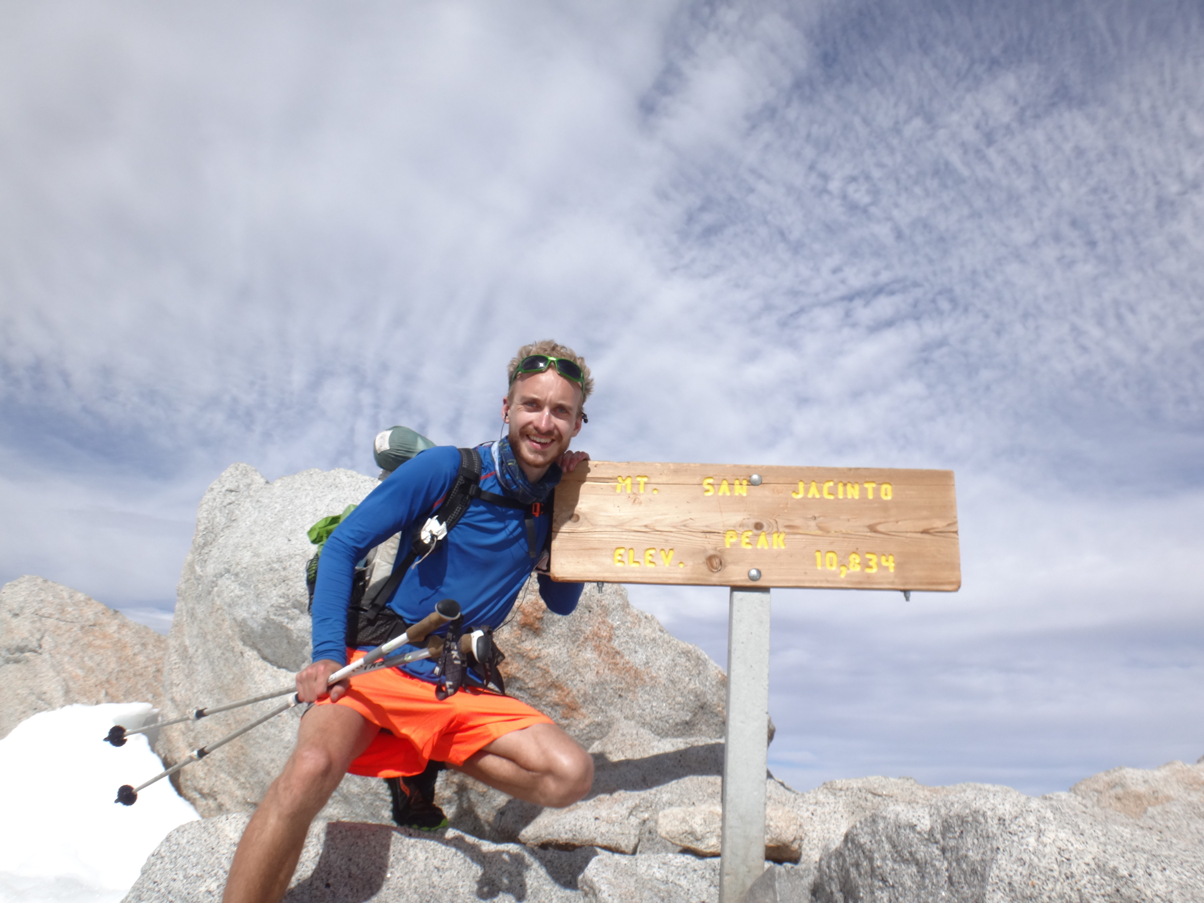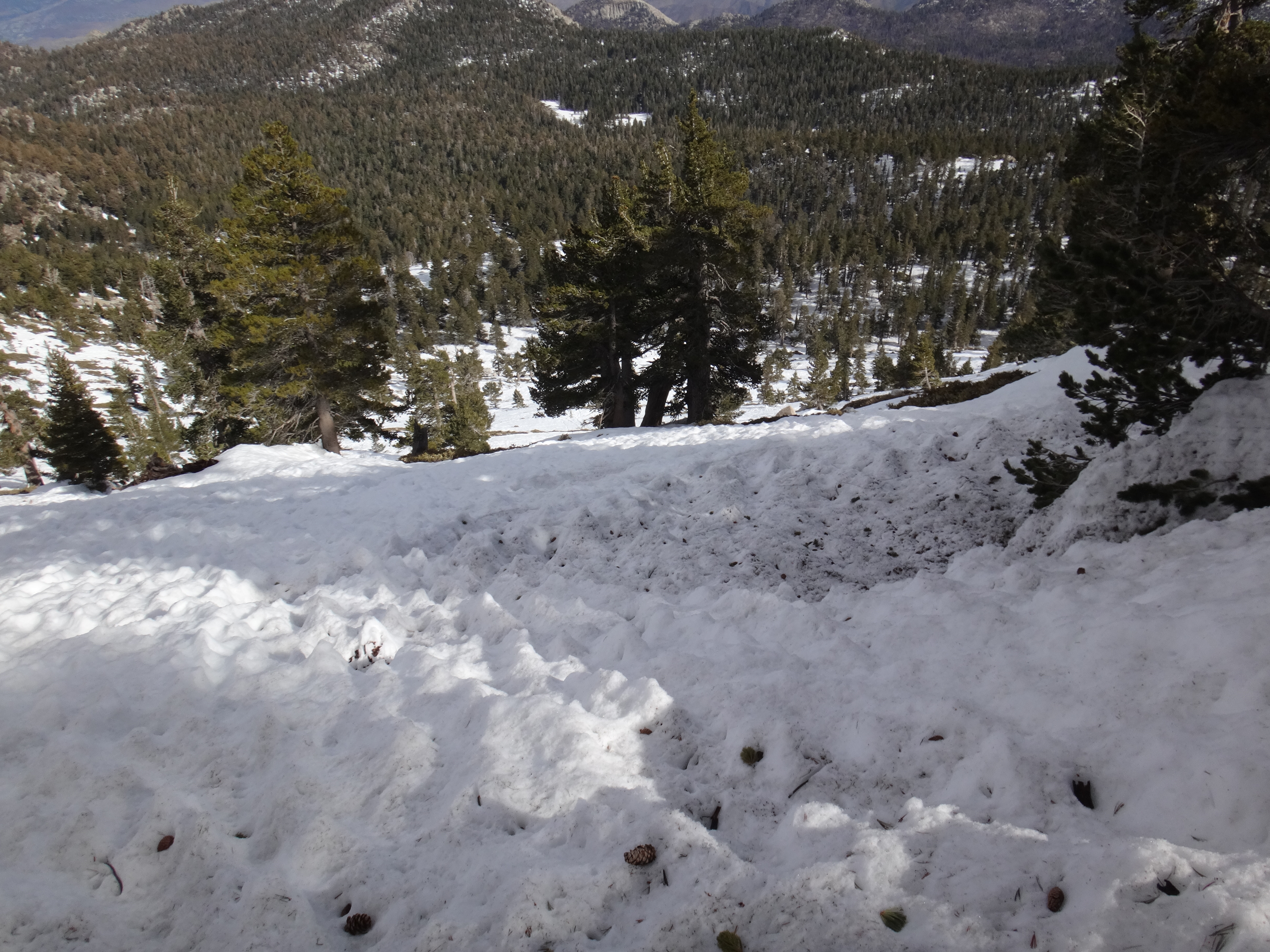 Heute morgen ging es gemütlich los. Frühstücken, telefonieren, einkaufen, Steigeisen von der Post holen. Um 11 bin ich dann los Richtung Humber Park. Von hier geht der Devil Slide Trail 500 Höhenmeter in 4 km hinauf. War recht angenehm zu laufen und hatte schöne Ausblicke auf das Tal. 300 weitere Höhenmeter hatte ich bereits bis zum Parkplatz zurück gelegt. Zurück auf dem PCT habe ich erstmal eine ausgiebige Mittagspause eingelegt. 200g Tunfisch in Wraps verpack und meinen Zeh in ein Pflaster. Habe bei meinem 50km Marsch eine kleine Blase zwischen zwei Zehen bekommen. Aber nur wegen dem ganzen Dreck. Dann ging es um 13.30 weiter auf dem PCT. Steil hinauf mit großen felsigen Stufen. Die ersten Schnee Felder waren bereits im Weg. Bis auf den schweren Rucksack und gewisser Müdigkeit ging es ganz normal vorwärts. Es hat auf jeden Fall länger als gedacht gedauert bis die 3 km hinfällig waren. Dann bin ich allein zum San Jacinto aufgebrochen. Auf der sonnenabgewandten Seite lag noch viel Schnee. Ich zog meine Steigeisen an. Der Trail war nicht mehr zu erkennen. Verschiedene Spuren führten überall hin. Ich kam vom weg ab und bin per gps irgendwann wieder auf den Trail gestoßen. Es ist mega anstrengend. Man rutscht die ganze Zeit. Versinkt tief oder schliddert einen kleine Hügel hinab. Den Gipfel habe ich gegen 16:00 Uhr erreicht. Auch den 1Weg dorthin habe ich quer Feld ein bestritten. Einfach gerade aus hoch. Man konnte nichts erkennen. Mit jedem Höhenmeter schwand auch der Sauerstoff. Ich war ganz ordentlich am pusten und musste jede 10 Schritte am Hang pause machen. Der Mund und Rachen wurden ganz trocken. Naja, ich stand irgendwann oben habe die verdiente aussicht genossen und mich ehrlich gesagt schnell verpisst. Es war mega windig und super spät. Für die restlichen ca. 3km Abstieg habe ich 2 Stunden gebraucht. Ich dachte auf der Sonnenseite wird nicht mehr so viel liegen. Pustekuchen. Alles weiß. Ich bin wie ein Blinder auf einem Parkplatz die eine Laterne suchend so gut es ging dem trail gefolgt. Das handy stets in der hand jede minute den standort checkend. Zum Schluss bin ich dann soweit abgekommen das ich einfach dem flusslauf bis auf den pct gefolgt bin. Da kam mir gerad eine Gruppe entgegen die ich erstmal nach dem weg gefragt habe. Ich stand wirklich auf dem richtigen trail und hatte es geschafft. Alter war ich froh das ich wieder unter leuten war. Das war dann zeitweise doch unangenehm. Vor allem wenn es dunkel wird. Na ja ich bin den leuten dann erstmal gemütlich und glücklich hinterher geschlappt. Nach dem sich einige lang gemacht haben bin ich dann vornweg und wollte Rattler einholen. Der wollte irgendwo 5km entfernt schlafen. Ich wieder in den 1 Gang und ab die Post. Das hat dieses mal echt Kraft gekostet. Dieses schneelaufen ist der fettbrenner schlecht hin. Ich schlag mich also wieder durch den Schnee nachdem ein größerer Teil gut zu laufen war und komme gerade aus dem Busch steht Rattler schon da. Dick eingepackt verdrückt er die letzten reste vom abendessen. Tolles Gefühl ihn zu sehen. Wir fallend uns grinsend und freudig in die Arme. Ein anderer Hiker ist auch bei ihm. Ich berichte von meinen Strapazen auf dem Gipfel. Baue mein Zelt auf und fange an zu kochen. Meine Schuhe sind total nass. Meine socken hängen zum trocknen. Nach und nach schaut auch die andere Gruppe vorbei und sucht sich Zeltplätze. Die können auch nicht mehr und es ist schon 7 uhr durch. Bis zum nächsten Zeltplatz ist es noch mehr als 5km. Das bei Schnee und Eis. Nein danke. Ich bin einfach froh wieder bei meinen Homies zu sein. So einen Ausritt brauch ich nicht nochmal. Wenn man keine Wege sieht ist man allein mindestens einer zu wenig. Jetzt schlafen wir hier auf 2640m weil wir es nicht weiter geschafft haben. Der Wind bläst sehr stark. Es sind immer hin noch 4 Grad Plus. Hoffentlich halten die Heringe und uns fällt kein Baum auf den Kopf. Morgen gehts um 6 los. Damit wir den scheiss hier hinter uns bringen. Muss noch irgendwo wasser finden. Die nächsten 30 kilometer soll es anscheinend nichts geben. Ich hab noch 1,5 Liter. Könnte gehen aber wird ungemütlich.