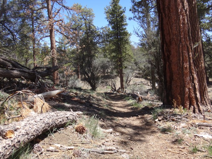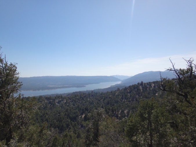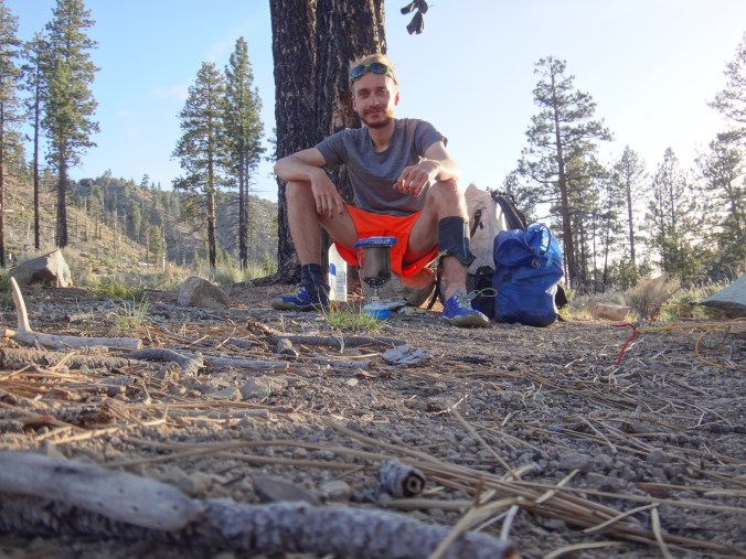 Der Rucksack wiegte sich schwer gegen meine Hüften. Der Anstieg zum Gold Mountain war sehr steinig. Jedoch gab es hier und dort ein paar Bäume die den ersehnten Schatten spendeten. Ansonsten war es schon super knusprig als ich gegen 11:05 Uhr los gewandert bin. Mein Nacken schmerzt und ich halte jede Stunde un eine neue Schicht Sonnencreme aufzutragen. Wenn ich mein Buff trage kommt meist doch ein Spalt Haut zum Vorschein der gnadenlos gekocht wird. Sieht ziemlich komisch aus, so ein Streifen im Nacken. Bevor es aber überhaupt auf den Gold Mountain ging konnte ich erstmal entspannt und recht geradlinig was die Höhenmeter angeht 3,5 Kilometer an einer Bergflanke entlanglaufen. Die Landschaft gefällt mir sehr. Auch der Blick in das weite Wüstental lässt schon etwas erahnen. Der Gold Mountain ließ sich leider nicht von allein erzwingen und so musste ich mit Fußtritten nachhelfen. Ich traf noch einen bekannten den ich am Paradise Cafe kennen gelernt habe. Die Nadelwälder sind der Wahnsinn. Ich liebe diese Art von Natur. An manchen Stellen liegen aber richtige geröllhalden vor mir und die Steine geben schöne Geräusche beim überqueren ab. Vom Top geht es wieder gemütlich Berg ab bis ich zu einem kleinen Fluss komme. Hier treffe ich Pipe, Rattler, Wooky und noch 3 andere Hiker. Ich bleibe mit Pipe zurück und mache um 14:00 Uhr Mittag. Der Rest wandert weiter. Es gibt Wrap mit Tunfischsalat. Dann trinke ich nich einen Liter und fülle nach. Die nächste Quelle kommt erst in 16km. 15 habe ich schon geschafft. Nach 30 Minuten Entspannung und ein paar kräftigen Zügen aus meiner Chipspackung geht es weiter. Der Wald ist jetzt dichter und der Weg so weich und angenehm zu gehen das ich sooo zufrieden bin endlich wieder hier zu sein. Die Bäume, umgefallen oder nicht, drehen sich manchmal beim wachsen. Die äußere Rinde geht also nicht vertikal nach oben sonder schlängelt sich mehrfach um den Baum während sie in die Höhe geht. Höchst interessant. Es fliegen viele Vögel mit blauem Gefieder und schwarzer Kopfhaube umher. Davon gibt es tausende. Ich bin ein wenig enttäuscht noch kein Wild gesehen zu haben. Aber dies ist auch der erste wirkliche Abschnitt mit Wald. Während ich wieder Anstiege kommen auch wieder mehr Steine auf den Weg. Zur Linken kommen tolle Aussichte auf den Big Bear Lake und die dahinterliegenden gepuderten Berggipfel. Während ich die Bergflanke wechsel kann ich ein Tal mit Steinbrüchen ausmachen. Ich durchquere das Tal und hole Rattler und Wooky ein. Wir sitzen am Trail, genießen die Aussicht und Rattler schmeißt eine Runde Zuckerbonbons. Ich mache mich allein auf die weitere Reise. Es sind vielleicht noch 9 km. Ich durchquere das gesamte Tal. Der Wald ist zum dahin schmelzen und der Trail schön geschmeidig in den Berg gefügt. Was für ein toller Tag. Zu letzt öffnet sich das Tal. Die vor mir liegenden Berge sind alle kahl gefegt. Nur wenige Bäume stehen noch und sind nicht ihren liegenden Brüdern gefolgt. In der ferne mache ich riesige Berggipfel aus. Das Tal hinunter geht es ebenfalls sehr entspannt. Allerdings merke ich nun doch schon die Kilometer. Auch gibt es manche Stellen wo stachelige Büsche in den Trail hineinwachsen. Gratis Massage für die Beine. Im Tal ist ein Campingspot mit Fluss. Ich treffe auf einen Wanderer der hier schon 1,5 Tage pausiert weil er sein Knie verdreht hat. Von den ganzen Hikern die durchlaufen hat er Bandagen, Essen und Whisky bekommen. Ihm gehts in diesen Dingen nicht all Zu schlecht. Ich hole Wasser, baue Zelt und alles auf und fange an zu kochen. Auf den letzten Metern hatte ich ein richtiges Loch im Bauch und freue mich richtig auf die Fertig Aufkochpackungen die mein Abend bestimmen. Mit Wooky, Rattler und dem Verletzten essen wir gemeinsam. Es trudeln noch CookieMonster und 2 andere ein. Auch Adam liegt bereits in seiem Zelt. Scheint ich komme immer zu spät. Morgen wollen wir bis zu den HotSprings wandern. Das wird ein langer Tag und ich freu mich darauf. Es tut gut aus der Stadt raus zu sein. Man kommt nicht wirklich zu etwas. Ich meine ich hatte schon wichtige Dinge zu erledigen. Dennoch nimmt das ein wenig Überhand und ich bin froh wieder in meinem Schlafsack zu liegen. Ich vermisse meine Freundin und Famile. Mehr als auf dem AT. Vielleicht liegt es auch daran, dass wir in der Stadt soviel Kontakt hatten. Das erhöht die Erinnerungen und Sehnsüchte nach Dingen die man im Moment nicht haben kann nochmal enorm. Jetzt bin ich wieder mit meinen zwei R+W unterwegs 🙂