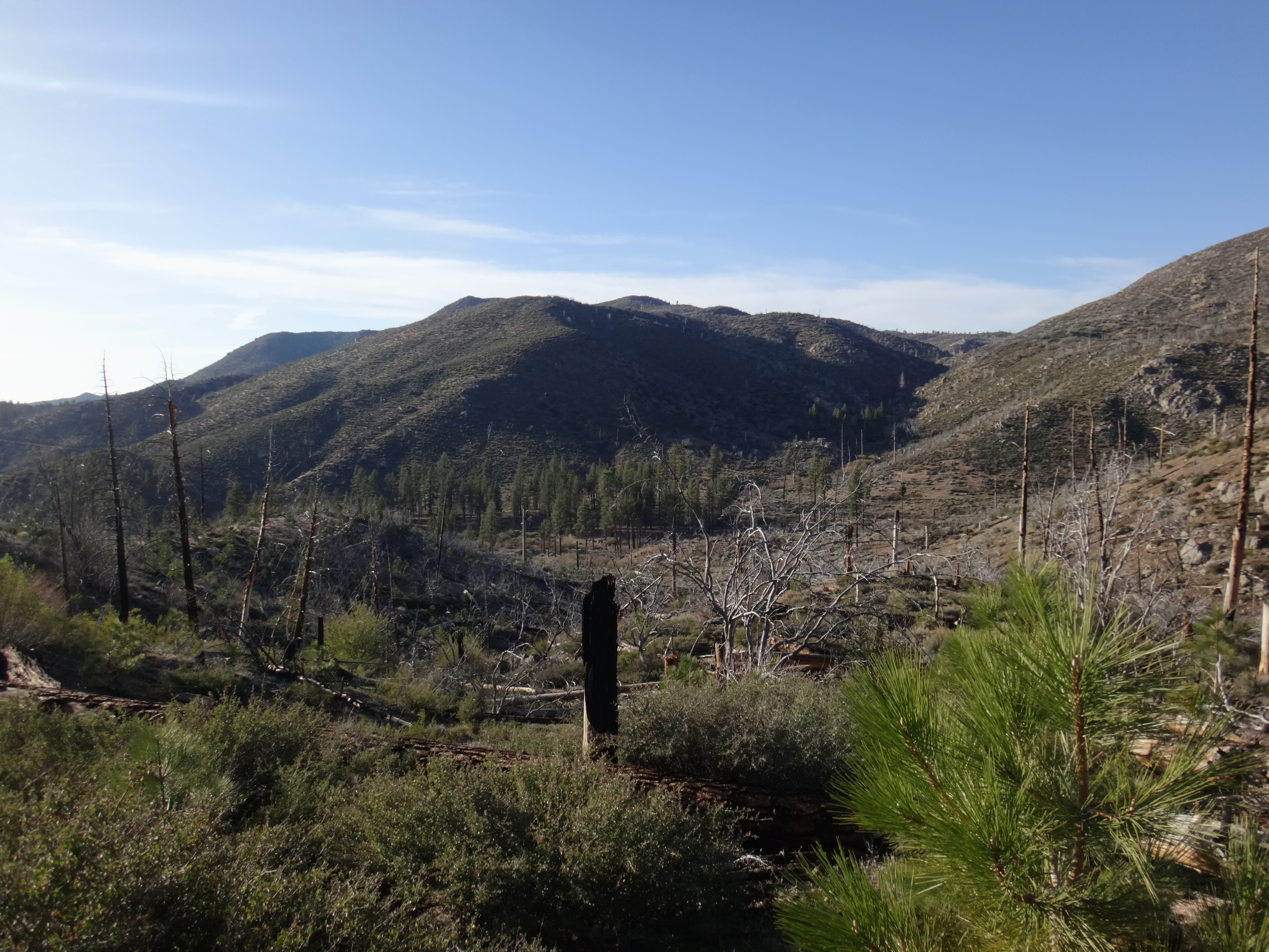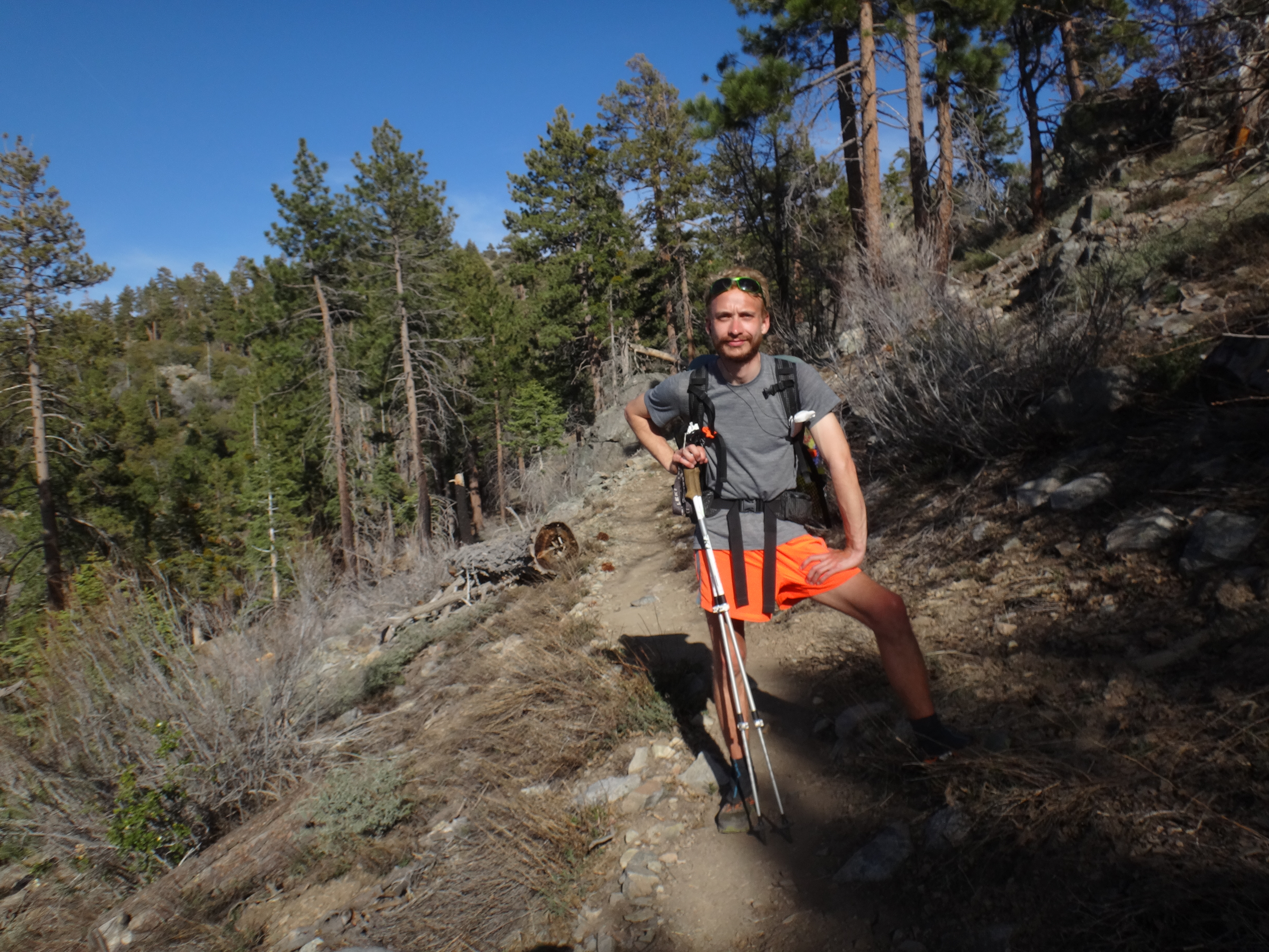 Der Rucksack wiegte sich schwer gegen meine Hüften. Der Anstieg zum Gold Mountain war sehr steinig. Jedoch gab es hier und dort ein paar Bäume die den ersehnten Schatten spendeten. Ansonsten war es schon super knusprig als ich gegen 11:05 Uhr los gewandert bin. Mein Nacken schmerzt und ich halte jede Stunde un eine neue Schicht Sonnencreme aufzutragen. Wenn ich mein Buff trage kommt meist doch ein Spalt Haut zum Vorschein der gnadenlos gekocht wird. Sieht ziemlich komisch aus, so ein Streifen im Nacken. Bevor es aber überhaupt auf den Gold Mountain ging konnte ich erstmal entspannt und recht geradlinig was die Höhenmeter angeht 3,5 Kilometer an einer Bergflanke entlanglaufen. Die Landschaft gefällt mir sehr. Auch der Blick in das weite Wüstental lässt schon etwas erahnen. Der Gold Mountain ließ sich leider nicht von allein erzwingen und so musste ich mit Fußtritten nachhelfen. Ich traf noch einen bekannten den ich am Paradise Cafe kennen gelernt habe. Die Nadelwälder sind der Wahnsinn. Ich liebe diese Art von Natur. An manchen Stellen liegen aber richtige geröllhalden vor mir und die Steine geben schöne Geräusche beim überqueren ab. Vom Top geht es wieder gemütlich Berg ab bis ich zu einem kleinen Fluss komme. Hier treffe ich Pipe, Rattler, Wooky und noch 3 andere Hiker. Ich bleibe mit Pipe zurück und mache um 14:00 Uhr Mittag. Der Rest wandert weiter. Es gibt Wrap mit Tunfischsalat. Dann trinke ich nich einen Liter und fülle nach. Die nächste Quelle kommt erst in 16km. 15 habe ich schon geschafft. Nach 30 Minuten Entspannung und ein paar kräftigen Zügen aus meiner Chipspackung geht es weiter. Der Wald ist jetzt dichter und der Weg so weich und angenehm zu gehen das ich sooo zufrieden bin endlich wieder hier zu sein. Die Bäume, umgefallen oder nicht, drehen sich manchmal beim wachsen. Die äußere Rinde geht also nicht vertikal nach oben sonder schlängelt sich mehrfach um den Baum während sie in die Höhe geht. Höchst interessant. Es fliegen viele Vögel mit blauem Gefieder und schwarzer Kopfhaube umher. Davon gibt es tausende. Ich bin ein wenig enttäuscht noch kein Wild gesehen zu haben. Aber dies ist auch der erste wirkliche Abschnitt mit Wald. Während ich wieder Anstiege kommen auch wieder mehr Steine auf den Weg. Zur Linken kommen tolle Aussichte auf den Big Bear Lake und die dahinterliegenden gepuderten Berggipfel. Während ich die Bergflanke wechsel kann ich ein Tal mit Steinbrüchen ausmachen. Ich durchquere das Tal und hole Rattler und Wooky ein. Wir sitzen am Trail, genießen die Aussicht und Rattler schmeißt eine Runde Zuckerbonbons. Ich mache mich allein auf die weitere Reise. Es sind vielleicht noch 9 km. Ich durchquere das gesamte Tal. Der Wald ist zum dahin schmelzen und der Trail schön geschmeidig in den Berg gefügt. Was für ein toller Tag. Zu letzt öffnet sich das Tal. Die vor mir liegenden Berge sind alle kahl gefegt. Nur wenige Bäume stehen noch und sind nicht ihren liegenden Brüdern gefolgt. In der ferne mache ich riesige Berggipfel aus. Das Tal hinunter geht es ebenfalls sehr entspannt. Allerdings merke ich nun doch schon die Kilometer. Auch gibt es manche Stellen wo stachelige Büsche in den Trail hineinwachsen. Gratis Massage für die Beine. Im Tal ist ein Campingspot mit Fluss. Ich treffe auf einen Wanderer der hier schon 1,5 Tage pausiert weil er sein Knie verdreht hat. Von den ganzen Hikern die durchlaufen hat er Bandagen, Essen und Whisky bekommen. Ihm gehts in diesen Dingen nicht all Zu schlecht. Ich hole Wasser, baue Zelt und alles auf und fange an zu kochen. Auf den letzten Metern hatte ich ein richtiges Loch im Bauch und freue mich richtig auf die Fertig Aufkochpackungen die mein Abend bestimmen. Mit Wooky, Rattler und dem Verletzten essen wir gemeinsam. Es trudeln noch CookieMonster und 2 andere ein. Auch Adam liegt bereits in seiem Zelt. Scheint ich komme immer zu spät. Morgen wollen wir bis zu den HotSprings wandern. Das wird ein langer Tag und ich freu mich darauf. Es tut gut aus der Stadt raus zu sein. Man kommt nicht wirklich zu etwas. Ich meine ich hatte schon wichtige Dinge zu erledigen. Dennoch nimmt das ein wenig Überhand und ich bin froh wieder in meinem Schlafsack zu liegen. Ich vermisse meine Freundin und Famile. Mehr als auf dem AT. Vielleicht liegt es auch daran, dass wir in der Stadt soviel Kontakt hatten. Das erhöht die Erinnerungen und Sehnsüchte nach Dingen die man im Moment nicht haben kann nochmal enorm. Jetzt bin ich wieder mit meinen zwei R+W unterwegs 🙂