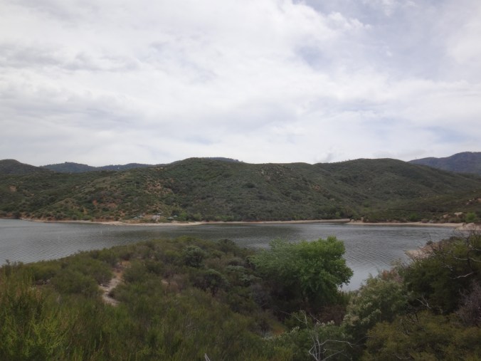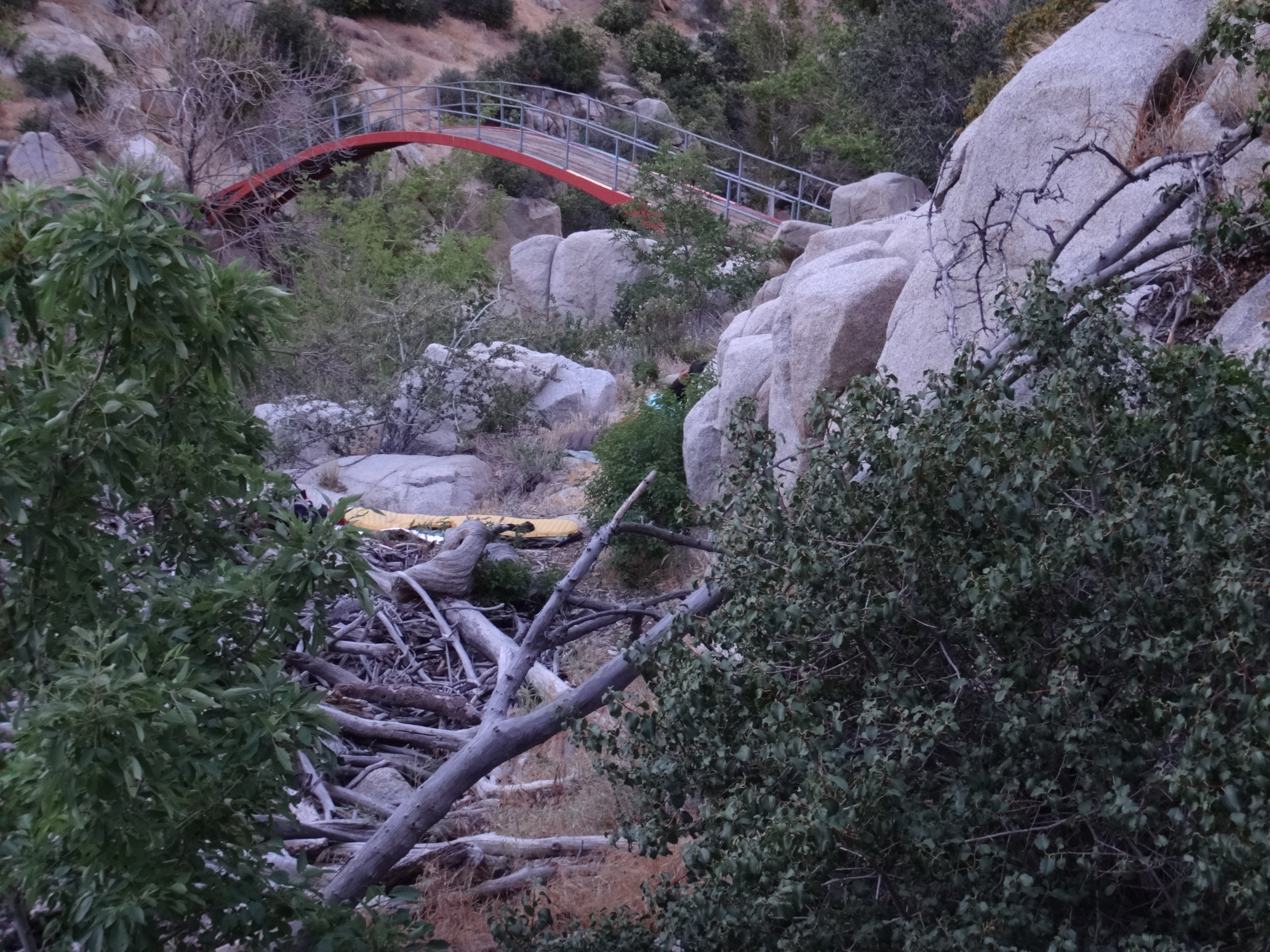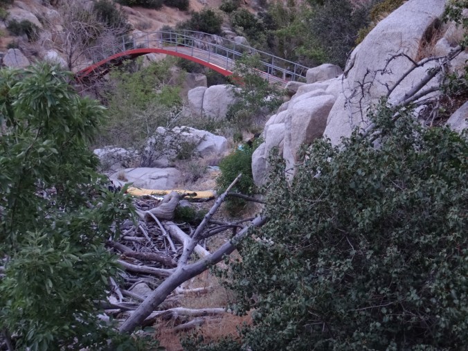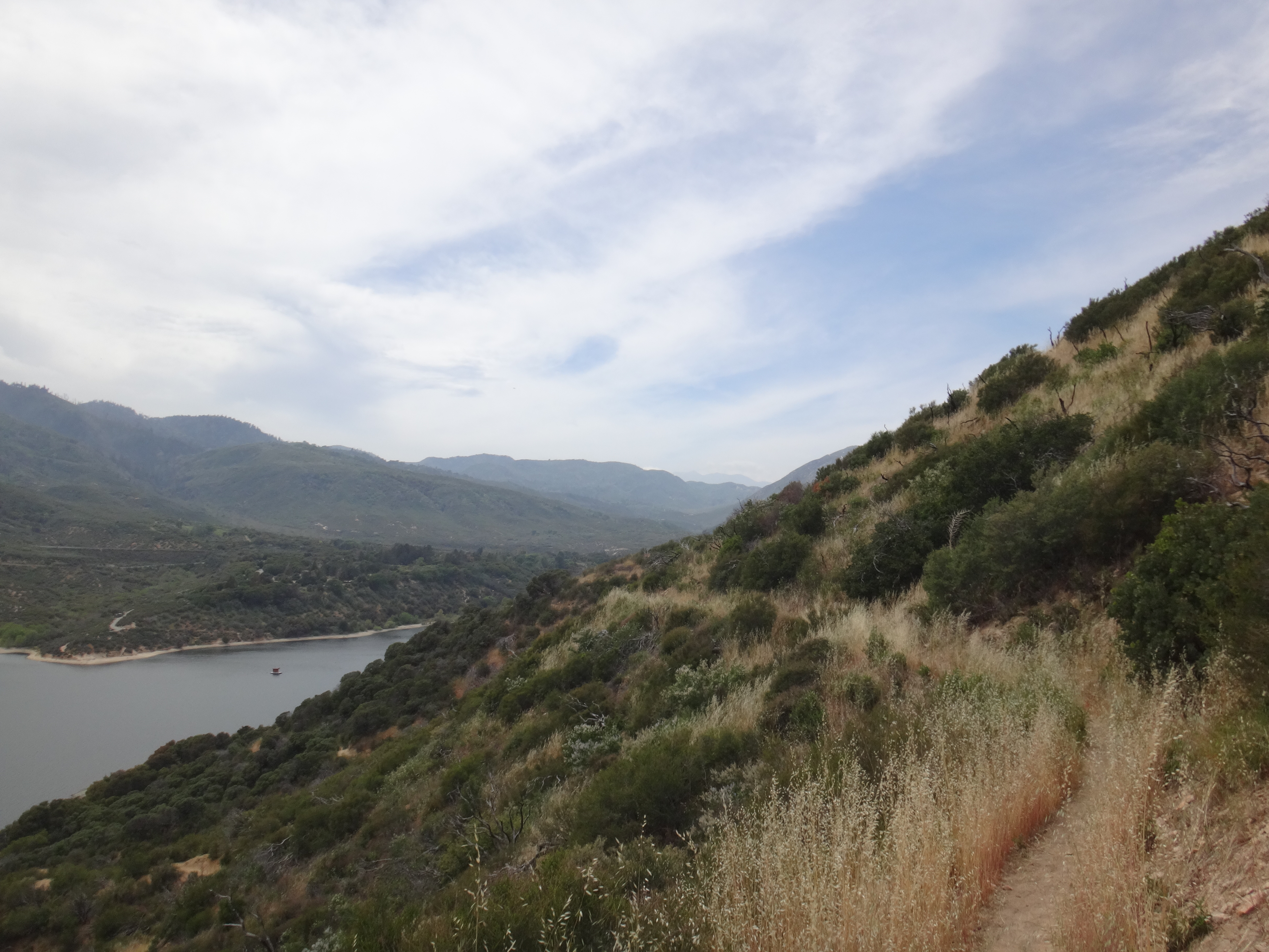 Am Berg entlang geht es für einige Zeit. Ich treffe auf den Wanderer von heute morgen und lege gegen 11 eine kleine Pause mit ihm ein. Auf dem weiteren Weg ich, ich bin ganz im Tunnel, seh ich links neben mir nur noch den Kopf einer Schlange. Keine 20 cm entfernt von meine Füßen. Als ich das realisierte war ich schon vorbei. Scheiße hab ich Adrenalin gepumpt. Vorsichtig bin ich zurück und hab noch ein paar Fotos für euch geschossen. Es wsr glaubig keine giftige Schlange. Hat nichr gezischt oder gerasselt. Ab jetzt ging mir die Pumpe und ich vermutete unter jeder Centmünze einen riesen Schlangenteufel. Mit geringem Tempo ging es dann durch das nicht weniger ansehnliche Gelände bis endlich eine Brücke kam. Auf der Straße ging es einige Meter unter dem Damm entlang. Bestimmt 35 Meter hoch waren die großen Felsbrocken aufgehäuft worden. Sah surreal aus als ich um die Ecke kam. Hier traf ich auf weitere Hiker die ich nicht beim Namen nennen kann. Es waren mehr als5. Kurz als wir von der Straße runter waren gab es Trailmagic. Erdbeeren und Wasser. Dann ging es zum Stausee hinauf und ich umrundete ihn bis zur ersten Campstelle. Am Picknicktisch aß ich zu Mittag. Wraps mit Käse und Wurst. Gegen 14.00 Uhr ging es weiter um den Stausee. Es war nicht viel los auf dem See. Aber die Hitze stand hier übel zwischen den ganzen Büschen. Auch mein rechter Fuß kränkelt. Zumindest habe ich am kleinen Zeh eine Blase welche mich an die vom AT erinnert. Da mein Fuß automatisch versucht keinen Druck darauf zu geben fühlt sich meine Wade die ganze Zeit verkrampft an.  Also die Blase habe ich denke ich seit gestern. Durch die Mittagshitze geht es noch weiter durchs Gestrüpp. Nachdem der Trail langsam an Höhe verliert komme ich über ein paar Straßen zu einem Grillplatz. Hier entspanne ich nochmal und trinke so viel wie möglich. Gegen 15.30 beginne ich mit dem letzten Anstieg. Ich treffe Puppy und Flying Andy. Wir freuen uns schon sehr auf den MC Donalds. Das ist schon lang Gesprächsthema. Was kaufe ich ein, was nehme ich mit auf den Trail, etc. 🙂 Hauptsache viel Essen und Kalorien 😀 Der Aufstieg lockt nochmal die Sonne heraus. Meine Arme und Beine sind jetzt gefühlt knusprig. Habe mich schon 3 Mal eingecremt aber das interessiert die Sonne wohl wenig. Ich watschel den Berg hinauf um auf der anderen Seite wieder hinab zu steigen. Als ich kurz meine Nase berühre fängt sie wieder an zu bluten. War schon bei der zweiten Mittagspause so. Ich laufe weiter hinab bis zur Wasserquelle. Der Trail ist hier dicht bewachsen. In der Ferne ertönen Zugsignale. Ich lade 3 Liter auf meinen Rucksack und lassen einen nach einem Kilometer wieder laufen. Einfach zu schwer und ich komme mit 4 Litern locker hin. Wooky und Rattler sind gestern an den Hot Speings geblieben. Ich werde sie wohl nicht vor Wrightwood wiedersehen. War also mehr oder weniger allein unterwegs heute. Habe aber nicht das Gefühl, dass ich auch allein irgendwo campen muss. Ich laufe als immer weiter hinab und lasse ein paar leere Zeitplätze hinter mir. Dies wird belohnt. Ich treffe Large Pizza und2 weitere am Cowboy camping in den Büschen. Dies ist zwar nicht der Zeltplatz zu dem ich wollte aber es sind nur wenige 100 Meter unterschied. Ich geselle mich zu ihnen. Koche ausnahmsweise mal Knorr Nudel mit Parmesan und Kartoffelpüree. Als Nachtisch gibts noch ein paar Scheiben Wurst und KitKat. Dann mache ich es mir im Schlafsack bequem und schreibe den Block. Morgen kann ich schon updaten wenn ich zum MC Donalds komme. Nur ca. 10 km. Kann also gegen 8.30 da sein wenn ich gemütlich mit dem Tag beginne. Um 11 gibts blaube ich erst Burger. Es stehen morgen wieder cs. 42km auf dem Programm. Allerings mit ca. 1700m Höhenmetern Aufstieg. Das wird richtig knackig. Weiß nicht ob das Zeitmäßig hinhaut nach dem MC Besuch. Mal schauen ob ich dann überhaupt noch den Hüftgurt geschlossen bekomme.