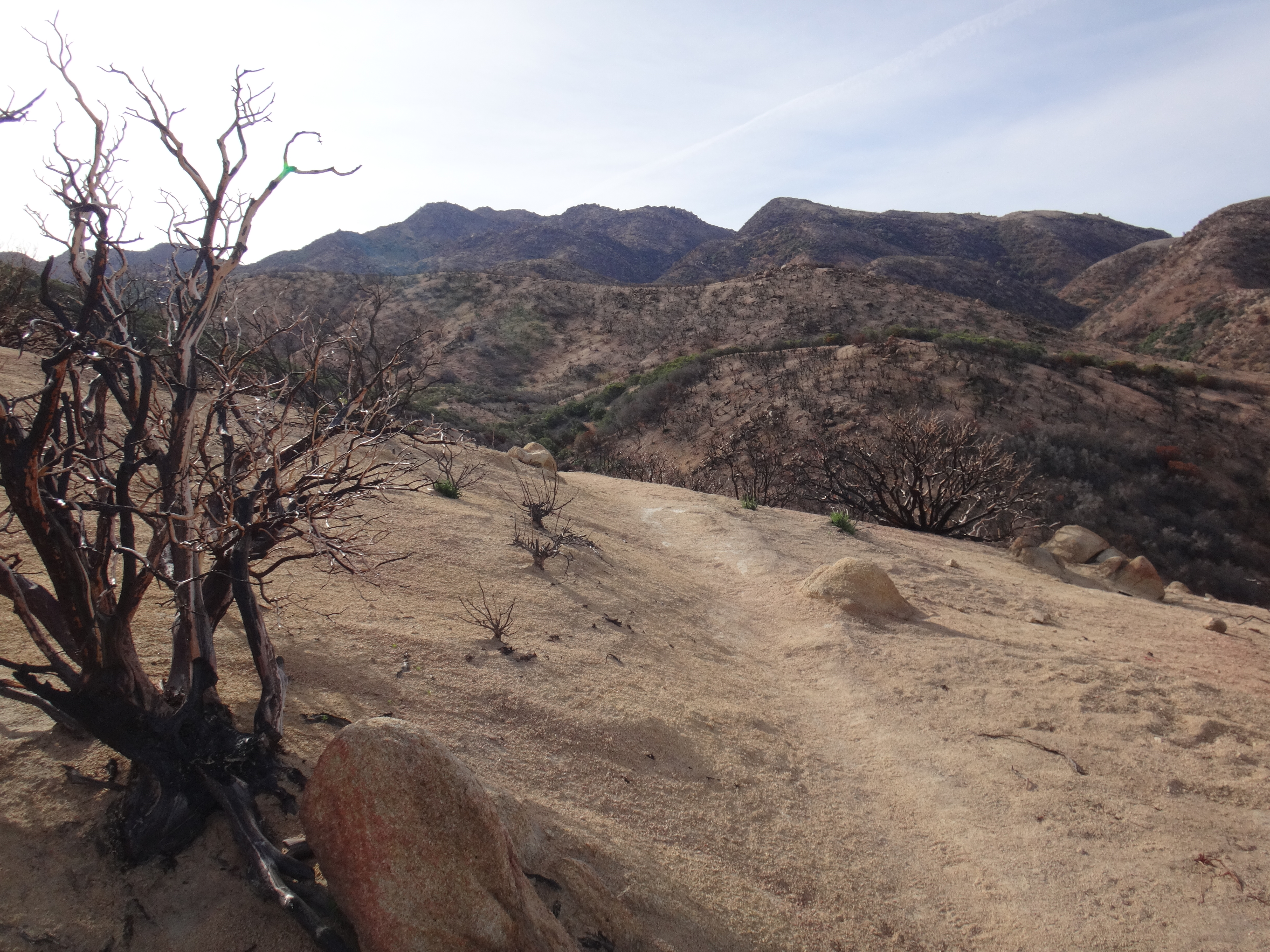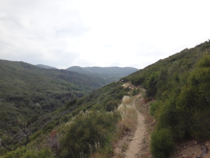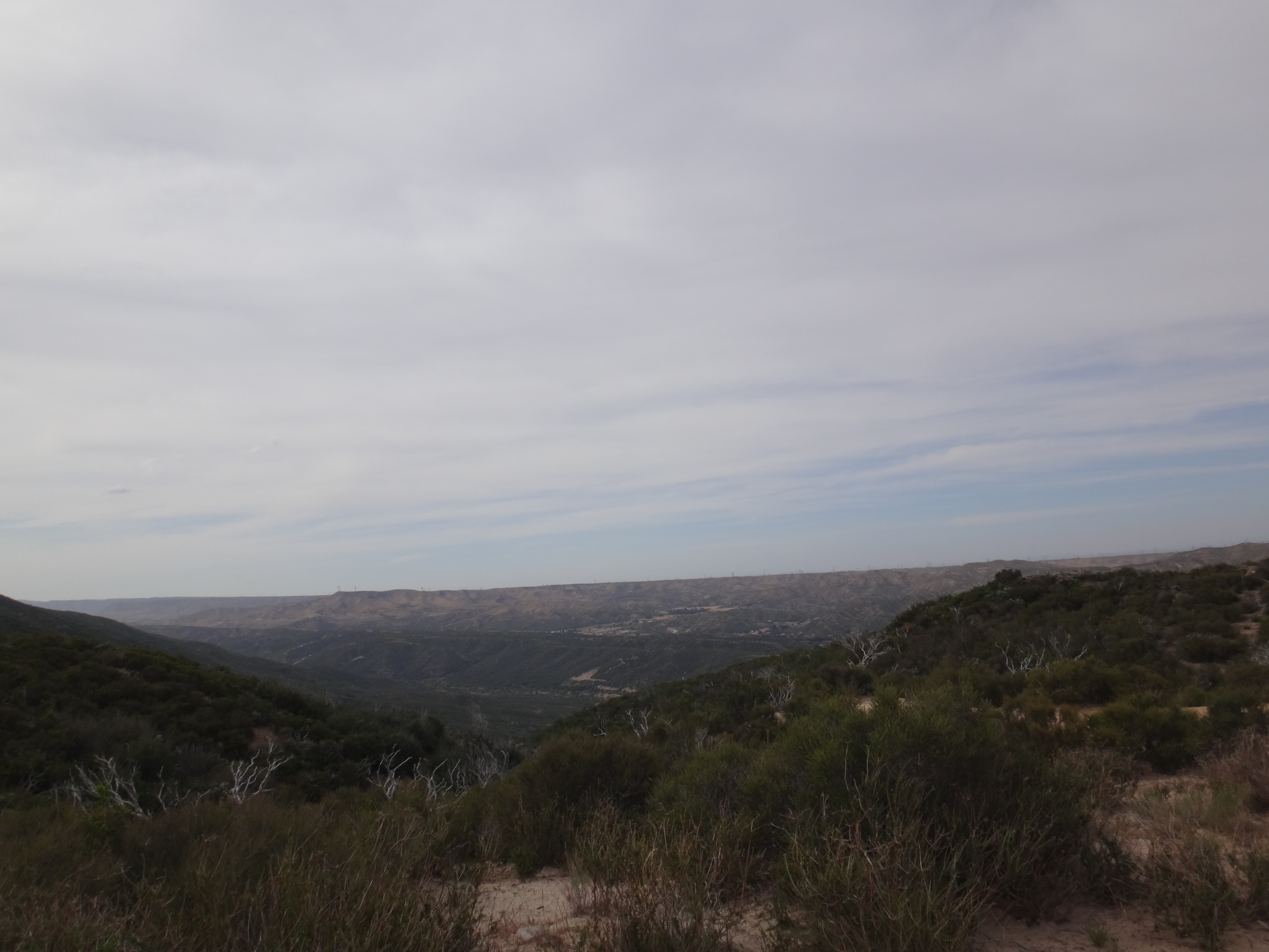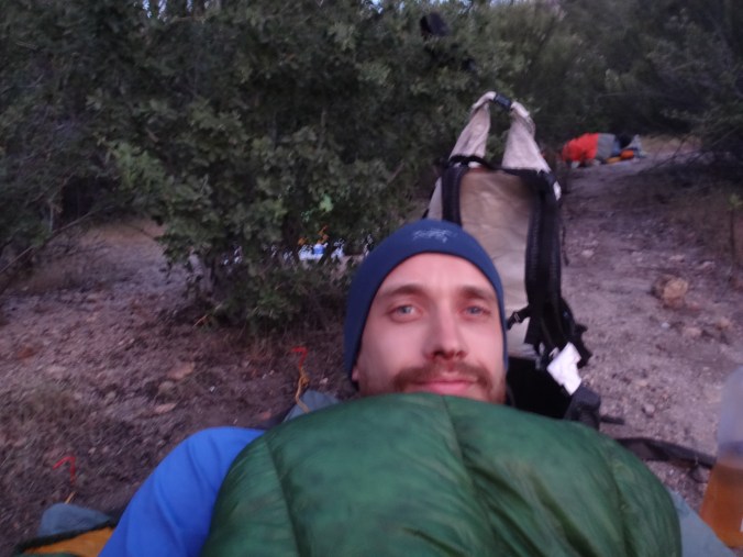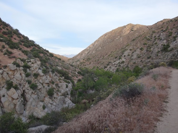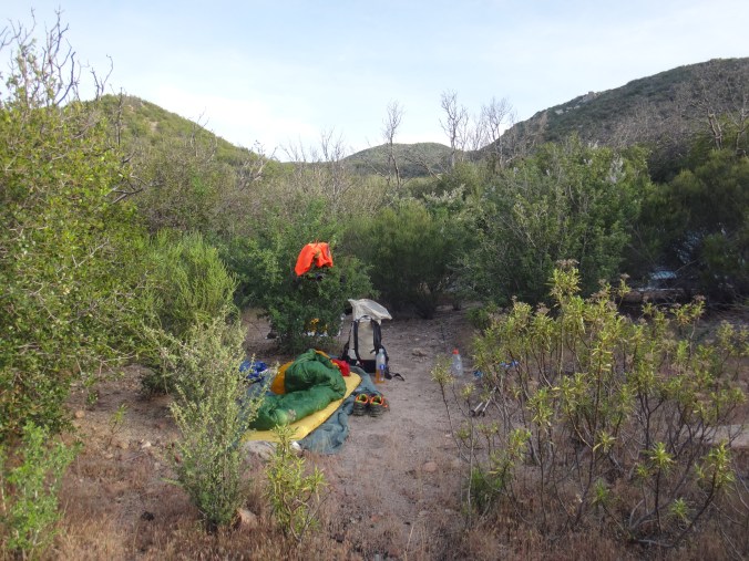 Da wir ohne Zelt geschlafen habe kam ab und an mal eine Fliege vorbei. Aber dies war mehr als erträglich. Ich habe ohne die begrenzenden Wände meines Zeltes wirklich super geschlafen. Um 6 stehe ich langsam auf. Mike ist schon am Wasser kochen. Ich verdrück mich im Schlafsack um die Ecke und sehe wie der Gast den wir gestern hier angetroffen hsben bereits abzieht. Ich lasse die lange Hose an und wechsel nur die Socken. Esse eine Zimtschnecke und ein Snickers und gehe um 6.30 los. Ich laufe weiter durch das Tal und folge dem Mission Creek. Der Weg ist jetzt begrenzt und ich laufe wie auf einer Mauer. Auch heute traut sich die Sonne nicht wirklich raus. Ich habe also noch meine Regenjacke angezogen. Damit bin ich auf den ersten 8 km bequem unterwegs. Als sich das Tal öffnet überquere ich ein großes Stauwehr. Um zu dem dazugehörigen Stausee zu kommen muss ich zuerst noch einen Fluss queren. Ich ziehe meine Hose aus und die Campschuhe an. Mit meinen Trailrunnern in den Händen gehe ich durch den kalten Mission Creek. Hier gibt’s leider keine heißen Quellen 😉 Auf der anderen Seite laufe ich zuerst weiter und suche mir ein sonniges Plätzchen. Alles wieder retour und weiter gehts. Das hohe dichte Gras am Wegesrand bereitet mir sorgen. Die Schlangen könnten überall sein. Ald sich dss Terrain öffnet und ich den Fluss verlasse geht es in eine größere Ebene. Ich mache mich langsam an den Aufstieg zu den angrenzenden Bergen. Alles ist verbrannt. Teilweise idt wirklich nur gelber Sand und verstorbene Büsche die vereinzelt rumstehen zu sehen. Hier kann man sehr vorausschauend laufen 😉