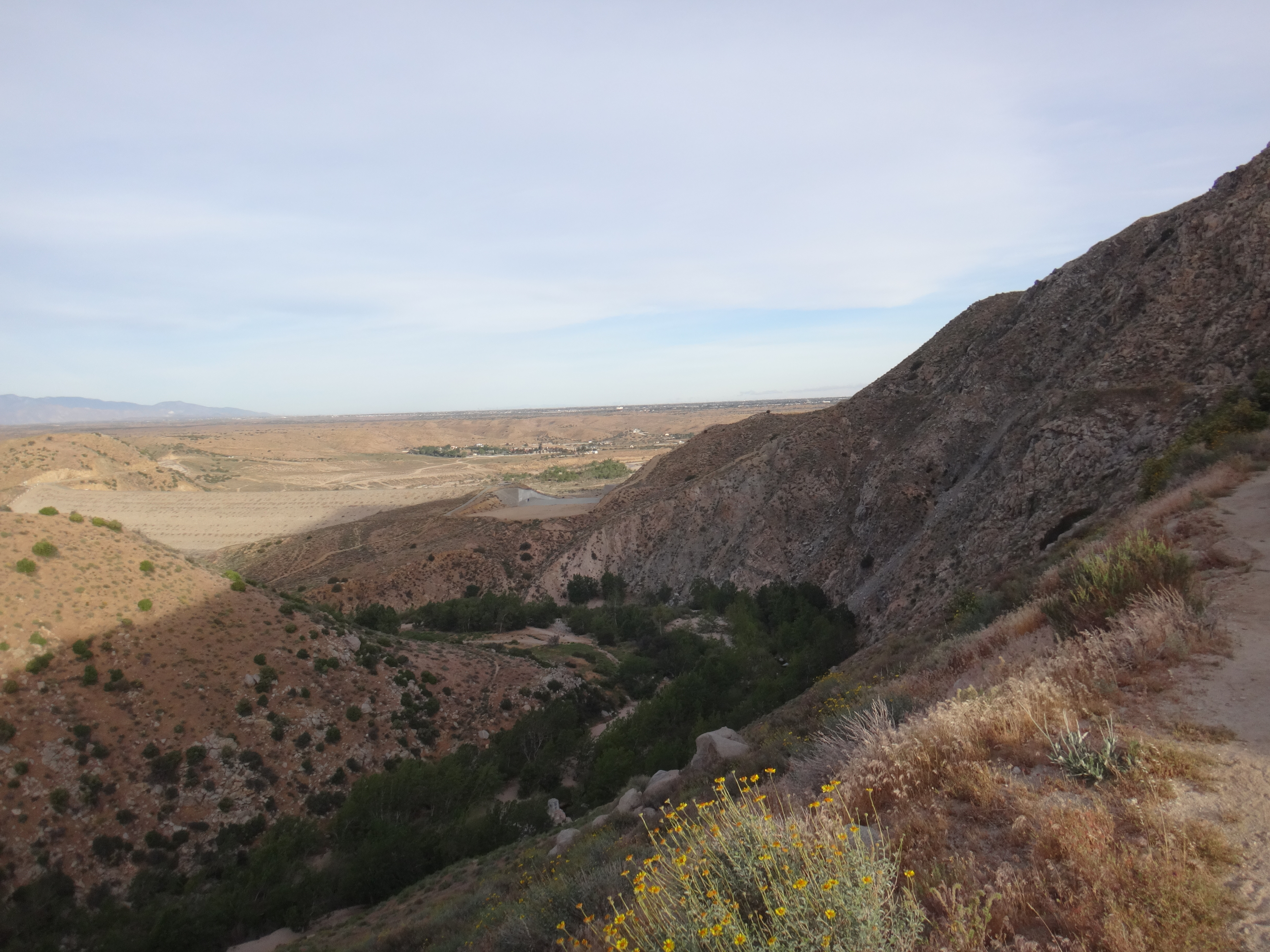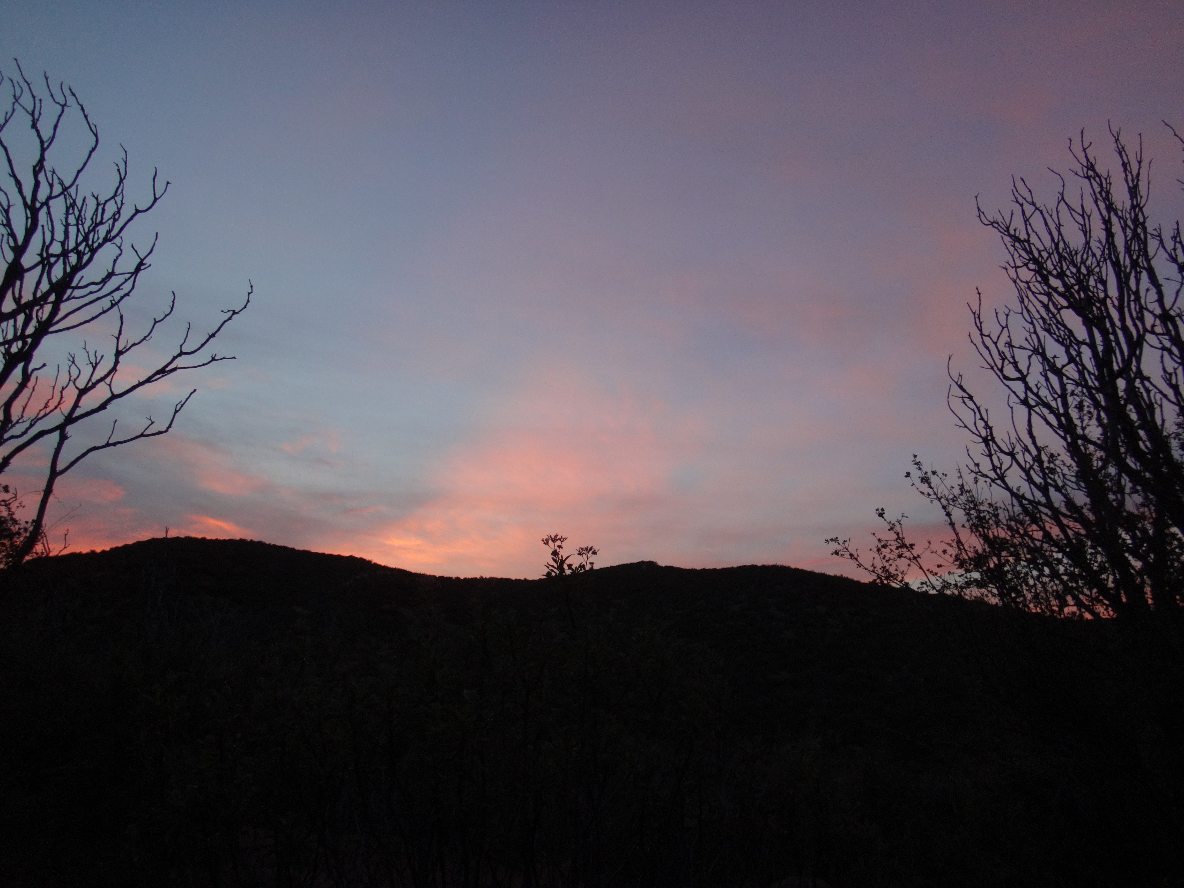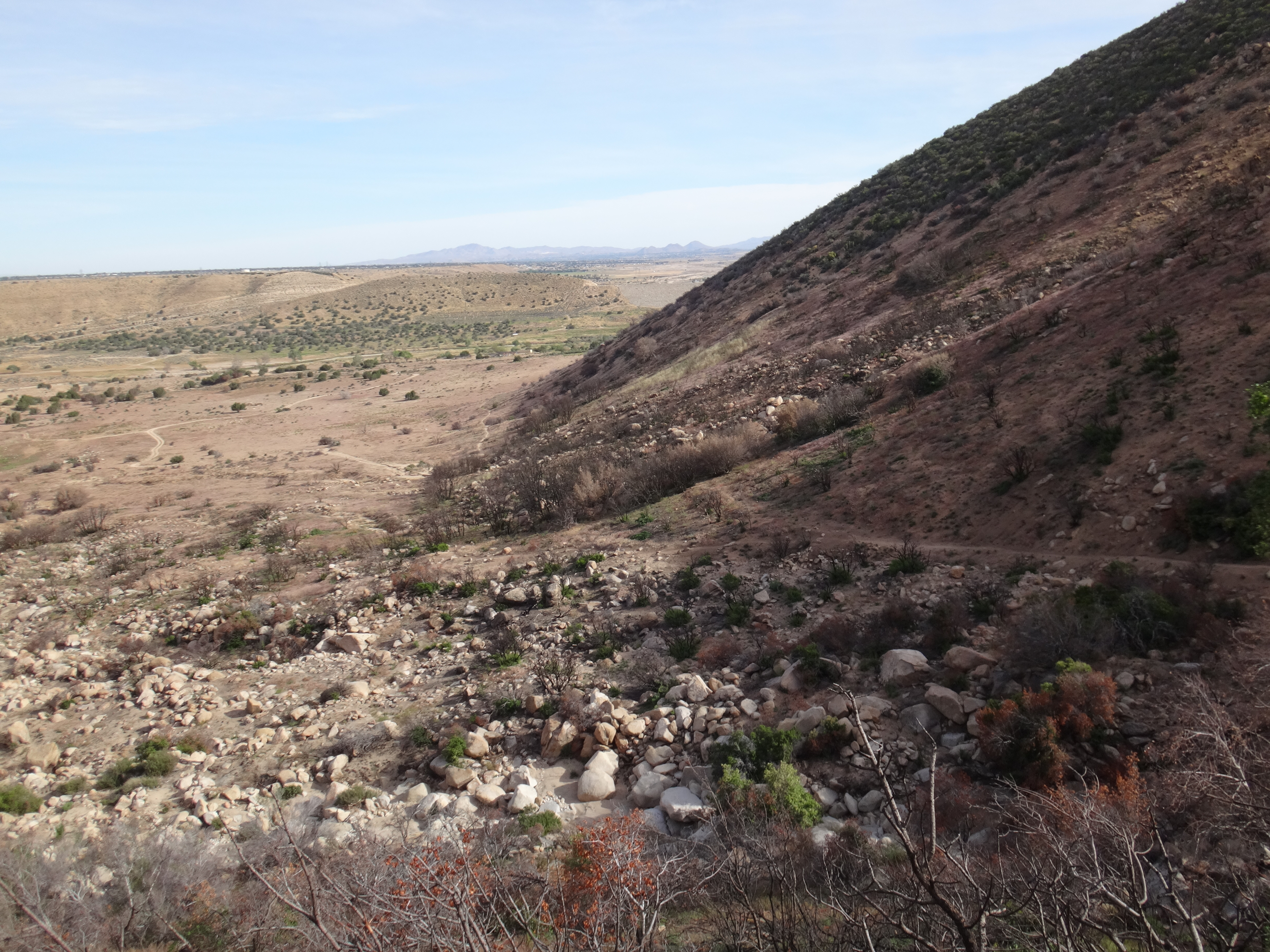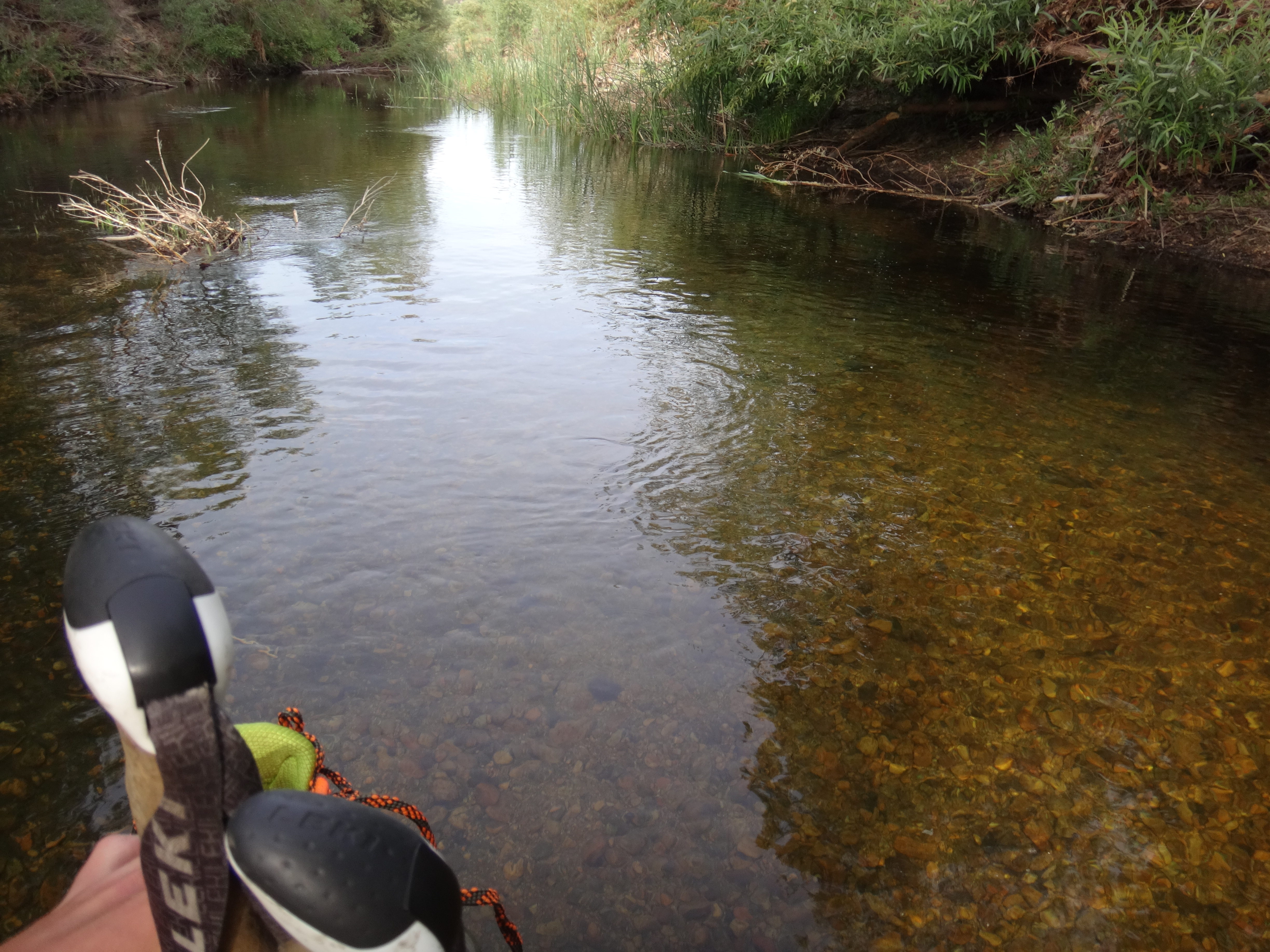Da wir ohne Zelt geschlafen habe kam ab und an mal eine Fliege vorbei. Aber dies war mehr als erträglich. Ich habe ohne die begrenzenden Wände meines Zeltes wirklich super geschlafen. Um 6 stehe ich langsam auf. Mike ist schon am Wasser kochen. Ich verdrück mich im Schlafsack um die Ecke und sehe wie der Gast den wir gestern hier angetroffen hsben bereits abzieht. Ich lasse die lange Hose an und wechsel nur die Socken. Esse eine Zimtschnecke und ein Snickers und gehe um 6.30 los. Ich laufe weiter durch das Tal und folge dem Mission Creek. Der Weg ist jetzt begrenzt und ich laufe wie auf einer Mauer. Auch heute traut sich die Sonne nicht wirklich raus. Ich habe also noch meine Regenjacke angezogen. Damit bin ich auf den ersten 8 km bequem unterwegs. Als sich das Tal öffnet überquere ich ein großes Stauwehr. Um zu dem dazugehörigen Stausee zu kommen muss ich zuerst noch einen Fluss queren. Ich ziehe meine Hose aus und die Campschuhe an. Mit meinen Trailrunnern in den Händen gehe ich durch den kalten Mission Creek. Hier gibt’s leider keine heißen Quellen 😉 Auf der anderen Seite laufe ich zuerst weiter und suche mir ein sonniges Plätzchen. Alles wieder retour und weiter gehts. Das hohe dichte Gras am Wegesrand bereitet mir sorgen. Die Schlangen könnten überall sein. Ald sich dss Terrain öffnet und ich den Fluss verlasse geht es in eine größere Ebene. Ich mache mich langsam an den Aufstieg zu den angrenzenden Bergen. Alles ist verbrannt. Teilweise idt wirklich nur gelber Sand und verstorbene Büsche die vereinzelt rumstehen zu sehen. Hier kann man sehr vorausschauend laufen 😉