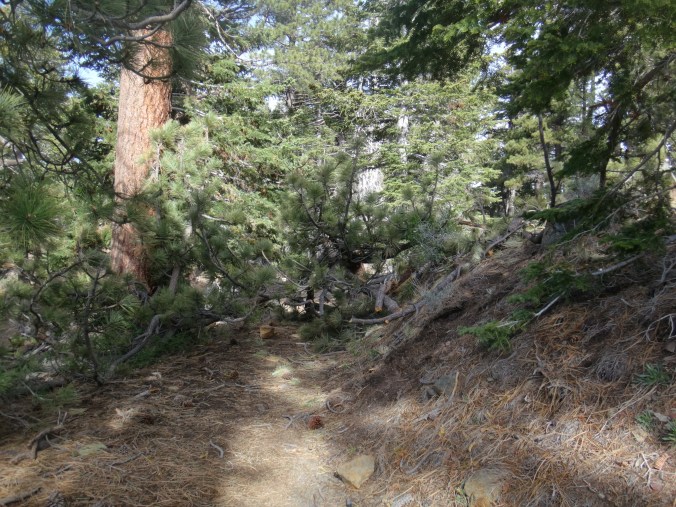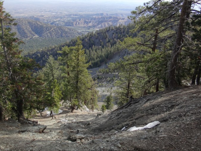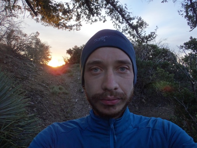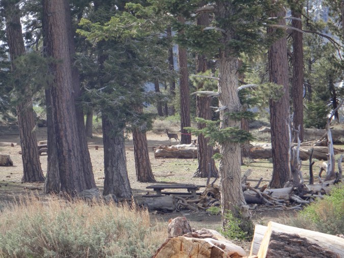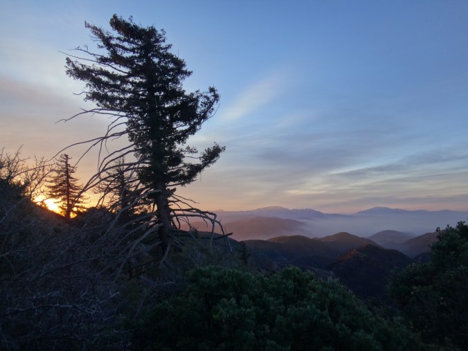 Dafür hatte ich einen super Sonnenaufgang als ich gegen 6 aus dem Zelt kam. Im Tal waren viele tiefe Wolken. Ich packte alles zusammen und machte mich auf die nächsten ca. 8 Kilometer bergauf. Der Wind bließ immer noch stark. Mit meinem Fleece war es aber ok. Je höher ich stieg desto größer wurde die Sicht auf das mir abgewandte Tal. Die Wolken zogen nun langsam in die Modelleisenbahnlandschaft. Ich achtete immer noch sehr auf Schlangen. Als sich mit den Höhenmetern aber auch die Vegetation änderte und ich durch große alte Bäume schlenderte geriet das ein wenig in Vergessenheit. Mein erstes Reh konnte ich kurz vor meinem Ziel erblicken. Es hüpfte mit großen Schwüngen davon. Wenige Meter nach der Sichtung erreichte ich mein Zwischenziel und frühstückte gemütlich. Allerdings wurde es recht schnell kalt und ich zog weiter den Berg hinauf. Immer noch durch schöne Nadelwälder nährte ich mich dem Skigebiet welches Highway Anbindung hat. Durch teilweise noch vorhandene Schneefelder ging es durch wunderschöne Wälder. Rechts und links immer wieder tolle Ausblicke. Immer wiederkehrende kleine Anstiege machten meinen müden Knien zu schaffen. Ich glaube der Aufstieg war einfach zu lang für mich. Aber die Umgebung ist so schön das ich schon alles von gestern vergessen habe. Nur mein Schlafdefizit macht mir noch zu schaffen. Auf einem Campingplatz sehe ich ein zweites Reh. Danach geht es in der Sonne wieder steil bergauf. Die Regenjacke habe ich immer noch an da es recht frisch wird. Das Fleece habe ich schon vor dem Frühstück ausgezogen.