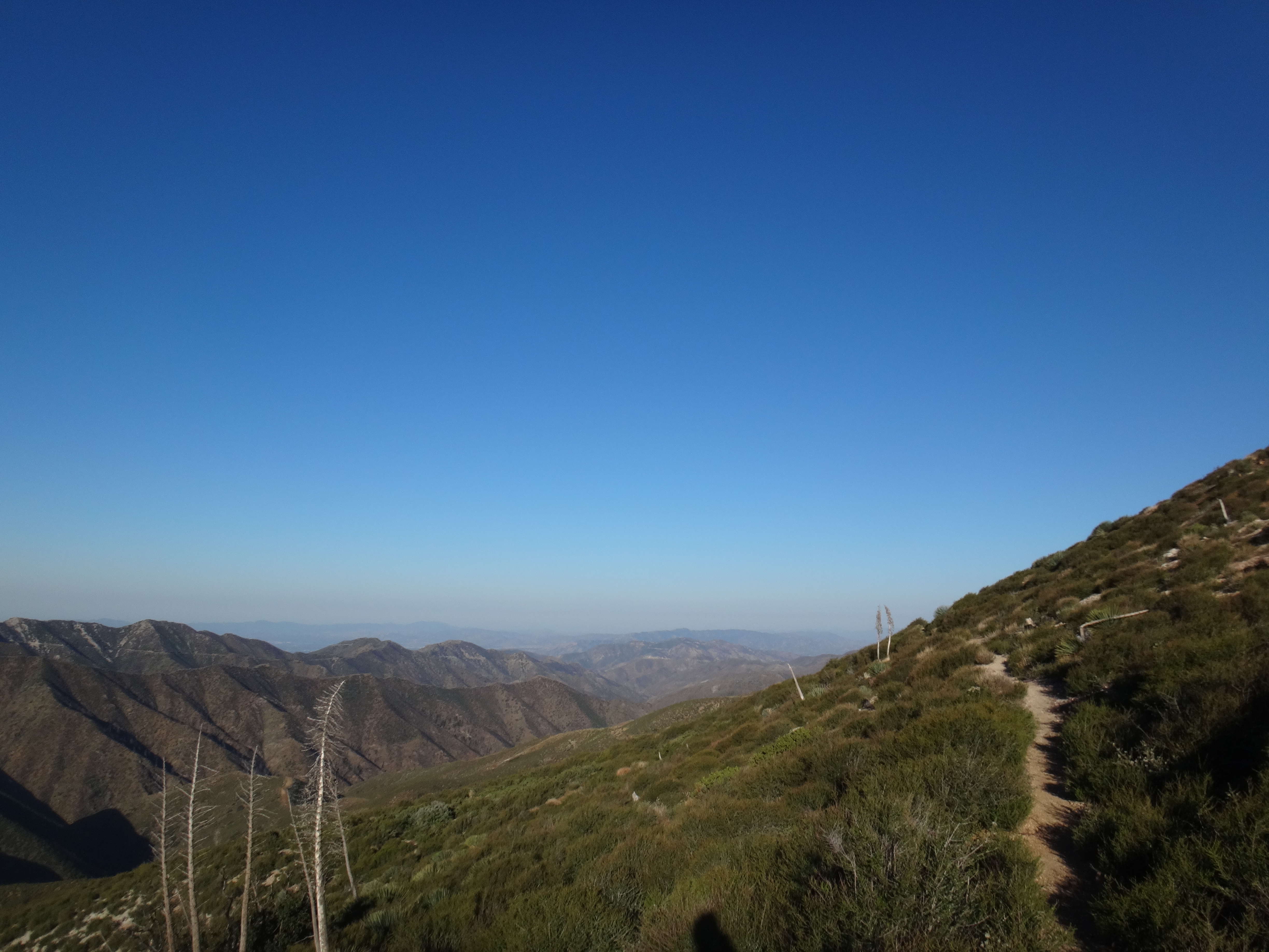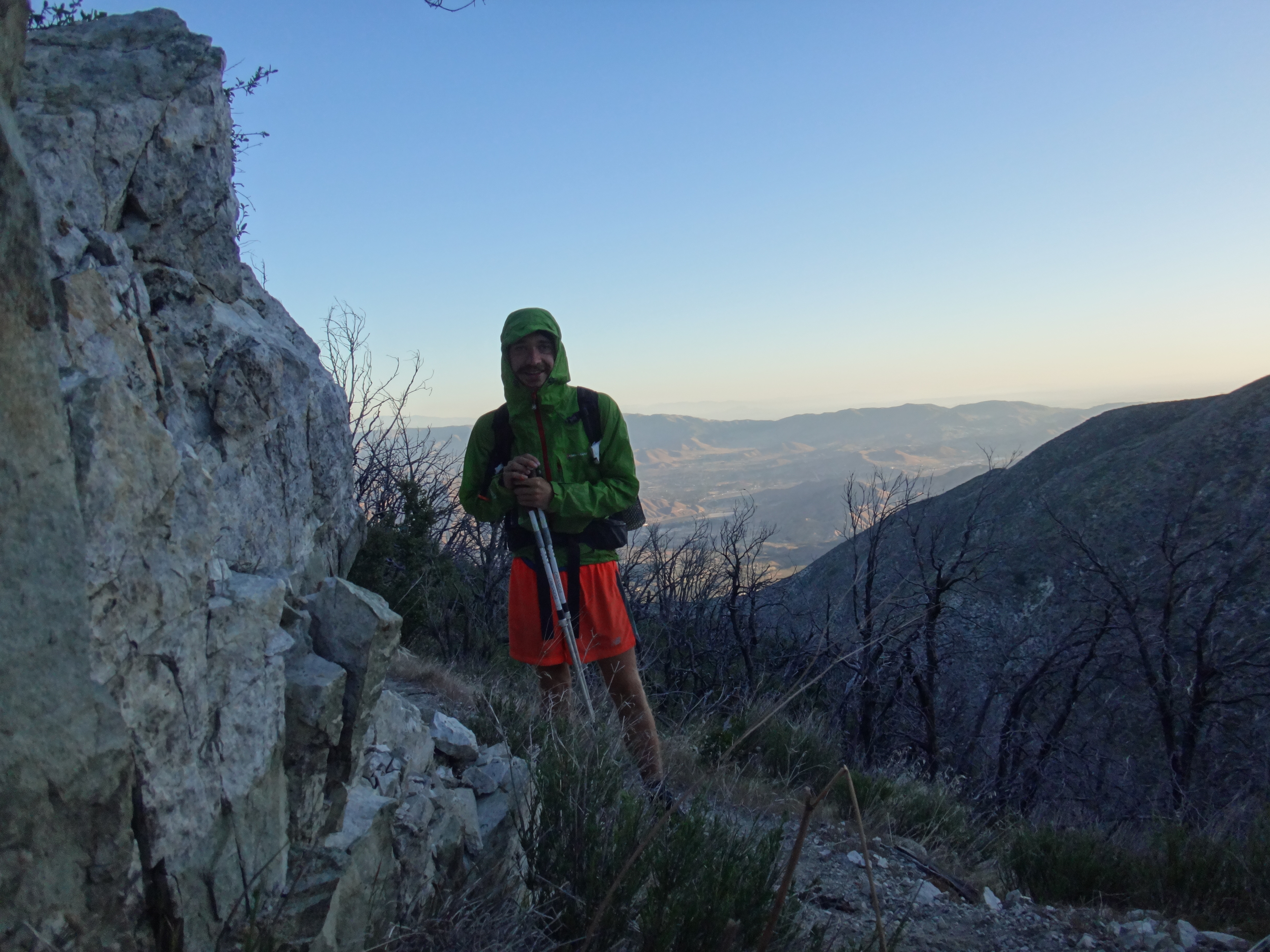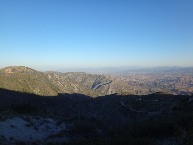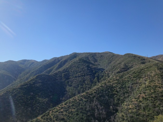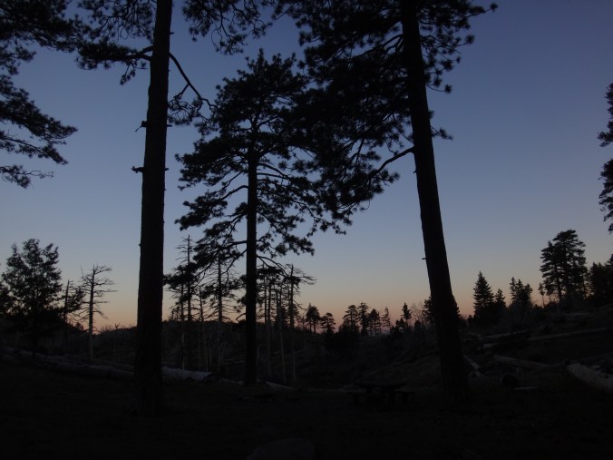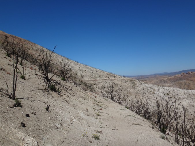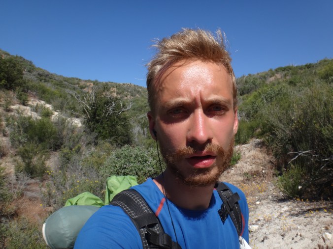 In der Nacht hat der Wind wieder zugenommen. Aus dem Schlafsack habe ich noch ein paar Fotos vom Sonnenuntergang geschossen und mir einen Film gegönnt. Bin aber irgendwann eingeschlafen. Gegen 5.50 war ich dann wach. Also richtig wach. Schließlich wackelte mein Zelt wieder erheblich. Bis zum KOA einem Campingplatz mit kleinem Laden sind es 22,9km. Es liegen einige größere Äste auf dem Platz die gestern noch nicht hier lagen. Um 6.30 laufe ich los. Die anderen taumeln gerade erst aus ihren Zelten. Mit kurzer Hose und Regenjacke wandere ich zuerst bergab. Im Trail sind Spuren von einem Reh und möglicherweise einem Bären zu sehen. Im Tal liegen hunderte von kleinen Bergen. Von der einen Seite mit Sonne geflutet, auf der anderen Seite noch dunkel und kalt. Schöner Anblick. Auch an den dunklen Bergflanken ist es noch kalt und windig. Die Bäume sind meist alle schwarz. Der Trail ist gemahlene Asche. Bis zur Rainger Station zieht es sich gefühlt ewig. Vor allem weil die Flüsse trocken sind. Ein Anstieg war noch zu bewältigen bevor ich endlich die Stromleitung sehen konnte die mein Zwischenziel ankündigte. Der Abstieg war jedoch wieder ewig. Ich kann es nicht in Worte fassen, aber diese Leistung so viele Kilometer in so wenig Fläche unterzubringen habe ich in noch keinem anderen Land gesehen… Es treibt mich manchmal zur weißglut. Das Ziel zum greifen nah und kurz vorher biegt man links ab, klettert 1 km einen Berg rauf und 2 km wieder runter um ans Ziel zu kommen anstatt einfach 100 Meter geradeaus zu gehen. Naja, nachdem ich durch den Busch gelaufen bin hat mich ein Ranger begrüßt und mir gezeigt wo es Wasser gibt. Hatte zwar noch 2 Liter aber wenn man die Möglichkeit hat greift man zu. Hab also einen getrunken und wieder aufgefüllt. Auf einer Bank habe ich noch versucht Chips zu essen, aber der Wind hat immer die Tüte verdreht sodass ich das aufgegeben habe. Nach 20 minuten Pause ging es gegen 8.40 weiter. Der Trail führte immer weiter ins Tal. Der Trail lag mitten in der Sonne. Ich musste meine Klamotten ausziehen und mich mit Sonnencreme eincremen. Es war so heiß. Mein Thermometer zeigte knapp 30 Grad im Schatten. Wenn dann der Wind nachlässt, läuft man quasi gegen eine Wand aus Hitze. Mit Blicken auf den gegüberliegenden Berg habe ich versucht die anderen auf dem Trail ausfindig zu machen. Leider erfolglos. Bei einer kleinen Pause mitten auf dem Trail habe ich noch 2 Riegel verdrückt. Musste nur die Schokolade von der Packung lecken da alles geschmolzen war. Nachdem fast 1000 Höhenmeter gefallen waren wurde die Hitze nur noch schlimmer. Im Tal fing ich ohne Ende an zu schwitzen da es direkt wieder hinauf ging. Alles sandig und staubig. Auch die beschissenen Grashalme welche sich in meine Schuhe picksen nerven. Wenn man sie nicht früh genug zieht verschwinden sie komplett im Schuh und man muss eine Zwangspause einlegen weil sie sich in meine Füße bohren. Auf der Ridgeline geht es weiter Richtung Tal. Ich kann nun den grünen Streifen ausmachen der den Fluss umgibt. Hier liegt der KOA. Die Hügel sind jetzt alle aus Sand. Wenig Bäume und viele verbrannte Sträucher. Der Zeltplatz liegt jetzt nur wenige Meter Luftlinie von mir entfernt. Ich muss natürlich noch 3 km um einen Berg laufen. Durch hohes Gras geht es einmal drum herum anstatt 10 min geradeaus bergab zu gehen. Ohne Worte. Ich komme auf die Straße und tropfe nur so auf den Asphalt. Über einen kleinen Weg gelange ich zum Campingplatz. 11:30 Uhr. Hier hole ich 400ml Eiscreme und eine Soda. Nach einer Stunde kommen die anderen. Ich hole eine zweite Runde Eiscreme. Brian ist verletzt und ruft einen Trail Angel an welcher später am Nachmittag kommt und sich um ihn kümmert. Wahrscheinlich muss er ein paar Tage pausieren weil er Schmerzen im Schienbein hat. Auch ein andere Person die wir nicht kennnen kommt auf den Platz. Ein Ast ist auf ihn gefallen und er wird vom Heli abgeholt. Man muss echt aufpassen wo man schläft und wandert. Es gibt viele tote Bäume.