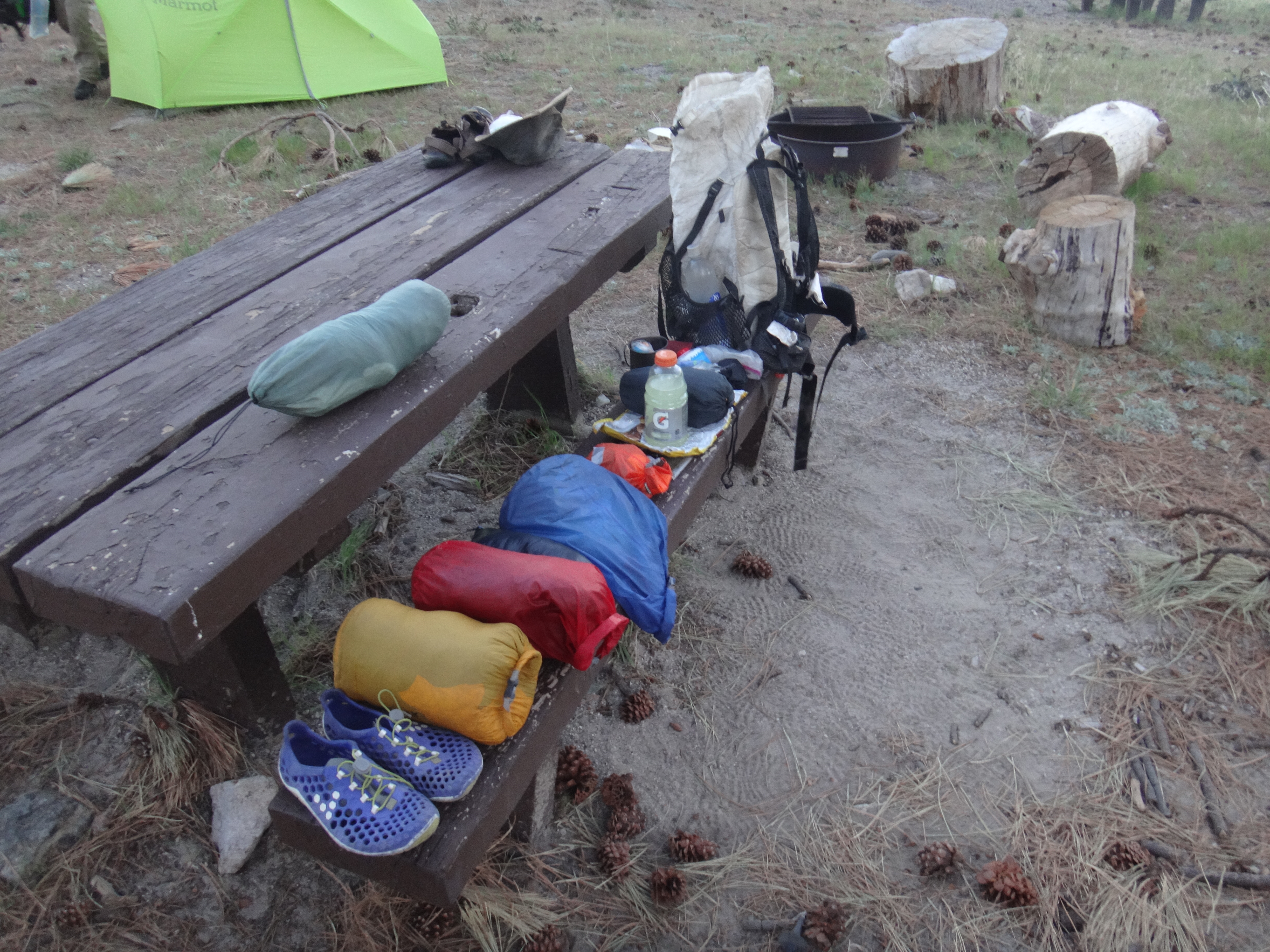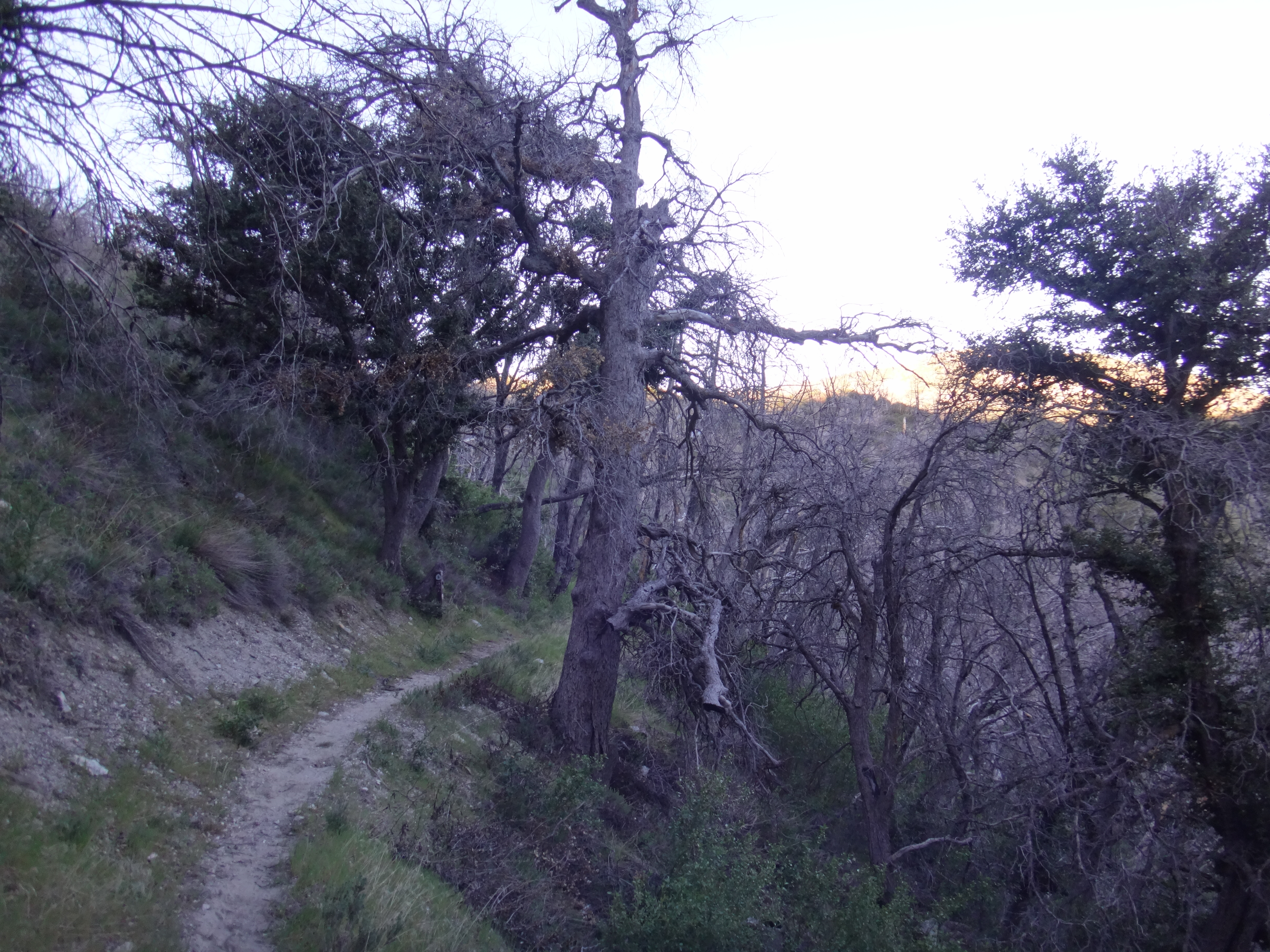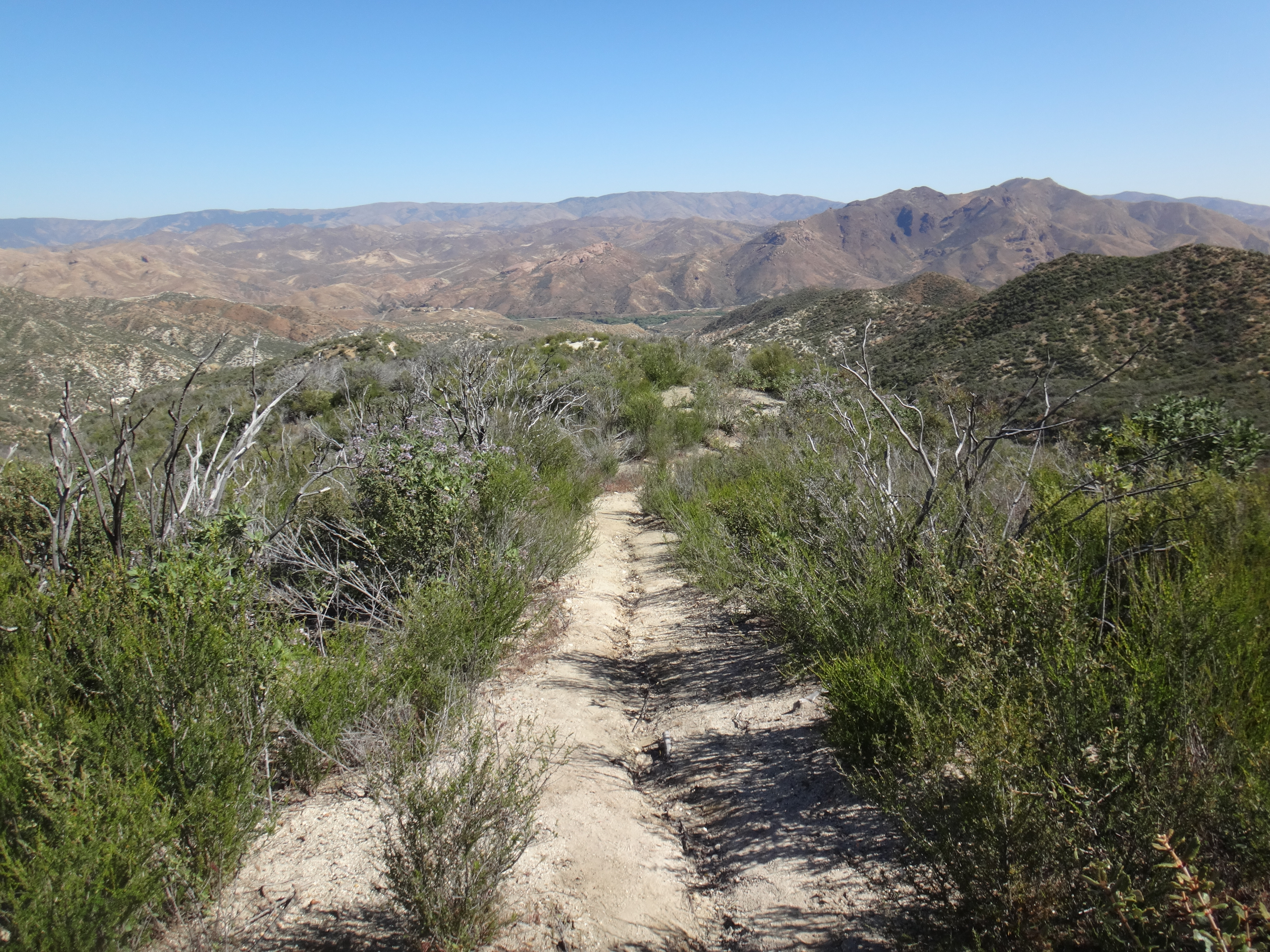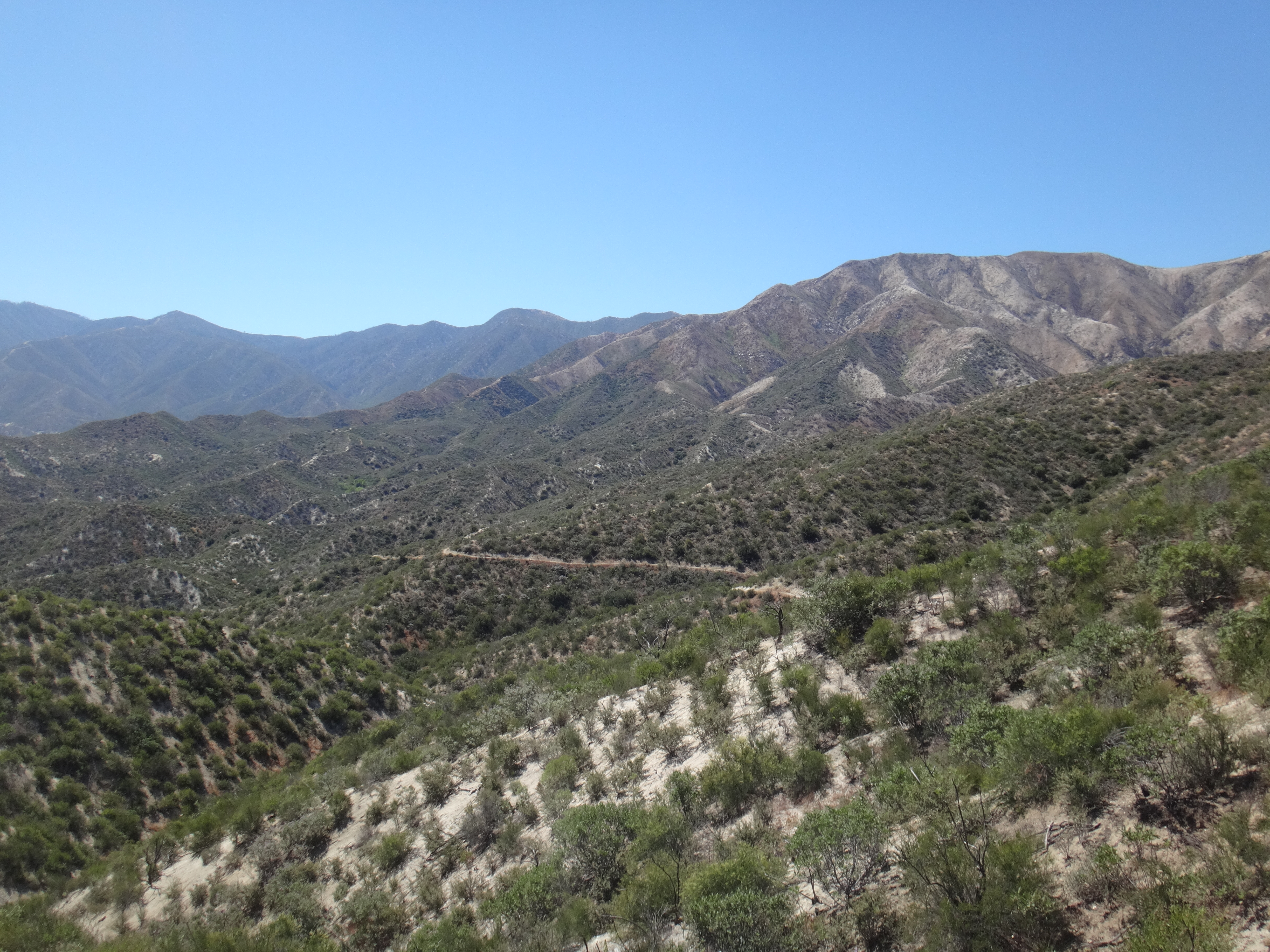 In der Nacht hat der Wind wieder zugenommen. Aus dem Schlafsack habe ich noch ein paar Fotos vom Sonnenuntergang geschossen und mir einen Film gegönnt. Bin aber irgendwann eingeschlafen. Gegen 5.50 war ich dann wach. Also richtig wach. Schließlich wackelte mein Zelt wieder erheblich. Bis zum KOA einem Campingplatz mit kleinem Laden sind es 22,9km. Es liegen einige größere Äste auf dem Platz die gestern noch nicht hier lagen. Um 6.30 laufe ich los. Die anderen taumeln gerade erst aus ihren Zelten. Mit kurzer Hose und Regenjacke wandere ich zuerst bergab. Im Trail sind Spuren von einem Reh und möglicherweise einem Bären zu sehen. Im Tal liegen hunderte von kleinen Bergen. Von der einen Seite mit Sonne geflutet, auf der anderen Seite noch dunkel und kalt. Schöner Anblick. Auch an den dunklen Bergflanken ist es noch kalt und windig. Die Bäume sind meist alle schwarz. Der Trail ist gemahlene Asche. Bis zur Rainger Station zieht es sich gefühlt ewig. Vor allem weil die Flüsse trocken sind. Ein Anstieg war noch zu bewältigen bevor ich endlich die Stromleitung sehen konnte die mein Zwischenziel ankündigte. Der Abstieg war jedoch wieder ewig. Ich kann es nicht in Worte fassen, aber diese Leistung so viele Kilometer in so wenig Fläche unterzubringen habe ich in noch keinem anderen Land gesehen… Es treibt mich manchmal zur weißglut. Das Ziel zum greifen nah und kurz vorher biegt man links ab, klettert 1 km einen Berg rauf und 2 km wieder runter um ans Ziel zu kommen anstatt einfach 100 Meter geradeaus zu gehen. Naja, nachdem ich durch den Busch gelaufen bin hat mich ein Ranger begrüßt und mir gezeigt wo es Wasser gibt. Hatte zwar noch 2 Liter aber wenn man die Möglichkeit hat greift man zu. Hab also einen getrunken und wieder aufgefüllt. Auf einer Bank habe ich noch versucht Chips zu essen, aber der Wind hat immer die Tüte verdreht sodass ich das aufgegeben habe. Nach 20 minuten Pause ging es gegen 8.40 weiter. Der Trail führte immer weiter ins Tal. Der Trail lag mitten in der Sonne. Ich musste meine Klamotten ausziehen und mich mit Sonnencreme eincremen. Es war so heiß. Mein Thermometer zeigte knapp 30 Grad im Schatten. Wenn dann der Wind nachlässt, läuft man quasi gegen eine Wand aus Hitze. Mit Blicken auf den gegüberliegenden Berg habe ich versucht die anderen auf dem Trail ausfindig zu machen. Leider erfolglos. Bei einer kleinen Pause mitten auf dem Trail habe ich noch 2 Riegel verdrückt. Musste nur die Schokolade von der Packung lecken da alles geschmolzen war. Nachdem fast 1000 Höhenmeter gefallen waren wurde die Hitze nur noch schlimmer. Im Tal fing ich ohne Ende an zu schwitzen da es direkt wieder hinauf ging. Alles sandig und staubig. Auch die beschissenen Grashalme welche sich in meine Schuhe picksen nerven. Wenn man sie nicht früh genug zieht verschwinden sie komplett im Schuh und man muss eine Zwangspause einlegen weil sie sich in meine Füße bohren. Auf der Ridgeline geht es weiter Richtung Tal. Ich kann nun den grünen Streifen ausmachen der den Fluss umgibt. Hier liegt der KOA. Die Hügel sind jetzt alle aus Sand. Wenig Bäume und viele verbrannte Sträucher. Der Zeltplatz liegt jetzt nur wenige Meter Luftlinie von mir entfernt. Ich muss natürlich noch 3 km um einen Berg laufen. Durch hohes Gras geht es einmal drum herum anstatt 10 min geradeaus bergab zu gehen. Ohne Worte. Ich komme auf die Straße und tropfe nur so auf den Asphalt. Über einen kleinen Weg gelange ich zum Campingplatz. 11:30 Uhr. Hier hole ich 400ml Eiscreme und eine Soda. Nach einer Stunde kommen die anderen. Ich hole eine zweite Runde Eiscreme. Brian ist verletzt und ruft einen Trail Angel an welcher später am Nachmittag kommt und sich um ihn kümmert. Wahrscheinlich muss er ein paar Tage pausieren weil er Schmerzen im Schienbein hat. Auch ein andere Person die wir nicht kennnen kommt auf den Platz. Ein Ast ist auf ihn gefallen und er wird vom Heli abgeholt. Man muss echt aufpassen wo man schläft und wandert. Es gibt viele tote Bäume.