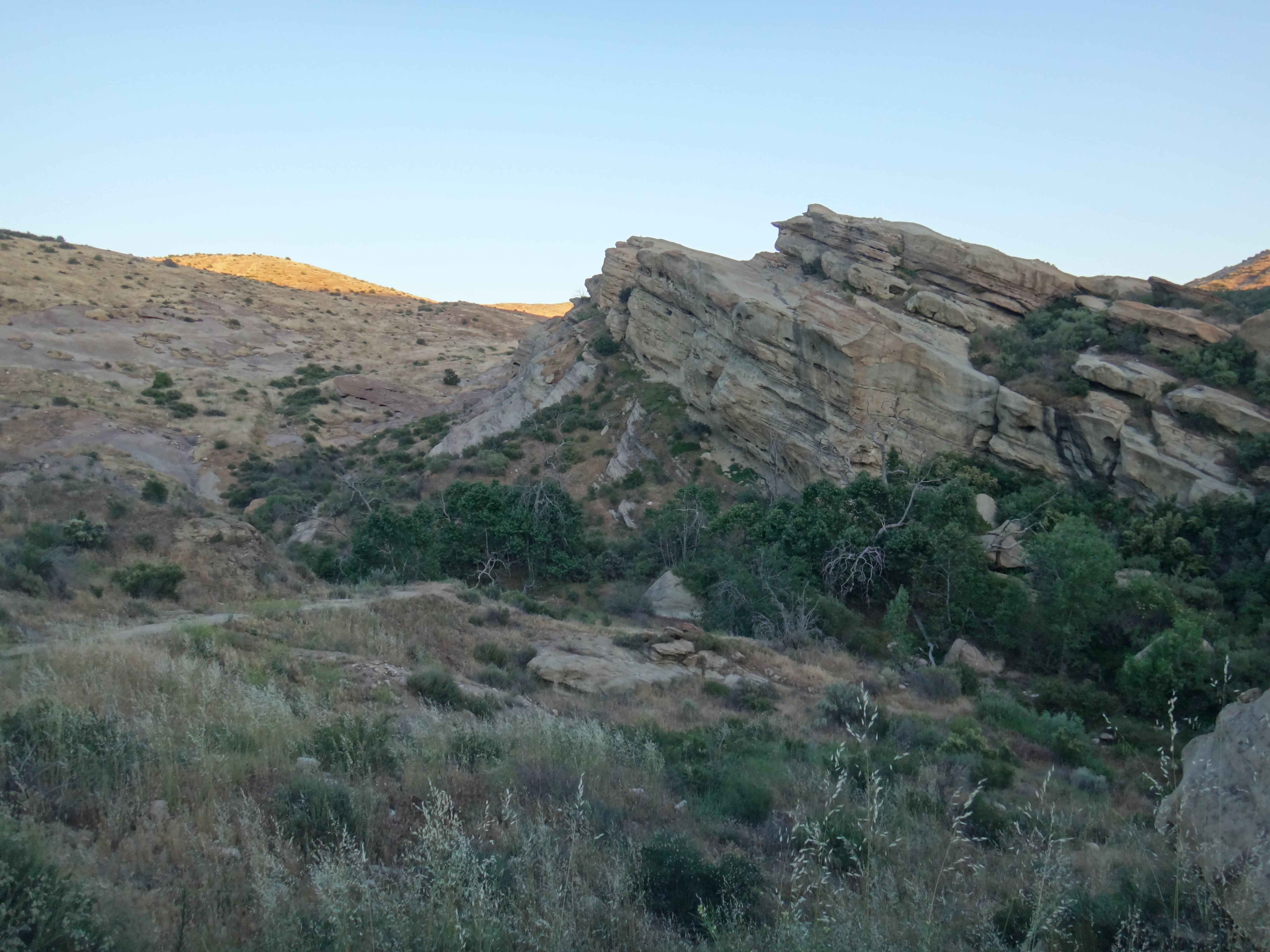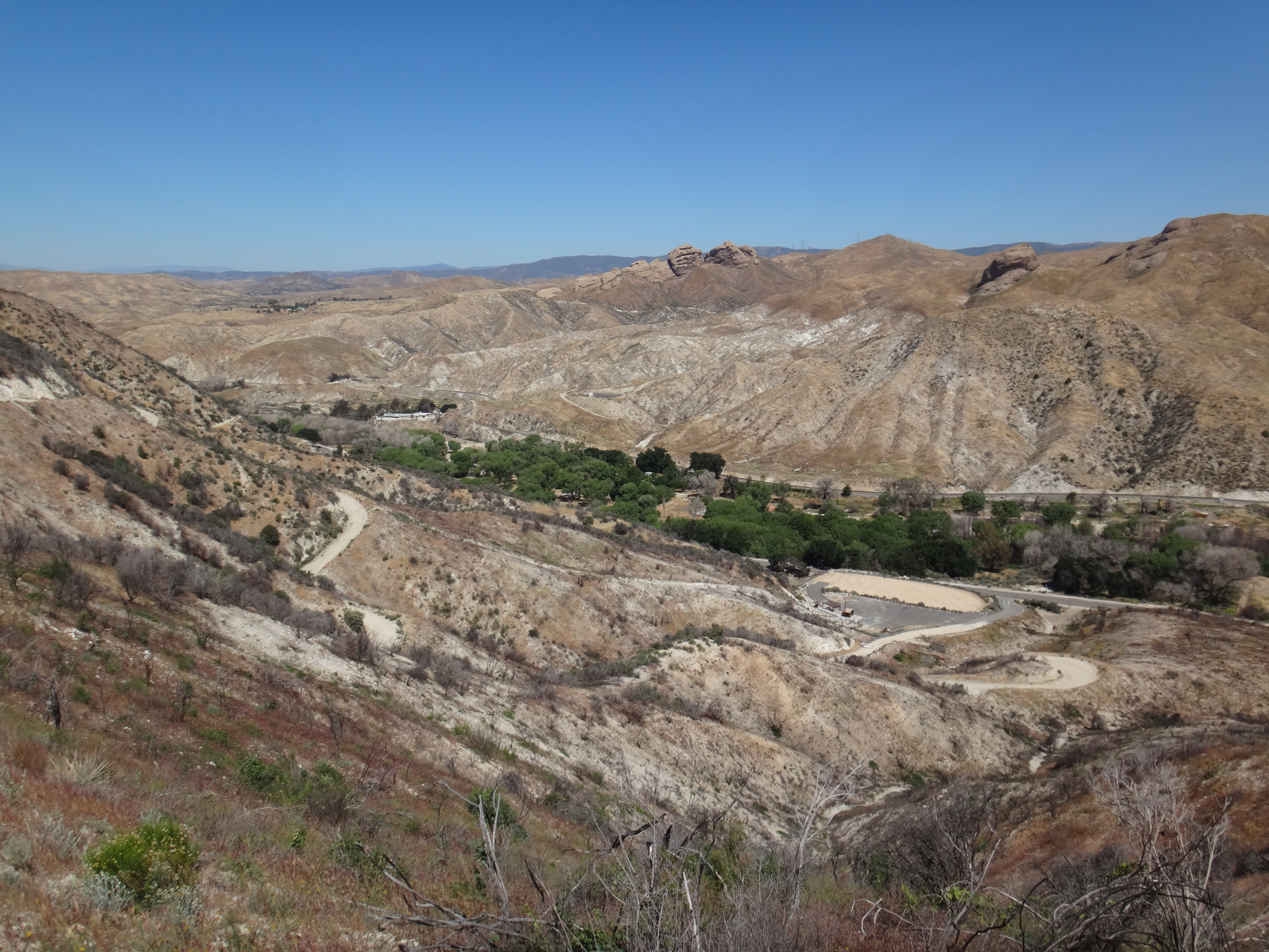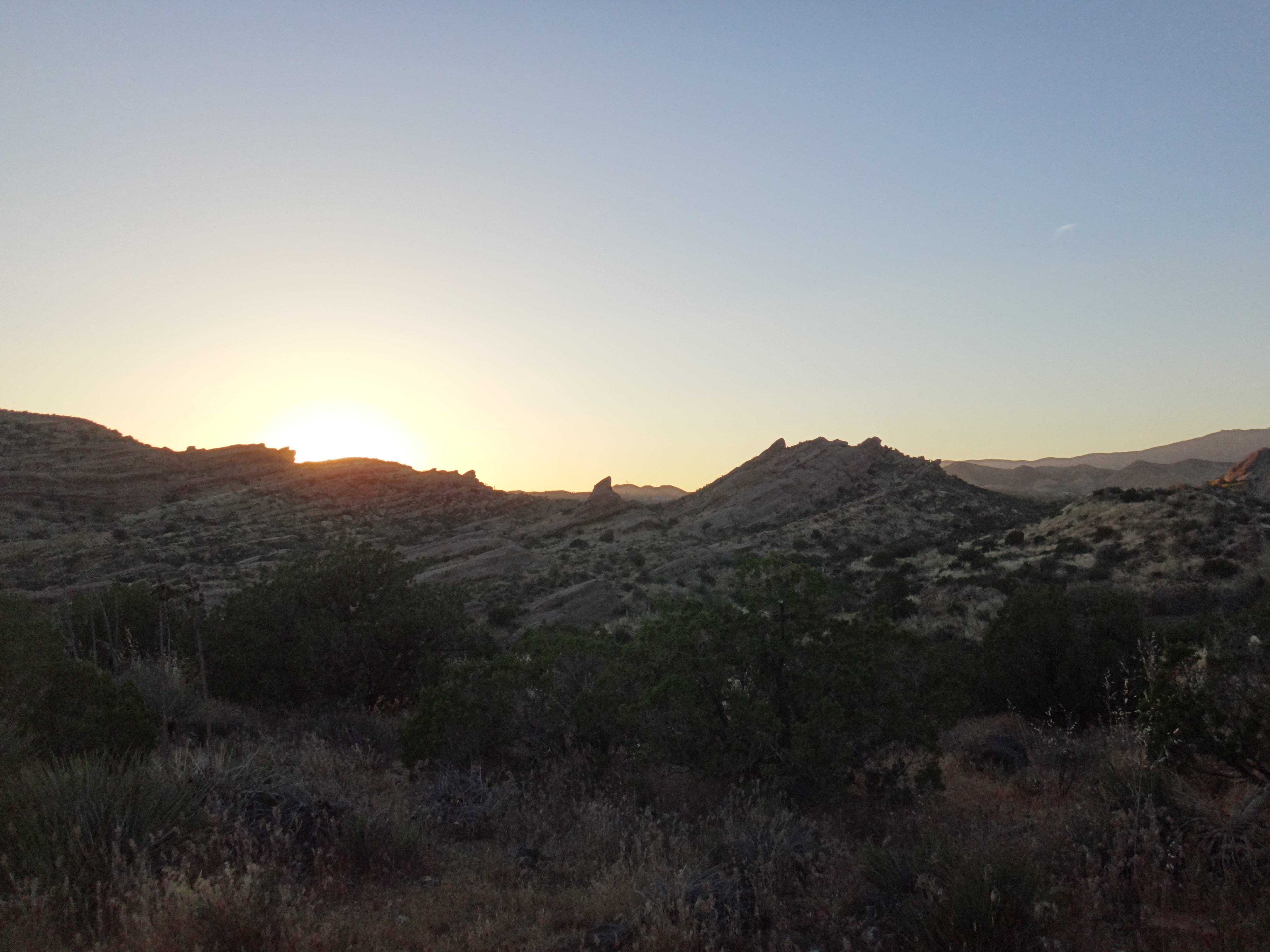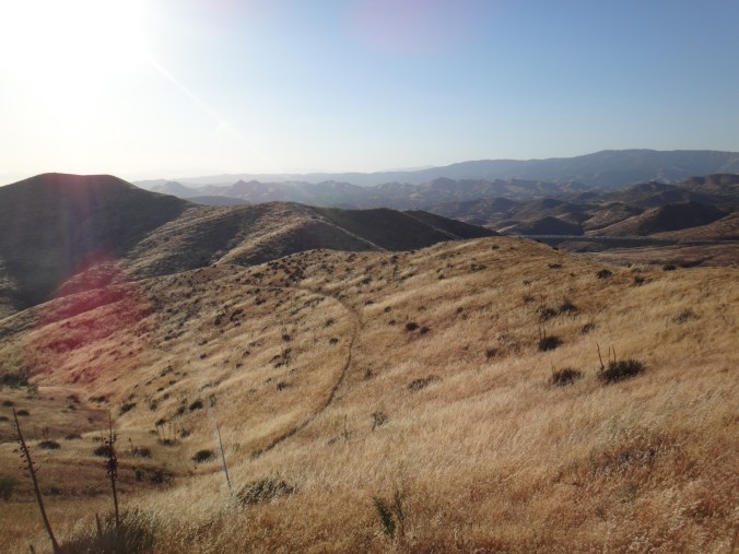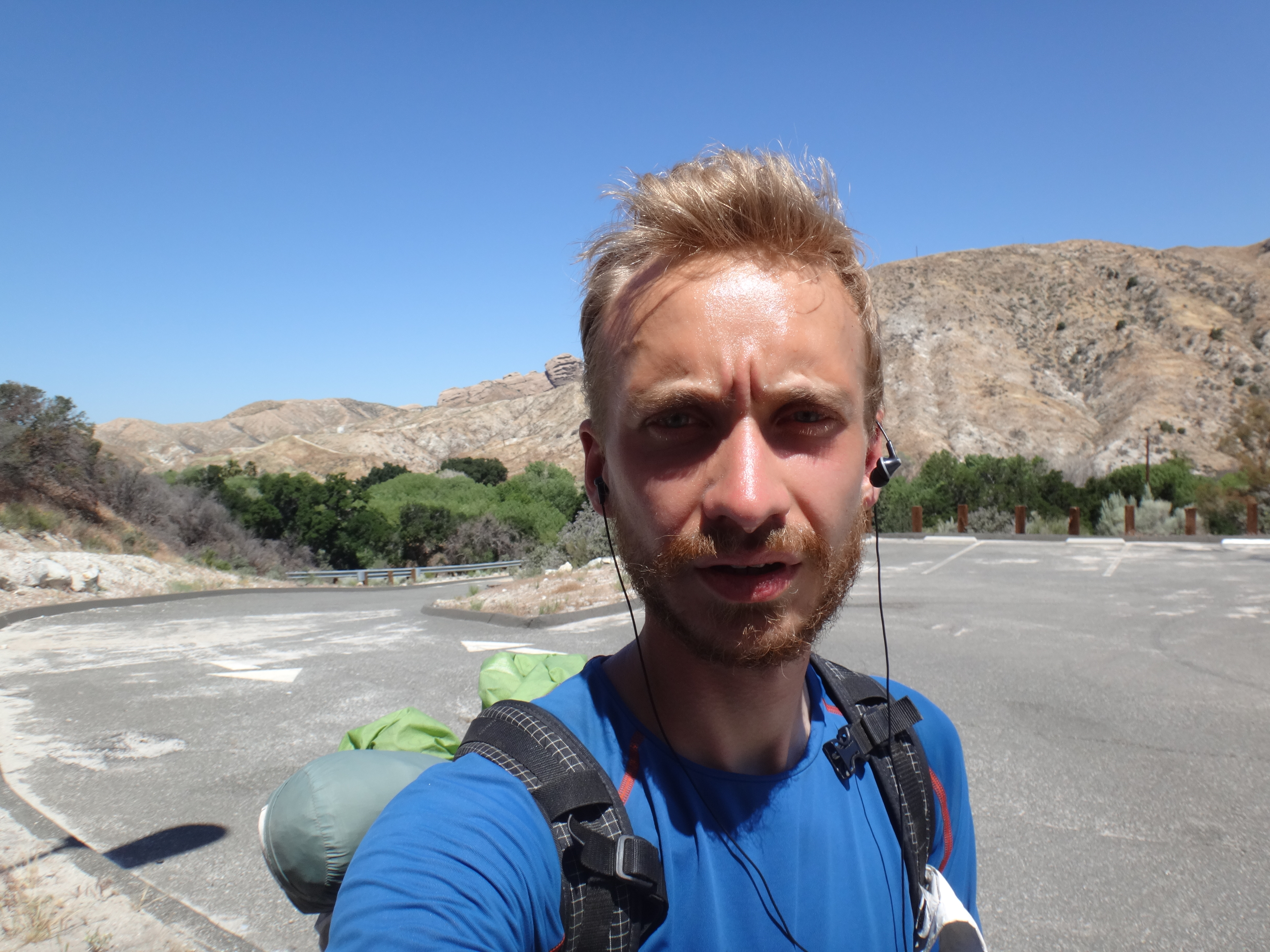 Gegen 16:30 laufen wir weiter. Unter meinem Sonnenschirm ist es einigermaßen erträglich und wir laufen den grasigen Hügel hinauf. Links und rechts hohes Gras. Wir treffen auf eine weitere Klapperschlange. Rattler und CheapSunglasses sind noch ziemlich fit und wollen bis zum HikerHeaven in Agua Dulce laufen. Also suchen wir keinen Spot und laufen weiter. Wir erreichen nach einem Abstieg der durch hohes Gras geht das in der Sonne hin und her weht den HW14 und unterqueren ihn in einem Kanal. Ziemlich dunkel und lang. Wir sehen teilweise nichts mehr. Auf der deren Seite kommen wir in ein Tal mit vielen Felsen. Geologisch höchst interessant da viele verschiedene Schichten zu sehen sind. Vasquez Rocks wird dieser Teil genannt. Durch den gleichnamigen County Park gelangen wir nach Agua Dulce. Als wir die Stadtstraßen erreichen hält eine Helferin aus dem HikerHeaven an und nimmt uns mit. Wir bekommen eine Dusche, Wäscheservice, Wechselklamotten, Sodas, Küche ubd Wohnzimmer, den Garten zum zelten und vieles mehr. Ein Traum. Es sind vielleicht 15 Leute hier. Es ist generell sehr wenig los. Wir sehen fast keinen auf dem Trail. Nach einer dusche und Wraps mit dem restlichen Käse und Wurst gehts nach 22 Uhr ins Bett. Wir schlafen heute im Himmel. Brian übrigens auch.