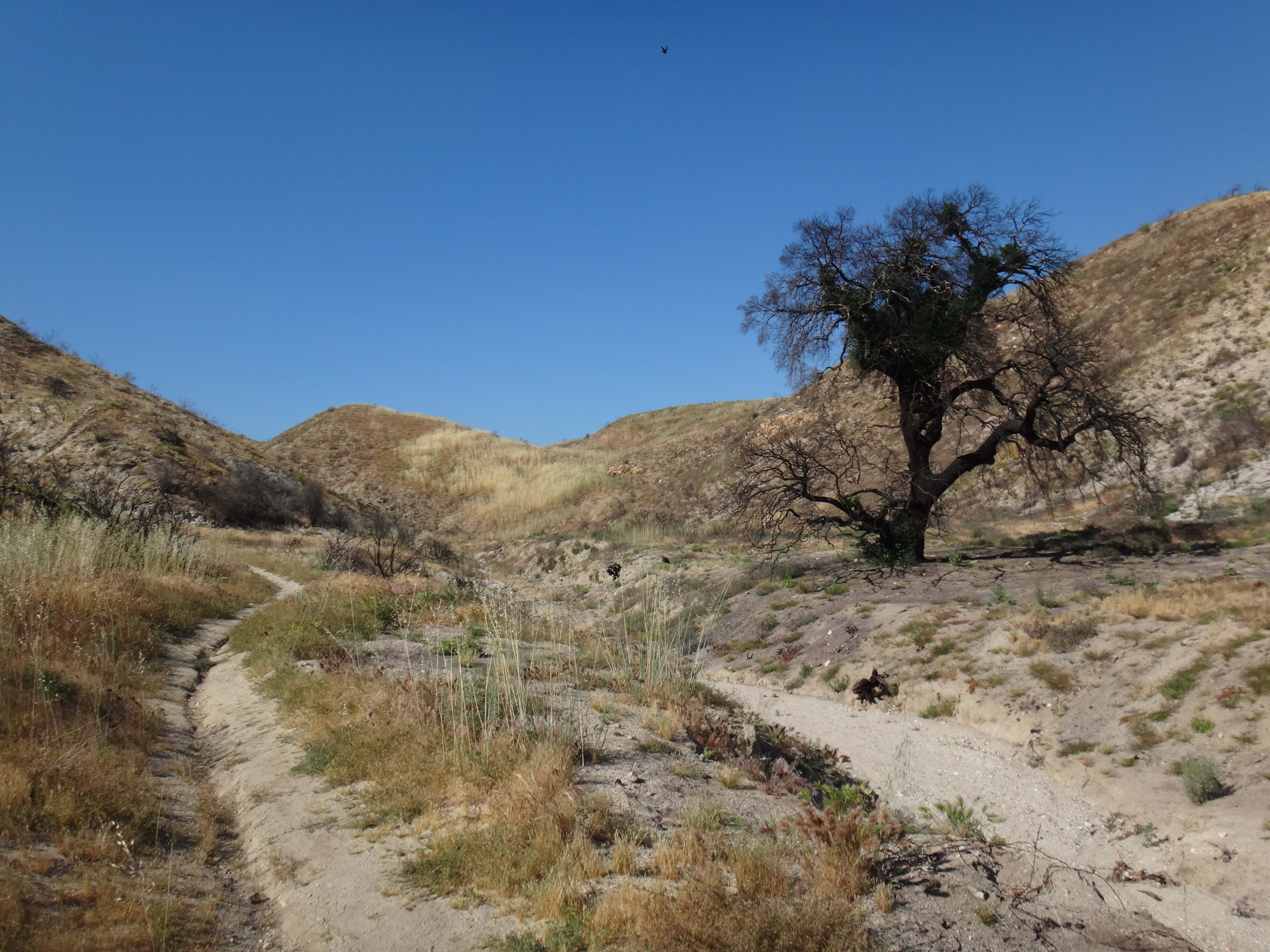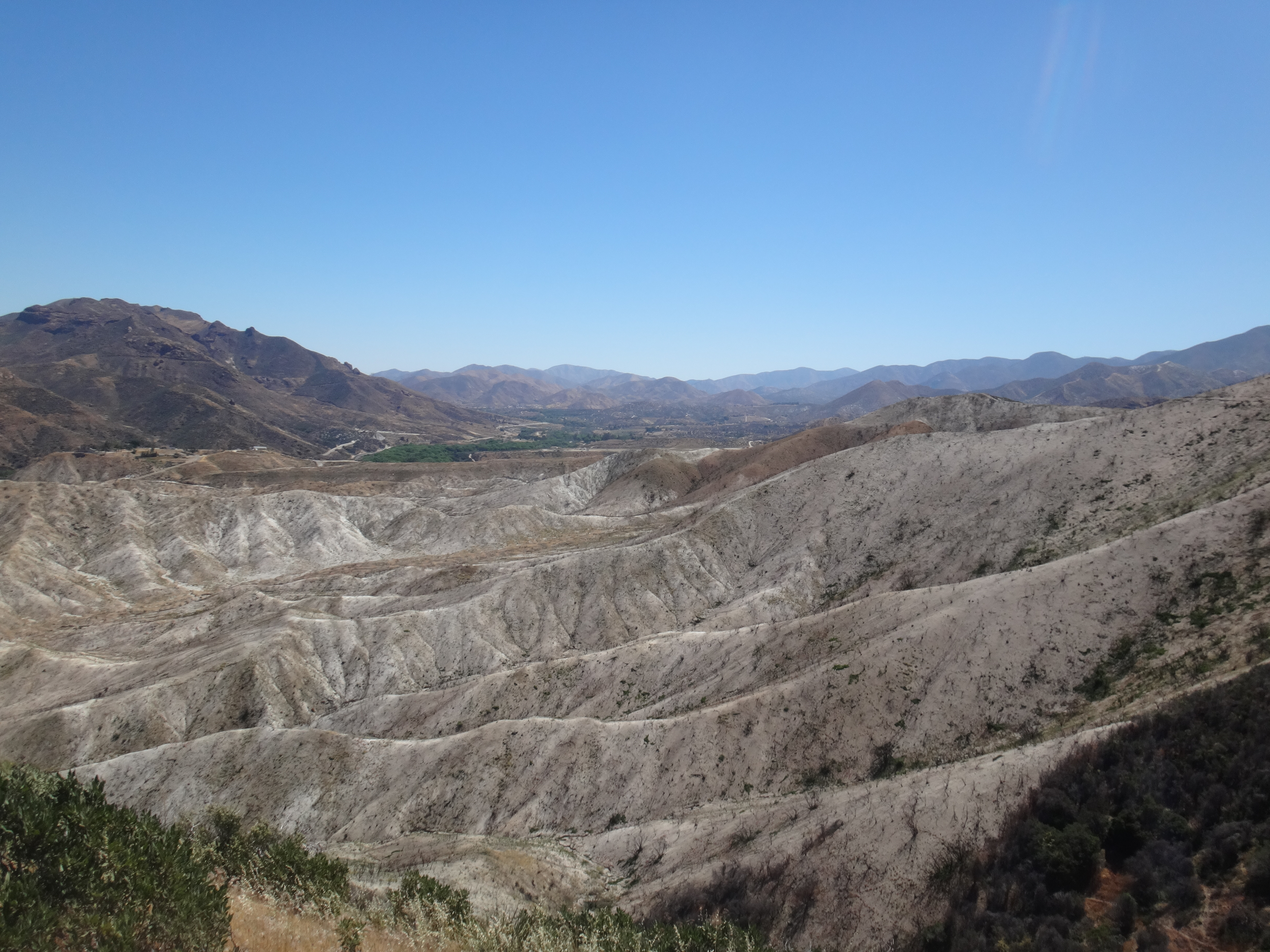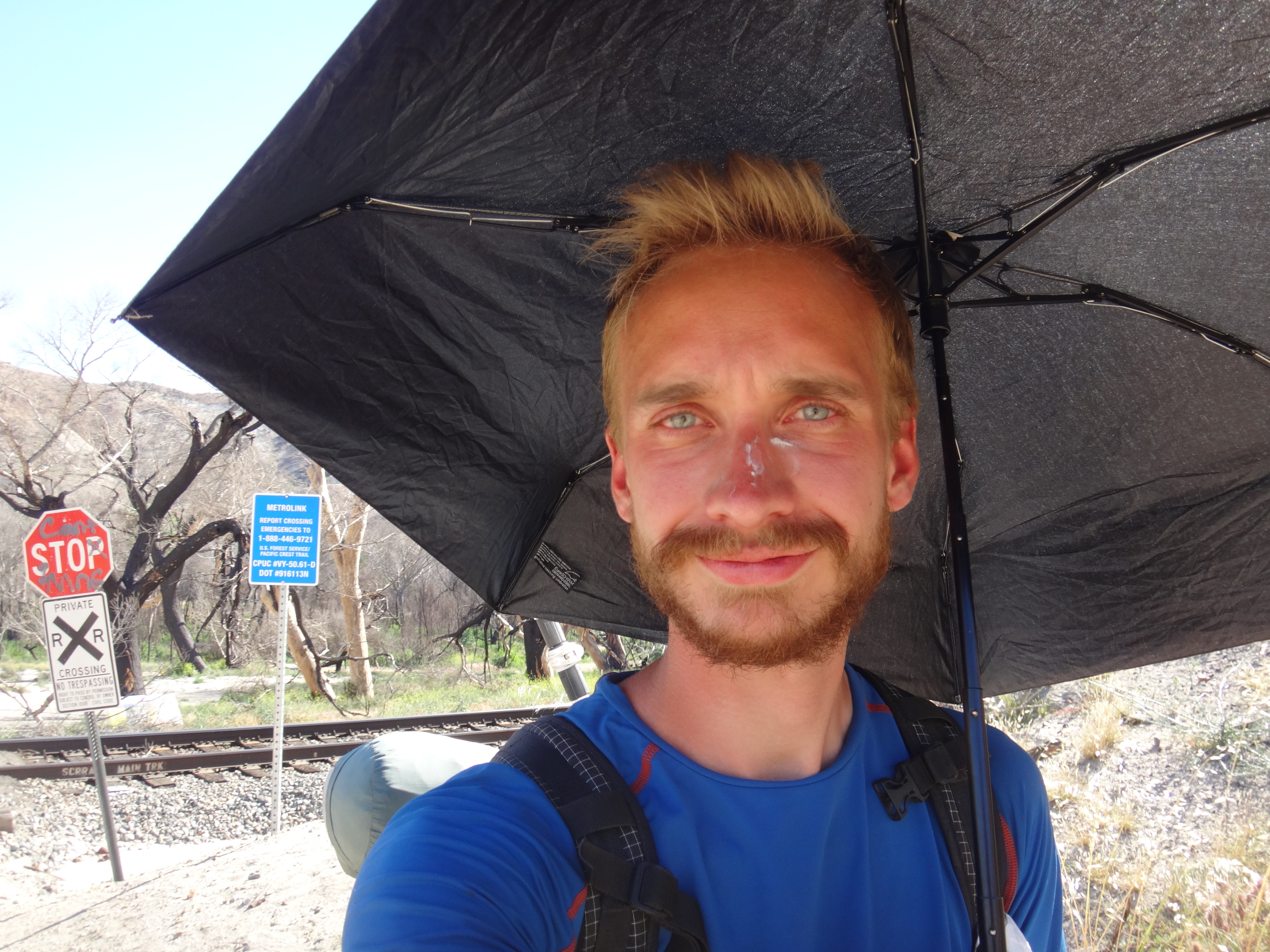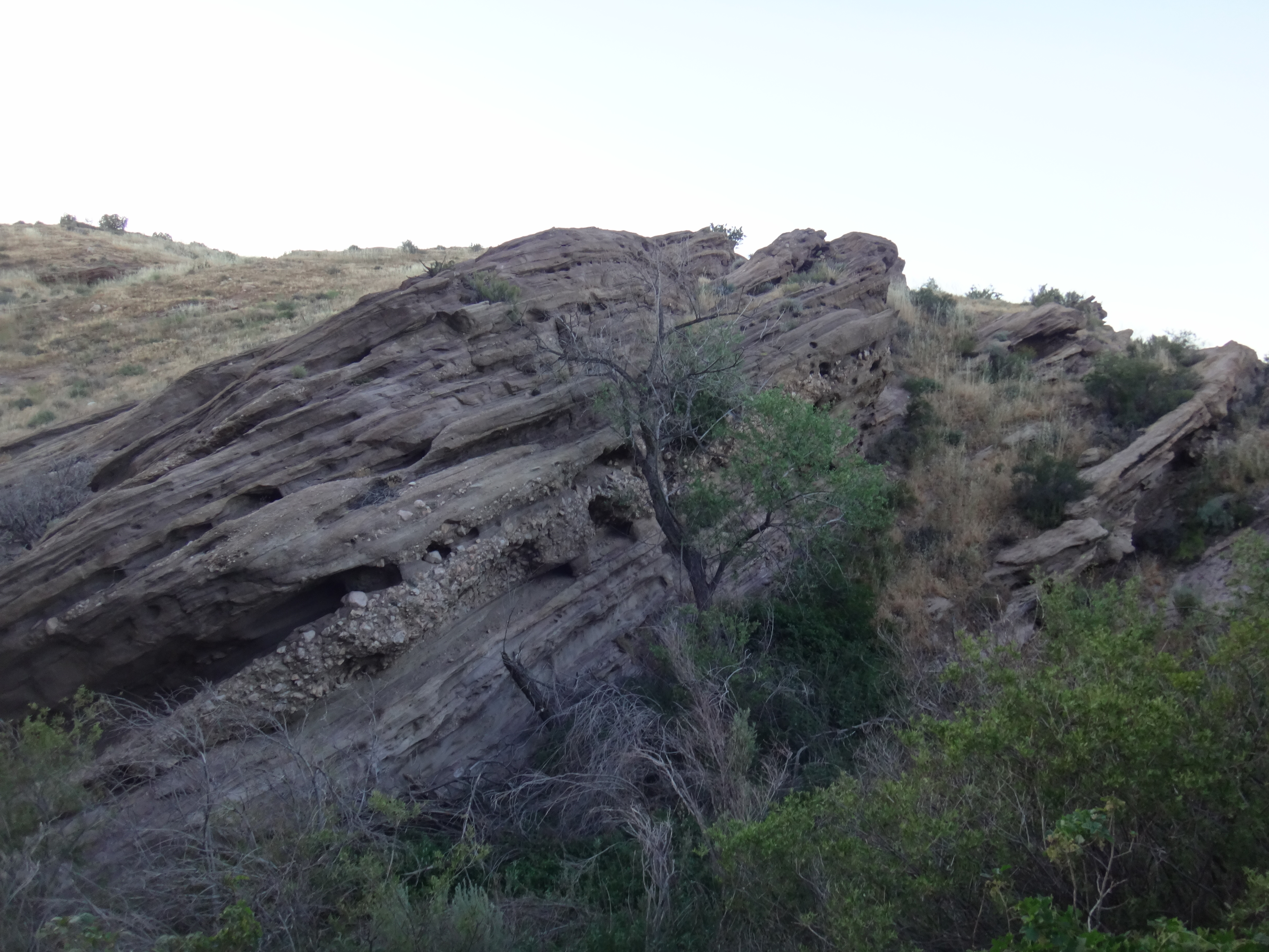 Gegen 16:30 laufen wir weiter. Unter meinem Sonnenschirm ist es einigermaßen erträglich und wir laufen den grasigen Hügel hinauf. Links und rechts hohes Gras. Wir treffen auf eine weitere Klapperschlange. Rattler und CheapSunglasses sind noch ziemlich fit und wollen bis zum HikerHeaven in Agua Dulce laufen. Also suchen wir keinen Spot und laufen weiter. Wir erreichen nach einem Abstieg der durch hohes Gras geht das in der Sonne hin und her weht den HW14 und unterqueren ihn in einem Kanal. Ziemlich dunkel und lang. Wir sehen teilweise nichts mehr. Auf der deren Seite kommen wir in ein Tal mit vielen Felsen. Geologisch höchst interessant da viele verschiedene Schichten zu sehen sind. Vasquez Rocks wird dieser Teil genannt. Durch den gleichnamigen County Park gelangen wir nach Agua Dulce. Als wir die Stadtstraßen erreichen hält eine Helferin aus dem HikerHeaven an und nimmt uns mit. Wir bekommen eine Dusche, Wäscheservice, Wechselklamotten, Sodas, Küche ubd Wohnzimmer, den Garten zum zelten und vieles mehr. Ein Traum. Es sind vielleicht 15 Leute hier. Es ist generell sehr wenig los. Wir sehen fast keinen auf dem Trail. Nach einer dusche und Wraps mit dem restlichen Käse und Wurst gehts nach 22 Uhr ins Bett. Wir schlafen heute im Himmel. Brian übrigens auch.