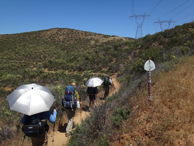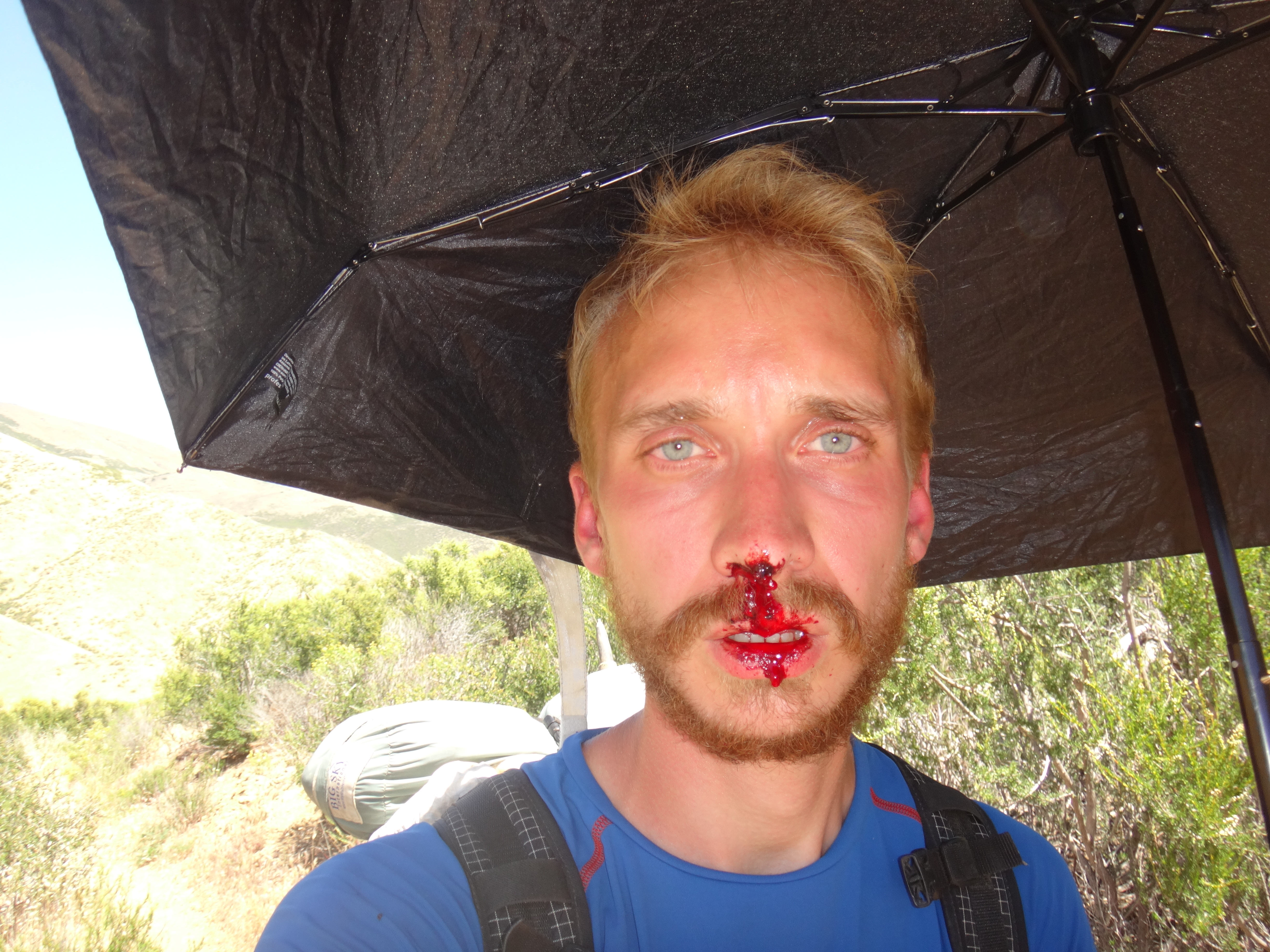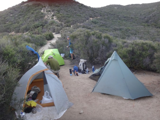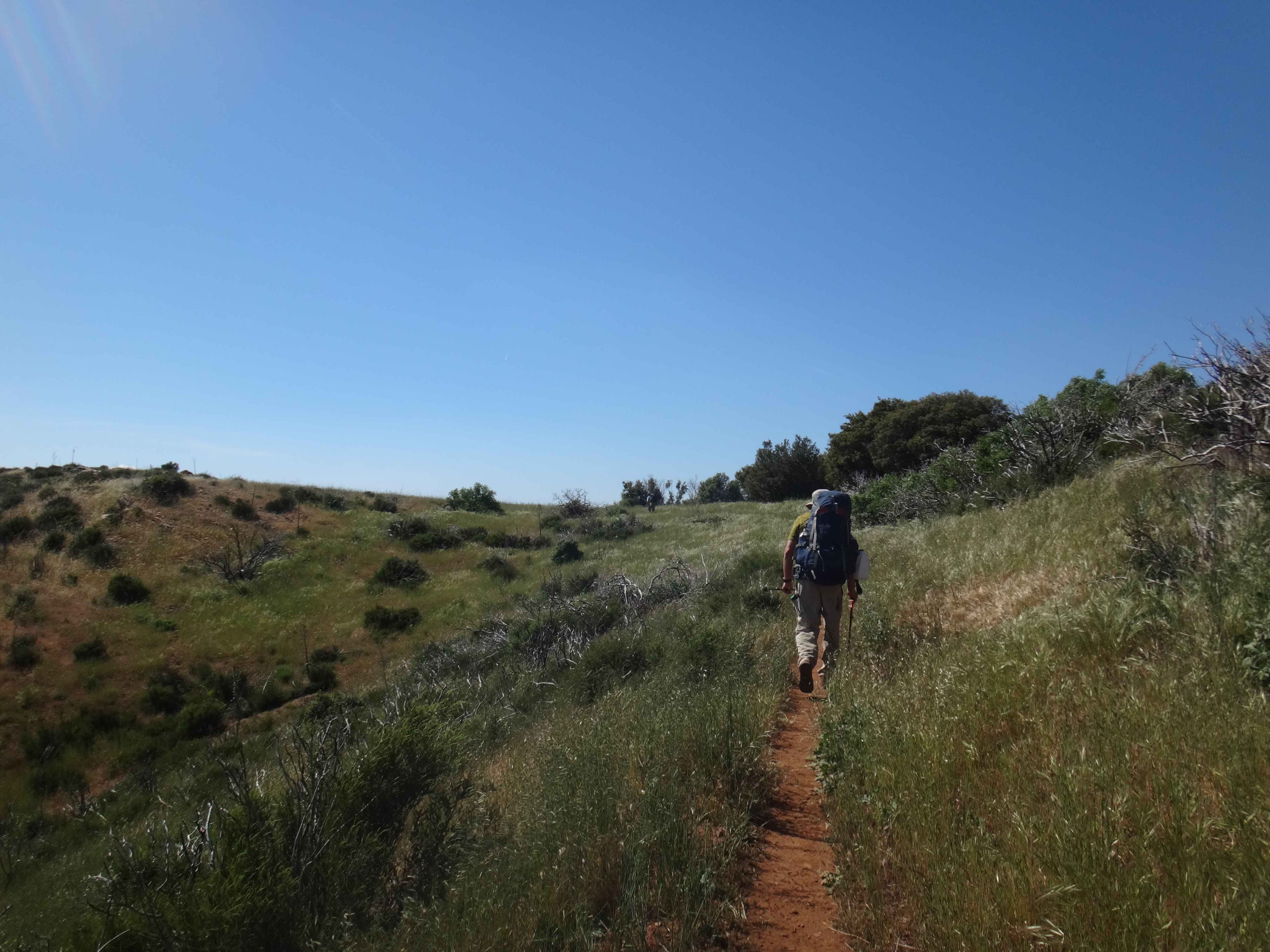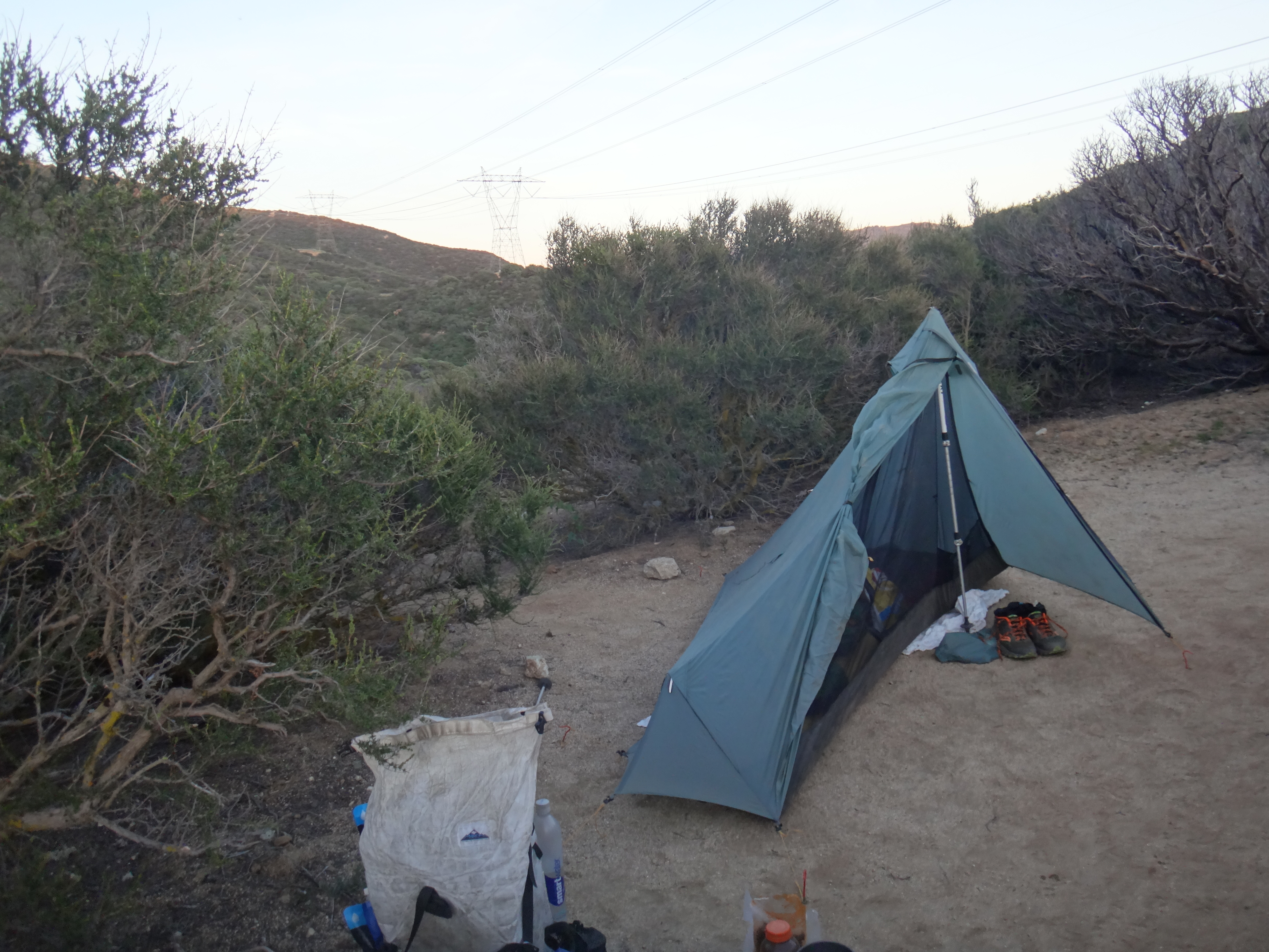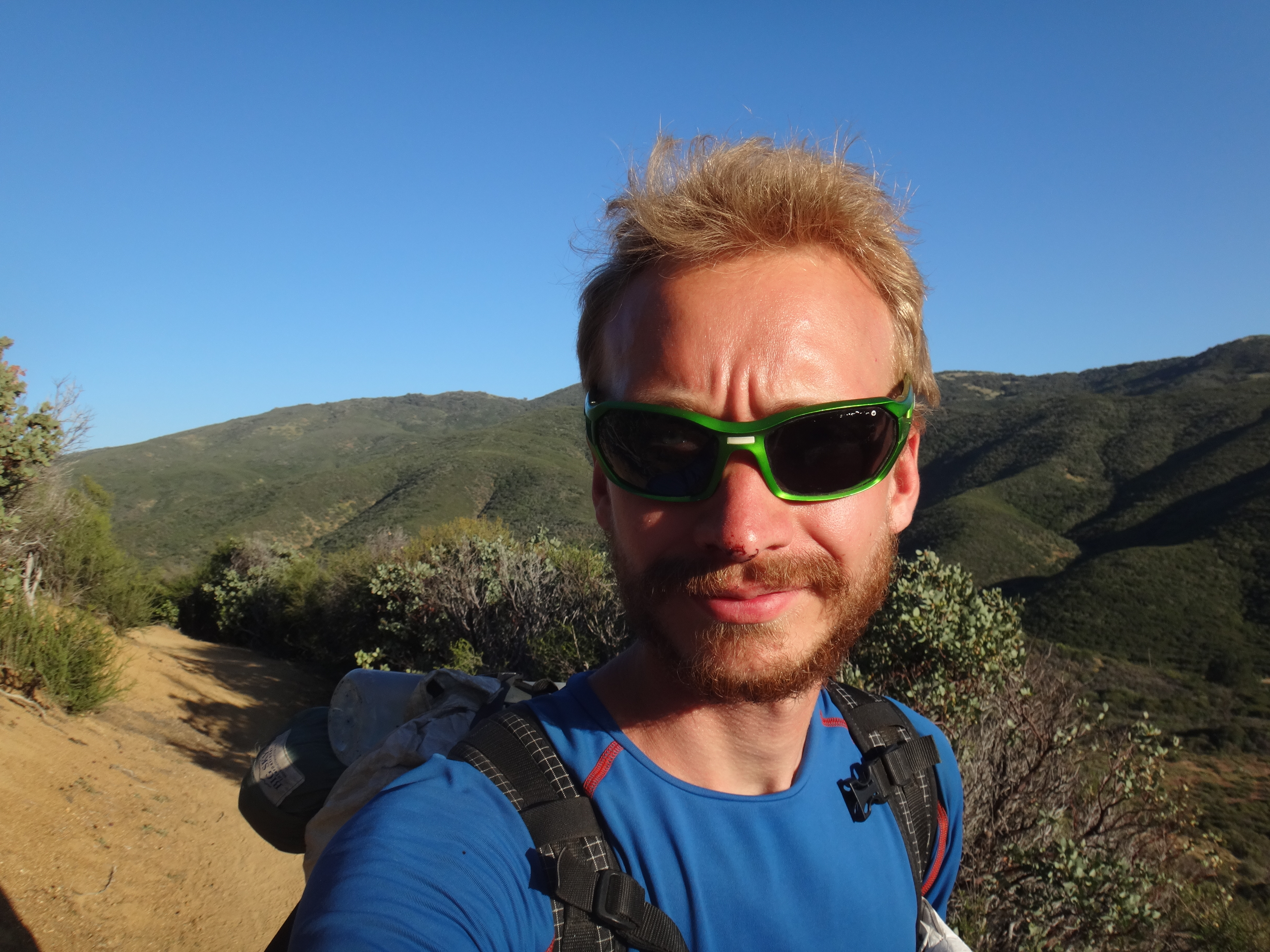 Nachdem hier alles erledigt war sind wir in die Stadt gewandert. Das war schon schweißtreiben. Aber in einem Restaurant konnten wir bei Burger und Sandwiches nochmal abkühlen. Dann ging es gegen 12 Uhr über die Hauptstraße bis zum Fuße des nächsten Berges. Large Pizza holte uns mit einem Kollegen ein. Sie slagpacken heute. Haben also nur Wasser und ein paar Snacks dabei und werden an einem bestimmten Punkt per Auto aufgegabelt. Wir hielten eine Weile mit doch als der Anstieg langsam begann mussten wir eine Pause einlegen. Wir sind nur leicht das Tal hinauf. Nichts wirklich steiles aber es ist so unbeschreiblich heiß. Ich stehe komplett unter Wasser. Normalerweise ist das nicht so. Das wir in der Mittagszeit unterwegs sind macht es nicht besser. Ich bekomme Nasenbluten. Nach ein paar Minuten im Schatten geht es weiter. Meine Nase fängt gleich wieder an aber ich laufe weiter und tropfe halt auf den Trail. Mir brennt der Schweiß in den Augen. Alles klebt. Die Sonne ist brutal. Kein Wind der Abhilfe verschafft. Wir quälen uns langsam den Berg hinauf. Keine Bäume die Schatten geben. Ich bin fertig. Das war das letzte mal das wir bei so einer Hitze wandern. Was für ein Schwachsinn. Jetzt müssen wir aber die 600m hinauf. Denn auf der anderen Seite gibt es hoffentlich eine Quelle die läuft. Unser Wasser ist eh piss warm. Die Schokoriegel kann man aus der Packung lutschen. Ich erreiche Rattler und CheapSunglasses unter einem Strauch zusammen gekauert. Versuchend wenigstens ein paar Punkte schatten abzubekommen. Mein Gesicht ist blutüberströmt. Mein Bart ist klebrig und das trockene Blut in der Nase schmerzt. Ich kann nur durch den Mund atmen da meine Nase zu ist. Der Mund wird trocken. Mein Thermometer zeigt 44 Grad. Alter Schwede. Was für eine Tortur. Als ich mich ein wenig säubern will fange ich wieder an zu bluten. Ich gebs auf. Wir schleichen den Rest hinauf. Der Wind nimmt gnädigerweise ein wenig zu. Auf dem Gipfel machen wir unter ein paar Bäumen Pause und trinken Wasser auf Körpertemperatur.. eckelhaft. Es sind noch über 35 Grad im Schatten. Der Abstieg liegt zum Glück unter ein paar Bäumen und ist nicht ganz so schlimm. Nach ein paar Kilometern erreichen wir die Quelle die zum Glück noch fließt. Wir trinken schönes kühles Wasser und machen eine ausgiebige Pause. Ich esse BeefJerky welches ich von Rattler habe. Wir treffen auch noch einen FlipFloper. Er springt von Trailabschnitt zu Trailabschnitt und wandert mal hier mal da. Der Weg ins Tal bringt die Füße an die Grenzen. Mit dem Resupply den wir nach dem Restaurant Besuch gekauft haben wiegen die 5 Liter schwer. Wie sind sowieso total matsche und zerstört. Der Aufstieg hat einfach alle Kraft geraubt und war so ernüchternd unspaßig. Wir sehen beim Abstieg schon den Trail auf der anderen Seite und einen schönen See. Wir laufen wieder etwas besser auf der anderen Seite langsam den Berg hinauf. Links und recht mannshohes Buschwerk. Der Trail ist breit und sandig. Wir laufen hier wirklich gut. Zum Schluss wird es nochmal steil und ich tippel hinter CheapSunglasses her. Er ist wie Rattler 50+ und läuft wie ein verrückter den ganzen Tag. Guter Mann. Der Campsite ist zum Glück leer als wir ankommen. Mit toller Aussicht auf den See erledigen wir unsere Routinen. Auch die Spaghetti habe ich von Rattler. Er hat vorm Trip viel Essen selbst dehydriert. Mit zwei Portionen Hackfleisch schmeckt es doppelt so gut. Ich schreibe keinen Block sondern gönne mir nach dem essen gegen 20:30 nur noch einen Film und Chips. Was für ein Tag. Viel zu spät los und dann trotzdem weiter gelaufen…. Wir haben eine Hitzewelle. Morgen stehen wir um 4.50 auf und laufen früher los.