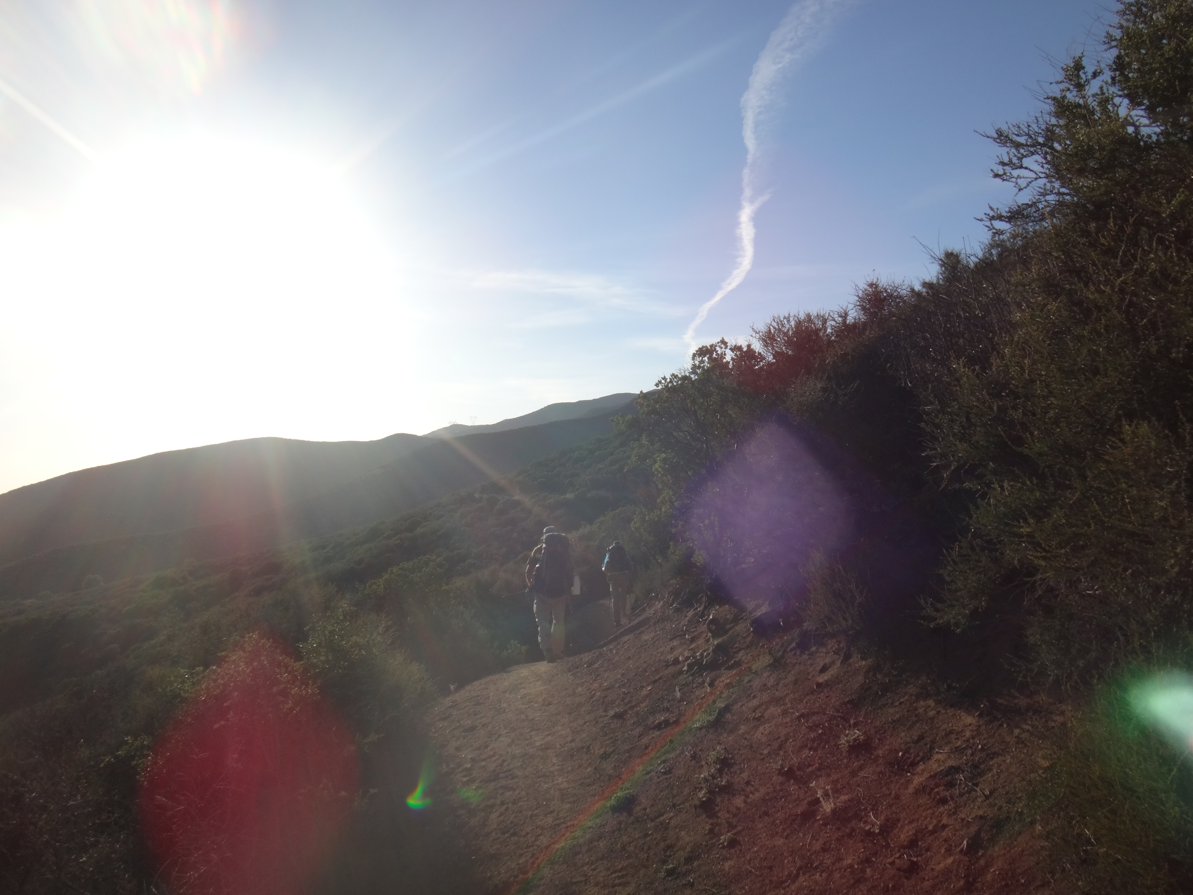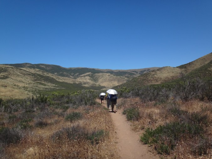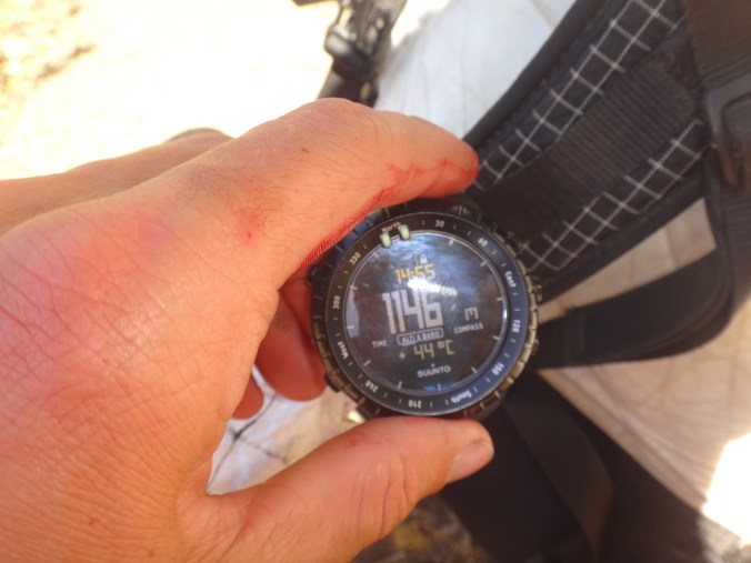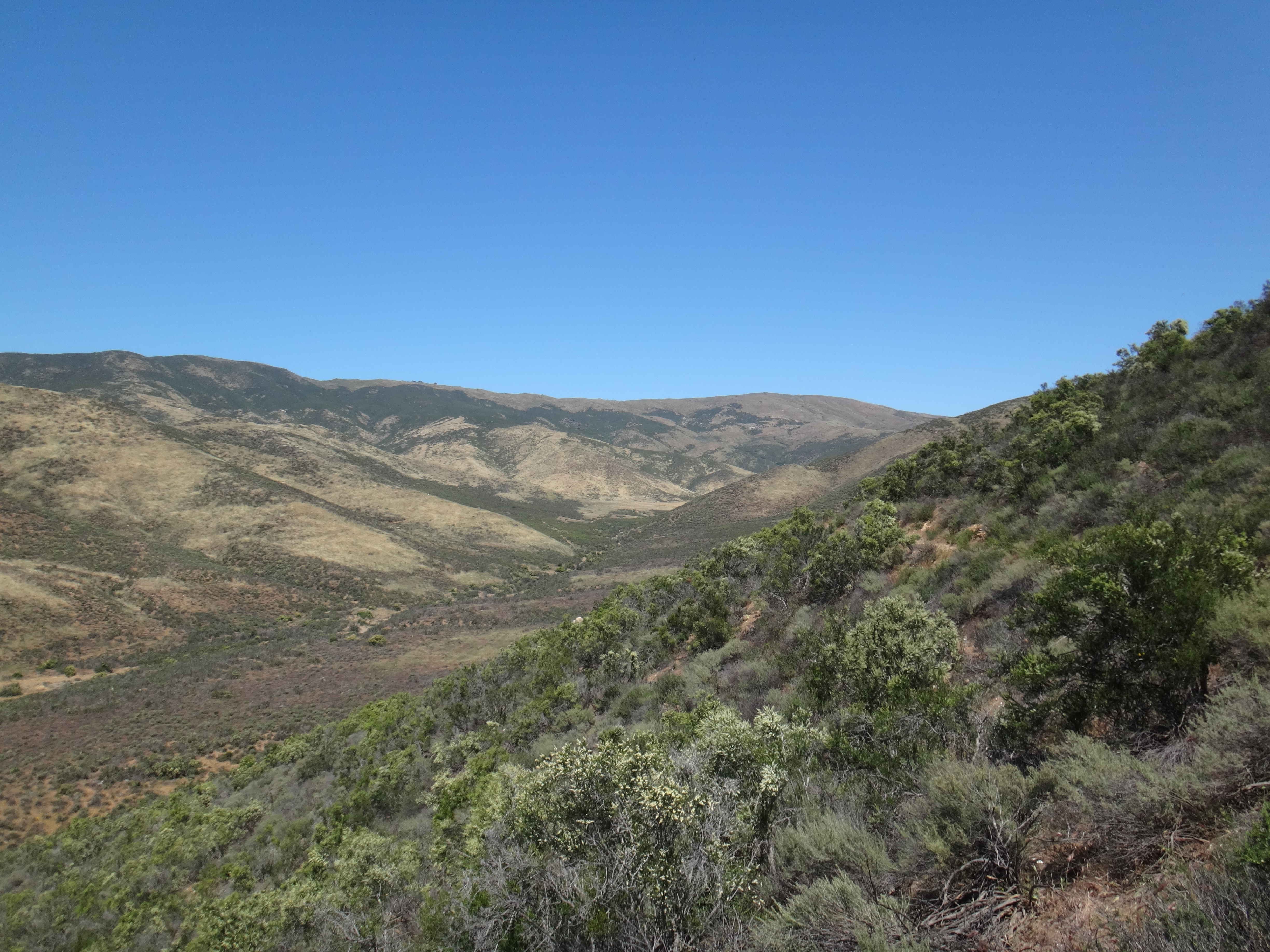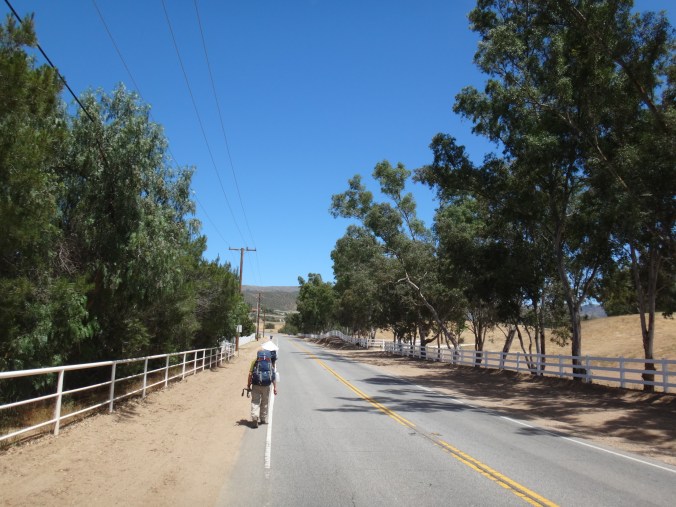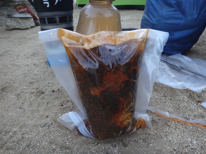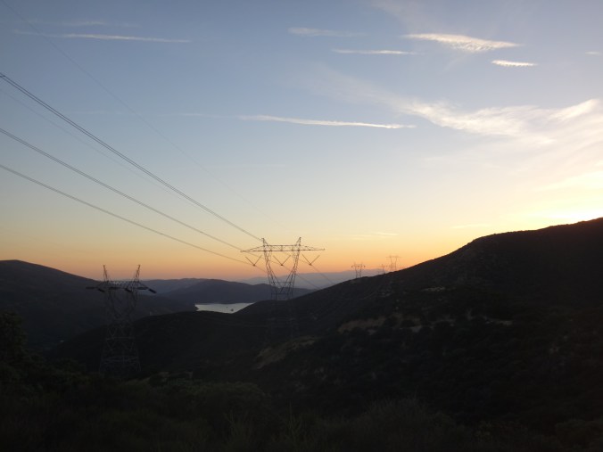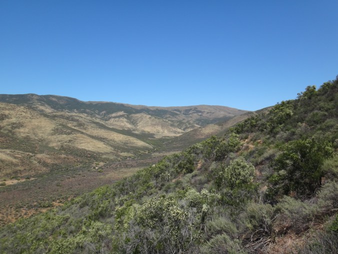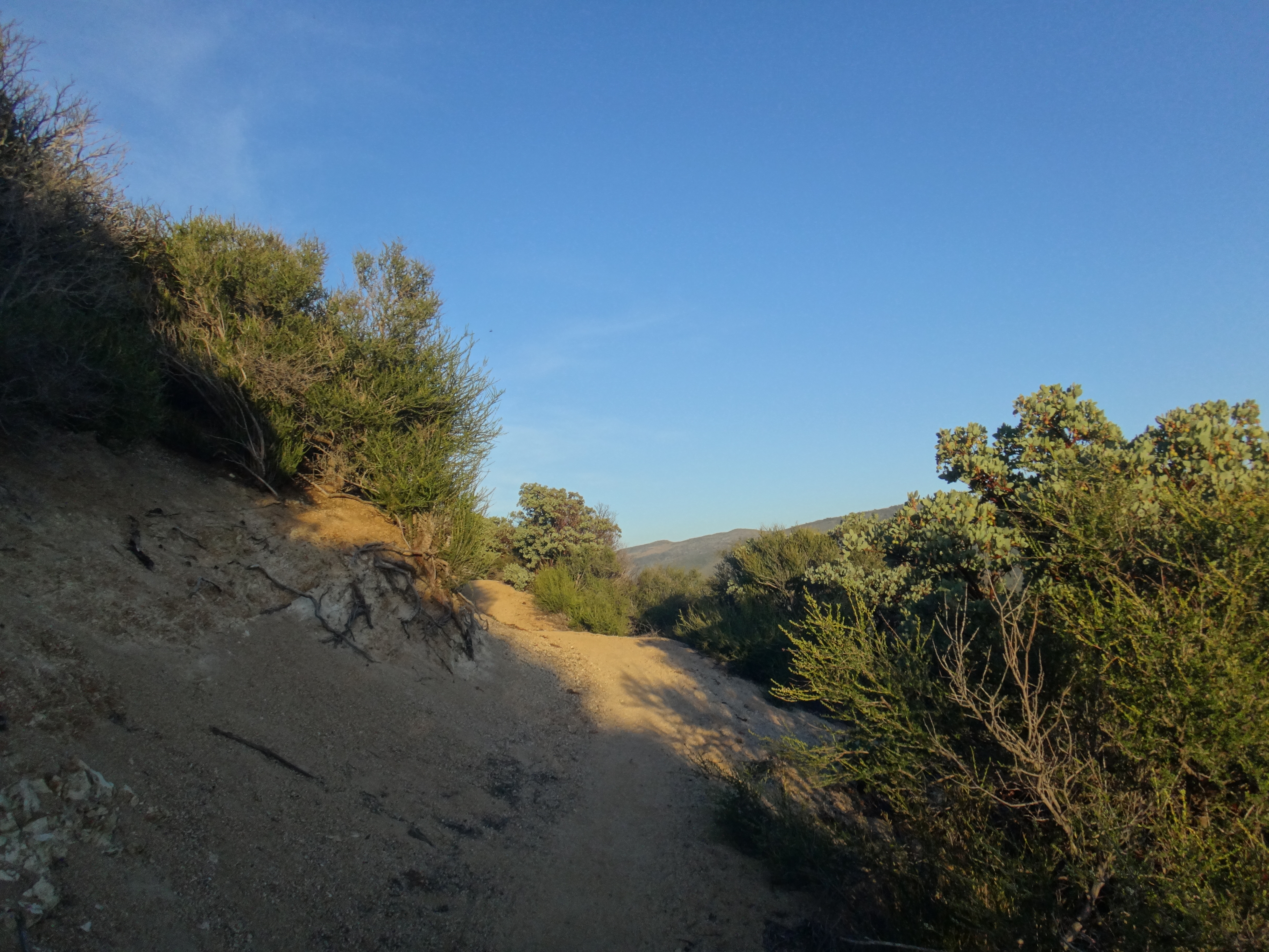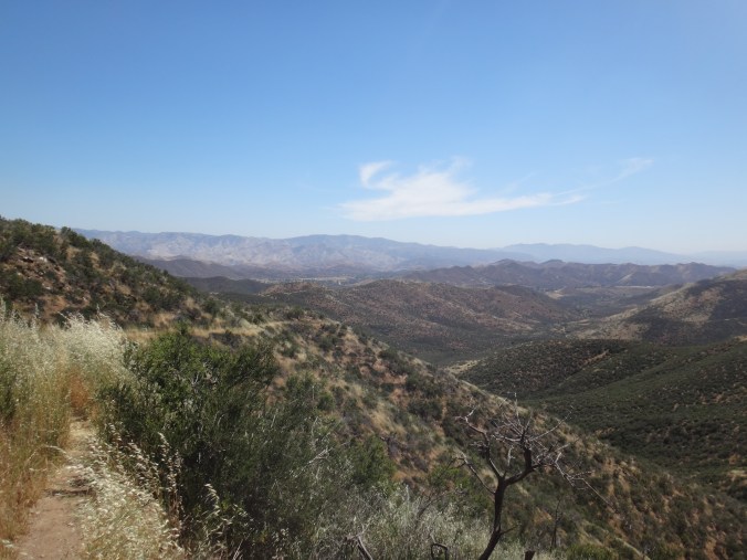 Nachdem hier alles erledigt war sind wir in die Stadt gewandert. Das war schon schweißtreiben. Aber in einem Restaurant konnten wir bei Burger und Sandwiches nochmal abkühlen. Dann ging es gegen 12 Uhr über die Hauptstraße bis zum Fuße des nächsten Berges. Large Pizza holte uns mit einem Kollegen ein. Sie slagpacken heute. Haben also nur Wasser und ein paar Snacks dabei und werden an einem bestimmten Punkt per Auto aufgegabelt. Wir hielten eine Weile mit doch als der Anstieg langsam begann mussten wir eine Pause einlegen. Wir sind nur leicht das Tal hinauf. Nichts wirklich steiles aber es ist so unbeschreiblich heiß. Ich stehe komplett unter Wasser. Normalerweise ist das nicht so. Das wir in der Mittagszeit unterwegs sind macht es nicht besser. Ich bekomme Nasenbluten. Nach ein paar Minuten im Schatten geht es weiter. Meine Nase fängt gleich wieder an aber ich laufe weiter und tropfe halt auf den Trail. Mir brennt der Schweiß in den Augen. Alles klebt. Die Sonne ist brutal. Kein Wind der Abhilfe verschafft. Wir quälen uns langsam den Berg hinauf. Keine Bäume die Schatten geben. Ich bin fertig. Das war das letzte mal das wir bei so einer Hitze wandern. Was für ein Schwachsinn. Jetzt müssen wir aber die 600m hinauf. Denn auf der anderen Seite gibt es hoffentlich eine Quelle die läuft. Unser Wasser ist eh piss warm. Die Schokoriegel kann man aus der Packung lutschen. Ich erreiche Rattler und CheapSunglasses unter einem Strauch zusammen gekauert. Versuchend wenigstens ein paar Punkte schatten abzubekommen. Mein Gesicht ist blutüberströmt. Mein Bart ist klebrig und das trockene Blut in der Nase schmerzt. Ich kann nur durch den Mund atmen da meine Nase zu ist. Der Mund wird trocken. Mein Thermometer zeigt 44 Grad. Alter Schwede. Was für eine Tortur. Als ich mich ein wenig säubern will fange ich wieder an zu bluten. Ich gebs auf. Wir schleichen den Rest hinauf. Der Wind nimmt gnädigerweise ein wenig zu. Auf dem Gipfel machen wir unter ein paar Bäumen Pause und trinken Wasser auf Körpertemperatur.. eckelhaft. Es sind noch über 35 Grad im Schatten. Der Abstieg liegt zum Glück unter ein paar Bäumen und ist nicht ganz so schlimm. Nach ein paar Kilometern erreichen wir die Quelle die zum Glück noch fließt. Wir trinken schönes kühles Wasser und machen eine ausgiebige Pause. Ich esse BeefJerky welches ich von Rattler habe. Wir treffen auch noch einen FlipFloper. Er springt von Trailabschnitt zu Trailabschnitt und wandert mal hier mal da. Der Weg ins Tal bringt die Füße an die Grenzen. Mit dem Resupply den wir nach dem Restaurant Besuch gekauft haben wiegen die 5 Liter schwer. Wie sind sowieso total matsche und zerstört. Der Aufstieg hat einfach alle Kraft geraubt und war so ernüchternd unspaßig. Wir sehen beim Abstieg schon den Trail auf der anderen Seite und einen schönen See. Wir laufen wieder etwas besser auf der anderen Seite langsam den Berg hinauf. Links und recht mannshohes Buschwerk. Der Trail ist breit und sandig. Wir laufen hier wirklich gut. Zum Schluss wird es nochmal steil und ich tippel hinter CheapSunglasses her. Er ist wie Rattler 50+ und läuft wie ein verrückter den ganzen Tag. Guter Mann. Der Campsite ist zum Glück leer als wir ankommen. Mit toller Aussicht auf den See erledigen wir unsere Routinen. Auch die Spaghetti habe ich von Rattler. Er hat vorm Trip viel Essen selbst dehydriert. Mit zwei Portionen Hackfleisch schmeckt es doppelt so gut. Ich schreibe keinen Block sondern gönne mir nach dem essen gegen 20:30 nur noch einen Film und Chips. Was für ein Tag. Viel zu spät los und dann trotzdem weiter gelaufen…. Wir haben eine Hitzewelle. Morgen stehen wir um 4.50 auf und laufen früher los.