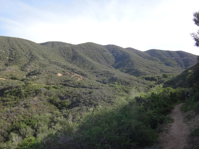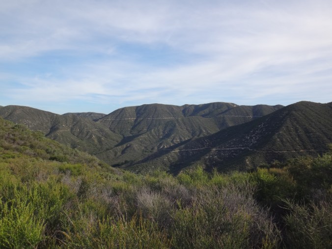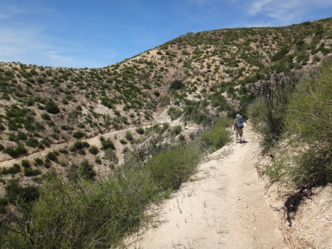 Es war schön hell als ich um 4.50 aus dem Zelt bin. Sterne und Mond am himmel. Gegen 5.30 konnten wir los. Die Sonne ging langsam auf. Die Stromleitung über und knackten. Der letzte kleine Anstieg von gestern verging schnell und es ging bergab. Die Landschaft bliebt gleich. In scharfen Switchbacks lagen ausgetrocknete Flussbette. Hier war auch mal mehr grün und Bäume drin. Ansonsten war der Trail sehr eintönig und ernüchternd wenn man sieht wo man noch alles lang muss. Ich war sowieso müde und ein wenig lustlos. Mein MP3 Player wann natürlich auch leer. Auf einer Gedächtnis Bank machten wir Pause. 50 Meilen Lauf. Dabei ist wohl einer 2011 gestorben. Skott Jerek stand auch auf der Liste. Ich glaube das war der Typ der 2015 auf dem AT den Rekord aufgestellt hat. Wir liefen weiter nun immer ein wenig bergauf. Die Sonne hatte auch schon gegen 8 Uhr ordentlich Power. Nachdem wir den Gipfel erreichten konnten wir schnell nach Green Vally absteigen. Bei der örtlichen Rainger Station haben wir unsere Wasservorräte aufgefüllt und unter einem Pavillon pause eingelegt. Es ging mit einem knackigen Aufstieg weiter. Die Sonne war nun schon wieder super stark. Ich bin aber einfach vornweg hoch geprügelt. Hat bis oben gut geklappt, dann hatte ich erneut Nasenbluten. Wir legten eine weitere Pause ein. 2km, 300 Höhenmeter hinter uns bahnte sich eine Katastrophe wie gestern an. Unerträgliche Hitze und wir wollen Kilomter kloppen um morgen bis zur Hikertown zu kommen um in der Nacht durch die Mojave zu wandern. Das Wetter ist gegen uns. Da es nun bergab geht laufen wir weiter. Zuerst liegt alles im schönen Schatten bis wir die bergseite wechseln und in exponierter Lage am Berg entlang taumeln. Nach schier endlosen Minuten gelangen wir wieder auf die Schatten Seite und finden unter ein paar Bäumen ein Platz für eine ausgiebige Mittagspause. Während wir auf dem Trail liegen überholt uns ein Reiter. Wir machen uns gegen 13.30 wieder auf. Es geht zum Glück nur bergab. Doch wir kommen bald aus dem Schatten der Bäume. Wieder im sandigen Gelände laufen wir gegen die Hitze an. Temperaturen über 40 Grad zwingen uns langsam in die Knie. Wir müssen jede Einbuchtung in den Berg mitnehmen und laufen so viele extra Meilen anstatt geradeaus im Tal zu laufen. Wenn ich den Fachbegriff für diese kleinen Täler herausfinde verfluche ich diesen. Im Tal angekommen, es ist noch heißer, finden wir 2 Gallonen Wasser und teinken eine. Auf der Straße machen wir halt. Wir sind uns einige dass wir nicht weiter gehen können. Zu gefährlich bei der Hitze und dem nächsten Aufstieg. Ich ziehe den Joker und wie hitchen in ein nahes Kaff. Im Restaurant gibts Unmengen Cola, Burger und HotDog. Wir verbringen viel Zeit dort da wir nicht vor 5 weiter wandern. Nachdem wir ausgiebig relaxet sind und die beiden ihre Füße gelüftet haben gehen wir noch zum Laden gegenüber und holen uns 1,5 L Eiscreme. Geil. Das tat gut. Vollet Kalorien suchen wir uns eine Fahrt zurück. Ohne Probleme sitzten wir wie bei der Hinfahrt auf der Ladefläche eines Pickups. Wir bekommen noch ein paar warnende Worte vor neuen Schlangenarten und machen uns im Schatten an den Aufstieg. Super gemütlich und voller Energie laufen wir problemlos bis zur Quelle auf halber Höhe. Nachdem alles voll ist ziehen wir noch bis ca. 19:30 weiter. Den restlichen Anstieg und dann auf der Bergkette entlang. Wieder viele Sträucher und zeitweise auch ein paar Überreste von Bäumen. Wir Campen an einer Dirtroad. Ich esse nur noch eine Ramen und verschwinde schnell im Zelt. Zu viele Moskitos und Mücken und nervendes Insektenpack. Morgen stehen die restlichen 45.9km bis Hikertown an. Bin mal gespannt wie wir das packen. Abmarsch ist gegen 4.30 Uhr. Also bin ich froh dass ich noch beide Einträge fertigstellen konnte. 21.05