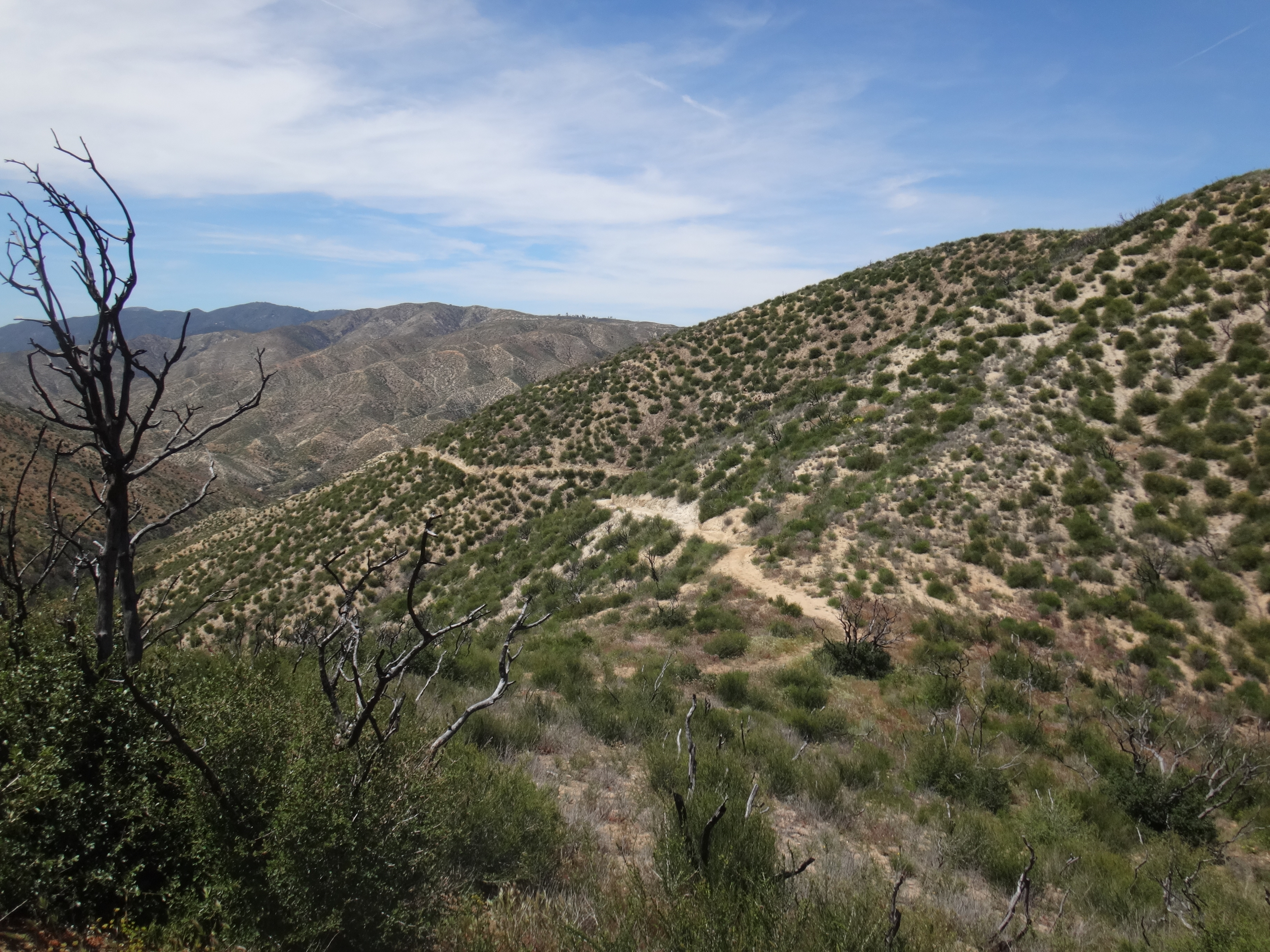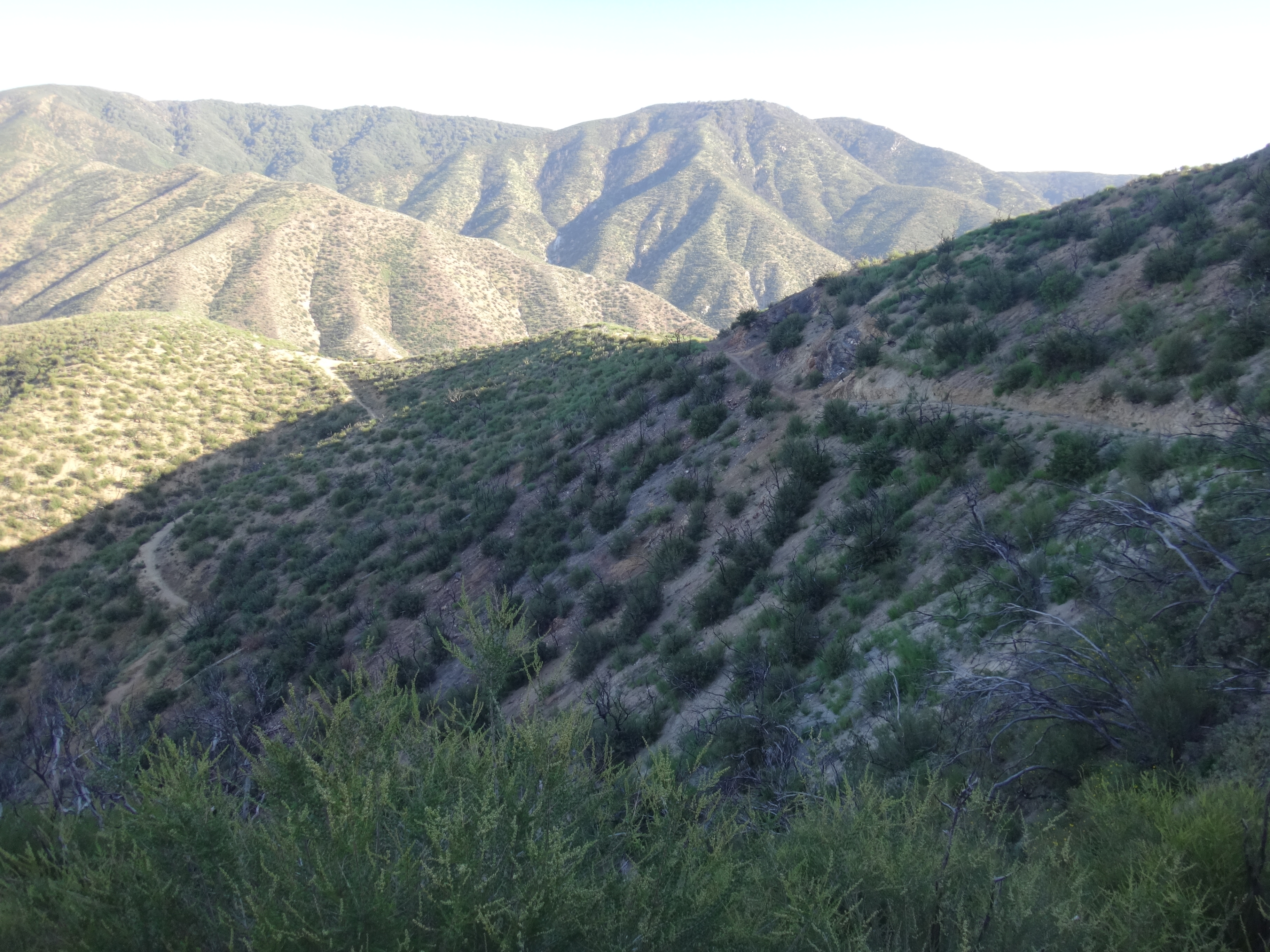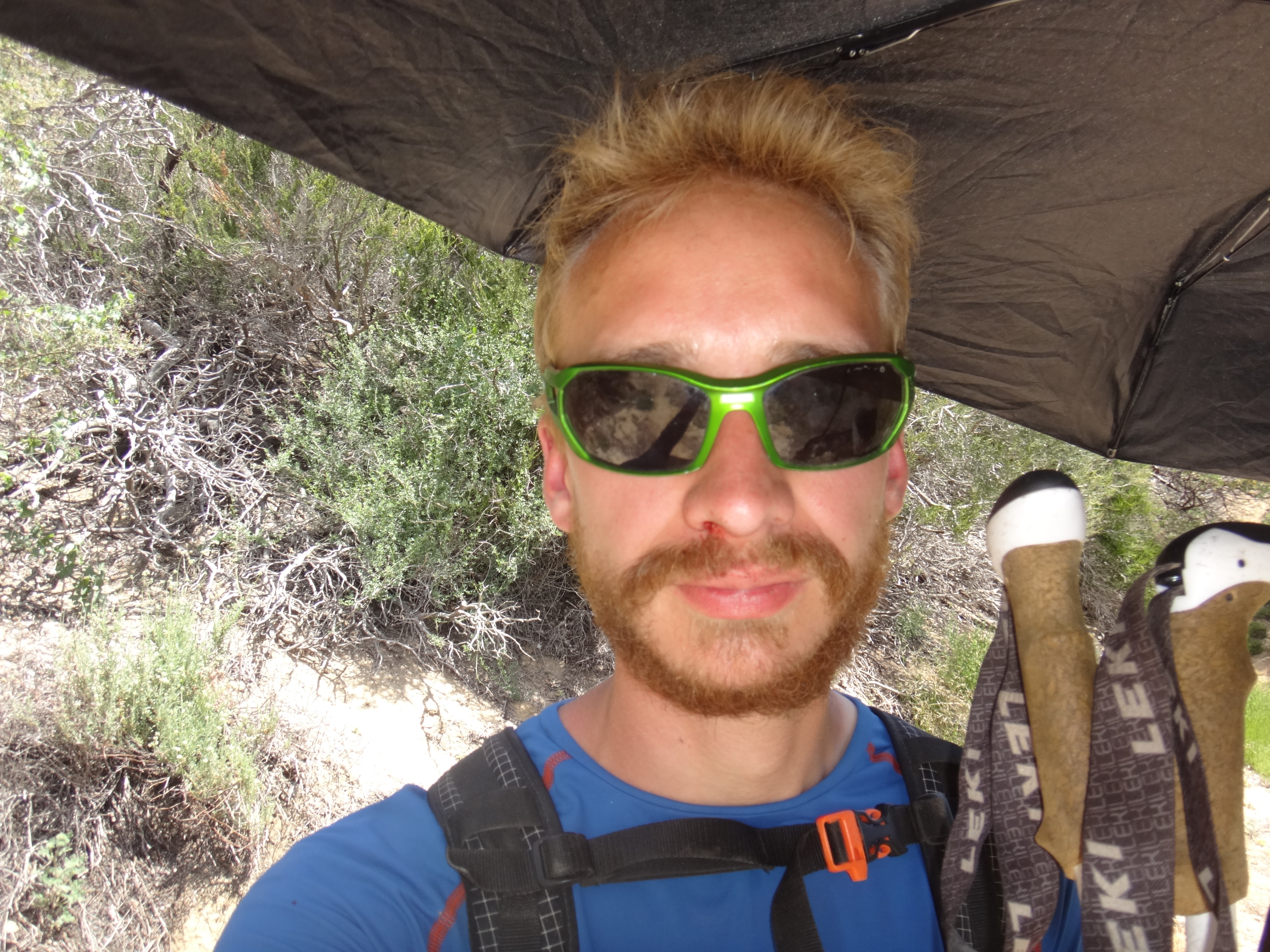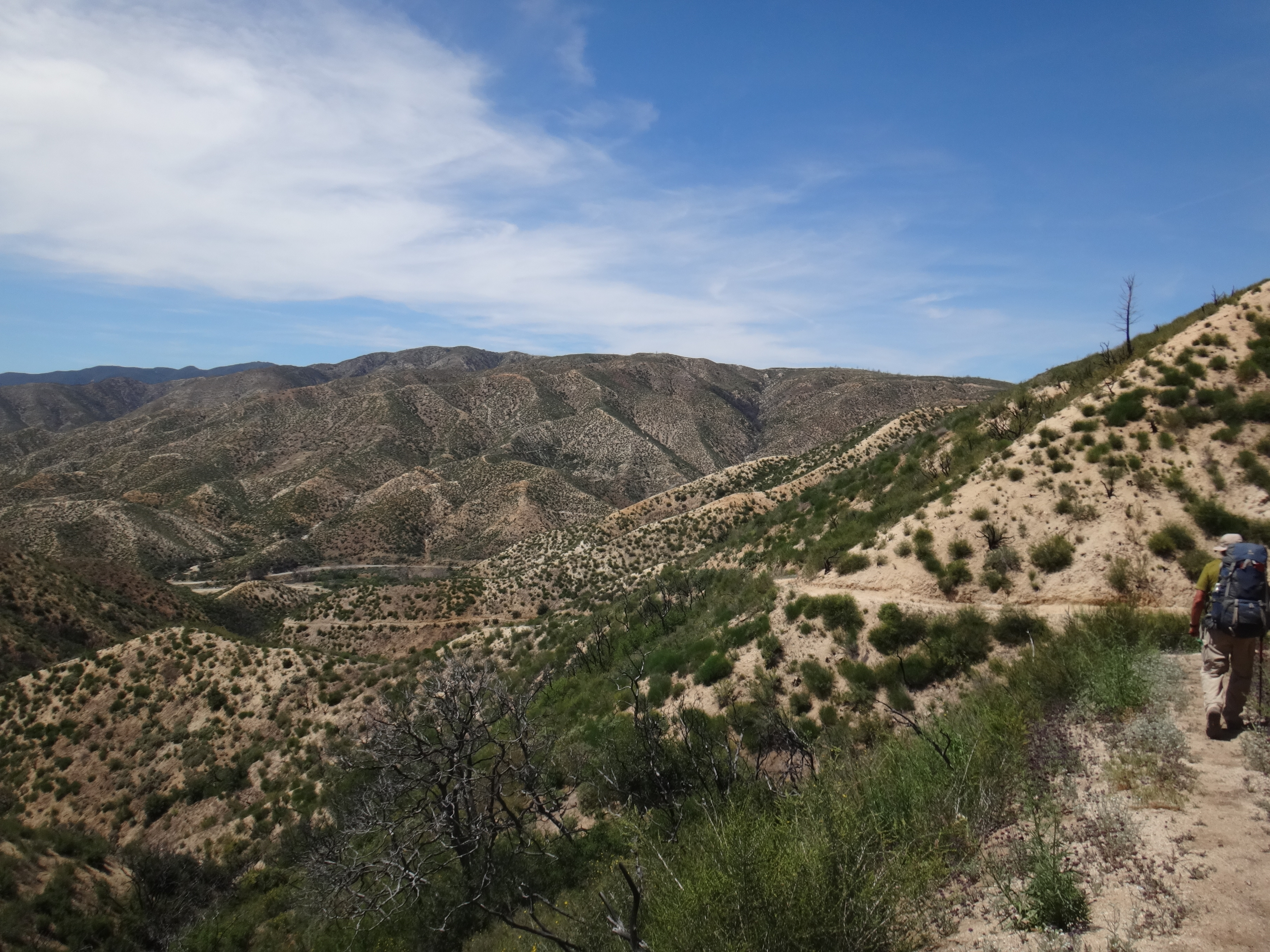 Es war schön hell als ich um 4.50 aus dem Zelt bin. Sterne und Mond am himmel. Gegen 5.30 konnten wir los. Die Sonne ging langsam auf. Die Stromleitung über und knackten. Der letzte kleine Anstieg von gestern verging schnell und es ging bergab. Die Landschaft bliebt gleich. In scharfen Switchbacks lagen ausgetrocknete Flussbette. Hier war auch mal mehr grün und Bäume drin. Ansonsten war der Trail sehr eintönig und ernüchternd wenn man sieht wo man noch alles lang muss. Ich war sowieso müde und ein wenig lustlos. Mein MP3 Player wann natürlich auch leer. Auf einer Gedächtnis Bank machten wir Pause. 50 Meilen Lauf. Dabei ist wohl einer 2011 gestorben. Skott Jerek stand auch auf der Liste. Ich glaube das war der Typ der 2015 auf dem AT den Rekord aufgestellt hat. Wir liefen weiter nun immer ein wenig bergauf. Die Sonne hatte auch schon gegen 8 Uhr ordentlich Power. Nachdem wir den Gipfel erreichten konnten wir schnell nach Green Vally absteigen. Bei der örtlichen Rainger Station haben wir unsere Wasservorräte aufgefüllt und unter einem Pavillon pause eingelegt. Es ging mit einem knackigen Aufstieg weiter. Die Sonne war nun schon wieder super stark. Ich bin aber einfach vornweg hoch geprügelt. Hat bis oben gut geklappt, dann hatte ich erneut Nasenbluten. Wir legten eine weitere Pause ein. 2km, 300 Höhenmeter hinter uns bahnte sich eine Katastrophe wie gestern an. Unerträgliche Hitze und wir wollen Kilomter kloppen um morgen bis zur Hikertown zu kommen um in der Nacht durch die Mojave zu wandern. Das Wetter ist gegen uns. Da es nun bergab geht laufen wir weiter. Zuerst liegt alles im schönen Schatten bis wir die bergseite wechseln und in exponierter Lage am Berg entlang taumeln. Nach schier endlosen Minuten gelangen wir wieder auf die Schatten Seite und finden unter ein paar Bäumen ein Platz für eine ausgiebige Mittagspause. Während wir auf dem Trail liegen überholt uns ein Reiter. Wir machen uns gegen 13.30 wieder auf. Es geht zum Glück nur bergab. Doch wir kommen bald aus dem Schatten der Bäume. Wieder im sandigen Gelände laufen wir gegen die Hitze an. Temperaturen über 40 Grad zwingen uns langsam in die Knie. Wir müssen jede Einbuchtung in den Berg mitnehmen und laufen so viele extra Meilen anstatt geradeaus im Tal zu laufen. Wenn ich den Fachbegriff für diese kleinen Täler herausfinde verfluche ich diesen. Im Tal angekommen, es ist noch heißer, finden wir 2 Gallonen Wasser und teinken eine. Auf der Straße machen wir halt. Wir sind uns einige dass wir nicht weiter gehen können. Zu gefährlich bei der Hitze und dem nächsten Aufstieg. Ich ziehe den Joker und wie hitchen in ein nahes Kaff. Im Restaurant gibts Unmengen Cola, Burger und HotDog. Wir verbringen viel Zeit dort da wir nicht vor 5 weiter wandern. Nachdem wir ausgiebig relaxet sind und die beiden ihre Füße gelüftet haben gehen wir noch zum Laden gegenüber und holen uns 1,5 L Eiscreme. Geil. Das tat gut. Vollet Kalorien suchen wir uns eine Fahrt zurück. Ohne Probleme sitzten wir wie bei der Hinfahrt auf der Ladefläche eines Pickups. Wir bekommen noch ein paar warnende Worte vor neuen Schlangenarten und machen uns im Schatten an den Aufstieg. Super gemütlich und voller Energie laufen wir problemlos bis zur Quelle auf halber Höhe. Nachdem alles voll ist ziehen wir noch bis ca. 19:30 weiter. Den restlichen Anstieg und dann auf der Bergkette entlang. Wieder viele Sträucher und zeitweise auch ein paar Überreste von Bäumen. Wir Campen an einer Dirtroad. Ich esse nur noch eine Ramen und verschwinde schnell im Zelt. Zu viele Moskitos und Mücken und nervendes Insektenpack. Morgen stehen die restlichen 45.9km bis Hikertown an. Bin mal gespannt wie wir das packen. Abmarsch ist gegen 4.30 Uhr. Also bin ich froh dass ich noch beide Einträge fertigstellen konnte. 21.05