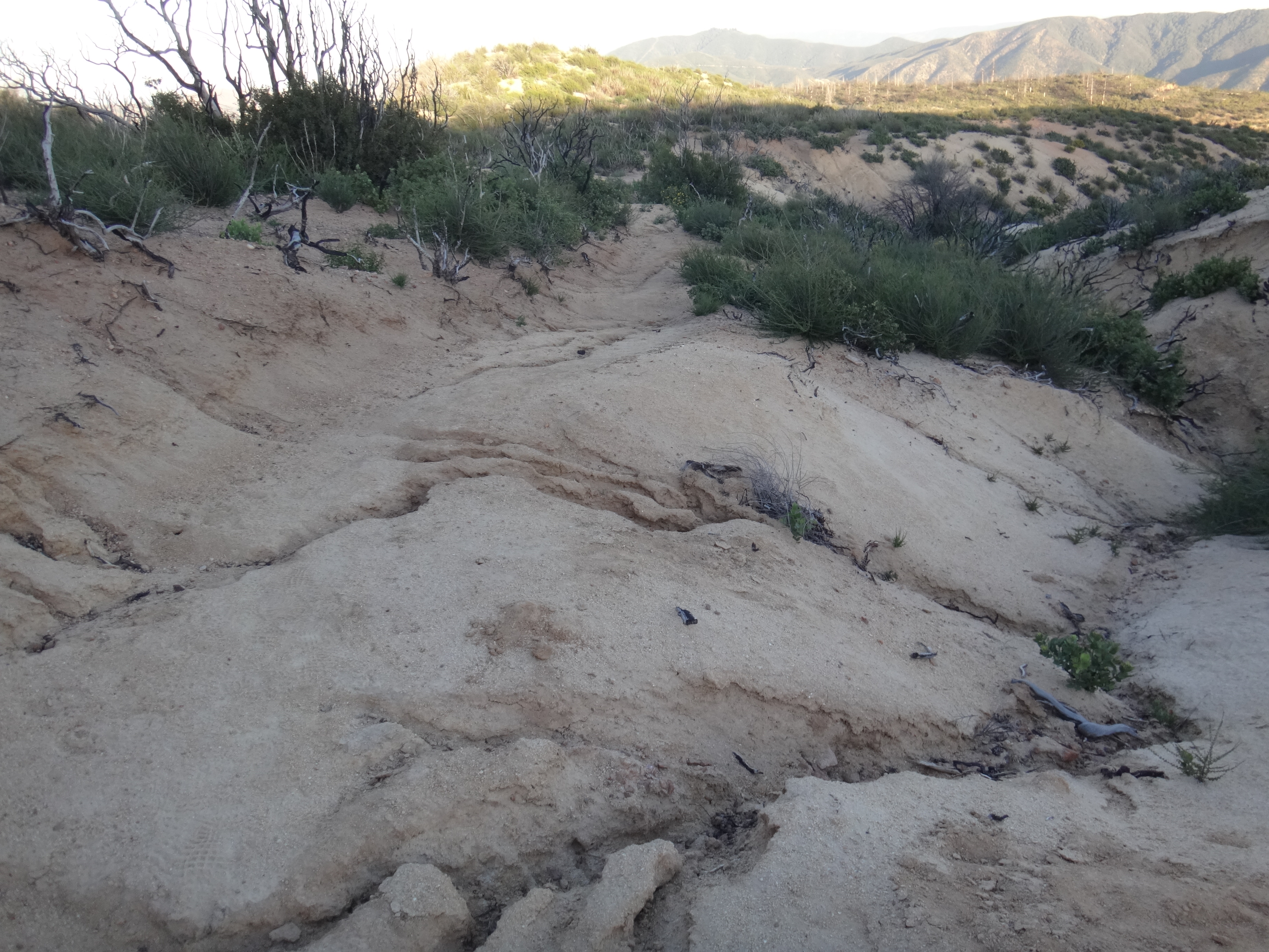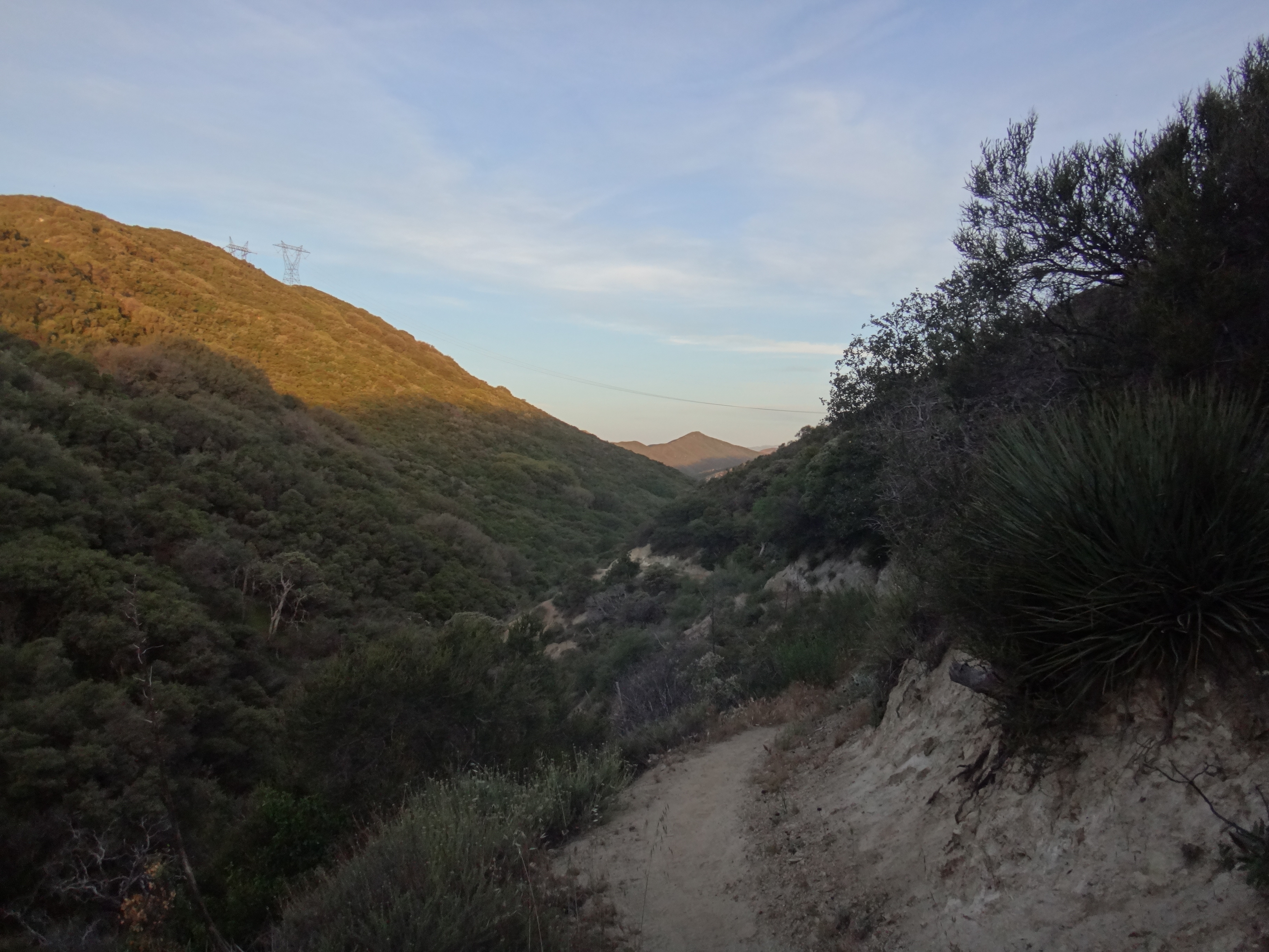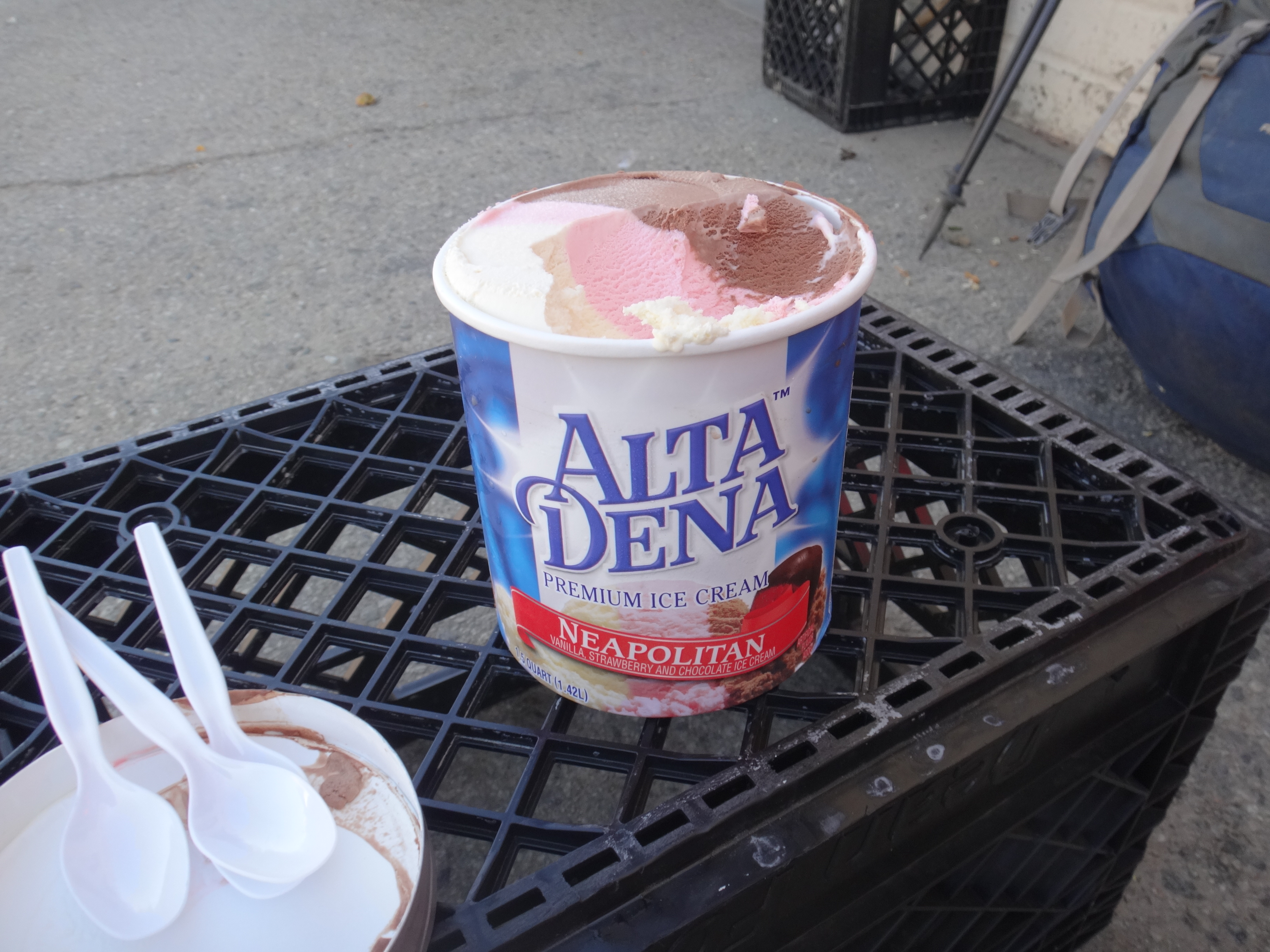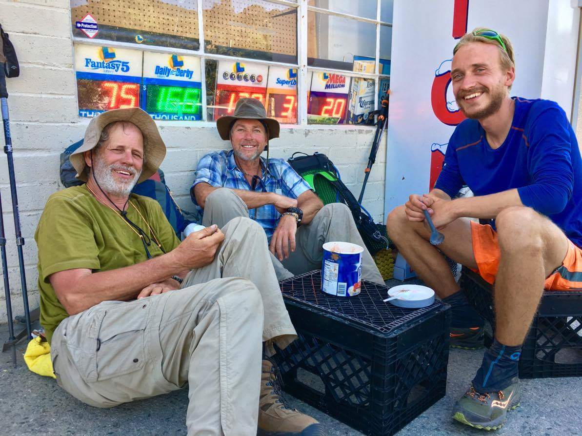 Es war schön hell als ich um 4.50 aus dem Zelt bin. Sterne und Mond am himmel. Gegen 5.30 konnten wir los. Die Sonne ging langsam auf. Die Stromleitung über und knackten. Der letzte kleine Anstieg von gestern verging schnell und es ging bergab. Die Landschaft bliebt gleich. In scharfen Switchbacks lagen ausgetrocknete Flussbette. Hier war auch mal mehr grün und Bäume drin. Ansonsten war der Trail sehr eintönig und ernüchternd wenn man sieht wo man noch alles lang muss. Ich war sowieso müde und ein wenig lustlos. Mein MP3 Player wann natürlich auch leer. Auf einer Gedächtnis Bank machten wir Pause. 50 Meilen Lauf. Dabei ist wohl einer 2011 gestorben. Skott Jerek stand auch auf der Liste. Ich glaube das war der Typ der 2015 auf dem AT den Rekord aufgestellt hat. Wir liefen weiter nun immer ein wenig bergauf. Die Sonne hatte auch schon gegen 8 Uhr ordentlich Power. Nachdem wir den Gipfel erreichten konnten wir schnell nach Green Vally absteigen. Bei der örtlichen Rainger Station haben wir unsere Wasservorräte aufgefüllt und unter einem Pavillon pause eingelegt. Es ging mit einem knackigen Aufstieg weiter. Die Sonne war nun schon wieder super stark. Ich bin aber einfach vornweg hoch geprügelt. Hat bis oben gut geklappt, dann hatte ich erneut Nasenbluten. Wir legten eine weitere Pause ein. 2km, 300 Höhenmeter hinter uns bahnte sich eine Katastrophe wie gestern an. Unerträgliche Hitze und wir wollen Kilomter kloppen um morgen bis zur Hikertown zu kommen um in der Nacht durch die Mojave zu wandern. Das Wetter ist gegen uns. Da es nun bergab geht laufen wir weiter. Zuerst liegt alles im schönen Schatten bis wir die bergseite wechseln und in exponierter Lage am Berg entlang taumeln. Nach schier endlosen Minuten gelangen wir wieder auf die Schatten Seite und finden unter ein paar Bäumen ein Platz für eine ausgiebige Mittagspause. Während wir auf dem Trail liegen überholt uns ein Reiter. Wir machen uns gegen 13.30 wieder auf. Es geht zum Glück nur bergab. Doch wir kommen bald aus dem Schatten der Bäume. Wieder im sandigen Gelände laufen wir gegen die Hitze an. Temperaturen über 40 Grad zwingen uns langsam in die Knie. Wir müssen jede Einbuchtung in den Berg mitnehmen und laufen so viele extra Meilen anstatt geradeaus im Tal zu laufen. Wenn ich den Fachbegriff für diese kleinen Täler herausfinde verfluche ich diesen. Im Tal angekommen, es ist noch heißer, finden wir 2 Gallonen Wasser und teinken eine. Auf der Straße machen wir halt. Wir sind uns einige dass wir nicht weiter gehen können. Zu gefährlich bei der Hitze und dem nächsten Aufstieg. Ich ziehe den Joker und wie hitchen in ein nahes Kaff. Im Restaurant gibts Unmengen Cola, Burger und HotDog. Wir verbringen viel Zeit dort da wir nicht vor 5 weiter wandern. Nachdem wir ausgiebig relaxet sind und die beiden ihre Füße gelüftet haben gehen wir noch zum Laden gegenüber und holen uns 1,5 L Eiscreme. Geil. Das tat gut. Vollet Kalorien suchen wir uns eine Fahrt zurück. Ohne Probleme sitzten wir wie bei der Hinfahrt auf der Ladefläche eines Pickups. Wir bekommen noch ein paar warnende Worte vor neuen Schlangenarten und machen uns im Schatten an den Aufstieg. Super gemütlich und voller Energie laufen wir problemlos bis zur Quelle auf halber Höhe. Nachdem alles voll ist ziehen wir noch bis ca. 19:30 weiter. Den restlichen Anstieg und dann auf der Bergkette entlang. Wieder viele Sträucher und zeitweise auch ein paar Überreste von Bäumen. Wir Campen an einer Dirtroad. Ich esse nur noch eine Ramen und verschwinde schnell im Zelt. Zu viele Moskitos und Mücken und nervendes Insektenpack. Morgen stehen die restlichen 45.9km bis Hikertown an. Bin mal gespannt wie wir das packen. Abmarsch ist gegen 4.30 Uhr. Also bin ich froh dass ich noch beide Einträge fertigstellen konnte. 21.05