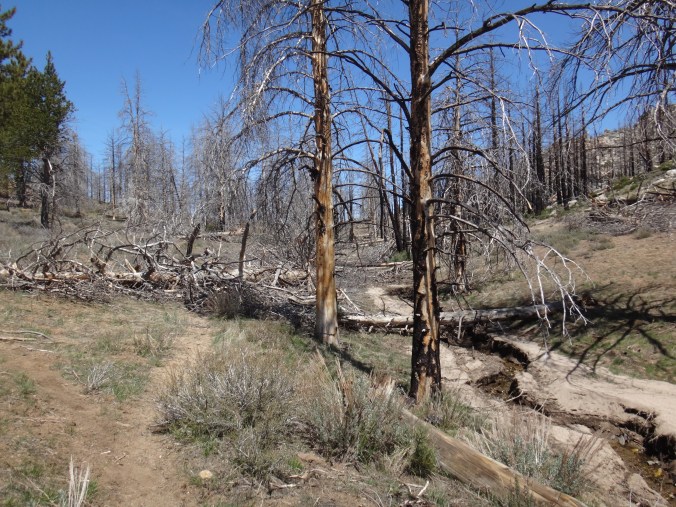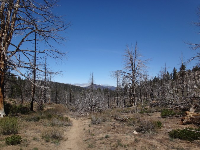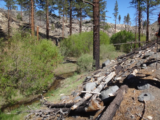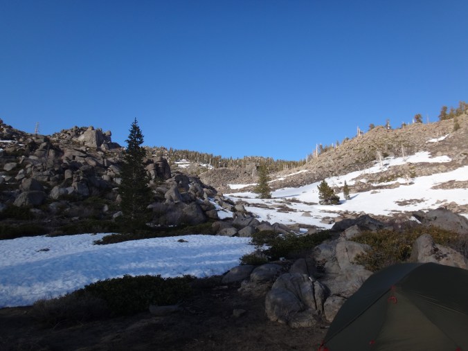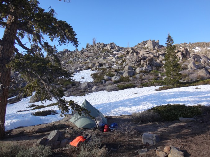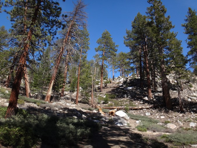 Schon gegen 5.30 wuselten viele Hiker im Camp. Bei der ganzen Geräuschkulisse konnte ich trotzdem bis 10 vor 6 im Bett liegen. Dann habe auch ich meine Sachen gepackt. Schnell noch das zelt zum trocknen aufgehangen und dann den Kanister auf meinem Rucksack befestigt. Die Schnalle läst sich so gerade schließen. Ich laufe mit Arrow und Navigator gegen 7 los. Wir müssen zuerst zurück zum Trail. Wir peifen alle unter den Lasten. Wir folgen dem Tal weiter hinauf und laufen zwischen niedrigen Büschen durch Sand. Der Fluss erscheint und es geht nun in  leichten Wellen immer weiter hinauf. Die alten Bäume sind riesig und alt. Stehen zwischen Autogroßen Felsen und auf grünen Wiesen. Der Aufstieg war mühsam. Auch wenn es nur „leicht“ bergauf ging hat mich der extra Proviant einfach nur in Schmerzen versetzt. Das Gewicht drückt sich in meine Hüften und meine Schultern durchzucken heiße Blitze. Ich bin wirklich nicht entzückt. Aber wir laufen immer weiter hinauf und auch die anderen Hiker welche heute morgen aufgebrochen sind treffen wir öfters. Mal machen wir Pause, mal die anderen. Es sind unter anderem Rex und Tatters, Eco und zwei weitere. Mike aka Medic und Candymen sind schon unterwegs. Nachdem wir dem Flusd lsnge gefolgt sind dürfen wir noch ein wenig im schattigen Wald verbringen bevor sich das Tal öffnet und wir in Baumkarges Land vordringen. Entweder verbrannt oder umgefallen. An einem der Flüsse hole ich neues Wasser. Wir treffen auf viele Gruppen mit Jugendlichen unter Begleitung die uns alle brav vorbei lassen. Das Tal müssen wir ganz hinauf. In der Sonne die wie eh und je bruzelt ist das schweißtreibend. Wir laufen also immer weiter bis wir fast am Ende einen schönen Platz unter einem großen Baum finden. Ich verdrücke Schokoriegel Nr. 4 +5 für heute. Gegen 11 laufen wir weiter und müssen über einige Baumstämme klettern. Dsbri zerschlagen ich mit meinem Knie einen ast den ich nicjt gesehen habe. Bis auf schwarze Asche sehe ich zum Glück nichts. Hier stehen die Bäume noch sind aber weiß. Dann kommen wir endlich über die Kuppel und sehen weiteren Wald. Aber dahinter stehen die ersten Schneebedeckten Berge. Hintern dem kleinen Wald öffnet sich ein langes Tal. Manche anliegende Berge sind weiß. Wir laufen halb durch und müssen manche wassergetränkte Matschstellen ungehen. Dann geht es rechts wieder bergauf. Ich ersehne eine Pause und denke ich würde mich sogar auf einen Kaktus setzen nur um eine Rast zu machen und den Rucksack abzulegen. Wir machen um 12.30 eine Pause im Schatten. Wir wollen alle nicht wirklich weiter. Wir leiden bis auf Arrow. Die läuft einfach immer voraus ohne zu murren oder ein negatives Kommentar. Dann geht es in ein Tsl in dem ein breoter Fluss fließt. Zum Glück gibt es eine Brücke. Das Tsl laufen wir nun auf der anderen Seite zurück und gehen ins Cow Vally wo wir dem Fluss folgen. Es geht nun steil hinauf und ich bin echt bedient. Wir machen nun nochmal ca. 500 Höhenmeter. Auch kommt hier und da ein wenig Schnee zum Vorschein. Ich quere den Fluss öfters in Sprüngen die mir das Gewicht noch mehr in die Schultern pressen. Die Landschaft ist toll. Richtig wie im Film eben. Gegen 16.30 erreichen wir fen Campingplatz wo Medic und Candmen bereits warten. Wir bauen auf und kochen Abendessen. Man wenigstens auf den Bärenkanistern sitzen. Wir genießen noch die schöne Aussicht zurück ins Tal und die Sonne. Dann gehts schnell ins Bett. Wir sind jetzt knapp unter 3.000 Hm. Es weht ordentlich und ich bin sicher es wird frostig. Morgen gehts dann um 6 los. Ich hab eine Druckstelle im rechten Schuh. Scheint zu eng zu sein. Mal schaun wie sich das entwickelt. Jetzt gehts pennen. Nach über 1300 Höhenmetern heute musd ich meinen Rücken entspannen. Hoffentlich reibt sich meine Haut am Hüftgurt nicht wund. 19:16 Uhr Gute Nacht.