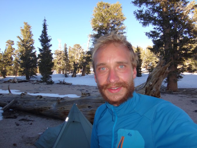 Die ganze Nacht habe ich gefühlt nicht geschlafen. Es war so kalt. Im Zelt -1 und draußen -3. Das Wasser war gefroren und meine Füße hatten sich auch entschieden über Nacht nicht warm zu werden. Es wsr miserabel. Um 5.15 bin ich aufgestanden. Sachen gepackt und auf die anderen gewartet. Ausnahmsweise mal mit langer Shorts. Um 6 sind wir dann los. Den restlichen Berg ging es über Schnee hinauf der knackig gefroren war. Medic führt uns durch den Wald. Der Trail ist kaum zu sehen. Es macht Spaß durch den Schnee zu gehen. Aber es ist immer noch frostig. Die Sonne braucht noch lange bis sie uns erreicht. Wir schlagen uns quer zum Berg und haben schöne Aussichten aufs Tal. Mir gefällt das Kolonnenlaufen nicht so. Auf der Nordseite erwartet uns deutlich mehr Schnee und wir laufen fast komplett für 4 Meilen über eine Schneedecke. Fast alle machen sich mal lang. Aber keinem passiert etwas. Medic sucht schon immer die schonendste Route aber wenn msn die ganze Zeit aufs Handy schauen muss um zu wissen wo es lang geht nimmt man mal einen steilen Hang mit. Gegen 8.30 machen wir eine Pause in der nun endlich erschienen Sonne. Die anderen kochen und ich snacke meine Schokoriegel. Gegen 9 gehts weiter. Wir laufen immer weiter ins Tal hinab. Es liegt nun kein Schnee mehr. Dafür fließen überall kleine Bäche die wir teilweise akrobatisch überqueren um keine nassen Füße zu bekommen. Ich lasse mich zurück fallen und wechsel wieder in mein Standard Wanderoutfit. Die anderen, immer noch mit lsnger Hose, kniehohen Gamaschen, Fleece und Jacke schsuen ein wenig komisch. Aber Schnee heißt nicht gleich arschkalt. Das Tal liegt wunderschön eingebetet zwischen hohen Bergen. Eine kleine Brücke führt über den sumpfigen Teil. Dann gehts wieder im Sand nach oben. Viele riesige Felsen und versteckte Schneereste. Die alten Bäume haben interessante Formen und sehen sehr sehr mitgenommen aus. Wir schlängeln uns immer weiter hinauf bis bald wieder Schneebretter auf dem Trail auftauchen. Teilweise 2 Meter hohe Wände direkt auf dem Trail. Wir treffen unterwegs noch einen Hiker mit Skiern. Er hat heute nicht so viel zu tun. Medic führt uns auch hier gut um und über den ganzen Schnee. Teilweise verlieren wir den Weg weil wir einer Schneemauer ausweichen müssen und laufen erstmal quer durch die Pampa bis wir den Weg wieder gefunden haben. Mittag machen wir auf einem schönem Felsen. Alle sitzen und stopfen sich voll um danach in der Sonne einzudösen. Nach 3 Wraps mit wurst und Käse ist mir ein wenig übel. Habe keine Lust mehr auf die Sommerwurst. Habe gerade bemerkt das der Wind ziemlich übel durch mein Zelt zieht. Deswegen auch die kalten Füße gedtern Nacht. Werde gleich noch eine Schneemauer zum Schutz bauen. Ist schließlich nicht mal 18 Uhr und ich bin schon im Schlafsack. Den Nachmittag haben wir weiter damit verbracht aufzusteigen. Bei über 3000 Metern zeigen sich erste Symptome wie schnelle Erschöpfung, Muskelkrämpfe. Zum Glück geht es dann schön am Berg entlang und sanft hinab bis zu unserem Zeltplatz den wir um 16 Uhr erreichen. Es windet sehr. Aber wir müssen nicht im Schnee zelten. Wir kochen alle zusammen und Swimmer kommt auch noch dazu. Mehr als genügend Platz haben wir ja. Zum Glück floss ein paar Kilometer vor unserem Halt noch Wasser über den Trail. Ansonsten hätten wir schnee schmelzen müssen.