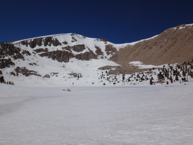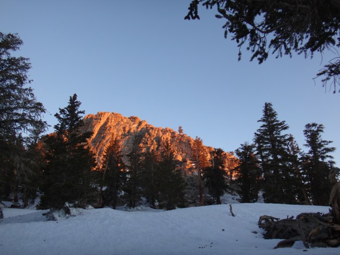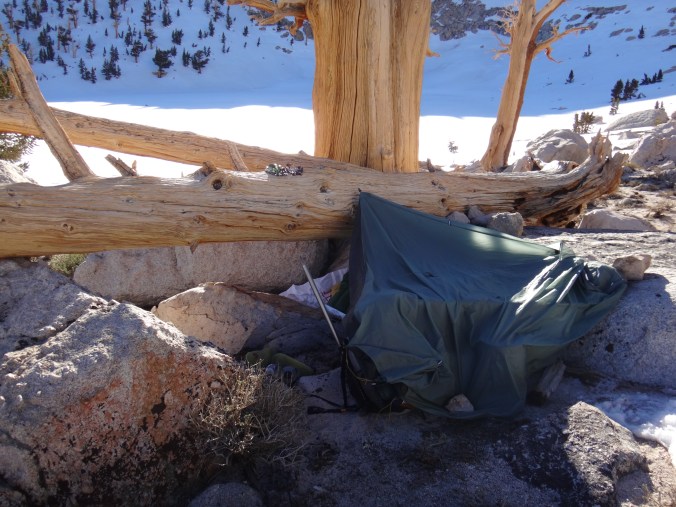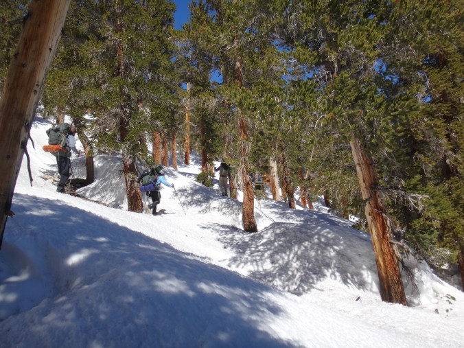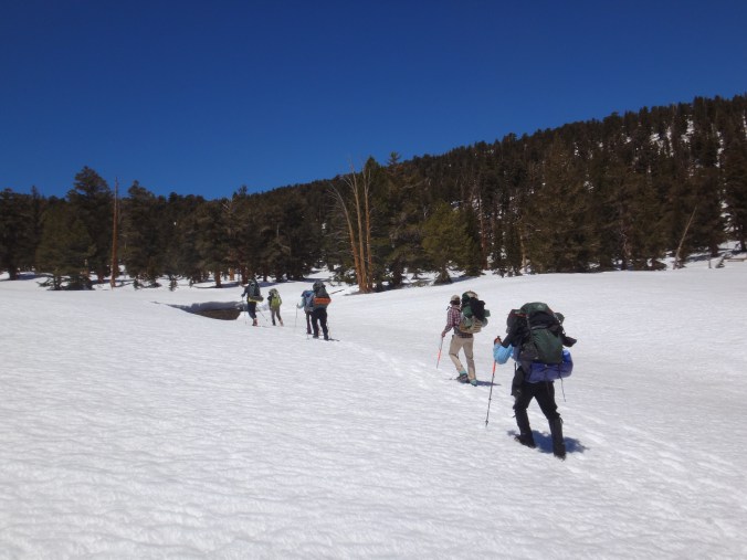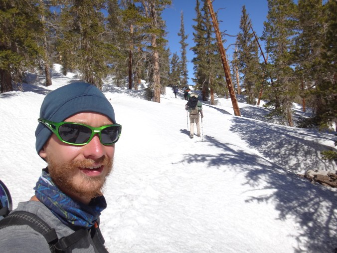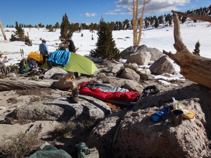Auch wenn der Wind in der Nacht nachgelassen hat, habe ich jedoch gefühlt nicht geschlafen. Wahrscheinlich habe ich geträumt das ich nicht schlafen konnte aber meine Nase war ziemlich zu und mir lief die ganze Zeit Sabber auf die Matratze. Es war kälter als gestern. -4 Grad. Ich bin wieder um 5.15 auf und packe zusammen. Mein Zelt ist ein Eisblock. Draußen sehe ich Eco. Er ist gestern Abend noch gekommen. Wir brechen alle um 6 auf. Die Sonnenstrahlen begrüßen den großen Felsenberg hinter unserem Campplatz. Wir gehen der Sonne in den Hang hinterher. Es liegt viel Schnee aber wir laufen ohne Steigeisen. Es macht wieder viel Spaß und die Sonne gibt direkt ein wenig Wärme. Ich lasse mich oft zurück fallen um Fotos zu schießen und wieder in meinem Tempo aufzuholen. Mit Eco halte ich ein kleines Schwätzchen. Wir laufen so gemütlich 8 km den berg hinab. Im Tal geht es nur kurz an einem teilweise zugefrorenen See entlang bevor wir wieder ansteigen. Ich muss kurz in meine kurze Hose und T-Shirt schlüpfen und hole die anderen wieder ein. Ich komme bei der Höhe schnell aus der Puste und muss ordentlich luftholen. Der Aufstieg bietet immer mehr Schnee. Kein Trail in Sicht und Martin aka Medic führt uns gekonnt durch den Schnee. Irgendwann wird es allen ein wenig zu steil und alle ziehen ihre Steigeisen oder Mikrospikes an. Ich folge auch wenn es ohne mehr Spaß und Hersusforderung war den Fuß richtig zu setzten. So schlängeln wir uns rauf und runter zwischen und unter Bäumen hindurch bis wir nach einer großen Lichtung Pause machen. Nun ist wirklich 95% der Oberfläche schneebedeckt. Wir laufen auf die nächste Lichtung und holen ein wenig Wasser. Dann gehts wieder bergauf. Wir kommen nur langsam voran. Hier ein Stein im Schuh, da kein Weg. Aber wir machen es schließlich durch weitere Schneelandschaft bis zum Chicken Lake Spring wo Rattler und 2 weiter Hiker bereits warten. Für sie geht morgen der Kurs los. Bis jetzt sind sie aber noch die einzigen. Wir machen es uns auf den Felsen gemütlich und schlagen mit der Eisaxt ein Loch in den See um Wasser zu bekommen. Die Hände werden eiskalt beim filtern. Wir genießen die Sonne und schnacken herum. Ich kann Eco und Swimm für Mt. Whitney gewinnen. Naja, Eco hat den Wunsch geäußert und ich habe die Idee natürlich dankend aufgegriffen. Wir laufen um 5 los und woölen bis zum fuß wandern. Dann Nachts besteigen und zurück auf den Trail um am nächsten Tag über Forester Pass zu klettern. Werden ein paar harte Tage 🙂 ich freu mich drauf mal wieder loszulegen. Der Bergführer idt dann gegen 16.30 auch mal gekommen und die drei wechseln die Seeseite. Wir verwandeln unsere in Hikertrash. Überall Ausrüstung, Klamotten, etc. 🙂