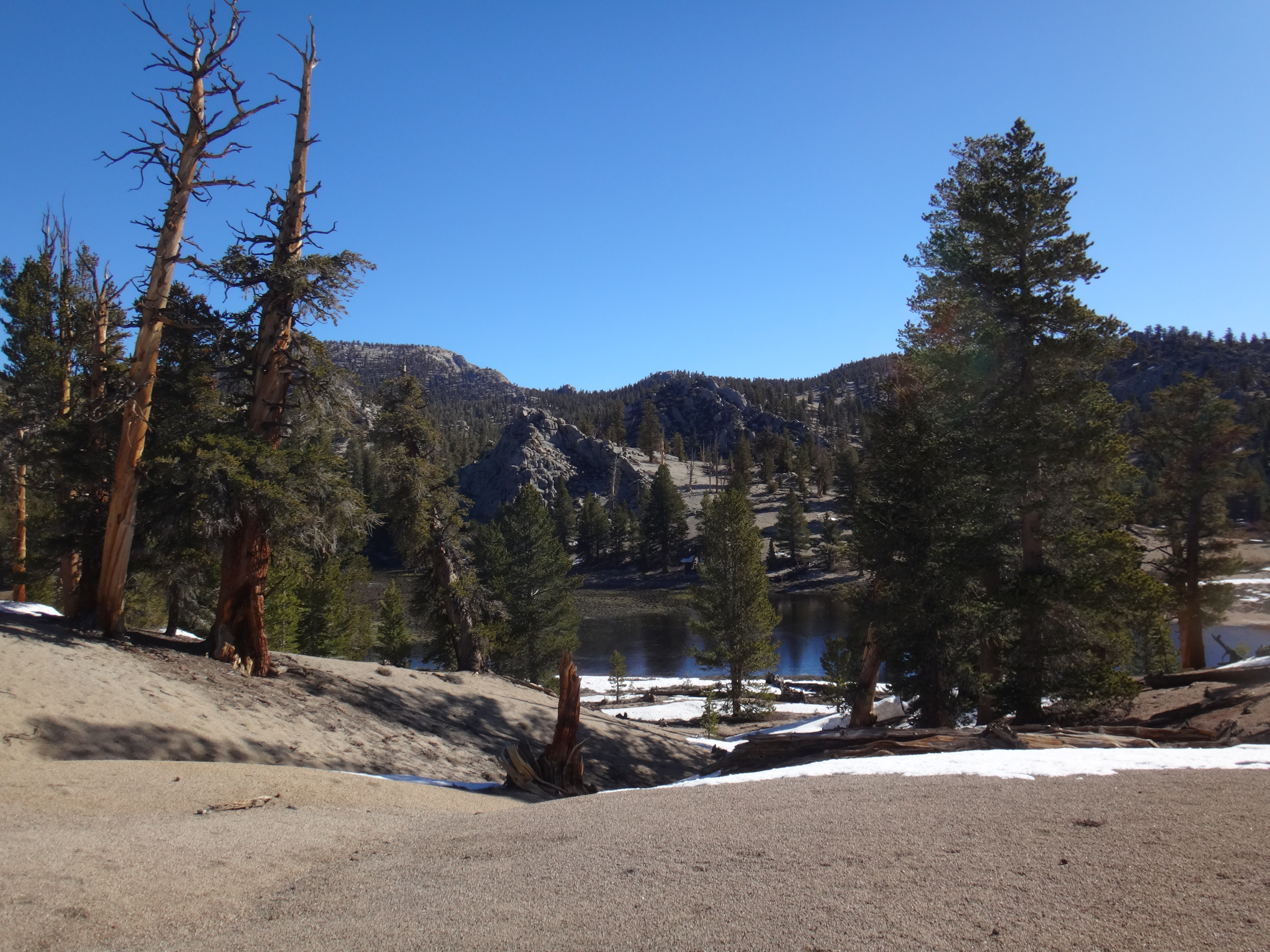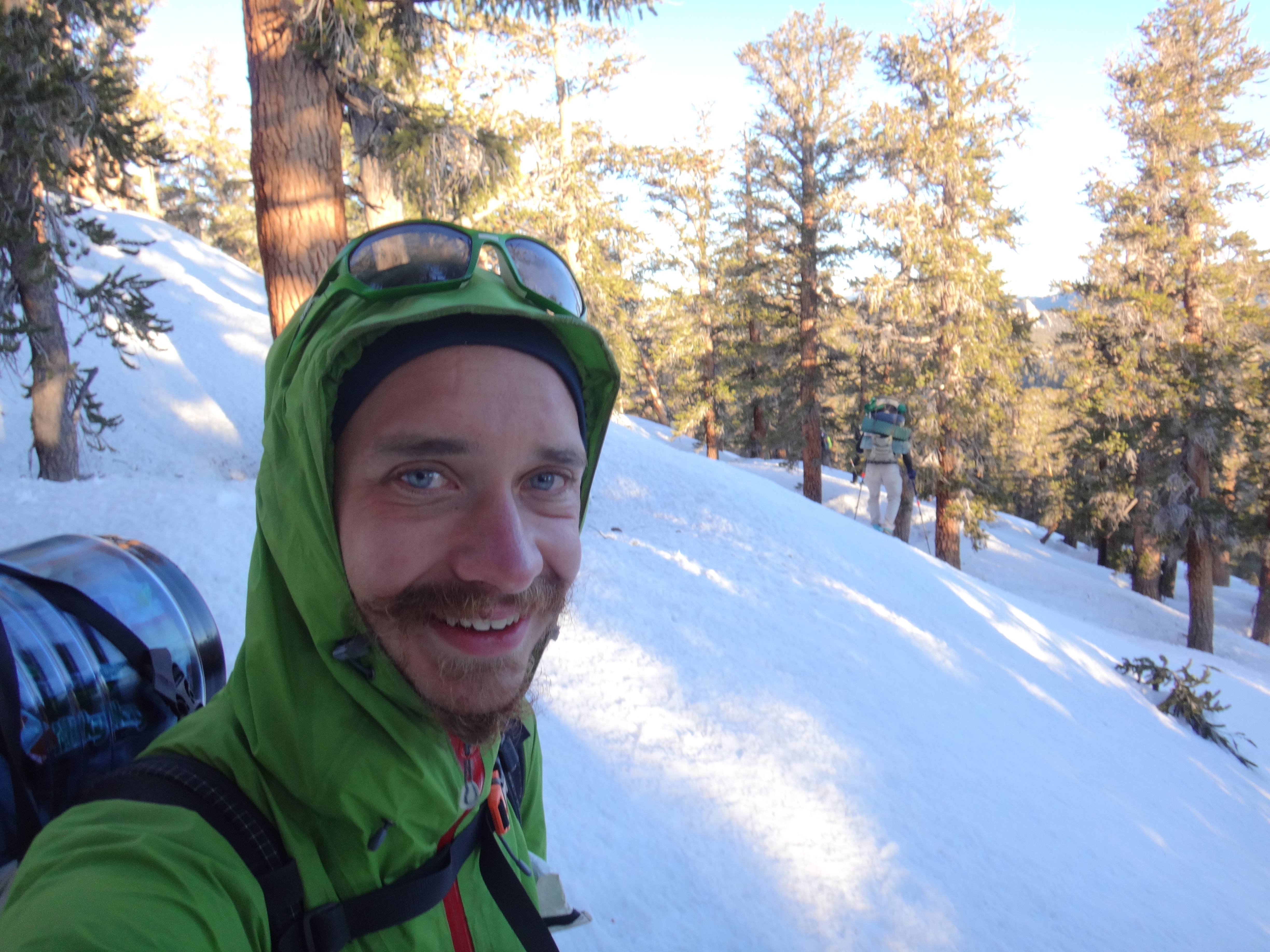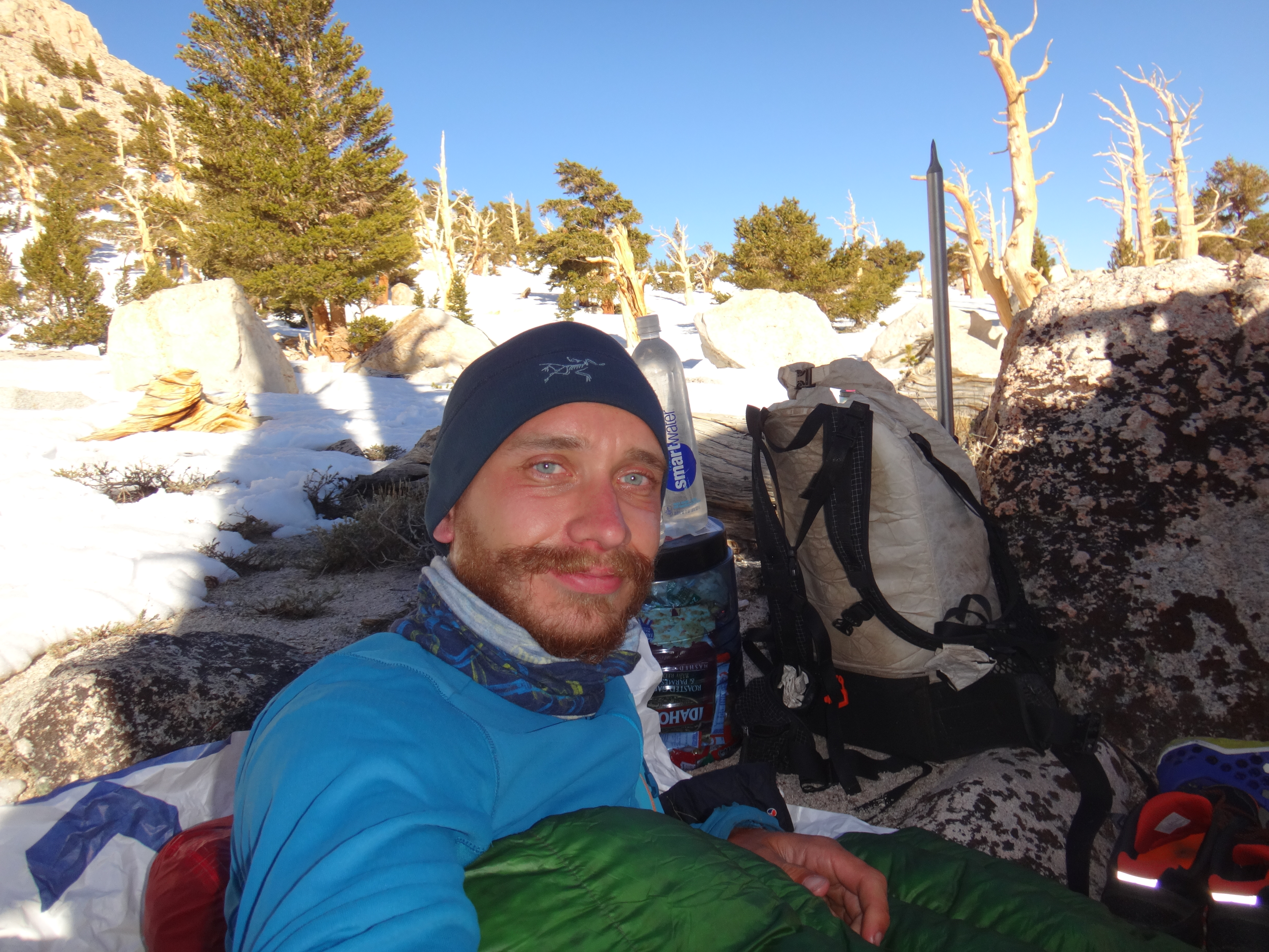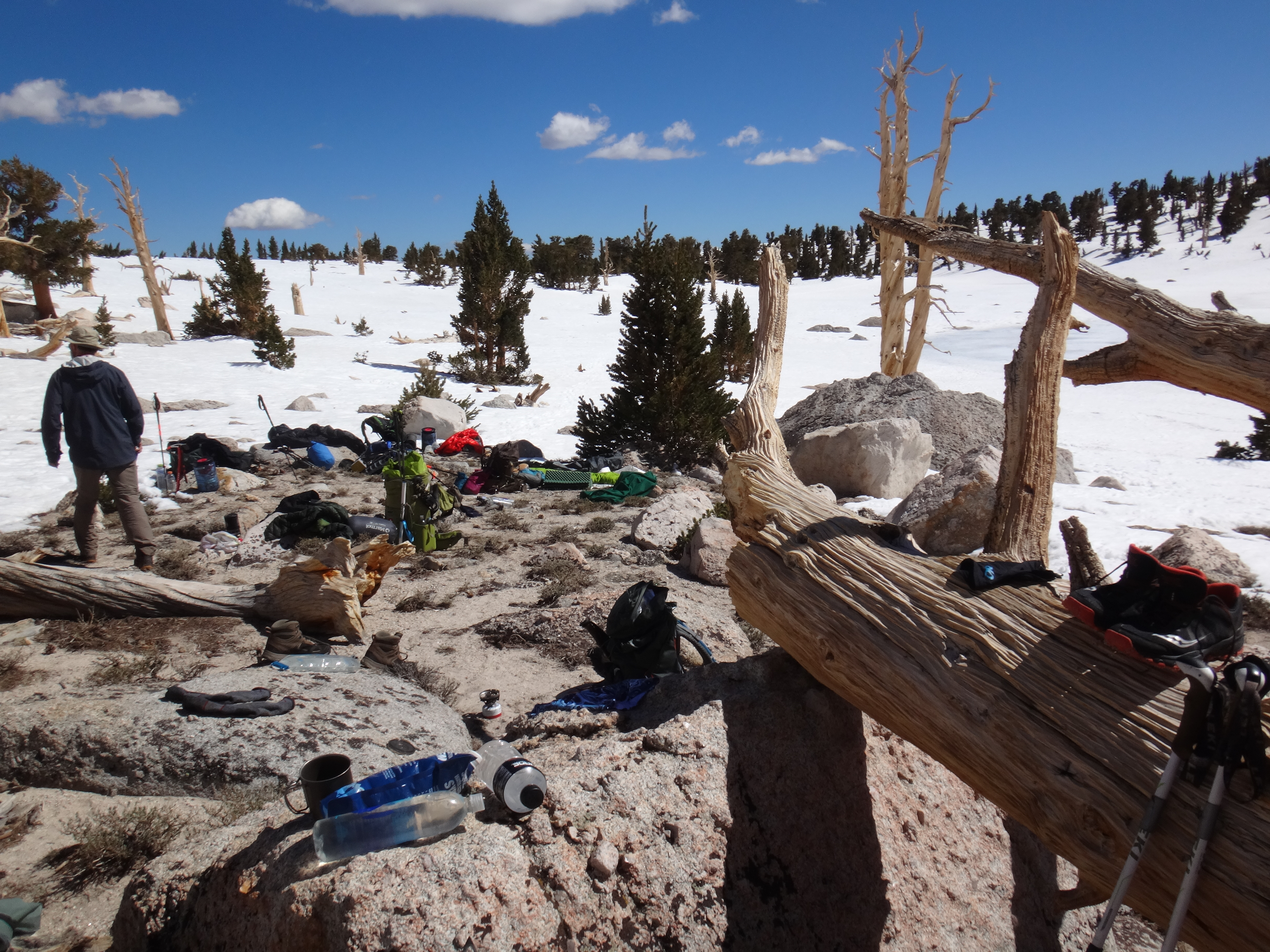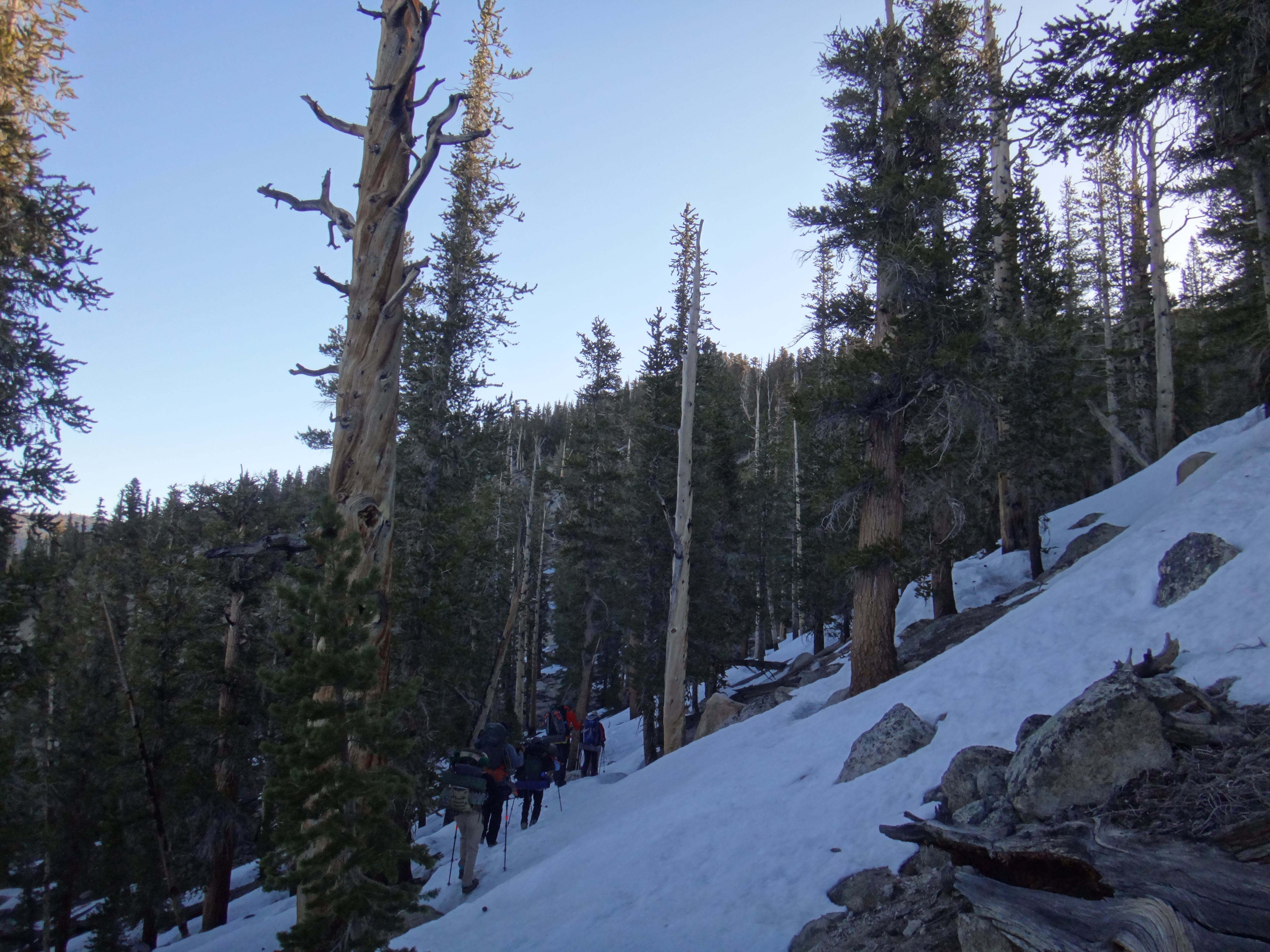 Auch wenn der Wind in der Nacht nachgelassen hat, habe ich jedoch gefühlt nicht geschlafen. Wahrscheinlich habe ich geträumt das ich nicht schlafen konnte aber meine Nase war ziemlich zu und mir lief die ganze Zeit Sabber auf die Matratze. Es war kälter als gestern. -4 Grad. Ich bin wieder um 5.15 auf und packe zusammen. Mein Zelt ist ein Eisblock. Draußen sehe ich Eco. Er ist gestern Abend noch gekommen. Wir brechen alle um 6 auf. Die Sonnenstrahlen begrüßen den großen Felsenberg hinter unserem Campplatz. Wir gehen der Sonne in den Hang hinterher. Es liegt viel Schnee aber wir laufen ohne Steigeisen. Es macht wieder viel Spaß und die Sonne gibt direkt ein wenig Wärme. Ich lasse mich oft zurück fallen um Fotos zu schießen und wieder in meinem Tempo aufzuholen. Mit Eco halte ich ein kleines Schwätzchen. Wir laufen so gemütlich 8 km den berg hinab. Im Tal geht es nur kurz an einem teilweise zugefrorenen See entlang bevor wir wieder ansteigen. Ich muss kurz in meine kurze Hose und T-Shirt schlüpfen und hole die anderen wieder ein. Ich komme bei der Höhe schnell aus der Puste und muss ordentlich luftholen. Der Aufstieg bietet immer mehr Schnee. Kein Trail in Sicht und Martin aka Medic führt uns gekonnt durch den Schnee. Irgendwann wird es allen ein wenig zu steil und alle ziehen ihre Steigeisen oder Mikrospikes an. Ich folge auch wenn es ohne mehr Spaß und Hersusforderung war den Fuß richtig zu setzten. So schlängeln wir uns rauf und runter zwischen und unter Bäumen hindurch bis wir nach einer großen Lichtung Pause machen. Nun ist wirklich 95% der Oberfläche schneebedeckt. Wir laufen auf die nächste Lichtung und holen ein wenig Wasser. Dann gehts wieder bergauf. Wir kommen nur langsam voran. Hier ein Stein im Schuh, da kein Weg. Aber wir machen es schließlich durch weitere Schneelandschaft bis zum Chicken Lake Spring wo Rattler und 2 weiter Hiker bereits warten. Für sie geht morgen der Kurs los. Bis jetzt sind sie aber noch die einzigen. Wir machen es uns auf den Felsen gemütlich und schlagen mit der Eisaxt ein Loch in den See um Wasser zu bekommen. Die Hände werden eiskalt beim filtern. Wir genießen die Sonne und schnacken herum. Ich kann Eco und Swimm für Mt. Whitney gewinnen. Naja, Eco hat den Wunsch geäußert und ich habe die Idee natürlich dankend aufgegriffen. Wir laufen um 5 los und woölen bis zum fuß wandern. Dann Nachts besteigen und zurück auf den Trail um am nächsten Tag über Forester Pass zu klettern. Werden ein paar harte Tage 🙂 ich freu mich drauf mal wieder loszulegen. Der Bergführer idt dann gegen 16.30 auch mal gekommen und die drei wechseln die Seeseite. Wir verwandeln unsere in Hikertrash. Überall Ausrüstung, Klamotten, etc. 🙂