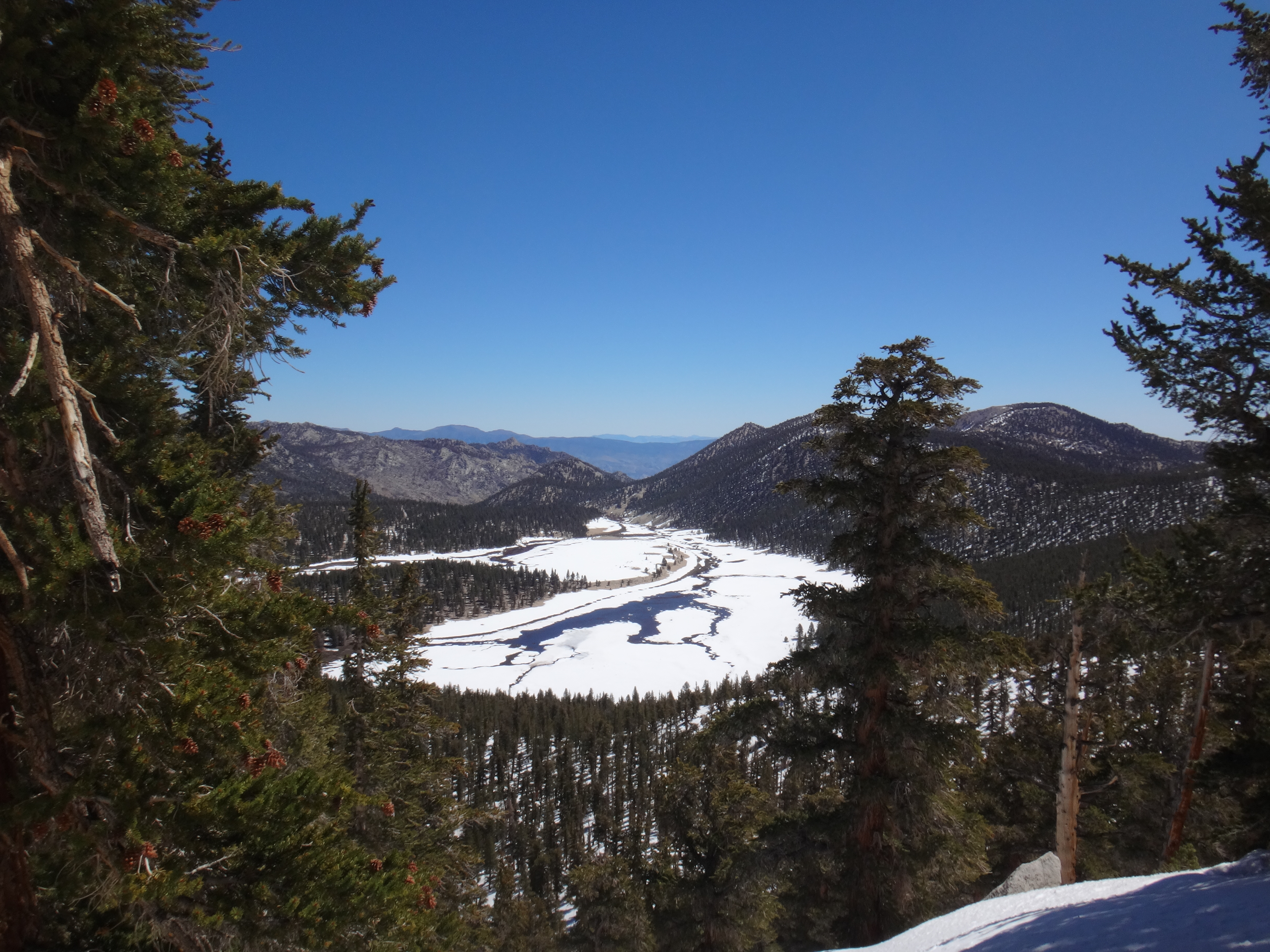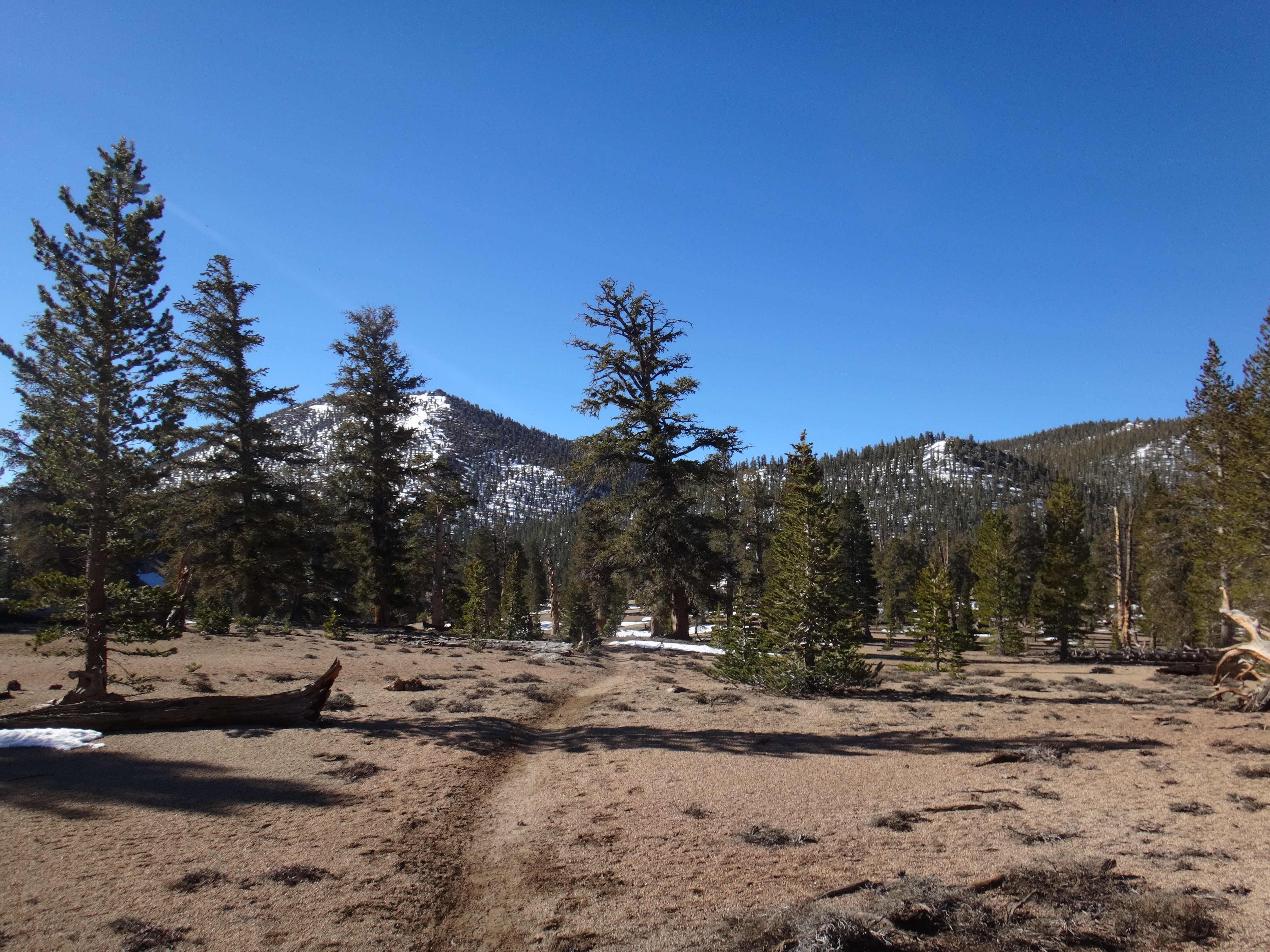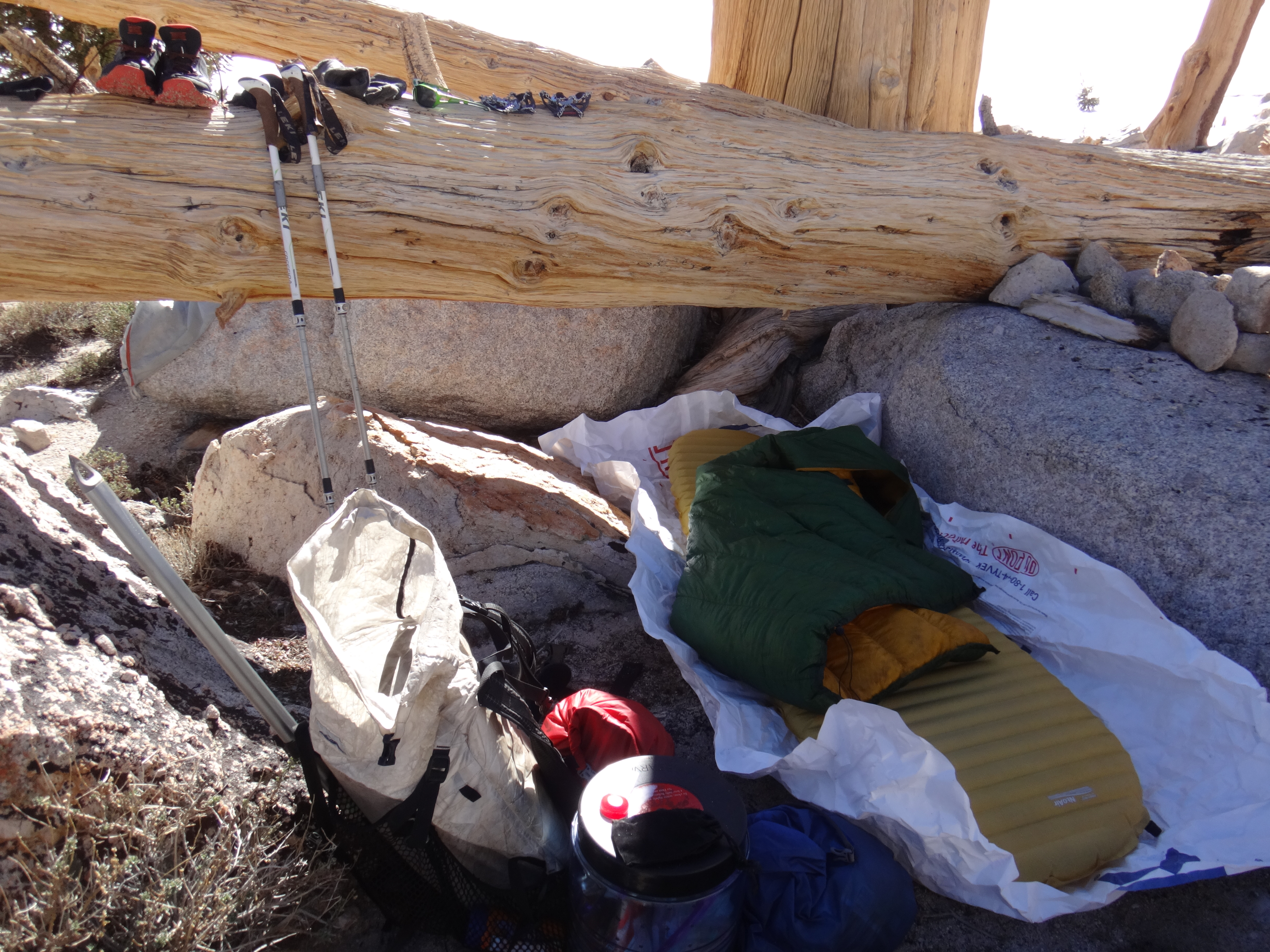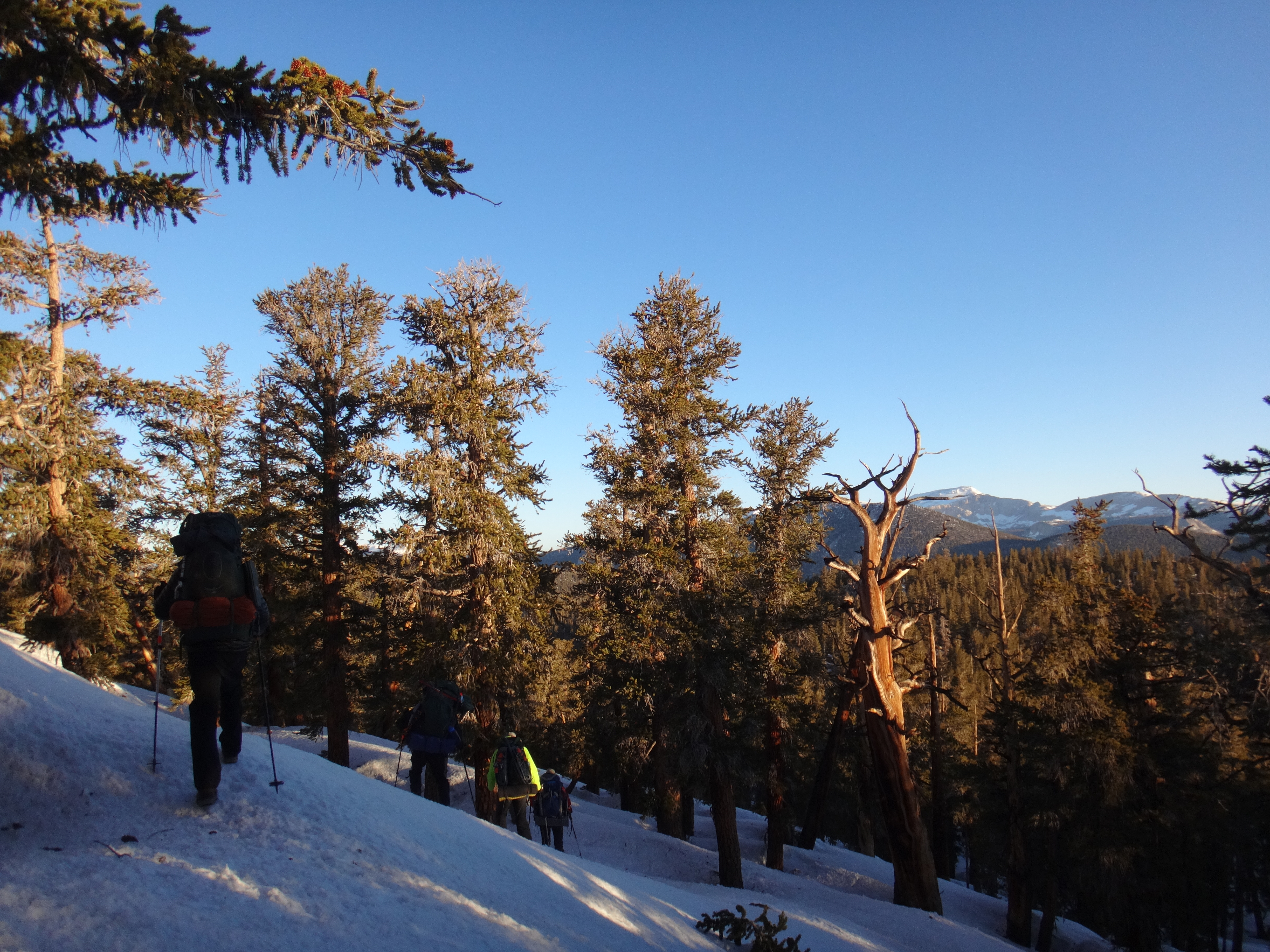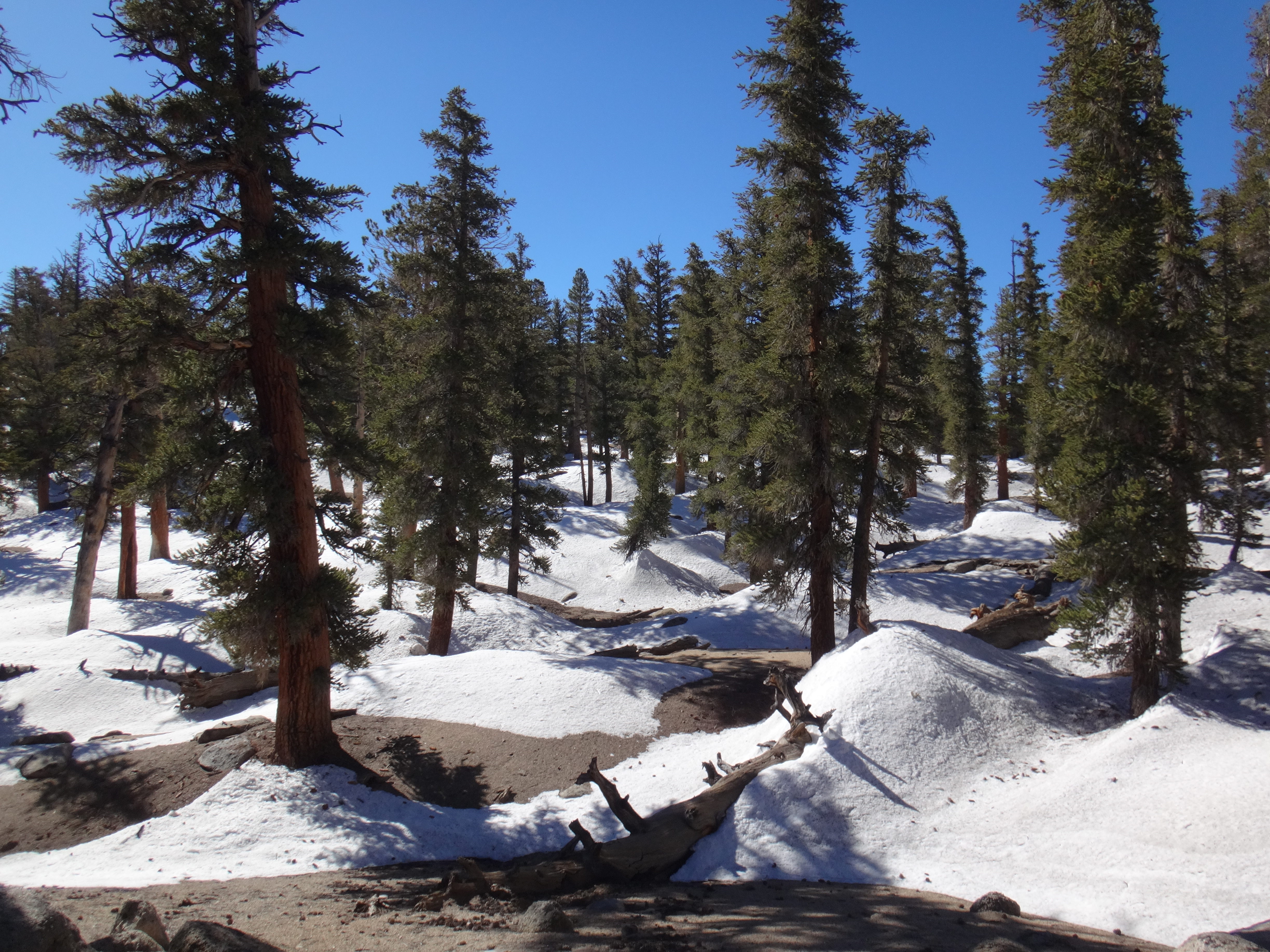 Auch wenn der Wind in der Nacht nachgelassen hat, habe ich jedoch gefühlt nicht geschlafen. Wahrscheinlich habe ich geträumt das ich nicht schlafen konnte aber meine Nase war ziemlich zu und mir lief die ganze Zeit Sabber auf die Matratze. Es war kälter als gestern. -4 Grad. Ich bin wieder um 5.15 auf und packe zusammen. Mein Zelt ist ein Eisblock. Draußen sehe ich Eco. Er ist gestern Abend noch gekommen. Wir brechen alle um 6 auf. Die Sonnenstrahlen begrüßen den großen Felsenberg hinter unserem Campplatz. Wir gehen der Sonne in den Hang hinterher. Es liegt viel Schnee aber wir laufen ohne Steigeisen. Es macht wieder viel Spaß und die Sonne gibt direkt ein wenig Wärme. Ich lasse mich oft zurück fallen um Fotos zu schießen und wieder in meinem Tempo aufzuholen. Mit Eco halte ich ein kleines Schwätzchen. Wir laufen so gemütlich 8 km den berg hinab. Im Tal geht es nur kurz an einem teilweise zugefrorenen See entlang bevor wir wieder ansteigen. Ich muss kurz in meine kurze Hose und T-Shirt schlüpfen und hole die anderen wieder ein. Ich komme bei der Höhe schnell aus der Puste und muss ordentlich luftholen. Der Aufstieg bietet immer mehr Schnee. Kein Trail in Sicht und Martin aka Medic führt uns gekonnt durch den Schnee. Irgendwann wird es allen ein wenig zu steil und alle ziehen ihre Steigeisen oder Mikrospikes an. Ich folge auch wenn es ohne mehr Spaß und Hersusforderung war den Fuß richtig zu setzten. So schlängeln wir uns rauf und runter zwischen und unter Bäumen hindurch bis wir nach einer großen Lichtung Pause machen. Nun ist wirklich 95% der Oberfläche schneebedeckt. Wir laufen auf die nächste Lichtung und holen ein wenig Wasser. Dann gehts wieder bergauf. Wir kommen nur langsam voran. Hier ein Stein im Schuh, da kein Weg. Aber wir machen es schließlich durch weitere Schneelandschaft bis zum Chicken Lake Spring wo Rattler und 2 weiter Hiker bereits warten. Für sie geht morgen der Kurs los. Bis jetzt sind sie aber noch die einzigen. Wir machen es uns auf den Felsen gemütlich und schlagen mit der Eisaxt ein Loch in den See um Wasser zu bekommen. Die Hände werden eiskalt beim filtern. Wir genießen die Sonne und schnacken herum. Ich kann Eco und Swimm für Mt. Whitney gewinnen. Naja, Eco hat den Wunsch geäußert und ich habe die Idee natürlich dankend aufgegriffen. Wir laufen um 5 los und woölen bis zum fuß wandern. Dann Nachts besteigen und zurück auf den Trail um am nächsten Tag über Forester Pass zu klettern. Werden ein paar harte Tage 🙂 ich freu mich drauf mal wieder loszulegen. Der Bergführer idt dann gegen 16.30 auch mal gekommen und die drei wechseln die Seeseite. Wir verwandeln unsere in Hikertrash. Überall Ausrüstung, Klamotten, etc. 🙂