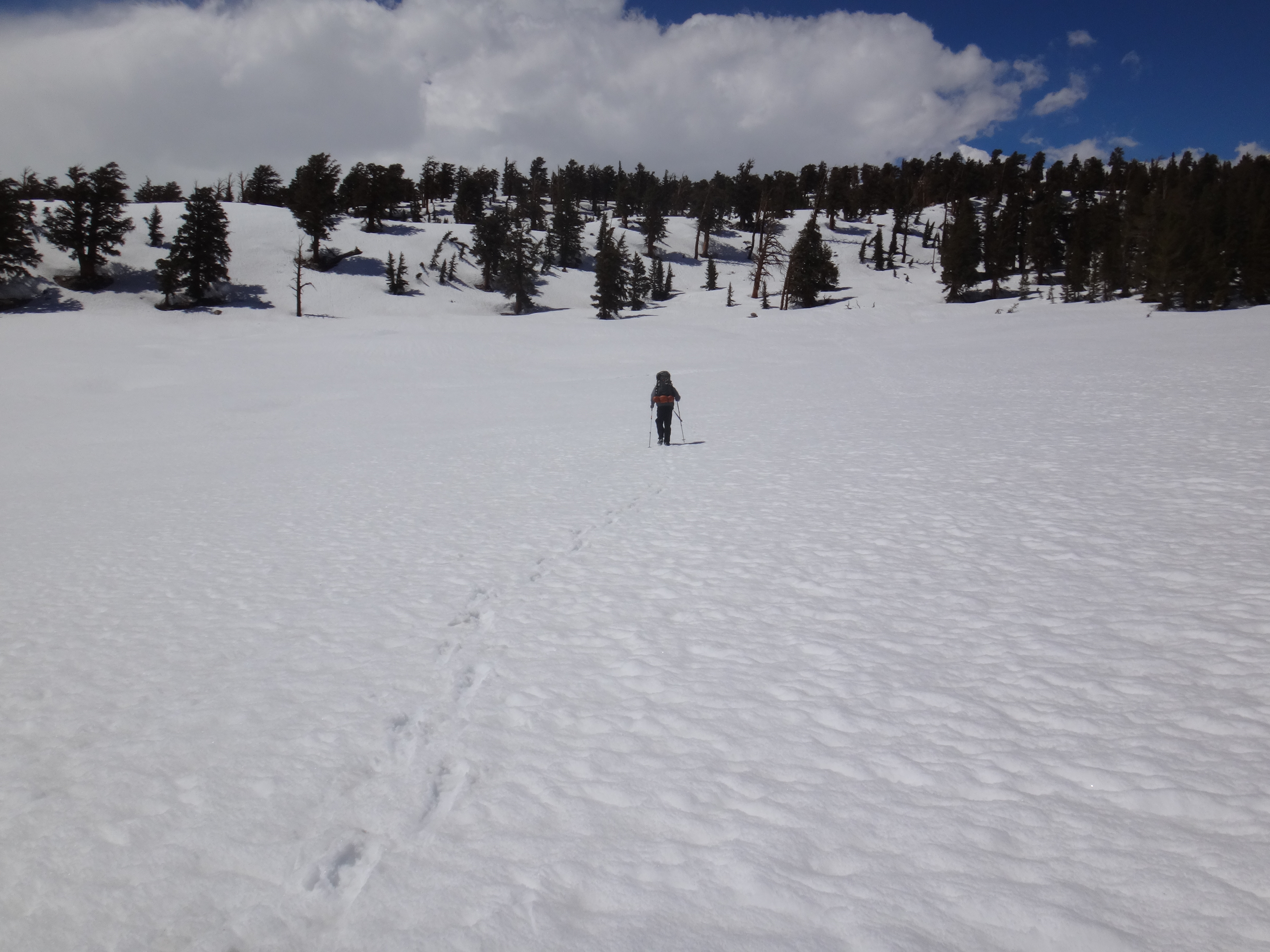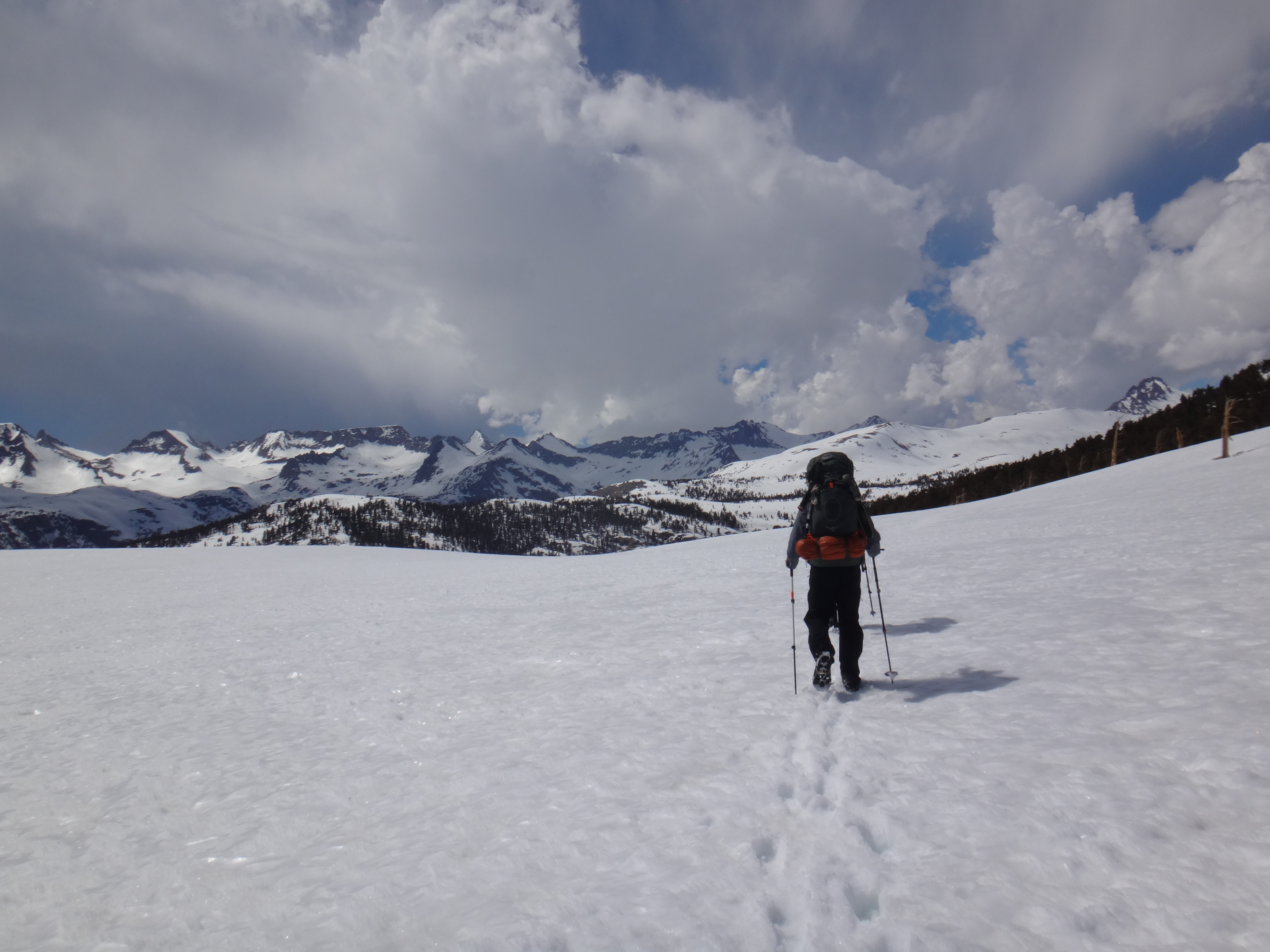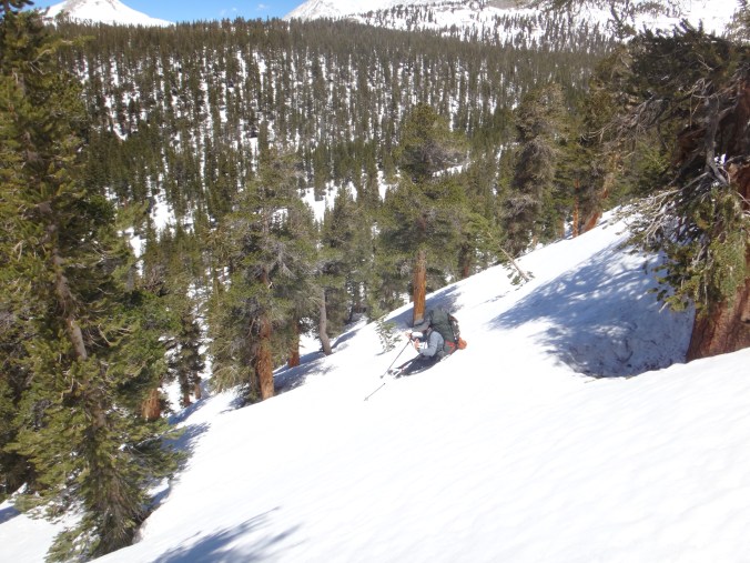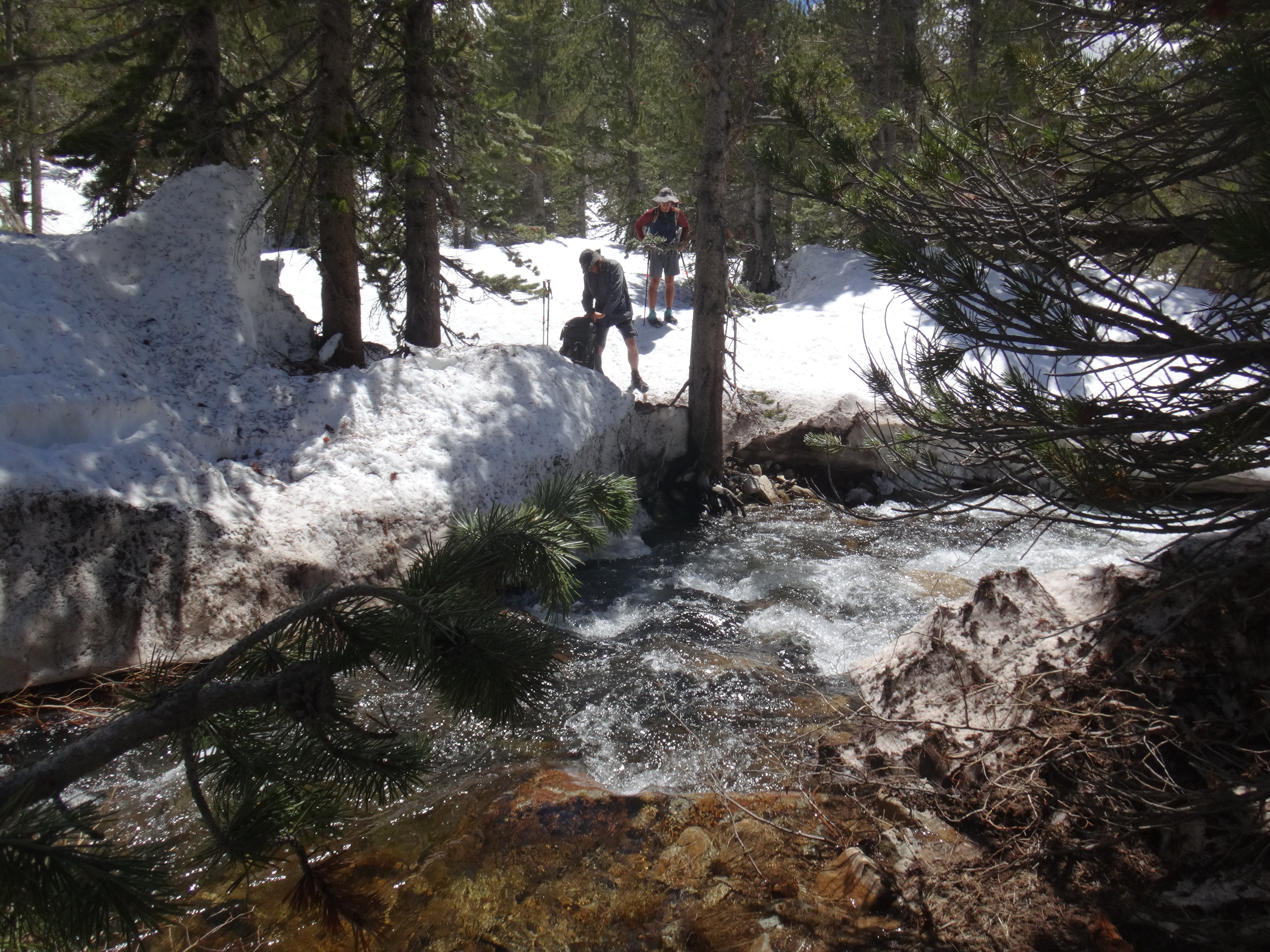Ich warte auf Regungen in den Nachbarzelten. Diese Penner lassen mich im Stich denke ich mir als ich nichts höre. Dann öffne ich den Reißverschluss und höre endlich Swim. Das Wetter scheint gut zu sein. Wir hatten bei den Aussichten gestern gedacht vielleicht hier bleiben zu müssen. Das hätte Swim gefallen. Deswegen auch erstmal keine regung wie ich später erfuhr. Eco war leider nicht so leicht wach zu kriegen. Wir riefen bestimmt 3 Minuten lang seinen Namen in die Nacht bis das wohlige Schnarchen verebbte. Erst als alle wach waren machte ich mich daran aus dem Zelt zu kommen. Es war bedeckt mit Eis. Der Wind hatte die Kopfseite beim Sturm gestern tief ins Zelt gedrückt und ich habe meinen Beutel mit Klamotten ans Kopfende gelegt um etwas Platz zu haben vor der vereisten Zeltwand. Immerhin, mein Zelt war dicht und hat seinen ersten Regen überstanden. Gott sei dank. Ich greife zu meinen Socken. Keine Bewegung nach Gesetzen der Schwerkraft. Genauso sind meine Schnürsenkel steif. Ich will wirklich ungern raus. Es sind zwar nur 0 Grad aber es fühlt sich deutlich kälter an. Die Müdigkeit von gestern macht sich bemerkbar. Die anderen kommen in Schwung und ich ziehe alles an was ich habe. 4 Lagen oben und 4 unten. Auch wenn es unten nur 2 halbe sind gibt es doch passende wärme und ich kann den vereisten schlafsack verstauen. Ab und an kratzt ein kalter Wind im Gesicht. Ich knete meine Schuhe und muss handgreiflich werden um die Laschen ordentlich zu öffnen. Dann geht’s hinein ins kalte elend. Durch meine warmen Füße tauen die Schuhe und mir wird schnell richtig kalt. Die anderen brauchen noch eine weile mit packen und ich bin froh als wir gegen 1:30 Uhr loswandern. Vorher gebe ich beiden jeweils noch 2 Snickers. Schließlich wollten beide nur bis Lone Pine wandern. Sind auf Grund guter Meilentage aber weiter gewandert. Medic und ich haben dann ein wenig Essen springen lassen, wir hatten schließlich für 8 Tage etwas dabei. Durch das Tal ging es dann natürlich bergauf. Wir hatten schon zu dieser Zeit mit „postholding“, versinken im Schnee, zu kämpfen und unsere Knie und Körper ächtzten unter den erzwungenen Verbeugungen. Es war mühsam und schmerzhaft. Wenn plötzlich und unerwartet der Boden nachgibt und man 20-30 Zentimer tiefer landet kommt noch das Rucksackgewicht von hinten dazu. Wir erwarten eigentlich die Gruppe um Medic und Candymen zu treffen. Wir haben zumindest gestern ihre spuren gesehen. Sie wollten den Pass früh erklimmen. Wir sehen keinen und landen nach ein paar stunden in der Dunkelheit am Fuße des Forester Pass. Wie üblich sehen wir nichts. Wieder nur eine schwarze wand aud Schnee. Wir entscheiden den vielen Spuren bergauf zu folgen. Wir klettern nun mit Eisaxt den Schneehang hinauf und landen nach ca. 200 Metern irgendwo aber nicht auf dem Trail. Ich arbeite mich unter ein paar Felsen entlang als mein rechter Fuß einbricht und ich wieder einknicke. Mein Rucksack folgt mir und meine Wasserflasche in der Seitentasche macht den Abgang bergab. Die sehe ich nie wieder. Schade aber nicht so schlimm. Habe noch eine auf der anderen Seite. Diese Löcher gibt es oft an Felsen, Büschen oder Baumstämmen. Meist leider verdeckt bis man reintritt. Dann machen wir eine Pause, checken erneut das GPS und sehen dann den Trail. Circa 10 Meter weiter links sind Felsen zu erkennen. Ich beginne die Traverse. Schlage meine Eisaxt ins Eis um sicheren Halt zu haben. Dann ramme ich meine Mikrospikes so lange ins Eisschneegemix bis ich einen sicheren Tritt habe. Ich gehe einen Schritt und traue mich aber nicht weiter. Es ist dunkel, unter mir eine 200 Meter lange Schneerutsche die steil bergab führt. Das ist zu hart. Wir entscheiden zwischen 3 Optionen. 1. Weiter hoch und unter der Felswand entlang. 2. Wie gehabt am Hang entlang. 3. Absteigen und neu nach dem Trail suchen. Wir nehmen Nr. 2 aber Swim geht vor. Gegen die Wand gelehnt arbeitet er sich höchst vorsichtig und langsam voran. Eco und ich folgen nach ca. 10 Minuten. In „sicheren“ Tritten. Ich ramme meine Axt vor jedem Schritt tief in den Schnee. Wir gelangen so auf den Trail. Auch hier bin ich froh das es Nacht ist. Links geht es steil und tief hinab. Wir folgen dem Trail jetzt einfach. Bei jeder 180 Grad Wende wechsel ich Eisaxt und Trekkingstock samt Handschlaufe. Wir kommen gut voran und sind bald am berüchtigten Iceslide. Einer 300 Meter langen Schnee/ Eisrutsche kurz vor dem Pass die man queren muss. Zum Glück waren vorher schon ein paar Hiker hier und wir sind in 2 Minuten drüber. Nur kurz vor dem Pass muss man nochmal 2 Meter eine steile Schnerverwehung hinauf klettern dann sind wir gegen 4:40 Uhr oben. 🙂 Unten im Tal sehen wir nun 3 Lichter. Das sind wohl unsere bekannten. Wir legen eine kurze Pause ein und genießen die grandiose Aussicht auf den nahenden Sonnenaufgang. Dann beginnen wir mit dem langen Abstieg durchs Tal. Zuerst folgen wir den maximal 15 Fußspuren die es hier her geschafft haben. Gleich darauf nehmen wir eine steile aber annährend ungefährliche Schneerutsche einen Hügel hinab. Wie schlittern ca. 50-80 Meter mit ordentlich Tempo. Als ich endlich zum stehen komme habe ich von den vielen Erschütterungen Kopfschmerzen. Aber wir laufen schön auf stabilem Schnee entlang und treffen noch auf einen Skier der im Zelt liegt. Der Abstieg durch das Tal ist einfach und lässt sich gut laufen. Wir passieren ein paar Seen und kommen in einen Wald. Links von uns ein größerer Fluss der teilweise noch verdeckt ist. Wir laufen und laufen ohne Pause um die guten Schneeverhältnisse auszunutzen. Ich bin aber wirklich k.O. meine Augen sind Tonnen schwer. Meine Knie tun weh von allen Schritten die nicht enden wie geplant. Also mindestens jeder 2te rutscht in irgendeiner Weise ab, dreht oder tut sonst was was er nicht soll. Der fehlende Schlaf schürrt die Kälte. Die Sonne hat es noch nicht bis ins Tal geschafft und begrüßt nur die angrenzenden Berggipfel. Ich wünsche mir nichts sehnlich