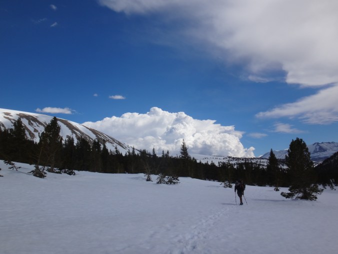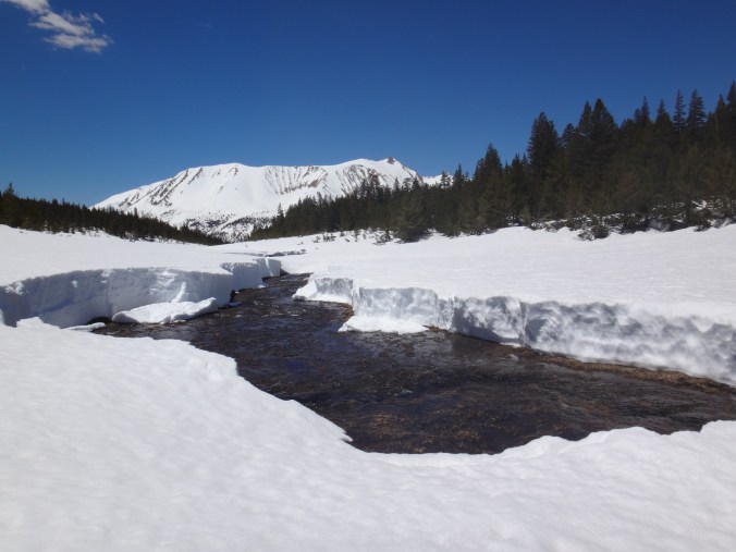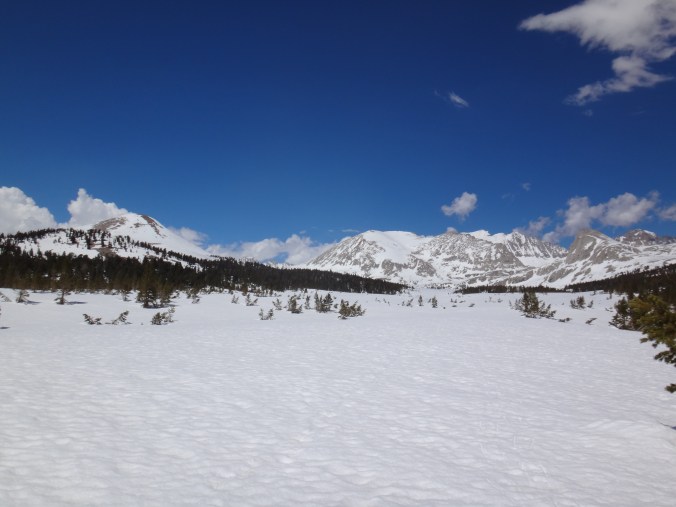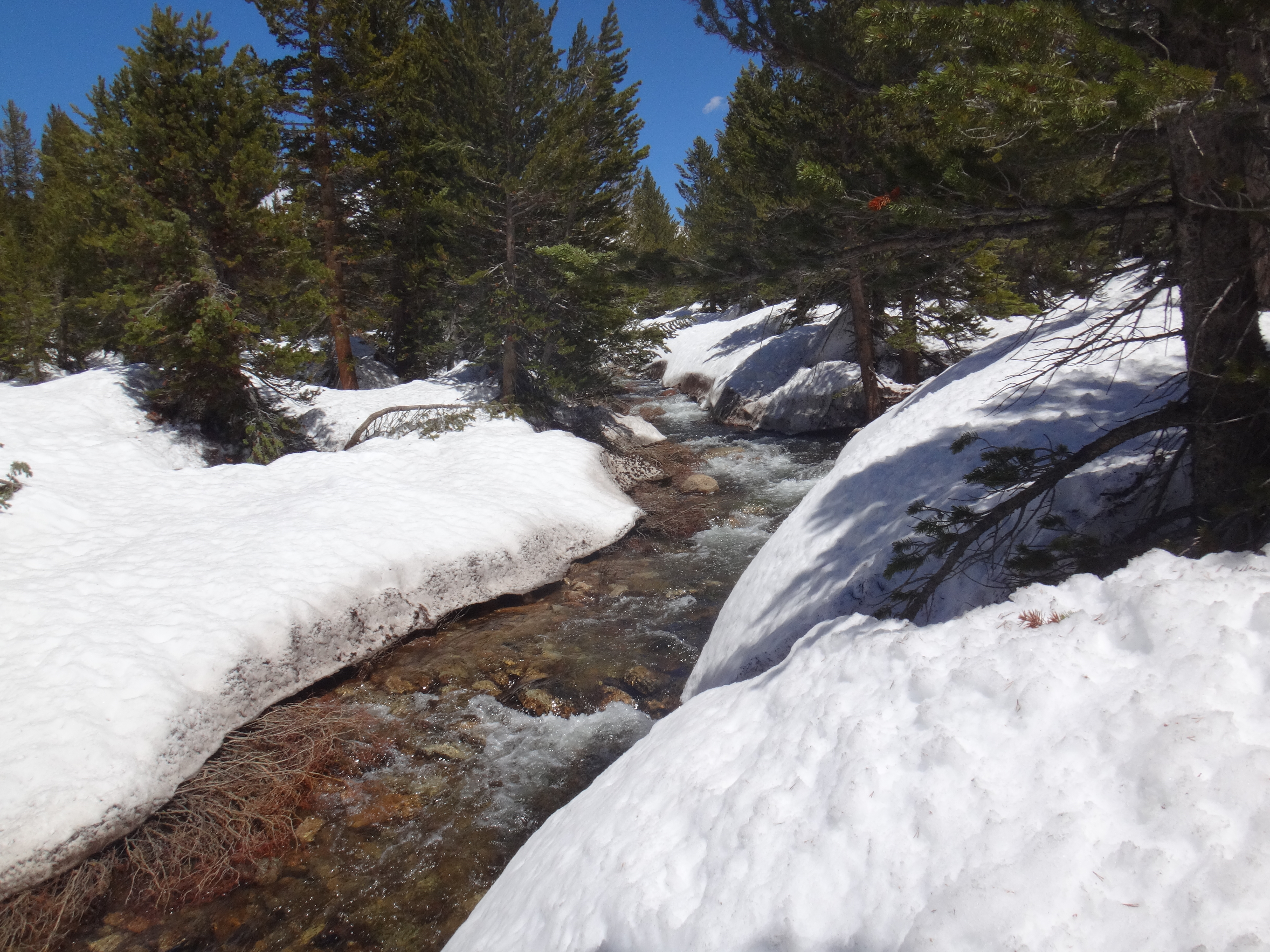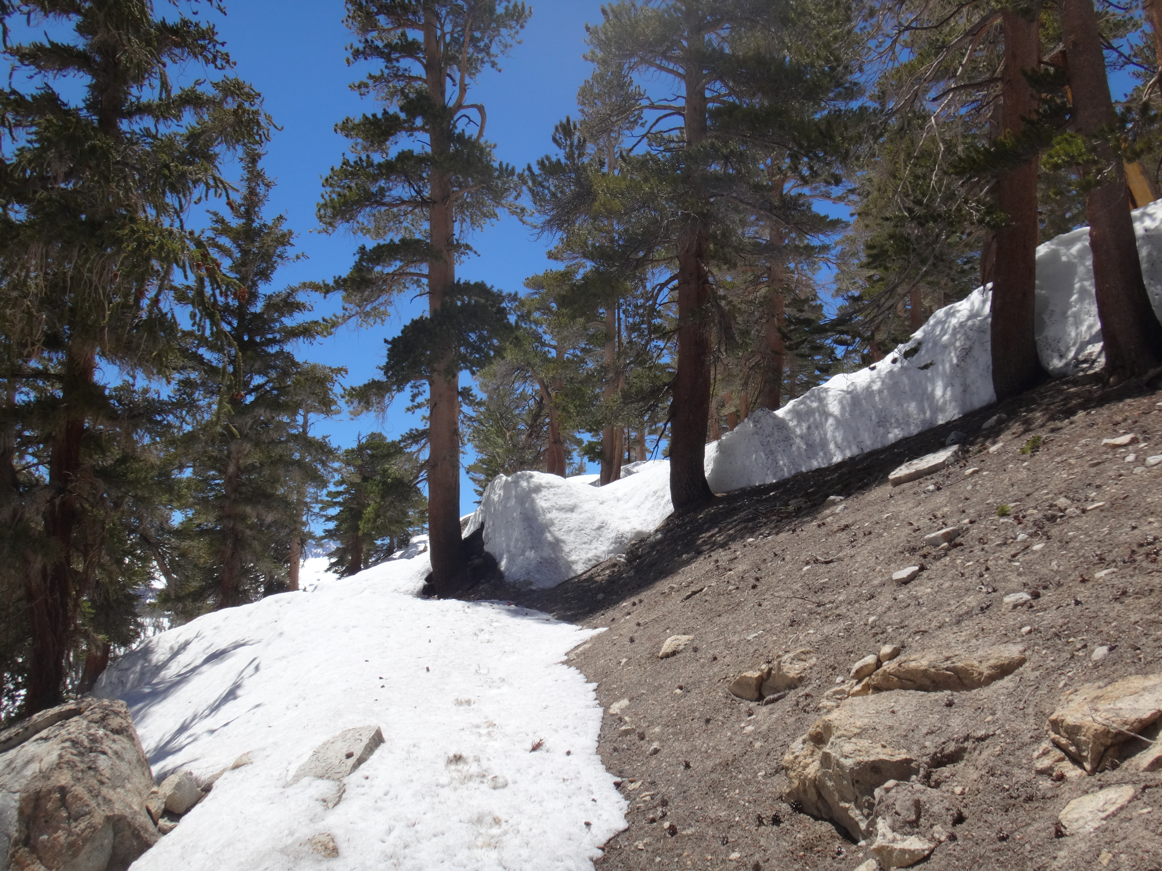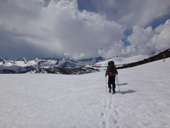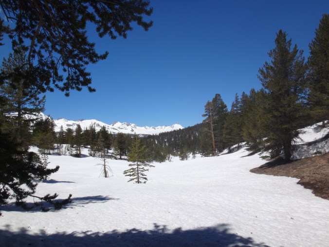 Ich warte auf Regungen in den Nachbarzelten. Diese Penner lassen mich im Stich denke ich mir als ich nichts höre. Dann öffne ich den Reißverschluss und höre endlich Swim. Das Wetter scheint gut zu sein. Wir hatten bei den Aussichten gestern gedacht vielleicht hier bleiben zu müssen. Das hätte Swim gefallen. Deswegen auch erstmal keine regung wie ich später erfuhr. Eco war leider nicht so leicht wach zu kriegen. Wir riefen bestimmt 3 Minuten lang seinen Namen in die Nacht bis das wohlige Schnarchen verebbte. Erst als alle wach waren machte ich mich daran aus dem Zelt zu kommen. Es war bedeckt mit Eis. Der Wind hatte die Kopfseite beim Sturm gestern tief ins Zelt gedrückt und ich habe meinen Beutel mit Klamotten ans Kopfende gelegt um etwas Platz zu haben vor der vereisten Zeltwand. Immerhin, mein Zelt war dicht und hat seinen ersten Regen überstanden. Gott sei dank. Ich greife zu meinen Socken. Keine Bewegung nach Gesetzen der Schwerkraft. Genauso sind meine Schnürsenkel steif. Ich will wirklich ungern raus. Es sind zwar nur 0 Grad aber es fühlt sich deutlich kälter an. Die Müdigkeit von gestern macht sich bemerkbar. Die anderen kommen in Schwung und ich ziehe alles an was ich habe. 4 Lagen oben und 4 unten. Auch wenn es unten nur 2 halbe sind gibt es doch passende wärme und ich kann den vereisten schlafsack verstauen. Ab und an kratzt ein kalter Wind im Gesicht. Ich knete meine Schuhe und muss handgreiflich werden um die Laschen ordentlich zu öffnen. Dann geht’s hinein ins kalte elend. Durch meine warmen Füße tauen die Schuhe und mir wird schnell richtig kalt. Die anderen brauchen noch eine weile mit packen und ich bin froh als wir gegen 1:30 Uhr loswandern. Vorher gebe ich beiden jeweils noch 2 Snickers. Schließlich wollten beide nur bis Lone Pine wandern. Sind auf Grund guter Meilentage aber weiter gewandert. Medic und ich haben dann ein wenig Essen springen lassen, wir hatten schließlich für 8 Tage etwas dabei. Durch das Tal ging es dann natürlich bergauf. Wir hatten schon zu dieser Zeit mit „postholding“, versinken im Schnee, zu kämpfen und unsere Knie und Körper ächtzten unter den erzwungenen Verbeugungen. Es war mühsam und schmerzhaft. Wenn plötzlich und unerwartet der Boden nachgibt und man 20-30 Zentimer tiefer landet kommt noch das Rucksackgewicht von hinten dazu. Wir erwarten eigentlich die Gruppe um Medic und Candymen zu treffen. Wir haben zumindest gestern ihre spuren gesehen. Sie wollten den Pass früh erklimmen. Wir sehen keinen und landen nach ein paar stunden in der Dunkelheit am Fuße des Forester Pass. Wie üblich sehen wir nichts. Wieder nur eine schwarze wand aud Schnee. Wir entscheiden den vielen Spuren bergauf zu folgen. Wir klettern nun mit Eisaxt den Schneehang hinauf und landen nach ca. 200 Metern irgendwo aber nicht auf dem Trail. Ich arbeite mich unter ein paar Felsen entlang als mein rechter Fuß einbricht und ich wieder einknicke. Mein Rucksack folgt mir und meine Wasserflasche in der Seitentasche macht den Abgang bergab. Die sehe ich nie wieder. Schade aber nicht so schlimm. Habe noch eine auf der anderen Seite. Diese Löcher gibt es oft an Felsen, Büschen oder Baumstämmen. Meist leider verdeckt bis man reintritt. Dann machen wir eine Pause, checken erneut das GPS und sehen dann den Trail. Circa 10 Meter weiter links sind Felsen zu erkennen. Ich beginne die Traverse. Schlage meine Eisaxt ins Eis um sicheren Halt zu haben. Dann ramme ich meine Mikrospikes so lange ins Eisschneegemix bis ich einen sicheren Tritt habe. Ich gehe einen Schritt und traue mich aber nicht weiter. Es ist dunkel, unter mir eine 200 Meter lange Schneerutsche die steil bergab führt. Das ist zu hart. Wir entscheiden zwischen 3 Optionen. 1. Weiter hoch und unter der Felswand entlang. 2. Wie gehabt am Hang entlang. 3. Absteigen und neu nach dem Trail suchen. Wir nehmen Nr. 2 aber Swim geht vor. Gegen die Wand gelehnt arbeitet er sich höchst vorsichtig und langsam voran. Eco und ich folgen nach ca. 10 Minuten. In „sicheren“ Tritten. Ich ramme meine Axt vor jedem Schritt tief in den Schnee. Wir gelangen so auf den Trail. Auch hier bin ich froh das es Nacht ist. Links geht es steil und tief hinab. Wir folgen dem Trail jetzt einfach. Bei jeder 180 Grad Wende wechsel ich Eisaxt und Trekkingstock samt Handschlaufe. Wir kommen gut voran und sind bald am berüchtigten Iceslide. Einer 300 Meter langen Schnee/ Eisrutsche kurz vor dem Pass die man queren muss. Zum Glück waren vorher schon ein paar Hiker hier und wir sind in 2 Minuten drüber. Nur kurz vor dem Pass muss man nochmal 2 Meter eine steile Schnerverwehung hinauf klettern dann sind wir gegen 4:40 Uhr oben. 🙂 Unten im Tal sehen wir nun 3 Lichter. Das sind wohl unsere bekannten. Wir legen eine kurze Pause ein und genießen die grandiose Aussicht auf den nahenden Sonnenaufgang. Dann beginnen wir mit dem langen Abstieg durchs Tal. Zuerst folgen wir den maximal 15 Fußspuren die es hier her geschafft haben. Gleich darauf nehmen wir eine steile aber annährend ungefährliche Schneerutsche einen Hügel hinab. Wie schlittern ca. 50-80 Meter mit ordentlich Tempo. Als ich endlich zum stehen komme habe ich von den vielen Erschütterungen Kopfschmerzen. Aber wir laufen schön auf stabilem Schnee entlang und treffen noch auf einen Skier der im Zelt liegt. Der Abstieg durch das Tal ist einfach und lässt sich gut laufen. Wir passieren ein paar Seen und kommen in einen Wald. Links von uns ein größerer Fluss der teilweise noch verdeckt ist. Wir laufen und laufen ohne Pause um die guten Schneeverhältnisse auszunutzen. Ich bin aber wirklich k.O. meine Augen sind Tonnen schwer. Meine Knie tun weh von allen Schritten die nicht enden wie geplant. Also mindestens jeder 2te rutscht in irgendeiner Weise ab, dreht oder tut sonst was was er nicht soll. Der fehlende Schlaf schürrt die Kälte. Die Sonne hat es noch nicht bis ins Tal geschafft und begrüßt nur die angrenzenden Berggipfel. Ich wünsche mir nichts sehnlich