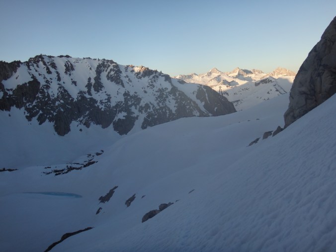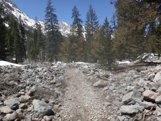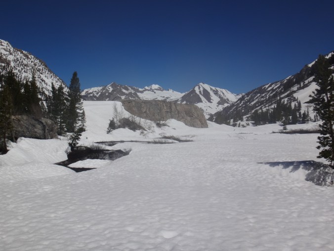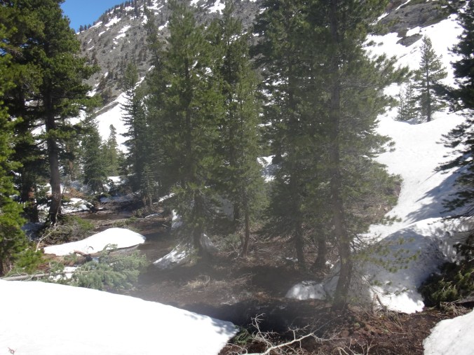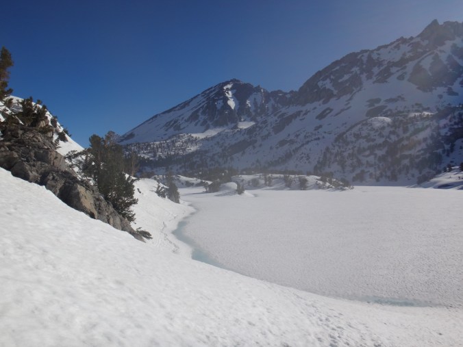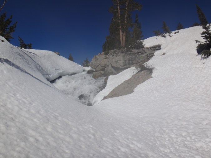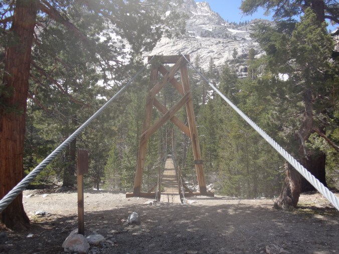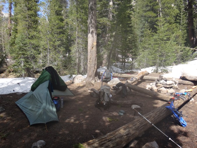 Ich musste heute Nacht so oft aus Klo… Zum Glück war es nicht zu kalt. Die Sterne sehen hier oben so toll aus. Außerdem war es im Schlafsack dieses Mal so wunderbar kuschelig. Doch um 4.15 klingelt der Wecker. Ich will nicht und lieber ein wenig weiter dösen. Nach ca. 15 raschelt es bei Swim so laut dass ich nicht anders kann. Gegen 5.30 laufen wir los. Es sind nur 2.2 km bis zum Glenn Pass und wir arbeiten uns durch bereits vorhandene Tritte den Berg hinauf. Der Rucksack drückt in die Schultern. Wir passieren einen zugefrorenen See und müssen dann steil den Hang hinauf. Meine Nerven sind aufs äußereste angespannt. Es geht nur langsam voran und am Ende liege ich mit dem ganzen Körper am Hang um mich hinauf zu arbeiten bis wir den Gipfel erreichen. Auf der anderen Seite geht es ein noch größeres Schneefeld hinab. Auch hier folgen wir langsam den Spuren bis ins Tal. Das war wirklich ein harter, angsteinflößender Pass. Manchmal wünsch ich mich einfach nur in die Burgenlandstr. 2 OG aber wenn man erstmal hier drin steckt geht man besser weiter. Durch das Tal queren wir viele Seen. Die Ranger Station ist bis zum Dach eingeschneit. Ich bin schon echt erschöpft und es ist erst 8 Uhr morgens. Der Rucksack schmerzt und ich denke die Schweißperlen kommen nicht nur von der Sonnenhitze. Ich laufe einfach hinter Swim her und wir laufen See um See weiter ins Tal. Swims Verse und Knie tuen weh. Je tiefer wir kommen auf desto mehr Wasser treffen wir. Zum Glück bestehen noch alle Schneebrücken. Aber nun kommt das Wasser von allen Seiten ins Tal. Es ist schwierig den Trail zu finden und ihm zu folgen. Man muss viele Umwege gehen und suchen um einen trockenen Weg zu finden. So kommen wir gegen 12 Uhr auf ca. 2600 m am Paradise Valley an. Hier gibt es eine Hängebrücke für den nun reißenden Fluss. Auch viele Zeltplätze und eine Bärbox aus Stahl. Es ist zwar noch früh aber für heute machen wir schluss. Auf dieser Höhenlage sieht es so aus, wie es normalerweise aussehen sollte. Schöner Trail, wenig Schnee. Leider haben viele Bäume den Schnee und Lawinen nicht überlebt ubd zeitweise sieht es auf dem Trail aus wie auf einem Schlachtfeld. Am Camplatz esse ich 2 Wraps mit Wurst und Käse. Dann bauen wir unsere Zelte auf und ich mache ein Nickerchen in meinem Zelt. Die Sonne scheint drauf und ich habs super warm. Man war das schön. Dann gammeln wir den restlichen Tag. Machen Feuer, trinken viel und kochen um 17:00 Uhr zu Abend. Am Feuer schreibe ich den Block und mache mich vor 18 Uhr fertig fürs Bett. Morgen steht der nächste Pass an. Wir müssen wieder 1090 m aufsteigen und ich hoffe wirklich das es weniger scary wird. Das macht mir einfach echt zu schaffen. Wir haben zwar bereits 2 bestritten aber es fehlen immer noch 6 bis nach Mammoth. Und mindestens die nächsten zwei werden nochmal haarig wenn ich mir das höhenprofil anschaue. Wie müssen nun auch durchschnittlich 22 km am Tag laufen um mit dem Essen hin zu kommen. Das wird hart. Naja, ich geh jetzt ins Bett. Die Sonne ist weg und es wird frisch. 😉