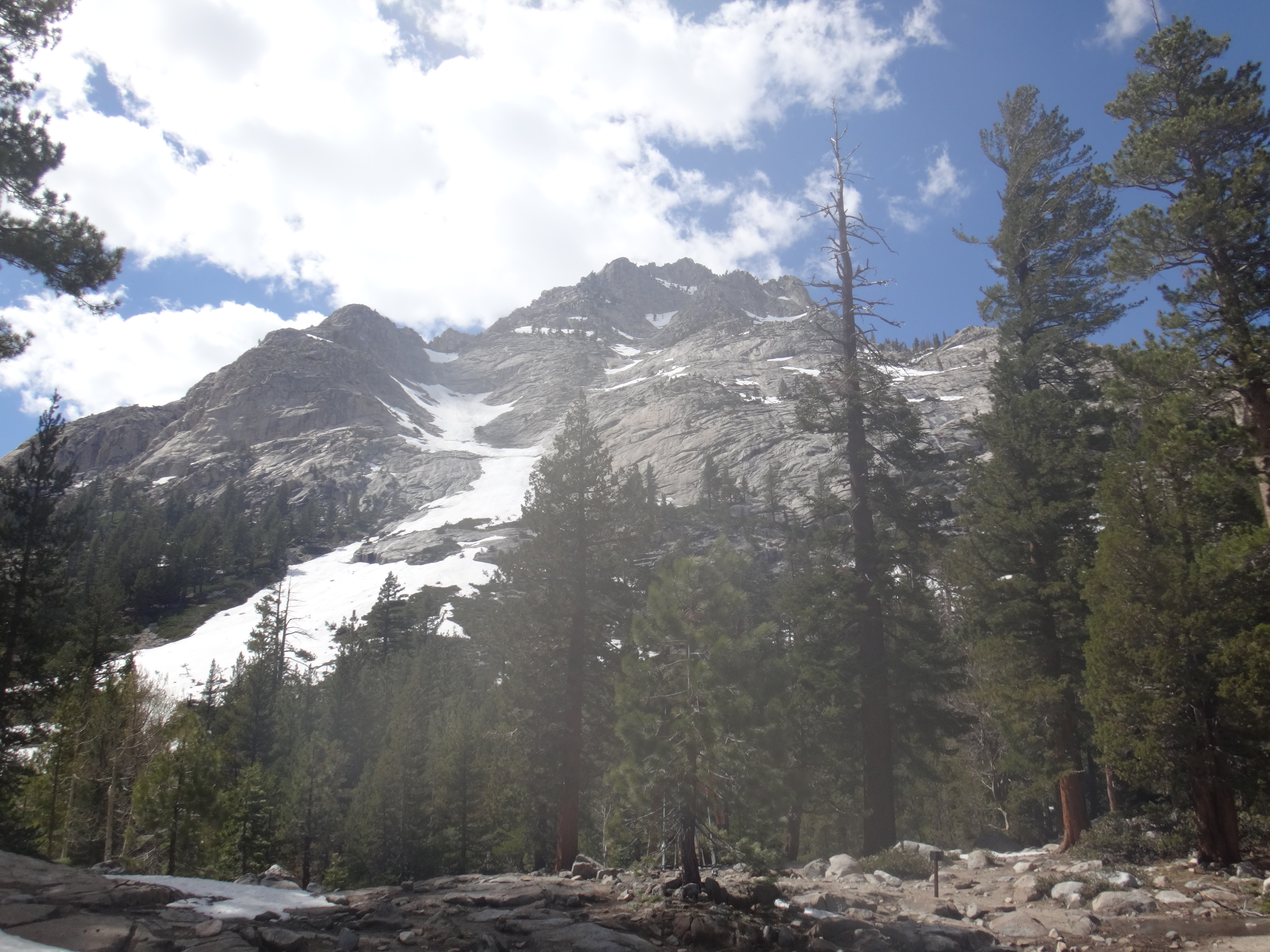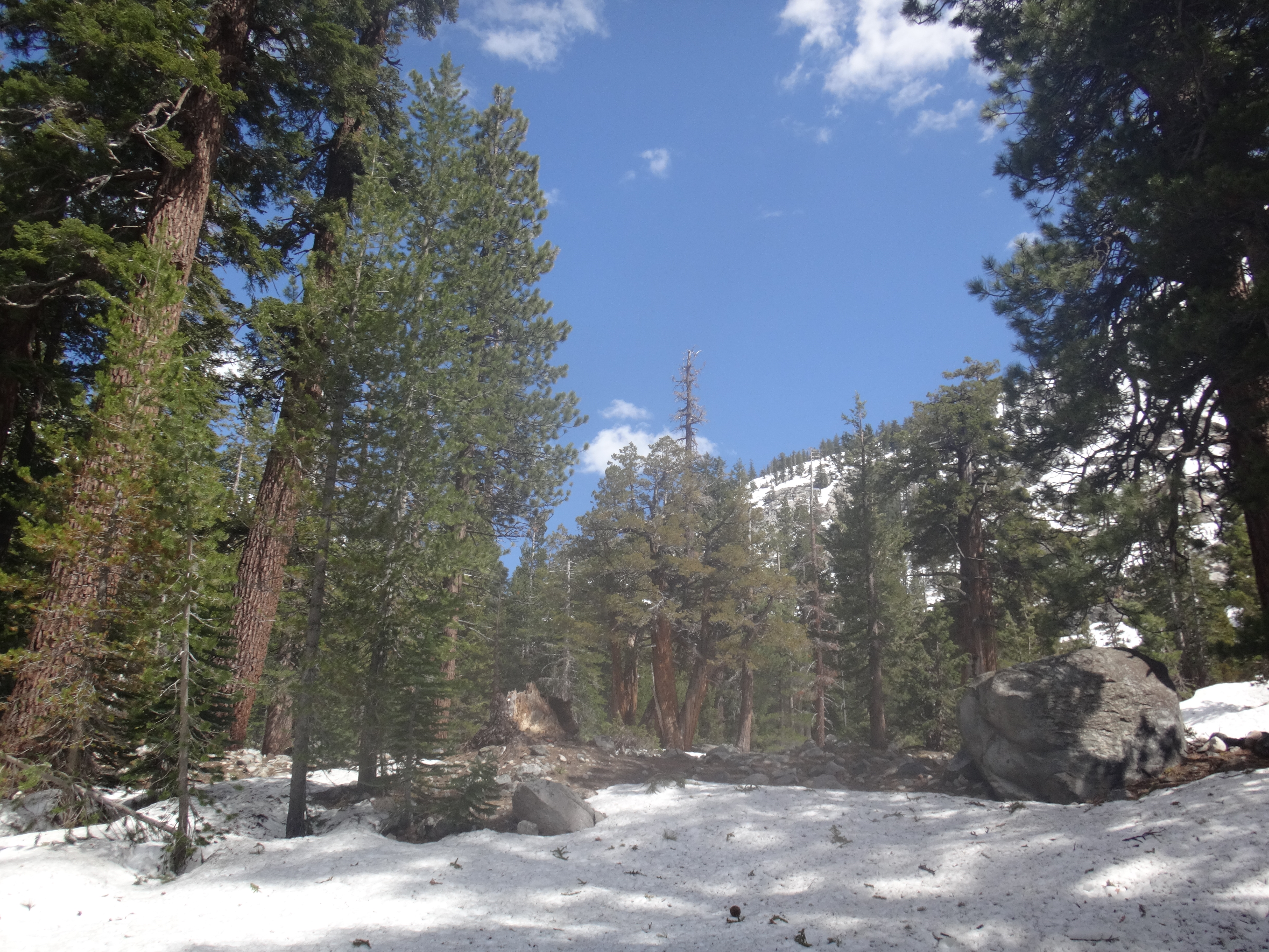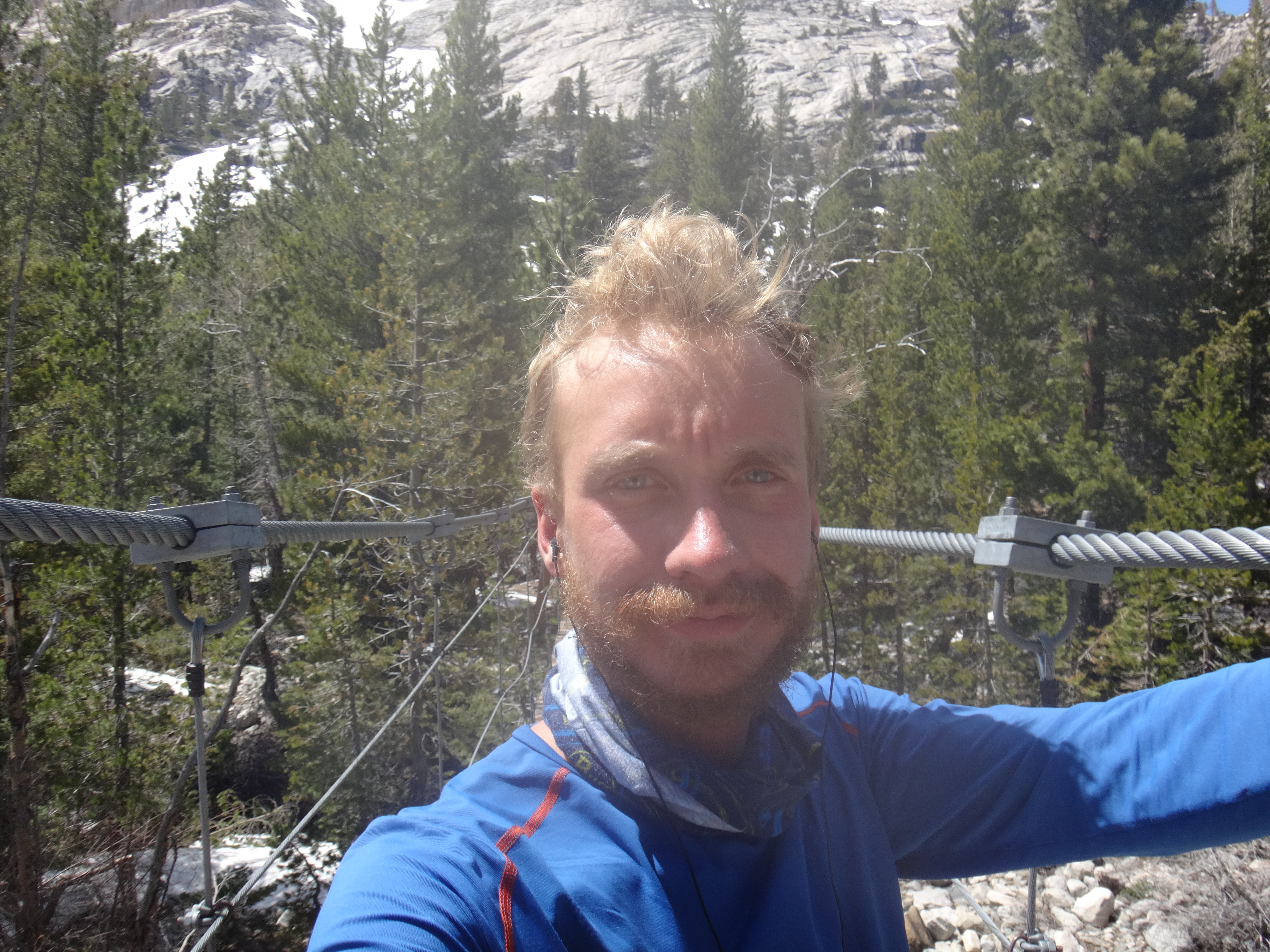 Ich musste heute Nacht so oft aus Klo… Zum Glück war es nicht zu kalt. Die Sterne sehen hier oben so toll aus. Außerdem war es im Schlafsack dieses Mal so wunderbar kuschelig. Doch um 4.15 klingelt der Wecker. Ich will nicht und lieber ein wenig weiter dösen. Nach ca. 15 raschelt es bei Swim so laut dass ich nicht anders kann. Gegen 5.30 laufen wir los. Es sind nur 2.2 km bis zum Glenn Pass und wir arbeiten uns durch bereits vorhandene Tritte den Berg hinauf. Der Rucksack drückt in die Schultern. Wir passieren einen zugefrorenen See und müssen dann steil den Hang hinauf. Meine Nerven sind aufs äußereste angespannt. Es geht nur langsam voran und am Ende liege ich mit dem ganzen Körper am Hang um mich hinauf zu arbeiten bis wir den Gipfel erreichen. Auf der anderen Seite geht es ein noch größeres Schneefeld hinab. Auch hier folgen wir langsam den Spuren bis ins Tal. Das war wirklich ein harter, angsteinflößender Pass. Manchmal wünsch ich mich einfach nur in die Burgenlandstr. 2 OG aber wenn man erstmal hier drin steckt geht man besser weiter. Durch das Tal queren wir viele Seen. Die Ranger Station ist bis zum Dach eingeschneit. Ich bin schon echt erschöpft und es ist erst 8 Uhr morgens. Der Rucksack schmerzt und ich denke die Schweißperlen kommen nicht nur von der Sonnenhitze. Ich laufe einfach hinter Swim her und wir laufen See um See weiter ins Tal. Swims Verse und Knie tuen weh. Je tiefer wir kommen auf desto mehr Wasser treffen wir. Zum Glück bestehen noch alle Schneebrücken. Aber nun kommt das Wasser von allen Seiten ins Tal. Es ist schwierig den Trail zu finden und ihm zu folgen. Man muss viele Umwege gehen und suchen um einen trockenen Weg zu finden. So kommen wir gegen 12 Uhr auf ca. 2600 m am Paradise Valley an. Hier gibt es eine Hängebrücke für den nun reißenden Fluss. Auch viele Zeltplätze und eine Bärbox aus Stahl. Es ist zwar noch früh aber für heute machen wir schluss. Auf dieser Höhenlage sieht es so aus, wie es normalerweise aussehen sollte. Schöner Trail, wenig Schnee. Leider haben viele Bäume den Schnee und Lawinen nicht überlebt ubd zeitweise sieht es auf dem Trail aus wie auf einem Schlachtfeld. Am Camplatz esse ich 2 Wraps mit Wurst und Käse. Dann bauen wir unsere Zelte auf und ich mache ein Nickerchen in meinem Zelt. Die Sonne scheint drauf und ich habs super warm. Man war das schön. Dann gammeln wir den restlichen Tag. Machen Feuer, trinken viel und kochen um 17:00 Uhr zu Abend. Am Feuer schreibe ich den Block und mache mich vor 18 Uhr fertig fürs Bett. Morgen steht der nächste Pass an. Wir müssen wieder 1090 m aufsteigen und ich hoffe wirklich das es weniger scary wird. Das macht mir einfach echt zu schaffen. Wir haben zwar bereits 2 bestritten aber es fehlen immer noch 6 bis nach Mammoth. Und mindestens die nächsten zwei werden nochmal haarig wenn ich mir das höhenprofil anschaue. Wie müssen nun auch durchschnittlich 22 km am Tag laufen um mit dem Essen hin zu kommen. Das wird hart. Naja, ich geh jetzt ins Bett. Die Sonne ist weg und es wird frisch. 😉