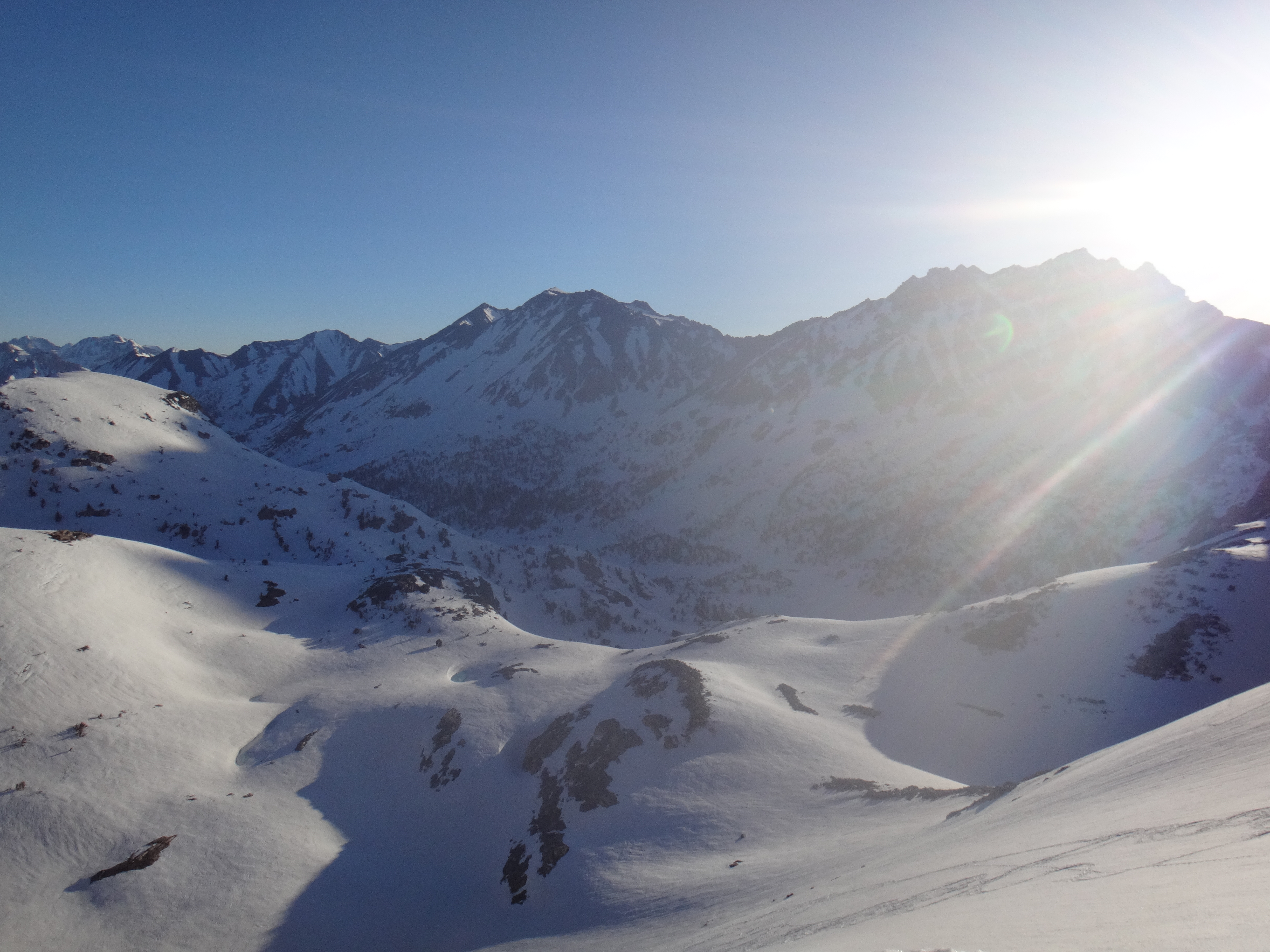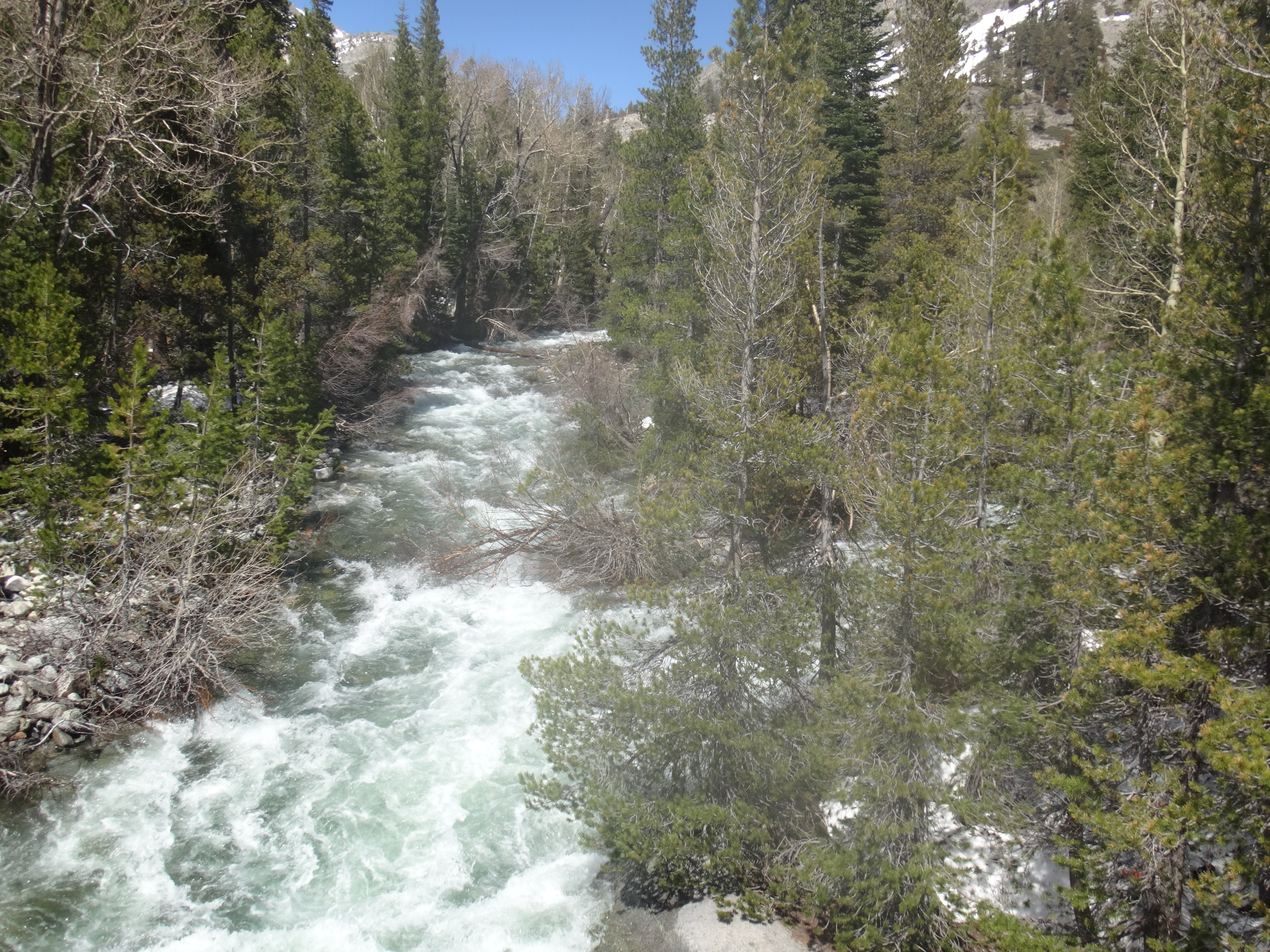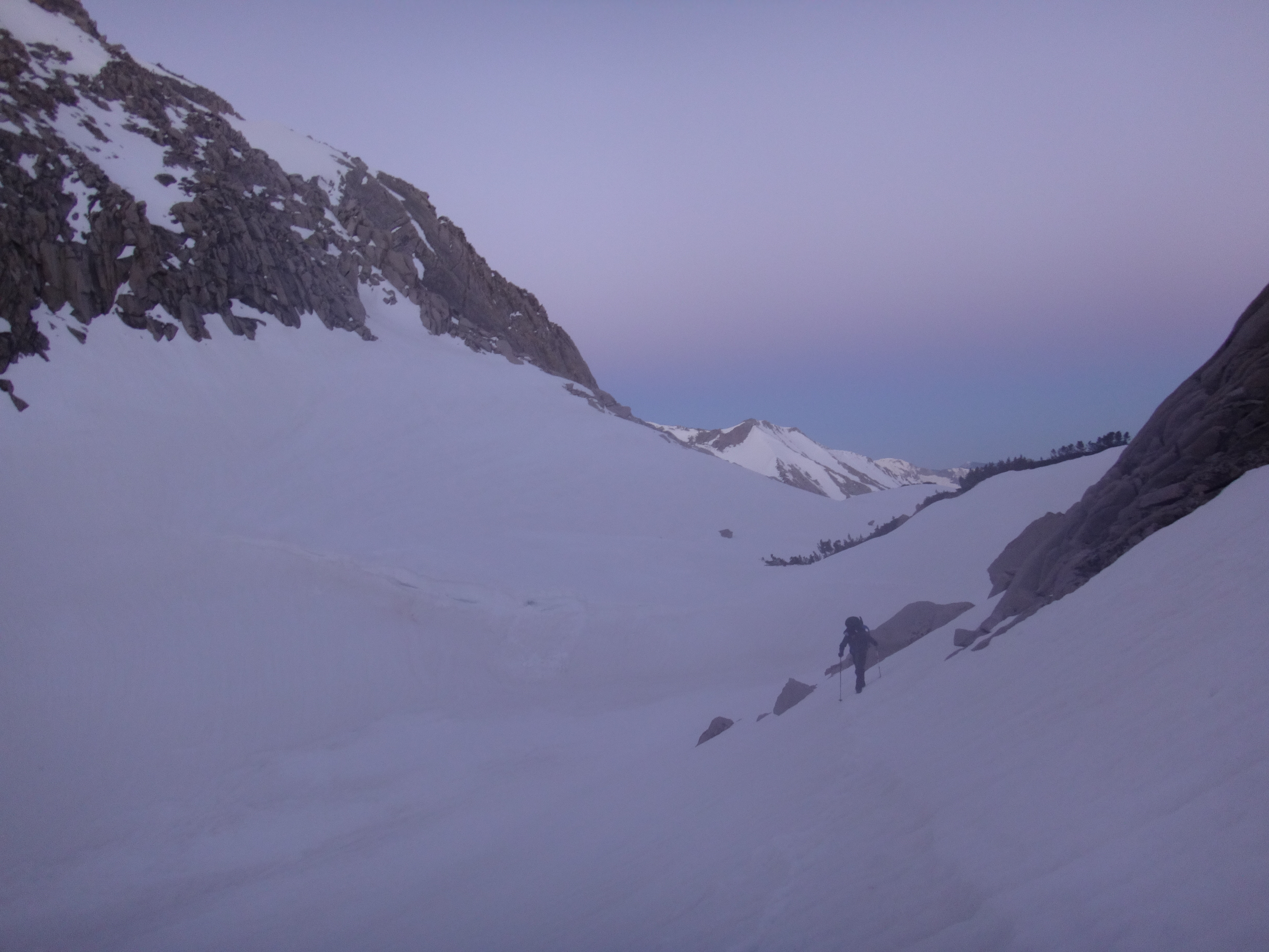 Ich musste heute Nacht so oft aus Klo… Zum Glück war es nicht zu kalt. Die Sterne sehen hier oben so toll aus. Außerdem war es im Schlafsack dieses Mal so wunderbar kuschelig. Doch um 4.15 klingelt der Wecker. Ich will nicht und lieber ein wenig weiter dösen. Nach ca. 15 raschelt es bei Swim so laut dass ich nicht anders kann. Gegen 5.30 laufen wir los. Es sind nur 2.2 km bis zum Glenn Pass und wir arbeiten uns durch bereits vorhandene Tritte den Berg hinauf. Der Rucksack drückt in die Schultern. Wir passieren einen zugefrorenen See und müssen dann steil den Hang hinauf. Meine Nerven sind aufs äußereste angespannt. Es geht nur langsam voran und am Ende liege ich mit dem ganzen Körper am Hang um mich hinauf zu arbeiten bis wir den Gipfel erreichen. Auf der anderen Seite geht es ein noch größeres Schneefeld hinab. Auch hier folgen wir langsam den Spuren bis ins Tal. Das war wirklich ein harter, angsteinflößender Pass. Manchmal wünsch ich mich einfach nur in die Burgenlandstr. 2 OG aber wenn man erstmal hier drin steckt geht man besser weiter. Durch das Tal queren wir viele Seen. Die Ranger Station ist bis zum Dach eingeschneit. Ich bin schon echt erschöpft und es ist erst 8 Uhr morgens. Der Rucksack schmerzt und ich denke die Schweißperlen kommen nicht nur von der Sonnenhitze. Ich laufe einfach hinter Swim her und wir laufen See um See weiter ins Tal. Swims Verse und Knie tuen weh. Je tiefer wir kommen auf desto mehr Wasser treffen wir. Zum Glück bestehen noch alle Schneebrücken. Aber nun kommt das Wasser von allen Seiten ins Tal. Es ist schwierig den Trail zu finden und ihm zu folgen. Man muss viele Umwege gehen und suchen um einen trockenen Weg zu finden. So kommen wir gegen 12 Uhr auf ca. 2600 m am Paradise Valley an. Hier gibt es eine Hängebrücke für den nun reißenden Fluss. Auch viele Zeltplätze und eine Bärbox aus Stahl. Es ist zwar noch früh aber für heute machen wir schluss. Auf dieser Höhenlage sieht es so aus, wie es normalerweise aussehen sollte. Schöner Trail, wenig Schnee. Leider haben viele Bäume den Schnee und Lawinen nicht überlebt ubd zeitweise sieht es auf dem Trail aus wie auf einem Schlachtfeld. Am Camplatz esse ich 2 Wraps mit Wurst und Käse. Dann bauen wir unsere Zelte auf und ich mache ein Nickerchen in meinem Zelt. Die Sonne scheint drauf und ich habs super warm. Man war das schön. Dann gammeln wir den restlichen Tag. Machen Feuer, trinken viel und kochen um 17:00 Uhr zu Abend. Am Feuer schreibe ich den Block und mache mich vor 18 Uhr fertig fürs Bett. Morgen steht der nächste Pass an. Wir müssen wieder 1090 m aufsteigen und ich hoffe wirklich das es weniger scary wird. Das macht mir einfach echt zu schaffen. Wir haben zwar bereits 2 bestritten aber es fehlen immer noch 6 bis nach Mammoth. Und mindestens die nächsten zwei werden nochmal haarig wenn ich mir das höhenprofil anschaue. Wie müssen nun auch durchschnittlich 22 km am Tag laufen um mit dem Essen hin zu kommen. Das wird hart. Naja, ich geh jetzt ins Bett. Die Sonne ist weg und es wird frisch. 😉