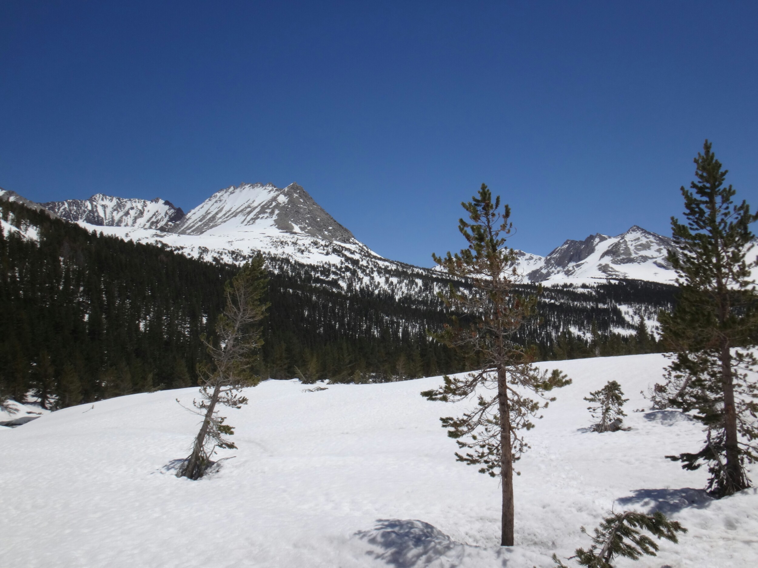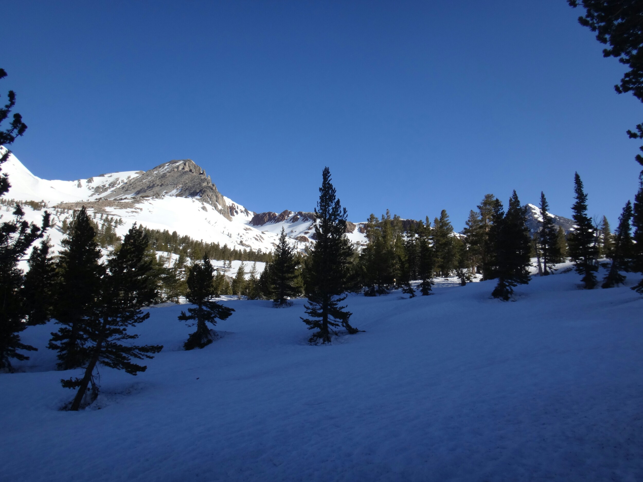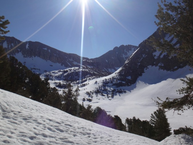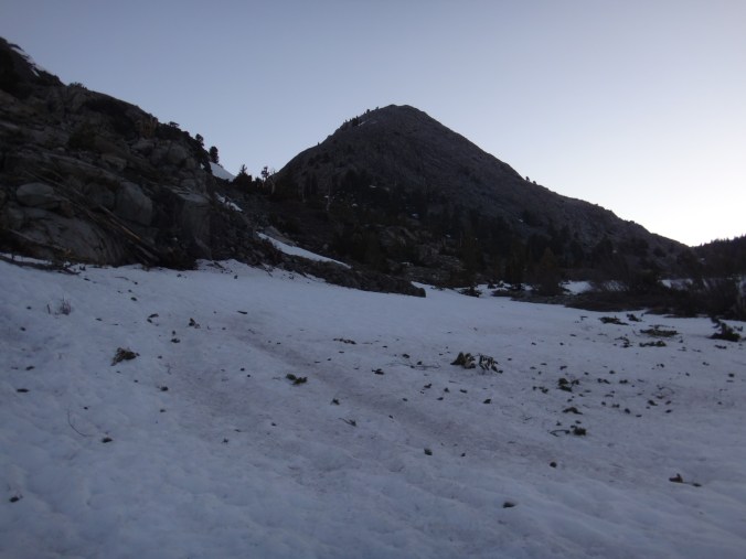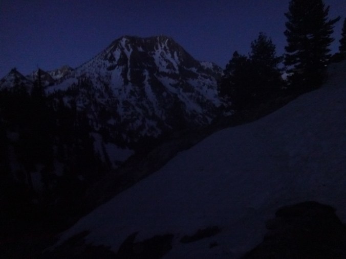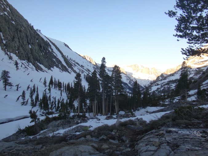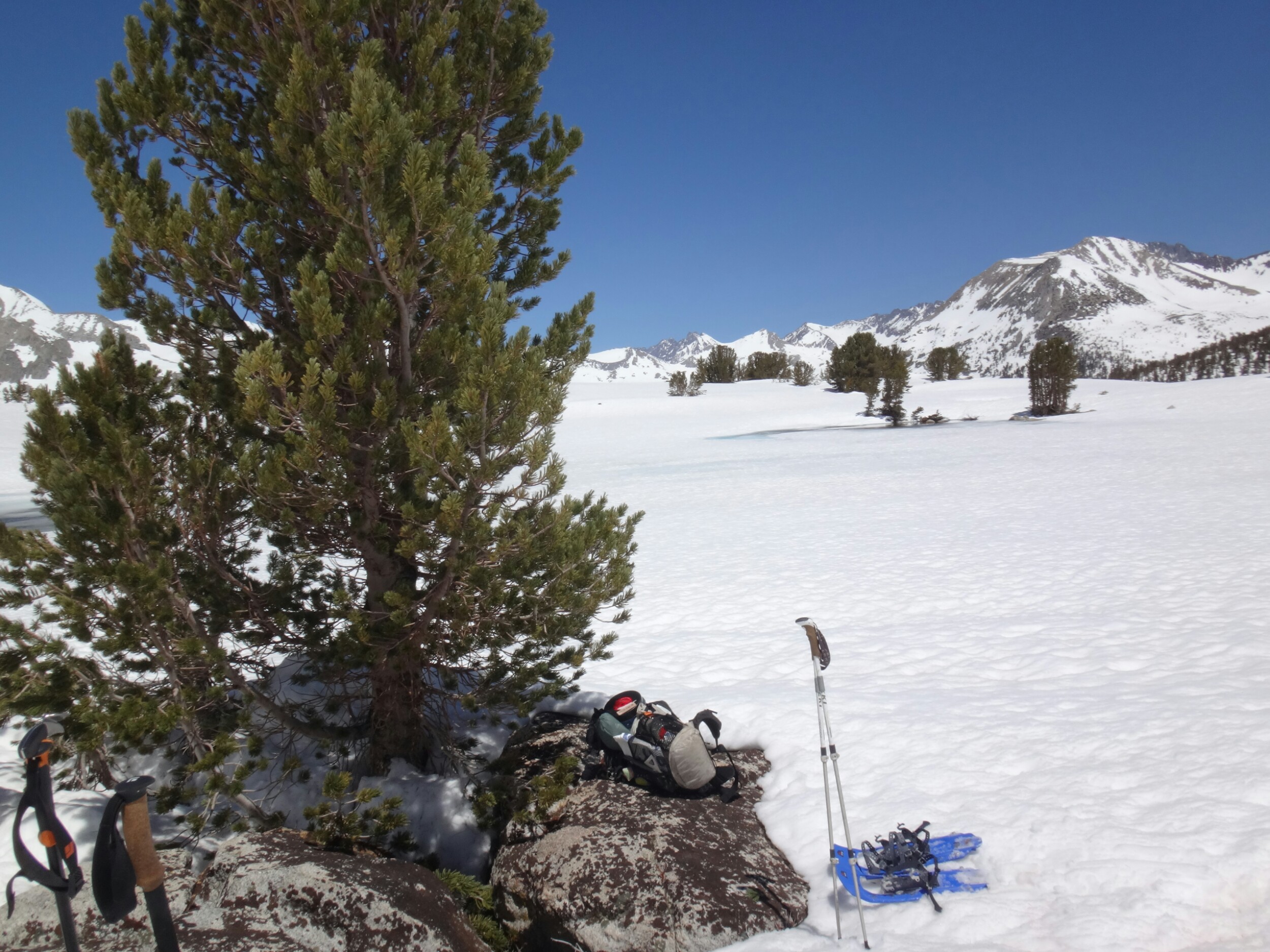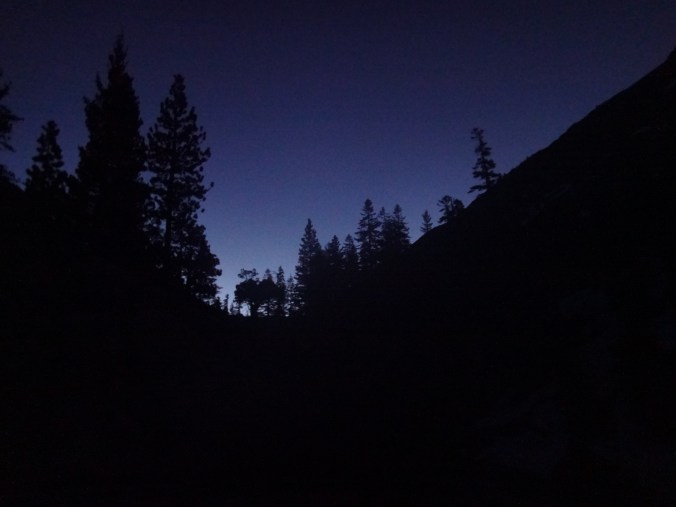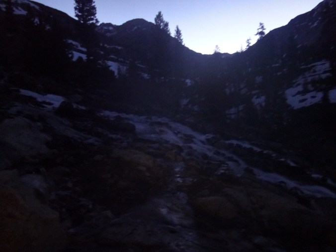 Um 3.15 klingelt der Wecker und als ich Swim höre mache ich mich vorbildhaft aus dem Zelt. Es ist gefühlt arsch kalt. Zwar 3 Grad gefühlt aber weniger. Bis 4 haben wir alles beisammen und können abreisen. Im dunkel der Nacht überqueren wir die Hängebrücke und machen und an den Anstieg Richtung Pinchot Pass. Der Wald vor uns ist ziemlich hinüber und auf dem Trail fließt überall Wasser. Wir hüpfen von Stein zu Stein und versuchen nicht nass zu werden. Swim verdreht sich den Knöchel und ab da an schleichen wir den Berg hoch. 1km pro Stunde. Vom Trail wollen wir auch am Sawmill Pass. Nichts da bis Mammoth. Wenn einer nicht mehr kann müssen beide dran glauben. Nach gestern muss ich gestehen bin ich jetzt zwiegespalten. Einerseits kann ich wieder mit meiner Freundin sprechen und viele Annehmlichkeiten der Tivilisation genießen. Andererseits ist Swim verletzt was ohnehin scheisse ist. Aber wer will schon am Sawmill Pass den wahrscheinlich noch keiner gegangen ist wieder auf den Trail. 20 km extra. Ich laufe nun voraus. Überwinde den Trail. Meine Gedanken schwirren davon. Wenn ich jetzt vom Trail muss komme ich für die Sierras definitiv später wieder. Ich habe genug von dem ganzen Schnee. Kalt, früh aufstehen, Sonne, matschiger Schnee, waghalsige Kletterein. Andererseits will ich aber mindestes bis zum Bishop Pass. Das ist ein Ort wo viele einsteigen. Am besten jedoch bis nach Mammoth. Mal schauen was Heute bringt. Wir laufen entlang vom Woods Creek. Der ist außer Kontrolle und veranstaltet einen riesen Lärm. Wie suchen nun ab und zu den Trail da mit steigenden Höhenmetern der Schnee wiederkommt. Leider muss ich an einem Fluss stehen bleiben. Er fließt so hoch dass ein überspringen auf Steinen nicht möglich ist. Wir ziehen unsere Sandalen an und steigen in das eidkalte Nass. Brrrr. Die Füße brennen. Keiner will so etwas wenn einem der arsch sowieso schon blau wird weils so kalt ist. Wir trocknen unsere Füße und gehen wieder in unsere Schuhe. Schon nach 10 min der nächste unüberwindbare Fluss. Ohh man. Als ich wieder in meinen Schuhen bin kann ich meine Zehen nur noch schwer spüren. Es ist jetzt 5.30 und wir haben gerade 1.6km geschafft. Wir sind super super langsam. Wir arbeiten uns langsam weiter hinauf. An einer Stelle müssen wir ein pasr Serpentinen hoch die noch zu sehen sind. Dann gibt es wieder nur noch Schnee und wir arbeiten uns vorsichtig über das schneefeld. Unter uns der Woods Creek. Über eine große freie Fläche laufen wir noch bis zu einem Wäldchen und machen auf einem Stein Pause. Es kommen drei Rehe hinter uns aus dem Wald. Swim geht es wieder besser. Er läuft weiter. 🙂 ich bin froh und dankbar für die chance zunindest bis zum Bishop Pass zu laufen. Wir steigen durch den Wald auf. Ich verlaufe mich ein wenig und wir müssen ein paar Meter extra den Berg hinauf bis wir gefühlt in einem neuen Tal stehen. Dieses ist viel weitsichtiger und offener. Nur vereinzelt stehen kleine Grüppchen aus Bäumen. Rechts und links tolle Bergflanken. Wir laufen weiter und kommen in die ersten Sonnenstrahlen. Zwangspause und erstmal ein paar Kleidungsschichten runter. Die Sonne bruzel sofort wie eh und je. Wir stapfen schweißtreiben weiter hinauf. Der Tag ist nach heute morgen richtig toll geworden. Sonnencreme nicht vergessen denn das ist echt gefährlich. Swim hat sogar Blasen auf den Beinen bekommen als er kurz 4 Stunden in Boxershort gewandert ist. Naja, er war auch nicht gerade vorgebräunt. Wir machen einen schwenker nach links und sehen den Glenn Pass. Wir schlüpfen nun in unsere Schneeschuhe da es damit besser geht. Endlich brauchen wir die auch mal. Wir können bis kurz unter den Pass laufen. Dann in die Spikes und langsam dem einzigen paar Fußspuren folgen. Es ist nicht so tief und wir fühlen uns besser. Dennoch bin ich voll konzentriert und mache keinen unüberlegten Schritt. Wir kommen so wieder nur langsam voran und benötigen für ca. 50m 20 min. Dann stehen wir oben. Das nächste Tal sieht super aus. Schön flach mit vielen Seen. Nach dem Abstieg schlüpfen wir wieder in die Schneeschuhe. An einem See mit ein paar trocknen Steinen machen wir gegen 12 Uhr Mittag. Von nun an geht es durch einen Wald steil hinab. Wie folgen den Spuren zweier anderer Schneeschuhe. Wahrscheinlich Arrow und Navigator. Im Tal queren wir zum Glück auf einer Schneebrücke einen reißenden Fluss. Und dann natürlich durchs Wäldchen wieder hinauf. Wir sind ganz schön platt und finden auf der linken seite einen schönen Lagerplatz. Ein Feuer wurde hier bereits gemacht. Auch sind Plattformen für Zelte ausgehoben. Super, dann müssen wir die Arbeit nicht mehr machen. Mein Zelt passt leider nicht und ich baue es schrägt über einem Tannenzweiglager auf. Naja, es steht zumindest. Am Feuer trocknen wir die Sachen und kochen. Bereits um 16 Uhr sind wir mit Abendessen fertig. Leider haben wir nun kein Wasser mehr. Der Fluss nebenan fließt zwar gut aber wenn man 2 Meter hohe schneekanten überwinden muss wird es schwierig. Haben alles probiert mit Seil um Flasche oder Becher. Wir haben dann über dem Feuer Schnee geschmolzen. Sehr mühsam und ich habe mich verbrannt. Ich habe alles unter mein Zelt gestopf und hoffe es hält. Bisl abschüssig. Morgen geht’s um 3 los. 7 km bis zum Mather Pass. Wenn der gefallen ist bin ich beruhigt. Scheint eine einzige steile Schneewand zu sein. Hoffentlich hat schon wer erfolgreich ein paar tritte installiert.