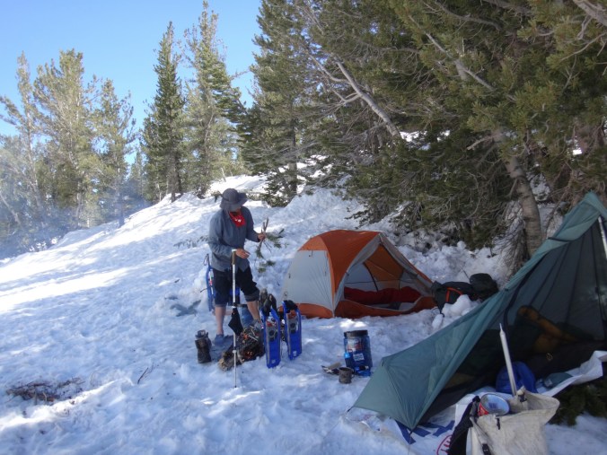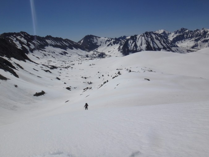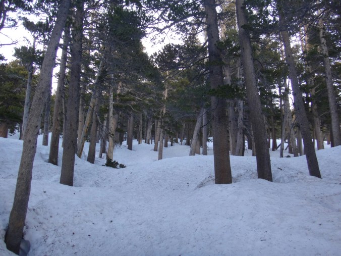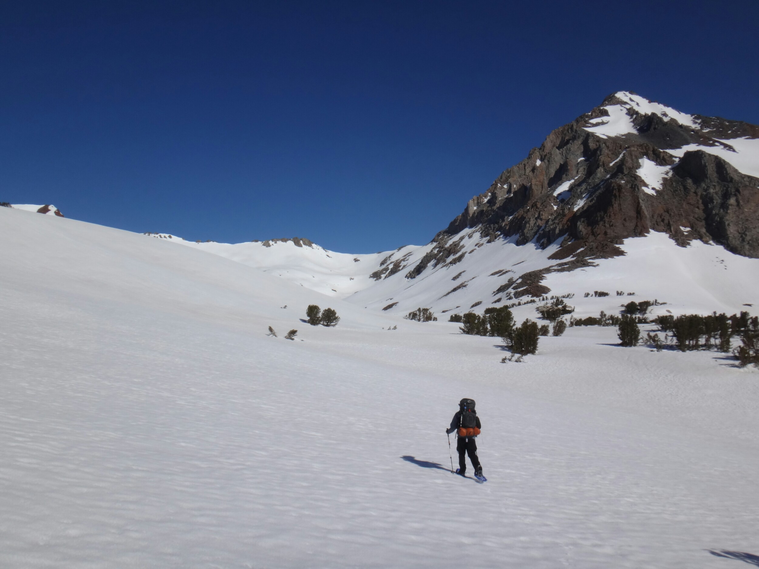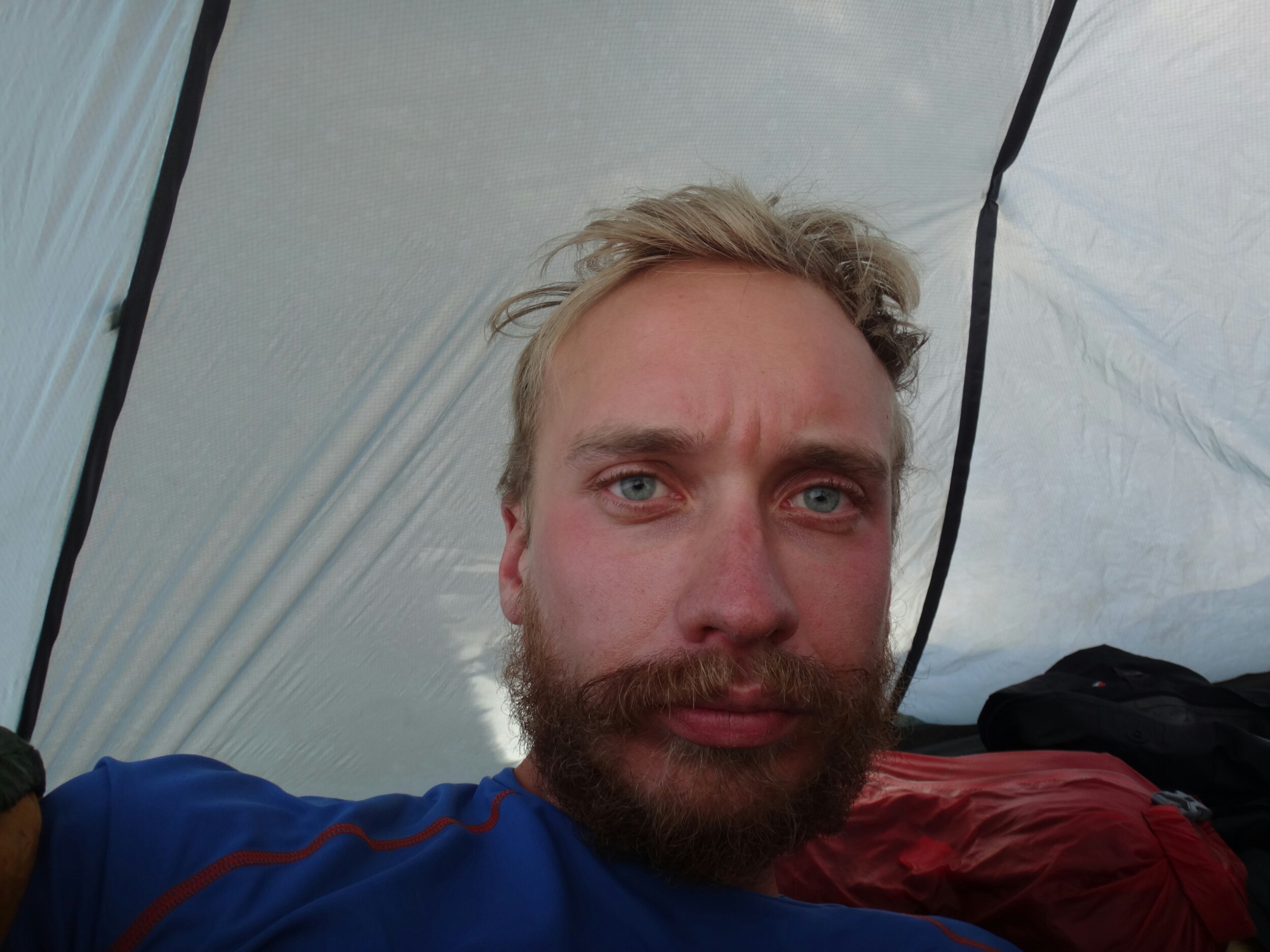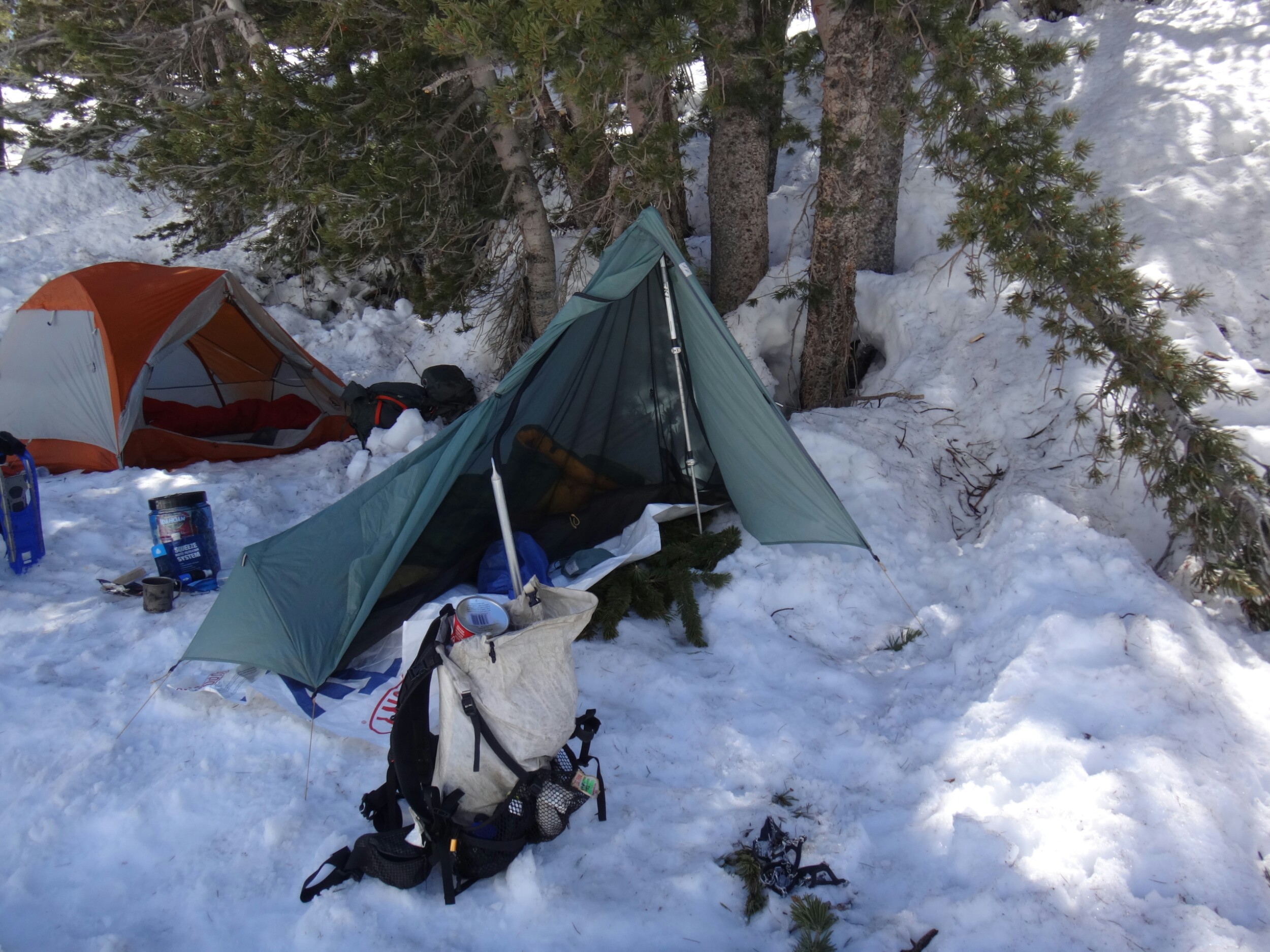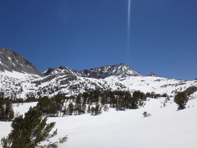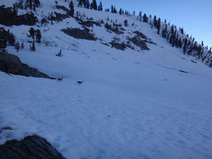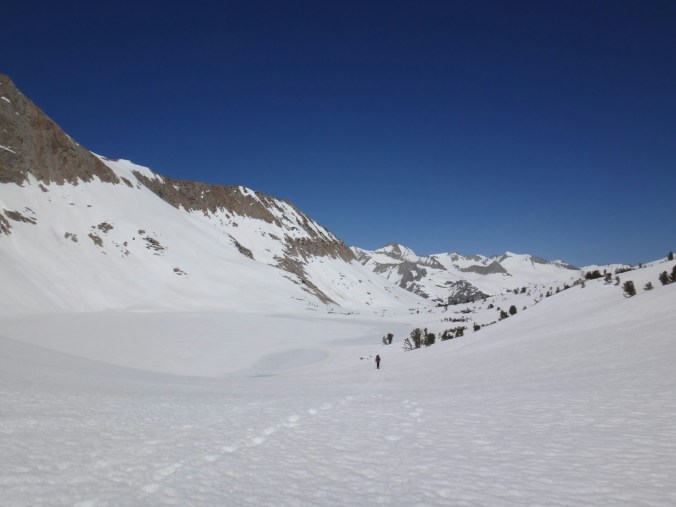 Um 3.15 klingelt der Wecker und als ich Swim höre mache ich mich vorbildhaft aus dem Zelt. Es ist gefühlt arsch kalt. Zwar 3 Grad gefühlt aber weniger. Bis 4 haben wir alles beisammen und können abreisen. Im dunkel der Nacht überqueren wir die Hängebrücke und machen und an den Anstieg Richtung Pinchot Pass. Der Wald vor uns ist ziemlich hinüber und auf dem Trail fließt überall Wasser. Wir hüpfen von Stein zu Stein und versuchen nicht nass zu werden. Swim verdreht sich den Knöchel und ab da an schleichen wir den Berg hoch. 1km pro Stunde. Vom Trail wollen wir auch am Sawmill Pass. Nichts da bis Mammoth. Wenn einer nicht mehr kann müssen beide dran glauben. Nach gestern muss ich gestehen bin ich jetzt zwiegespalten. Einerseits kann ich wieder mit meiner Freundin sprechen und viele Annehmlichkeiten der Tivilisation genießen. Andererseits ist Swim verletzt was ohnehin scheisse ist. Aber wer will schon am Sawmill Pass den wahrscheinlich noch keiner gegangen ist wieder auf den Trail. 20 km extra. Ich laufe nun voraus. Überwinde den Trail. Meine Gedanken schwirren davon. Wenn ich jetzt vom Trail muss komme ich für die Sierras definitiv später wieder. Ich habe genug von dem ganzen Schnee. Kalt, früh aufstehen, Sonne, matschiger Schnee, waghalsige Kletterein. Andererseits will ich aber mindestes bis zum Bishop Pass. Das ist ein Ort wo viele einsteigen. Am besten jedoch bis nach Mammoth. Mal schauen was Heute bringt. Wir laufen entlang vom Woods Creek. Der ist außer Kontrolle und veranstaltet einen riesen Lärm. Wie suchen nun ab und zu den Trail da mit steigenden Höhenmetern der Schnee wiederkommt. Leider muss ich an einem Fluss stehen bleiben. Er fließt so hoch dass ein überspringen auf Steinen nicht möglich ist. Wir ziehen unsere Sandalen an und steigen in das eidkalte Nass. Brrrr. Die Füße brennen. Keiner will so etwas wenn einem der arsch sowieso schon blau wird weils so kalt ist. Wir trocknen unsere Füße und gehen wieder in unsere Schuhe. Schon nach 10 min der nächste unüberwindbare Fluss. Ohh man. Als ich wieder in meinen Schuhen bin kann ich meine Zehen nur noch schwer spüren. Es ist jetzt 5.30 und wir haben gerade 1.6km geschafft. Wir sind super super langsam. Wir arbeiten uns langsam weiter hinauf. An einer Stelle müssen wir ein pasr Serpentinen hoch die noch zu sehen sind. Dann gibt es wieder nur noch Schnee und wir arbeiten uns vorsichtig über das schneefeld. Unter uns der Woods Creek. Über eine große freie Fläche laufen wir noch bis zu einem Wäldchen und machen auf einem Stein Pause. Es kommen drei Rehe hinter uns aus dem Wald. Swim geht es wieder besser. Er läuft weiter. 🙂 ich bin froh und dankbar für die chance zunindest bis zum Bishop Pass zu laufen. Wir steigen durch den Wald auf. Ich verlaufe mich ein wenig und wir müssen ein paar Meter extra den Berg hinauf bis wir gefühlt in einem neuen Tal stehen. Dieses ist viel weitsichtiger und offener. Nur vereinzelt stehen kleine Grüppchen aus Bäumen. Rechts und links tolle Bergflanken. Wir laufen weiter und kommen in die ersten Sonnenstrahlen. Zwangspause und erstmal ein paar Kleidungsschichten runter. Die Sonne bruzel sofort wie eh und je. Wir stapfen schweißtreiben weiter hinauf. Der Tag ist nach heute morgen richtig toll geworden. Sonnencreme nicht vergessen denn das ist echt gefährlich. Swim hat sogar Blasen auf den Beinen bekommen als er kurz 4 Stunden in Boxershort gewandert ist. Naja, er war auch nicht gerade vorgebräunt. Wir machen einen schwenker nach links und sehen den Glenn Pass. Wir schlüpfen nun in unsere Schneeschuhe da es damit besser geht. Endlich brauchen wir die auch mal. Wir können bis kurz unter den Pass laufen. Dann in die Spikes und langsam dem einzigen paar Fußspuren folgen. Es ist nicht so tief und wir fühlen uns besser. Dennoch bin ich voll konzentriert und mache keinen unüberlegten Schritt. Wir kommen so wieder nur langsam voran und benötigen für ca. 50m 20 min. Dann stehen wir oben. Das nächste Tal sieht super aus. Schön flach mit vielen Seen. Nach dem Abstieg schlüpfen wir wieder in die Schneeschuhe. An einem See mit ein paar trocknen Steinen machen wir gegen 12 Uhr Mittag. Von nun an geht es durch einen Wald steil hinab. Wie folgen den Spuren zweier anderer Schneeschuhe. Wahrscheinlich Arrow und Navigator. Im Tal queren wir zum Glück auf einer Schneebrücke einen reißenden Fluss. Und dann natürlich durchs Wäldchen wieder hinauf. Wir sind ganz schön platt und finden auf der linken seite einen schönen Lagerplatz. Ein Feuer wurde hier bereits gemacht. Auch sind Plattformen für Zelte ausgehoben. Super, dann müssen wir die Arbeit nicht mehr machen. Mein Zelt passt leider nicht und ich baue es schrägt über einem Tannenzweiglager auf. Naja, es steht zumindest. Am Feuer trocknen wir die Sachen und kochen. Bereits um 16 Uhr sind wir mit Abendessen fertig. Leider haben wir nun kein Wasser mehr. Der Fluss nebenan fließt zwar gut aber wenn man 2 Meter hohe schneekanten überwinden muss wird es schwierig. Haben alles probiert mit Seil um Flasche oder Becher. Wir haben dann über dem Feuer Schnee geschmolzen. Sehr mühsam und ich habe mich verbrannt. Ich habe alles unter mein Zelt gestopf und hoffe es hält. Bisl abschüssig. Morgen geht’s um 3 los. 7 km bis zum Mather Pass. Wenn der gefallen ist bin ich beruhigt. Scheint eine einzige steile Schneewand zu sein. Hoffentlich hat schon wer erfolgreich ein paar tritte installiert.