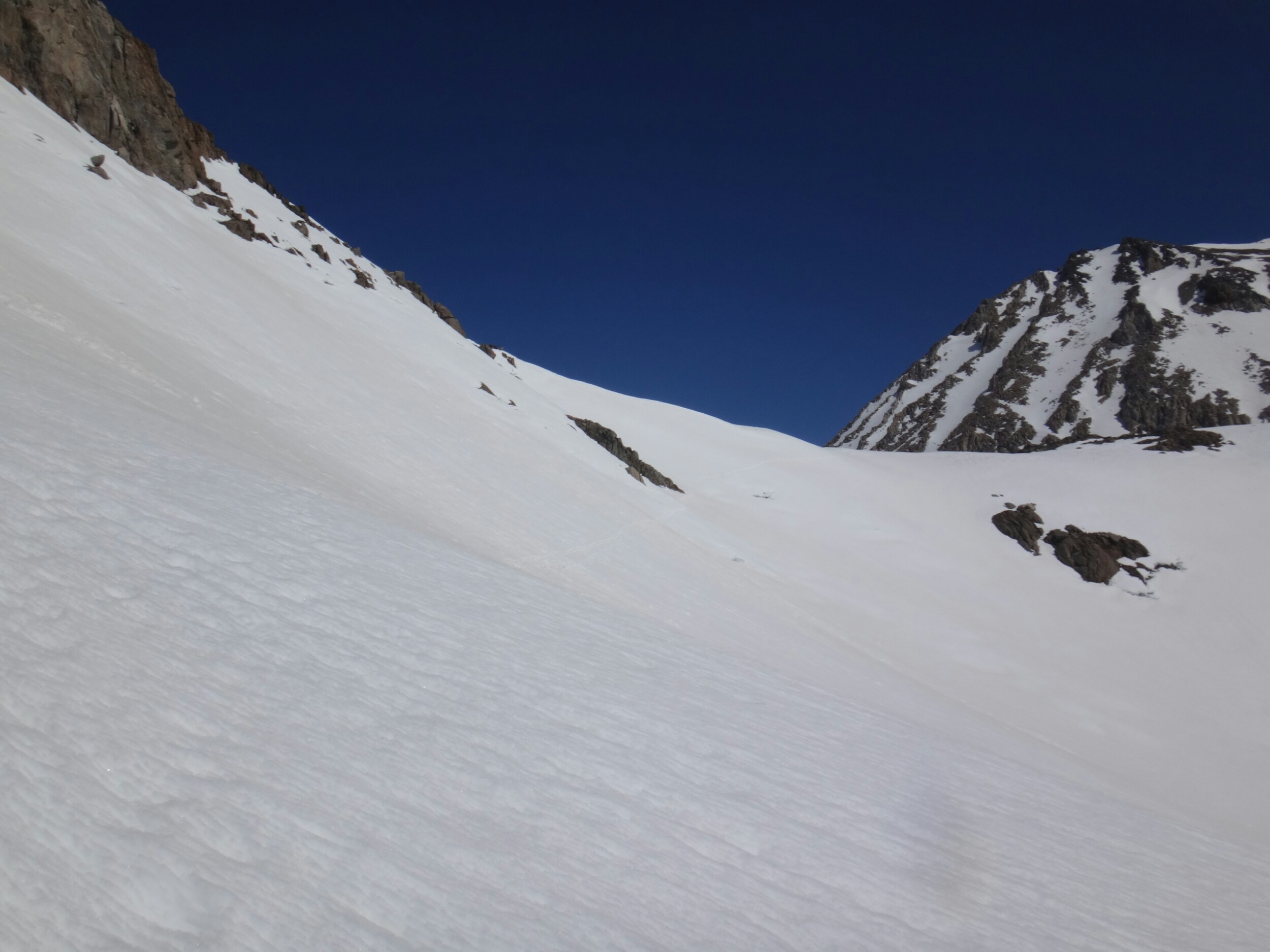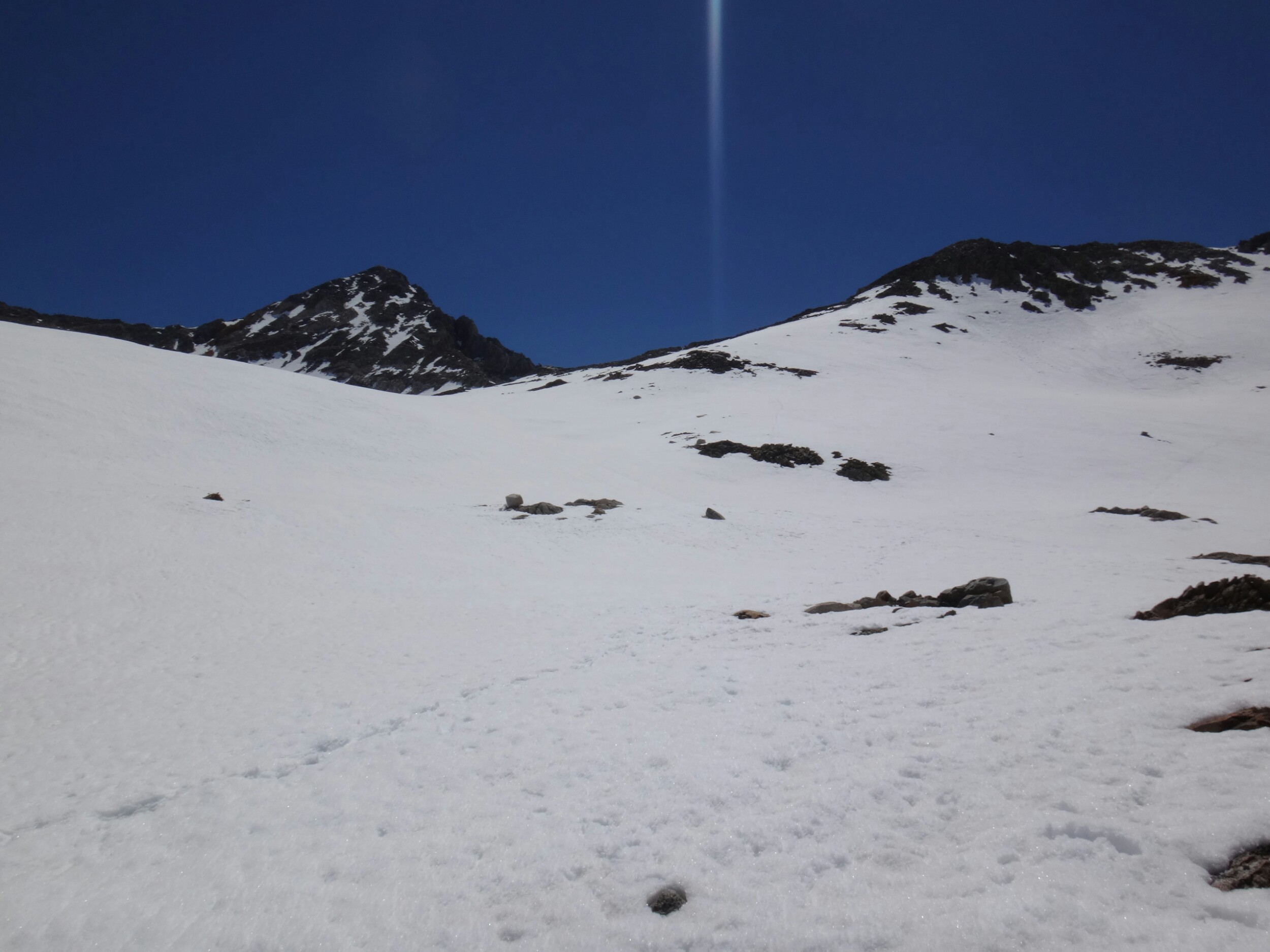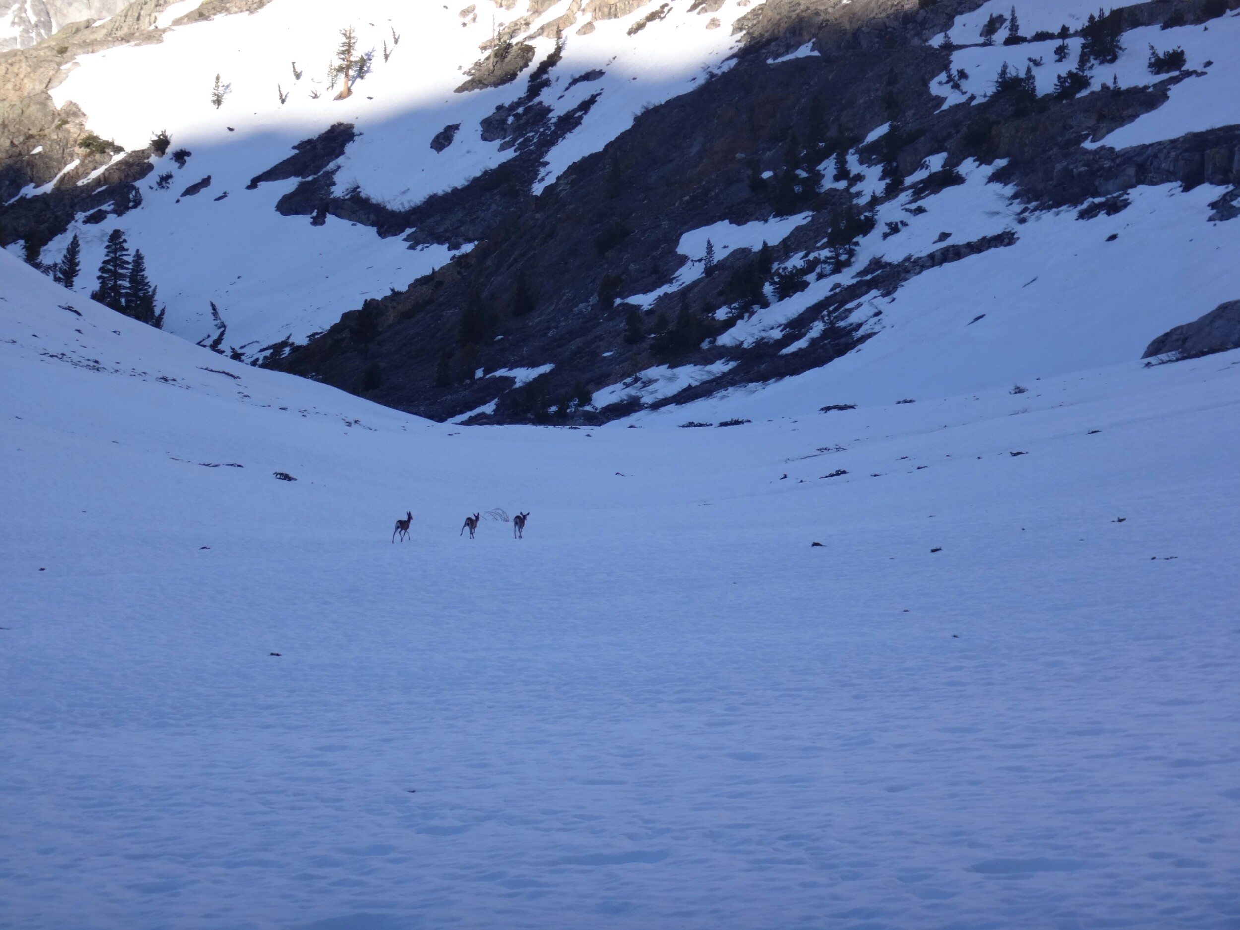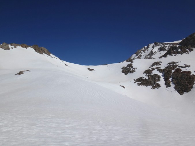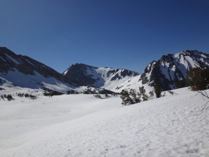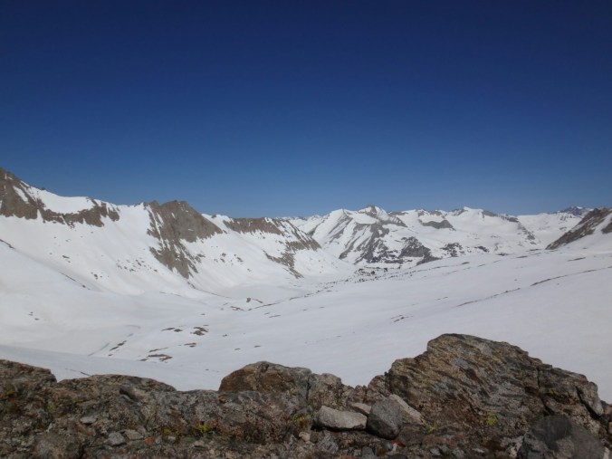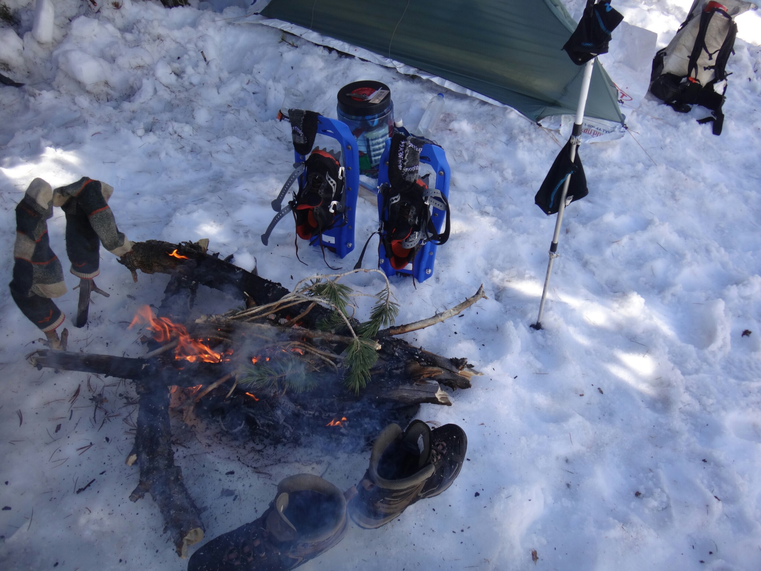 Um 3.15 klingelt der Wecker und als ich Swim höre mache ich mich vorbildhaft aus dem Zelt. Es ist gefühlt arsch kalt. Zwar 3 Grad gefühlt aber weniger. Bis 4 haben wir alles beisammen und können abreisen. Im dunkel der Nacht überqueren wir die Hängebrücke und machen und an den Anstieg Richtung Pinchot Pass. Der Wald vor uns ist ziemlich hinüber und auf dem Trail fließt überall Wasser. Wir hüpfen von Stein zu Stein und versuchen nicht nass zu werden. Swim verdreht sich den Knöchel und ab da an schleichen wir den Berg hoch. 1km pro Stunde. Vom Trail wollen wir auch am Sawmill Pass. Nichts da bis Mammoth. Wenn einer nicht mehr kann müssen beide dran glauben. Nach gestern muss ich gestehen bin ich jetzt zwiegespalten. Einerseits kann ich wieder mit meiner Freundin sprechen und viele Annehmlichkeiten der Tivilisation genießen. Andererseits ist Swim verletzt was ohnehin scheisse ist. Aber wer will schon am Sawmill Pass den wahrscheinlich noch keiner gegangen ist wieder auf den Trail. 20 km extra. Ich laufe nun voraus. Überwinde den Trail. Meine Gedanken schwirren davon. Wenn ich jetzt vom Trail muss komme ich für die Sierras definitiv später wieder. Ich habe genug von dem ganzen Schnee. Kalt, früh aufstehen, Sonne, matschiger Schnee, waghalsige Kletterein. Andererseits will ich aber mindestes bis zum Bishop Pass. Das ist ein Ort wo viele einsteigen. Am besten jedoch bis nach Mammoth. Mal schauen was Heute bringt. Wir laufen entlang vom Woods Creek. Der ist außer Kontrolle und veranstaltet einen riesen Lärm. Wie suchen nun ab und zu den Trail da mit steigenden Höhenmetern der Schnee wiederkommt. Leider muss ich an einem Fluss stehen bleiben. Er fließt so hoch dass ein überspringen auf Steinen nicht möglich ist. Wir ziehen unsere Sandalen an und steigen in das eidkalte Nass. Brrrr. Die Füße brennen. Keiner will so etwas wenn einem der arsch sowieso schon blau wird weils so kalt ist. Wir trocknen unsere Füße und gehen wieder in unsere Schuhe. Schon nach 10 min der nächste unüberwindbare Fluss. Ohh man. Als ich wieder in meinen Schuhen bin kann ich meine Zehen nur noch schwer spüren. Es ist jetzt 5.30 und wir haben gerade 1.6km geschafft. Wir sind super super langsam. Wir arbeiten uns langsam weiter hinauf. An einer Stelle müssen wir ein pasr Serpentinen hoch die noch zu sehen sind. Dann gibt es wieder nur noch Schnee und wir arbeiten uns vorsichtig über das schneefeld. Unter uns der Woods Creek. Über eine große freie Fläche laufen wir noch bis zu einem Wäldchen und machen auf einem Stein Pause. Es kommen drei Rehe hinter uns aus dem Wald. Swim geht es wieder besser. Er läuft weiter. 🙂 ich bin froh und dankbar für die chance zunindest bis zum Bishop Pass zu laufen. Wir steigen durch den Wald auf. Ich verlaufe mich ein wenig und wir müssen ein paar Meter extra den Berg hinauf bis wir gefühlt in einem neuen Tal stehen. Dieses ist viel weitsichtiger und offener. Nur vereinzelt stehen kleine Grüppchen aus Bäumen. Rechts und links tolle Bergflanken. Wir laufen weiter und kommen in die ersten Sonnenstrahlen. Zwangspause und erstmal ein paar Kleidungsschichten runter. Die Sonne bruzel sofort wie eh und je. Wir stapfen schweißtreiben weiter hinauf. Der Tag ist nach heute morgen richtig toll geworden. Sonnencreme nicht vergessen denn das ist echt gefährlich. Swim hat sogar Blasen auf den Beinen bekommen als er kurz 4 Stunden in Boxershort gewandert ist. Naja, er war auch nicht gerade vorgebräunt. Wir machen einen schwenker nach links und sehen den Glenn Pass. Wir schlüpfen nun in unsere Schneeschuhe da es damit besser geht. Endlich brauchen wir die auch mal. Wir können bis kurz unter den Pass laufen. Dann in die Spikes und langsam dem einzigen paar Fußspuren folgen. Es ist nicht so tief und wir fühlen uns besser. Dennoch bin ich voll konzentriert und mache keinen unüberlegten Schritt. Wir kommen so wieder nur langsam voran und benötigen für ca. 50m 20 min. Dann stehen wir oben. Das nächste Tal sieht super aus. Schön flach mit vielen Seen. Nach dem Abstieg schlüpfen wir wieder in die Schneeschuhe. An einem See mit ein paar trocknen Steinen machen wir gegen 12 Uhr Mittag. Von nun an geht es durch einen Wald steil hinab. Wie folgen den Spuren zweier anderer Schneeschuhe. Wahrscheinlich Arrow und Navigator. Im Tal queren wir zum Glück auf einer Schneebrücke einen reißenden Fluss. Und dann natürlich durchs Wäldchen wieder hinauf. Wir sind ganz schön platt und finden auf der linken seite einen schönen Lagerplatz. Ein Feuer wurde hier bereits gemacht. Auch sind Plattformen für Zelte ausgehoben. Super, dann müssen wir die Arbeit nicht mehr machen. Mein Zelt passt leider nicht und ich baue es schrägt über einem Tannenzweiglager auf. Naja, es steht zumindest. Am Feuer trocknen wir die Sachen und kochen. Bereits um 16 Uhr sind wir mit Abendessen fertig. Leider haben wir nun kein Wasser mehr. Der Fluss nebenan fließt zwar gut aber wenn man 2 Meter hohe schneekanten überwinden muss wird es schwierig. Haben alles probiert mit Seil um Flasche oder Becher. Wir haben dann über dem Feuer Schnee geschmolzen. Sehr mühsam und ich habe mich verbrannt. Ich habe alles unter mein Zelt gestopf und hoffe es hält. Bisl abschüssig. Morgen geht’s um 3 los. 7 km bis zum Mather Pass. Wenn der gefallen ist bin ich beruhigt. Scheint eine einzige steile Schneewand zu sein. Hoffentlich hat schon wer erfolgreich ein paar tritte installiert.