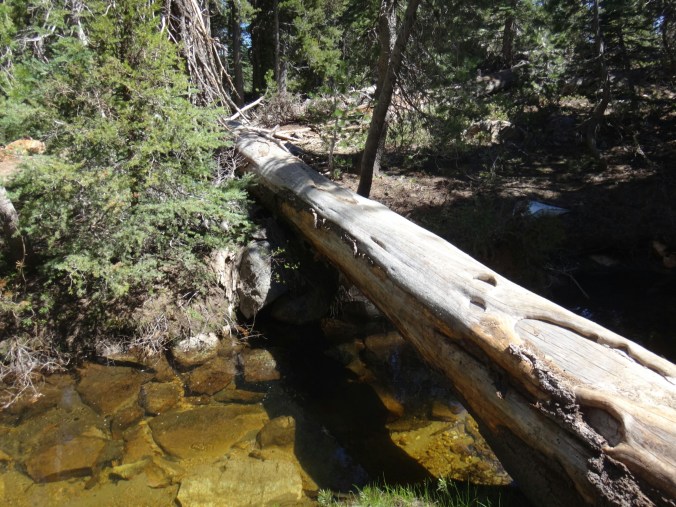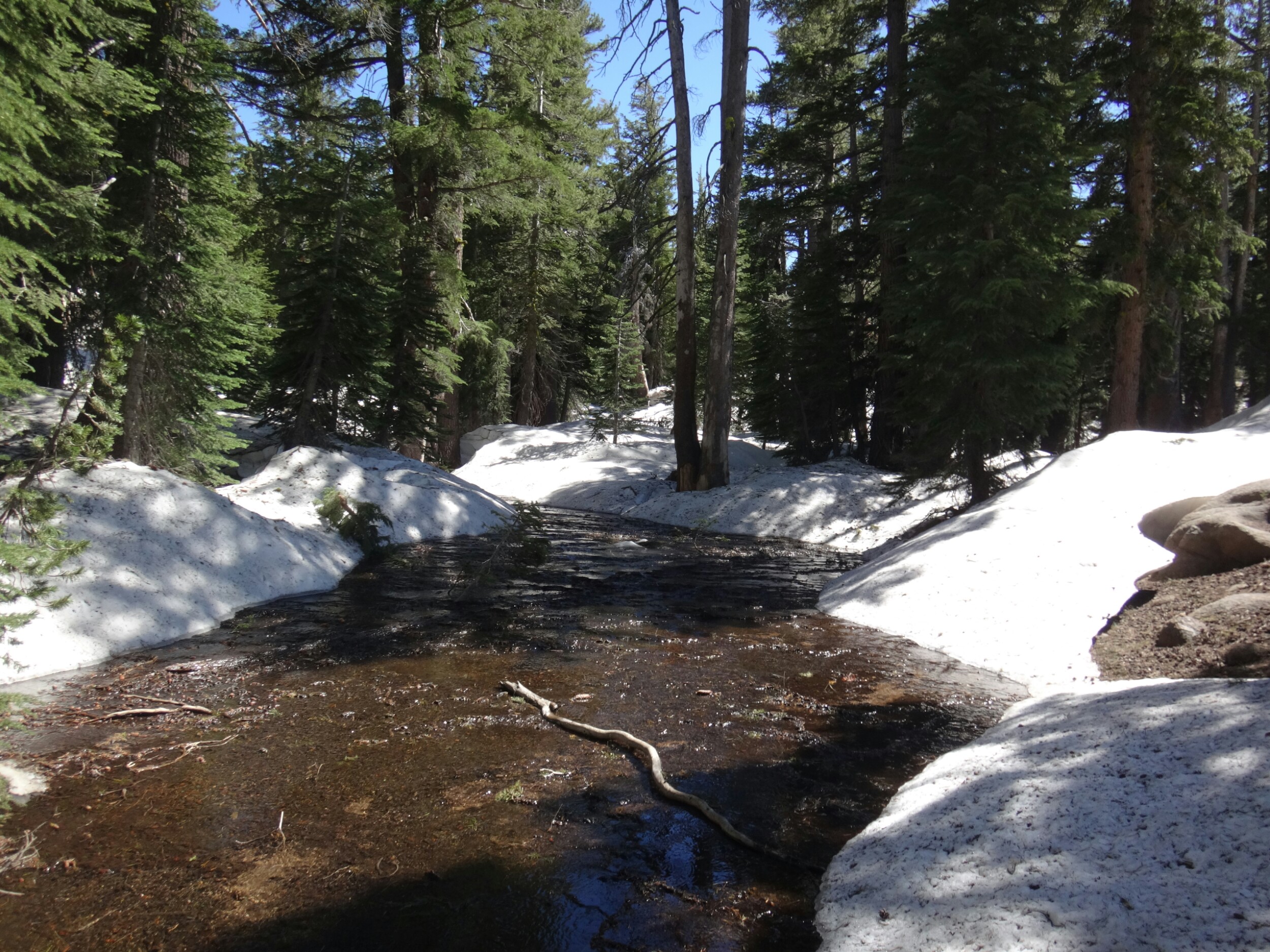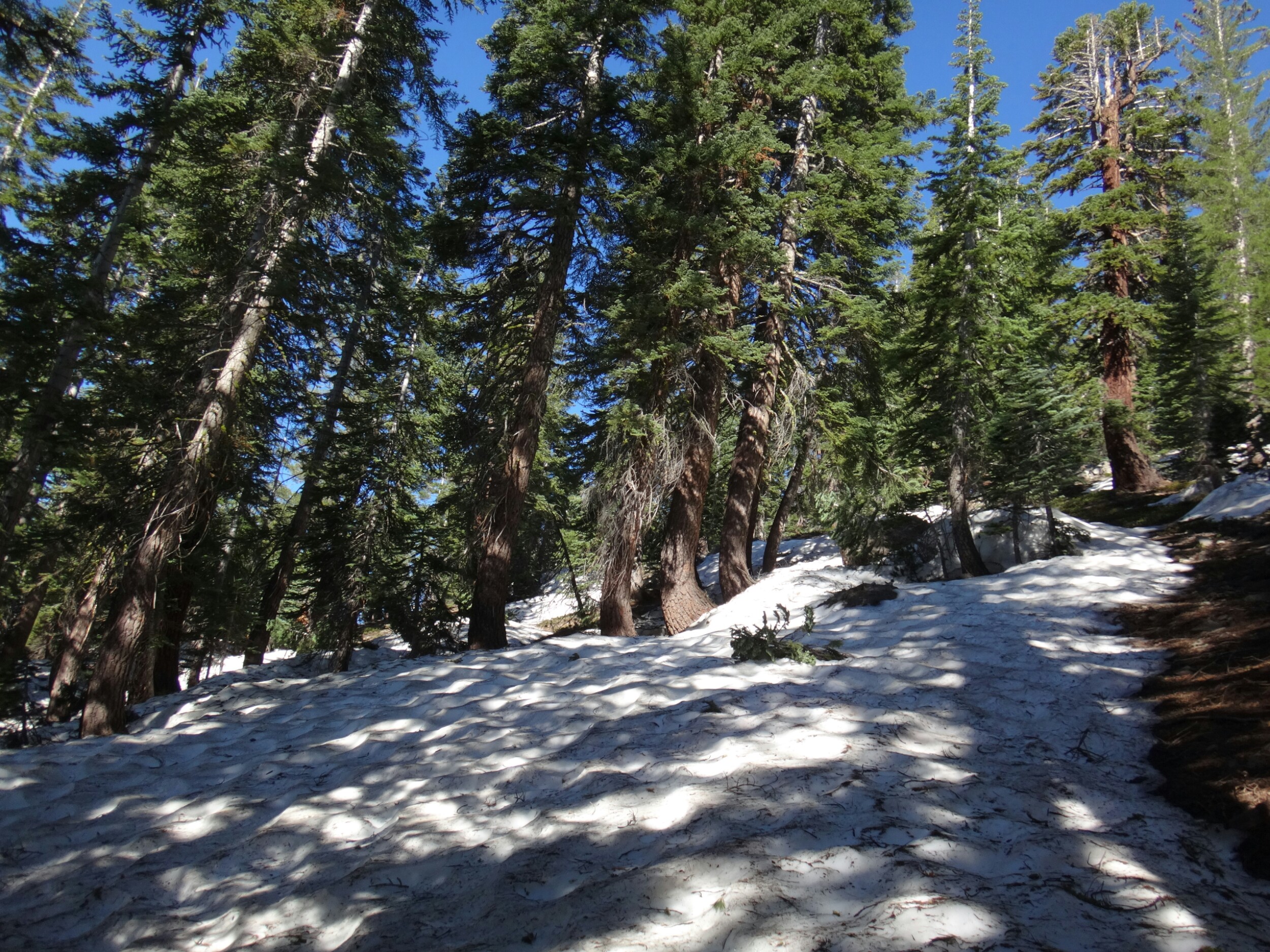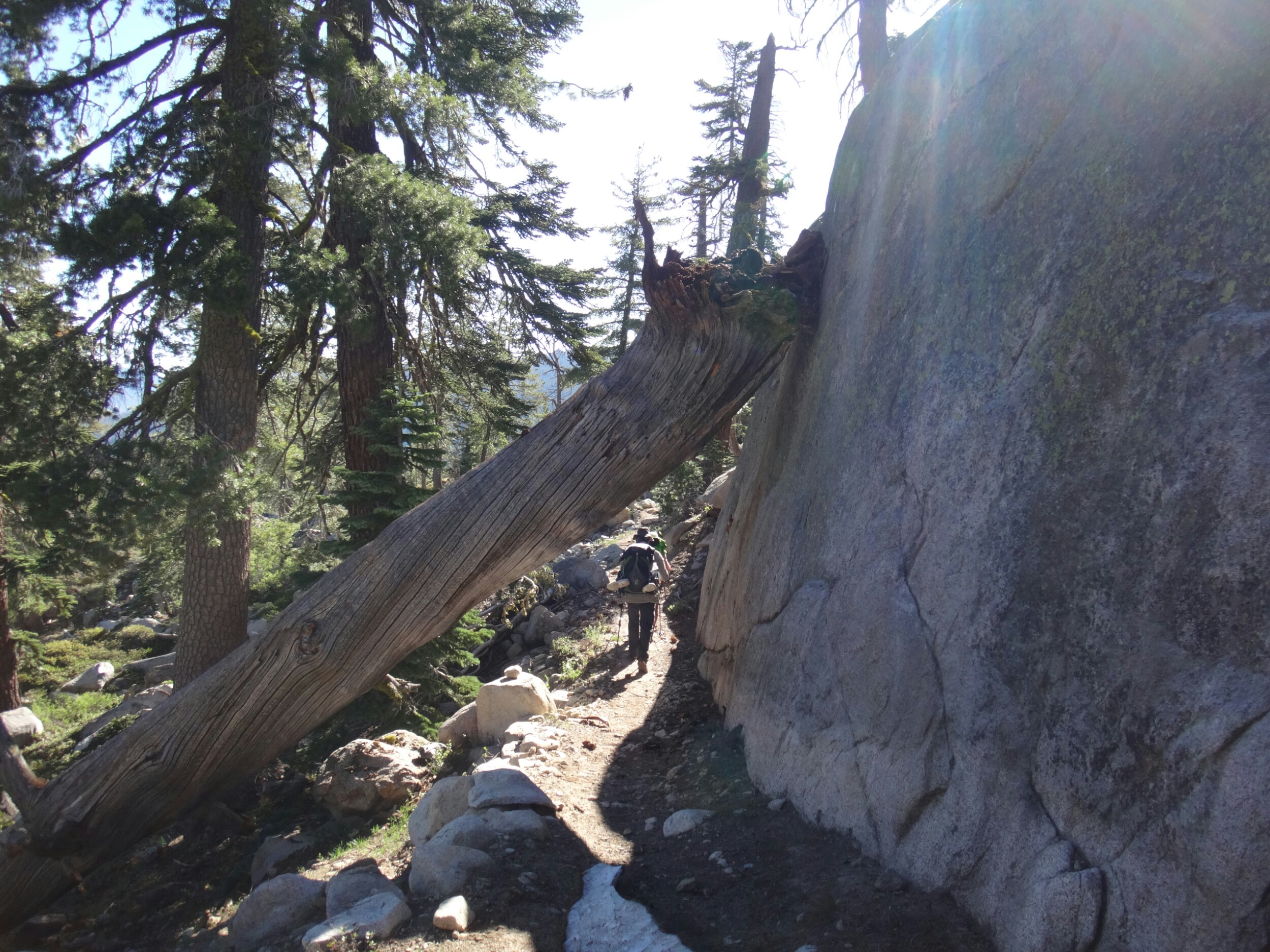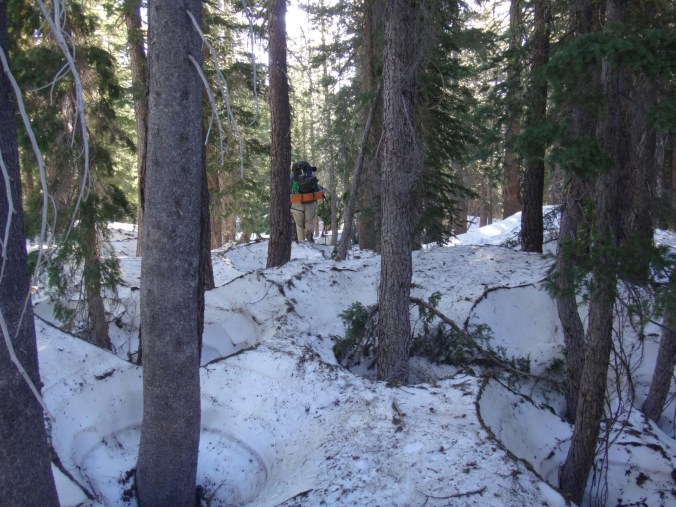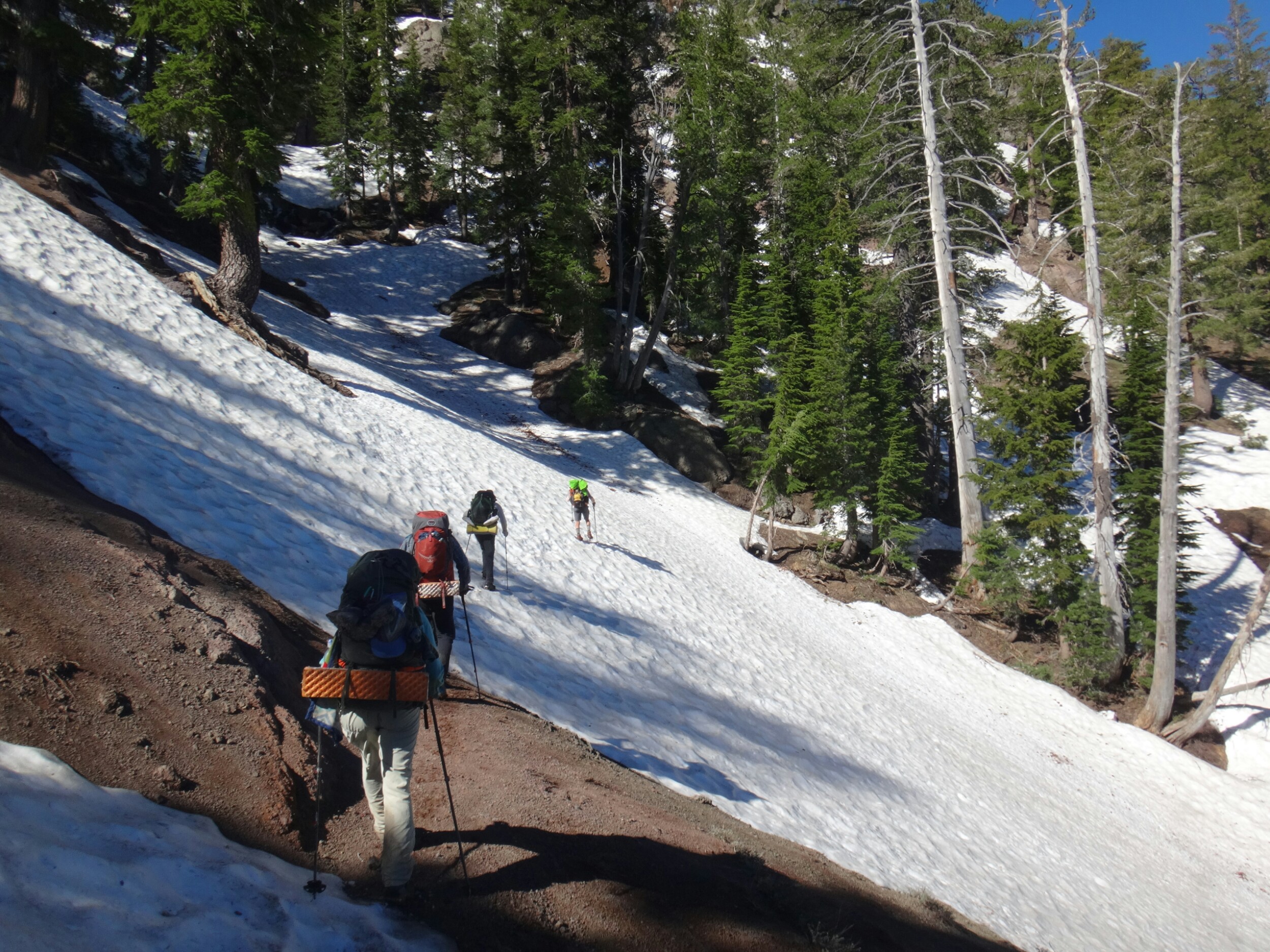Heute morgen war es ziemlich warm. Zum Glück habe ich gestern noch mein Zeltplatz geändert. So konnte ich ohne von der Matratze zu rollen schlafen. Allerdings war ich dennoch ziemlich platt. Wir liefen über einen kleinen Hügel zurück auf den Trail. Wir mussten einige Schneefelder hinab unf haben uns weiter in die linke Flanke geschlagen. Überall floss Wasser und der teilweise schneelose Trail war sehr matschig. Ich fühlte mein Gehirn immer noch nicht richtig arbeiten. Mein Handy war noch leer und ich überließ die Führung RockDoc. Ich war echt nicht in der Lage Motivation und den richtigen Weg zu vermitteln. So trottete ich hinter RockDoc her die zielstrebig den Berg hinauf zu Trail wanderte. Wir folgtem auf Schnee und trockenem Trail bis wir am Wolf Creek ankamen. Diesen konnten wir auf einer Schneebrücke überqueren. Direkt im Anschluss gab es eine kleine Pause unter ein paar Bäumen. Im Anschluss galt es wieder einen der vielen Anstiege zu bewältigen bis wir zum Fuße des Tryon Peaks kommen. Der Anstieg ist anstrengend. Der Wald ist dicht und wir laufen mal wieder Slalom. Auch treffen wie unsere Freunde von gestern wieder lassen diese jedoch liegen und versuchen ein paar Kilometer zwischen uns zu bringen. Wir schaffen 500 m in 20 min. Es ist zum Mäuse melken. Die anderen holen uns ein und laufen weiter. Wir folgen nach ein paar Minuten Richtung Sattel der sich unter dem Tyron Peak befindet. Wir holen die Gruppe schnell ein da sie nicht alle sonderlich effektiv im Schnee unterwegs sind. So kommen wir über ein wenig trockenen Trail als erste auf den Sattel und ergattern etwas Schatten unter einem gewölbten Baum. Es windet sehr stark. Wir bleiben also nicht zu lange. Auf der anderen Seite geht es zum Glück bergsb und wir sehen große Stücke trockenen Trails im Tal. Am Berg entlang machen wir noch ein paar Meter über Schnee bevor wir die Steigeisen ausziehen und uns über viele Kurven langsam ins Tal arbeiten. Die Aussicht ist endlich mal grün und nicht weiß. Kaum haben wir den Tiefpunkt erreicht müssen wir wieder über Schnee hinauf. An einem kleinen Bach zwischen Felsen und Bäumen lassen wir uns zur Mittagspause nieder. Es gibt Wraps mit Käse. RockDoc führt uns weiter am Berg entlang. Leider gibt es wieder viel Schnee und wir laufen ständig rauf und runter. Ich bin ziemlich müde und daher froh hinter allen her zu laufen. Bis zur Ridgeline ist es leider ein knackiger Anstieg in der Sonne. Da hilft es nichts wenn man ab und an in matschigen Trail versinkt. So manche Schneebrücke bricht unter unseren Füßen. Bis zum Highway 4 sind es nur noch weniger Kilometer. Mir gehen die Augen tiefer und tiefer und wir legen zum Glück nochmal eine Pause ein. Meine Schulter tut weh. Der Schnee ist matschig und wir arbeiten uns quer über einen Hügel hinauf. Kurz ins Tal und wir queren die verlassene Straße. Natürlich wieder bergauf und der Wind bläst mit aller Kraft. Wir sehen Seen die nur noch restliche Schollen über die Oberfläche tragen. Nach ein paar Kilometern legen wir die nächste Pause ein und ein einzelner Wanderer überholt uns wortkarg. Naja, bis zum Zeltplatz ist es nicht mehr weit. Einen letzten Berg und wir finden einen schönen Platz. Ich baue mein Zelt hinter einem umgefallenen Baumstamm auf. Wir holen Wasser und fangen dann an zu kochen. Ich koche wieder Mountain House und danach eine Portion Ramen. Danach muss ich mich zwingen den Block zu schreiben. Es ist nicht mehr so wie auf der letzten Etappe. Wir haben ein paar schöne Strecken gesehen, aber Aktion gibts hier wenig. Das ist einfach ein wenig deprimierend. Wir fallen alle in ein Loch. Hoffentlich kommen wir schnell darüber hinweg.