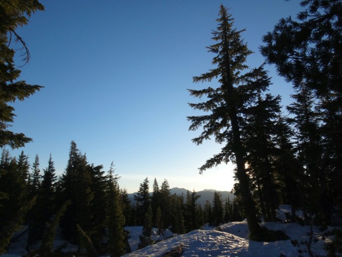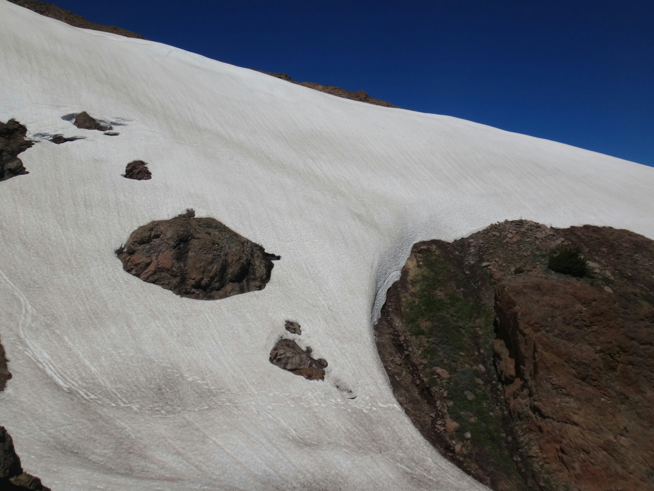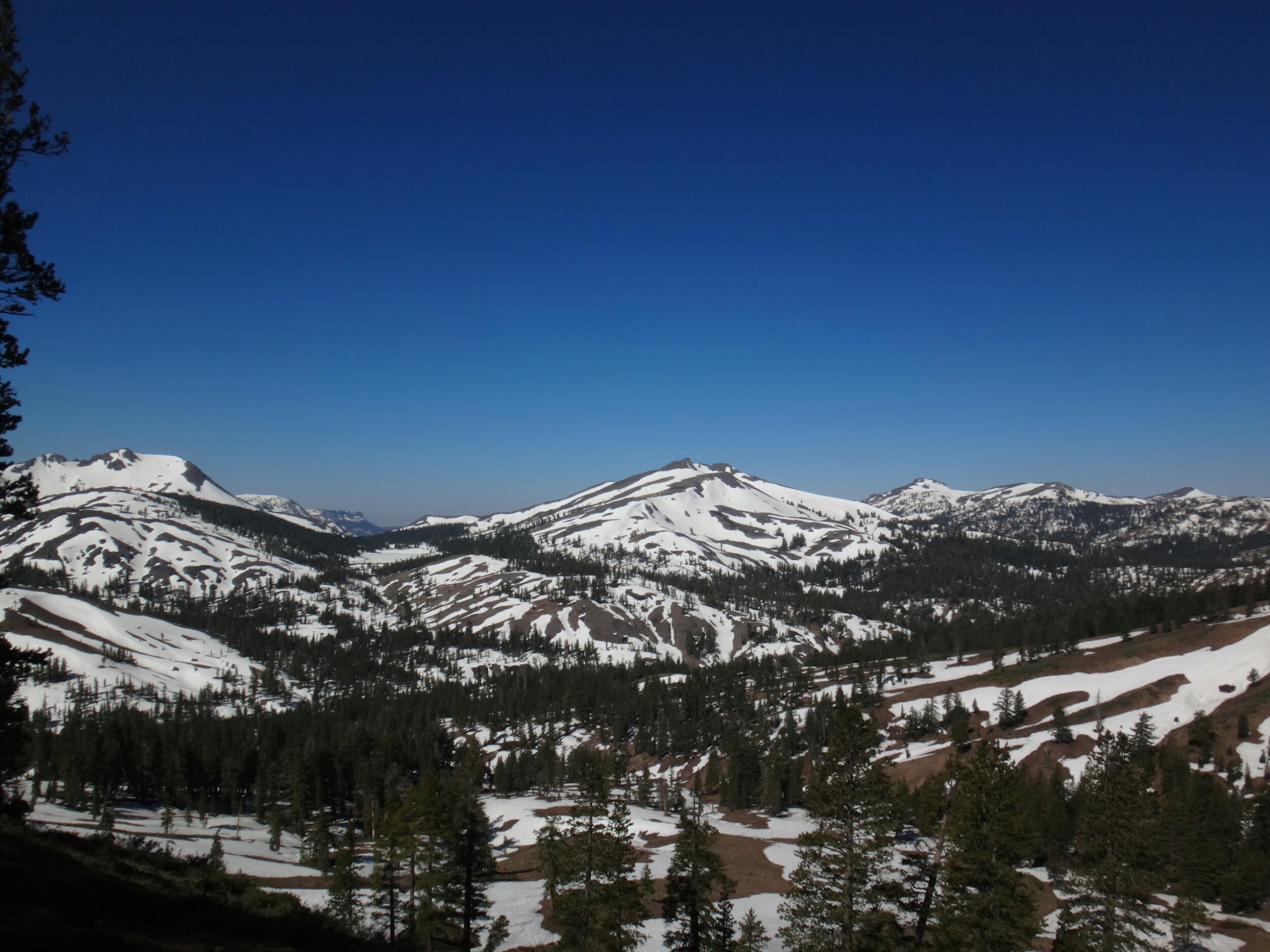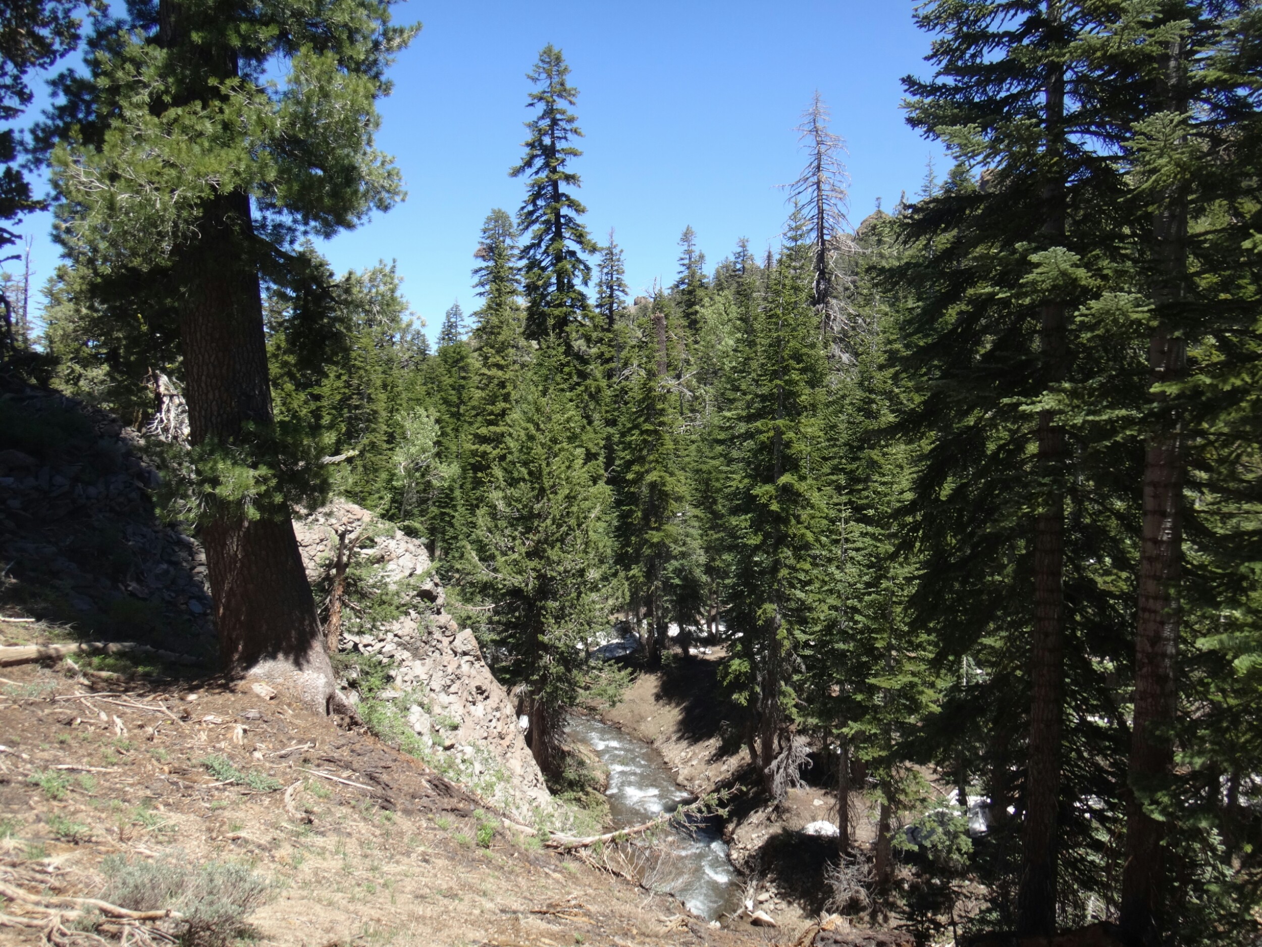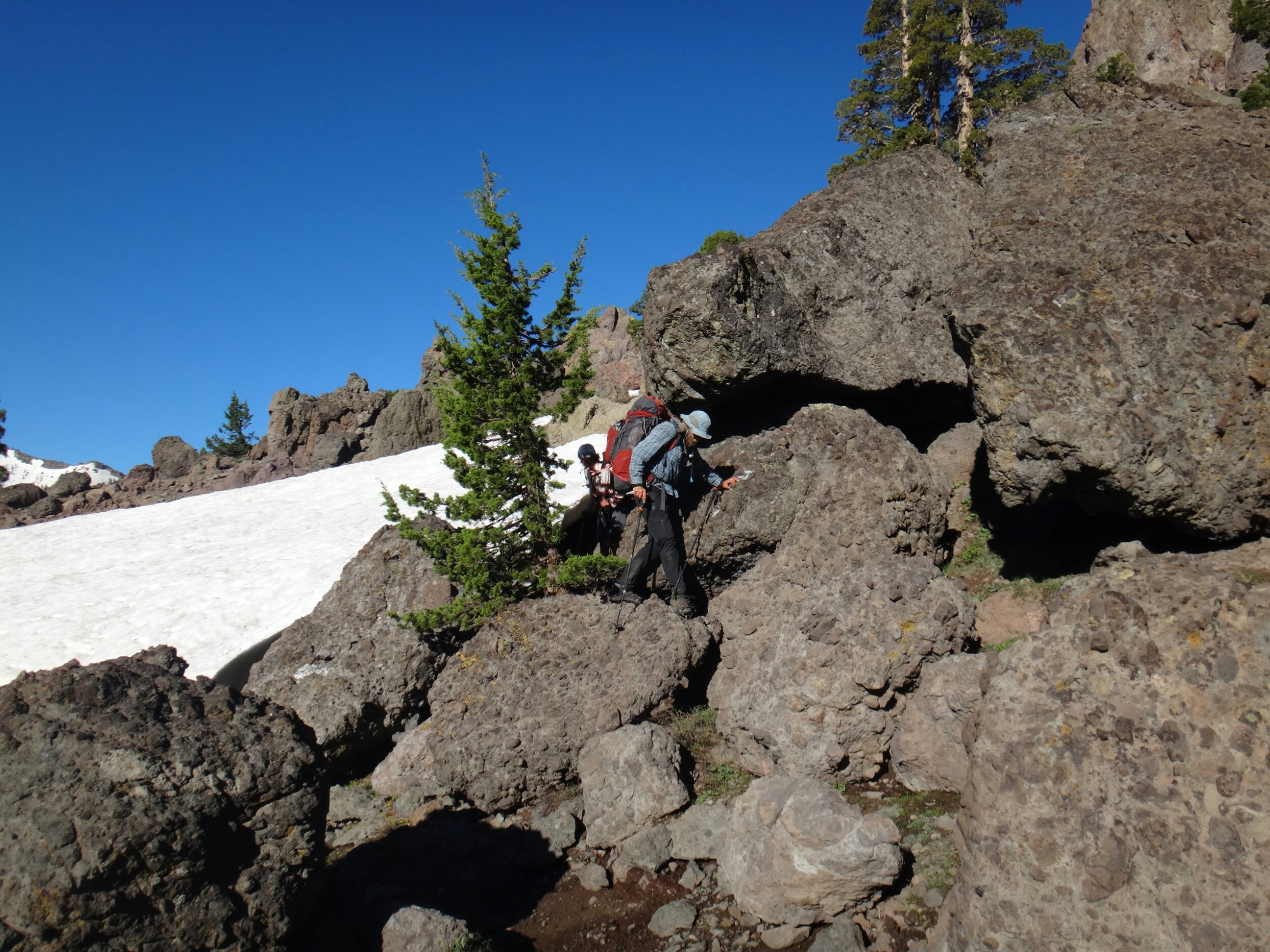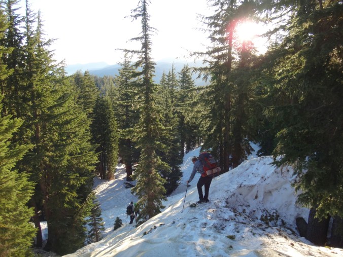 Heute morgen war es ziemlich warm. Zum Glück habe ich gestern noch mein Zeltplatz geändert. So konnte ich ohne von der Matratze zu rollen schlafen. Allerdings war ich dennoch ziemlich platt. Wir liefen über einen kleinen Hügel zurück auf den Trail. Wir mussten einige Schneefelder hinab unf haben uns weiter in die linke Flanke geschlagen. Überall floss Wasser und der teilweise schneelose Trail war sehr matschig. Ich fühlte mein Gehirn immer noch nicht richtig arbeiten. Mein Handy war noch leer und ich überließ die Führung RockDoc. Ich war echt nicht in der Lage Motivation und den richtigen Weg zu vermitteln. So trottete ich hinter RockDoc her die zielstrebig den Berg hinauf zu Trail wanderte. Wir folgtem auf Schnee und trockenem Trail bis wir am Wolf Creek ankamen. Diesen konnten wir auf einer Schneebrücke überqueren. Direkt im Anschluss gab es eine kleine Pause unter ein paar Bäumen. Im Anschluss galt es wieder einen der vielen Anstiege zu bewältigen bis wir zum Fuße des Tryon Peaks kommen. Der Anstieg ist anstrengend. Der Wald ist dicht und wir laufen mal wieder Slalom. Auch treffen wie unsere Freunde von gestern wieder lassen diese jedoch liegen und versuchen ein paar Kilometer zwischen uns zu bringen. Wir schaffen 500 m in 20 min. Es ist zum Mäuse melken. Die anderen holen uns ein und laufen weiter. Wir folgen nach ein paar Minuten Richtung Sattel der sich unter dem Tyron Peak befindet. Wir holen die Gruppe schnell ein da sie nicht alle sonderlich effektiv im Schnee unterwegs sind. So kommen wir über ein wenig trockenen Trail als erste auf den Sattel und ergattern etwas Schatten unter einem gewölbten Baum. Es windet sehr stark. Wir bleiben also nicht zu lange. Auf der anderen Seite geht es zum Glück bergsb und wir sehen große Stücke trockenen Trails im Tal. Am Berg entlang machen wir noch ein paar Meter über Schnee bevor wir die Steigeisen ausziehen und uns über viele Kurven langsam ins Tal arbeiten. Die Aussicht ist endlich mal grün und nicht weiß. Kaum haben wir den Tiefpunkt erreicht müssen wir wieder über Schnee hinauf. An einem kleinen Bach zwischen Felsen und Bäumen lassen wir uns zur Mittagspause nieder. Es gibt Wraps mit Käse. RockDoc führt uns weiter am Berg entlang. Leider gibt es wieder viel Schnee und wir laufen ständig rauf und runter. Ich bin ziemlich müde und daher froh hinter allen her zu laufen. Bis zur Ridgeline ist es leider ein knackiger Anstieg in der Sonne. Da hilft es nichts wenn man ab und an in matschigen Trail versinkt. So manche Schneebrücke bricht unter unseren Füßen. Bis zum Highway 4 sind es nur noch weniger Kilometer. Mir gehen die Augen tiefer und tiefer und wir legen zum Glück nochmal eine Pause ein. Meine Schulter tut weh. Der Schnee ist matschig und wir arbeiten uns quer über einen Hügel hinauf. Kurz ins Tal und wir queren die verlassene Straße. Natürlich wieder bergauf und der Wind bläst mit aller Kraft. Wir sehen Seen die nur noch restliche Schollen über die Oberfläche tragen. Nach ein paar Kilometern legen wir die nächste Pause ein und ein einzelner Wanderer überholt uns wortkarg. Naja, bis zum Zeltplatz ist es nicht mehr weit. Einen letzten Berg und wir finden einen schönen Platz. Ich baue mein Zelt hinter einem umgefallenen Baumstamm auf. Wir holen Wasser und fangen dann an zu kochen. Ich koche wieder Mountain House und danach eine Portion Ramen. Danach muss ich mich zwingen den Block zu schreiben. Es ist nicht mehr so wie auf der letzten Etappe. Wir haben ein paar schöne Strecken gesehen, aber Aktion gibts hier wenig. Das ist einfach ein wenig deprimierend. Wir fallen alle in ein Loch. Hoffentlich kommen wir schnell darüber hinweg.