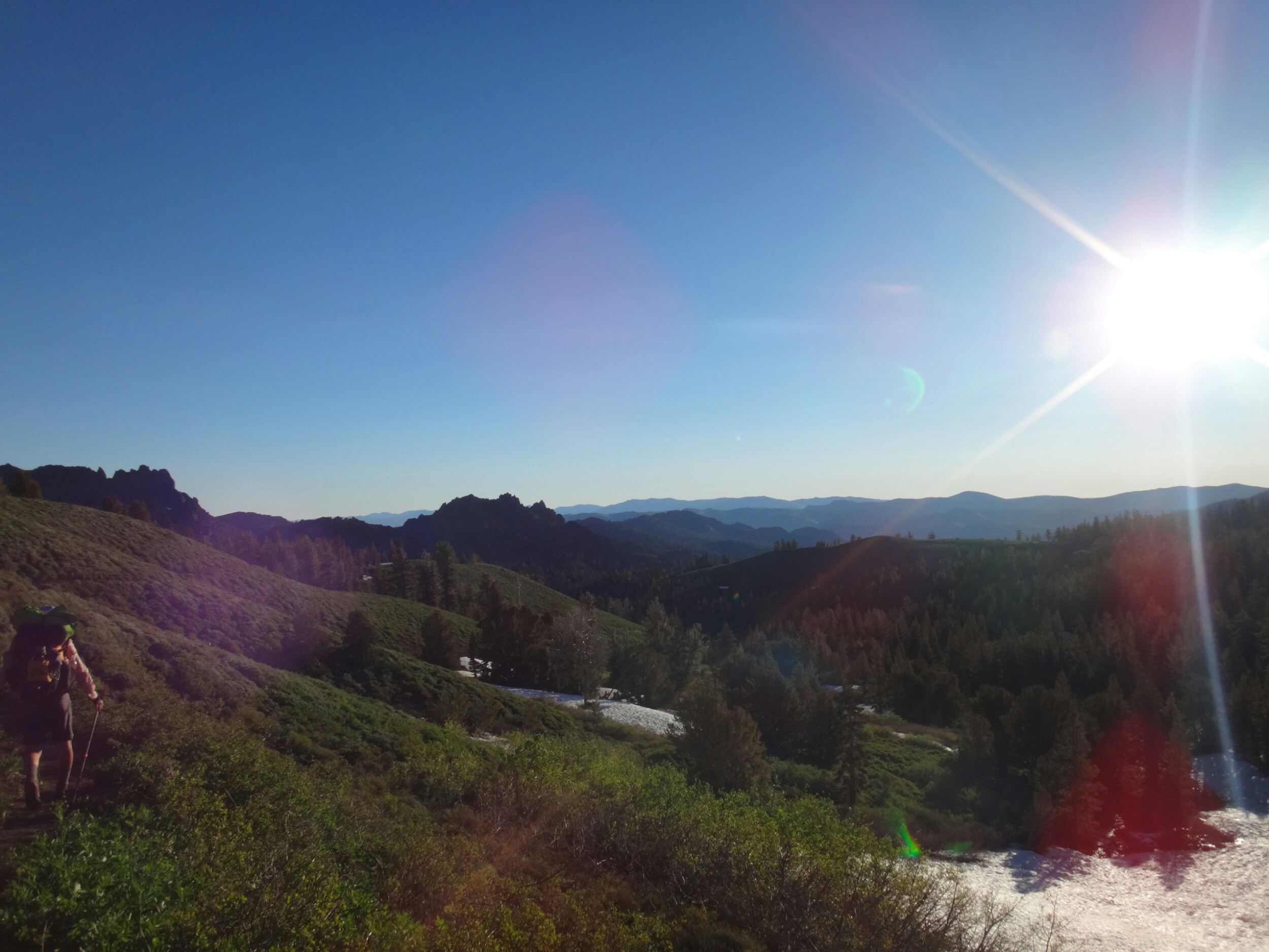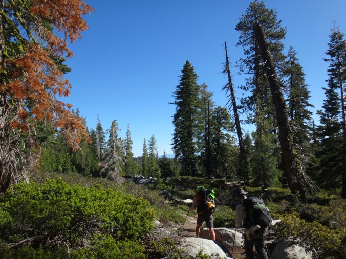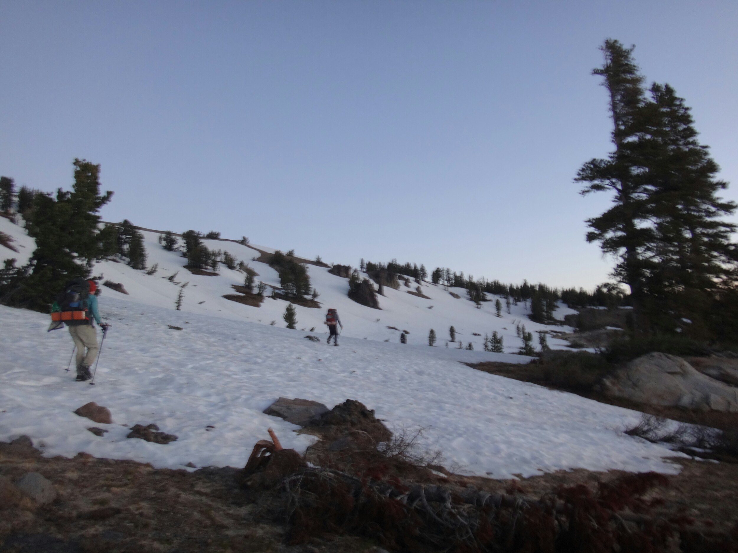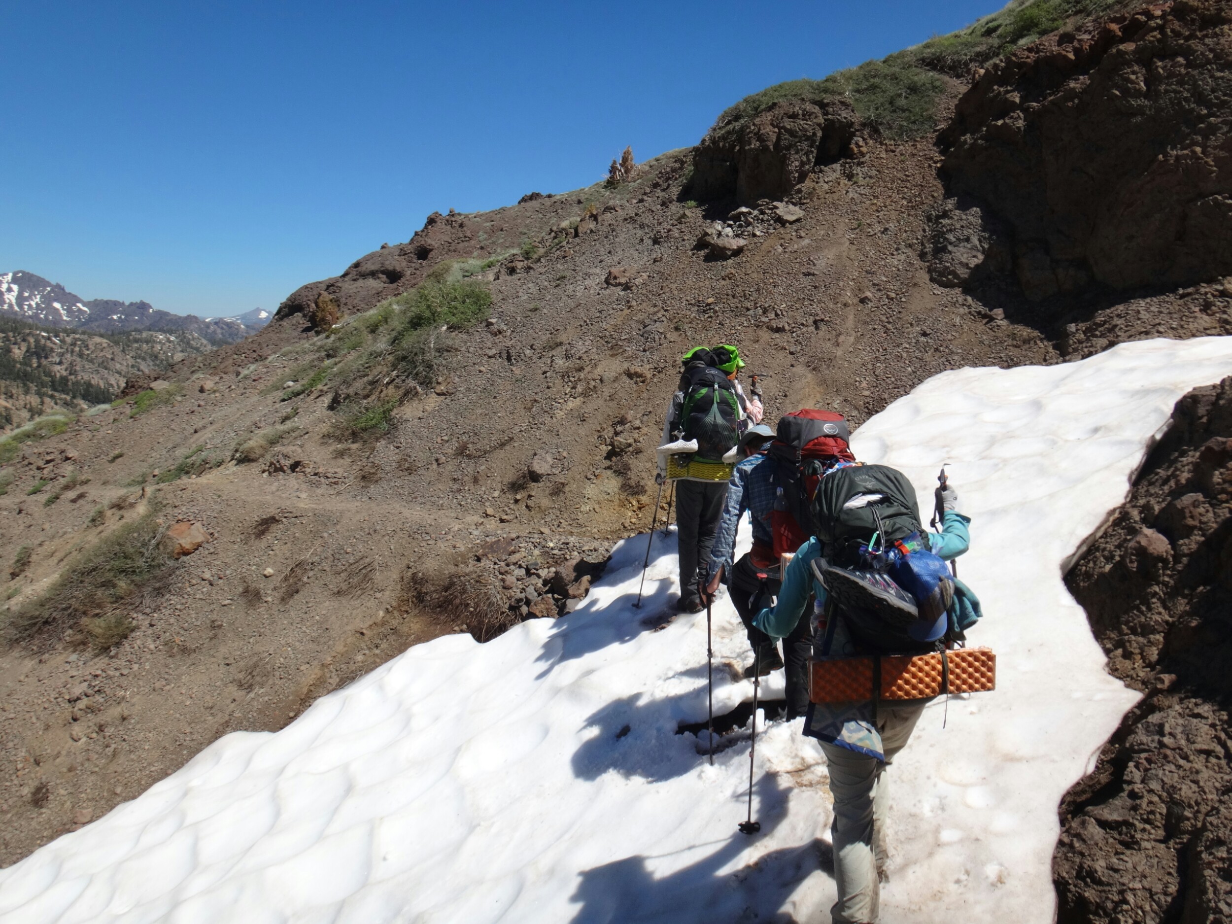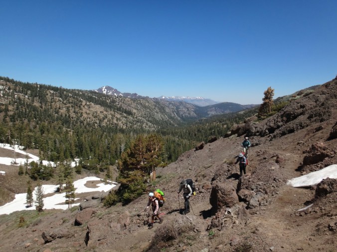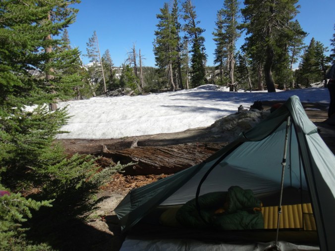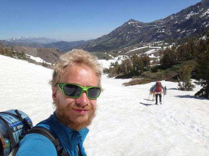 Bohh hab ich heut Nacht schlecht geträumt. War völlig verschwitzt. Naja, die Sonne ging langsam auf und hüllte die angrenzenden Bäume in rot. Wir packten unsere Sachen und ich aß noch eine Zimtschnecke zum Frühstück. Wie liefen durch ein kleine Stück Wald und fanden uns auf einer großen schneereichen Fläche wieder. Die vor uns liegenden Felsen waren feuerrot. Wir schnwenken nach rechts und treffen bald auf trockenen Trail. Allerdings hält das nur teilweise an und wir queren eisige Schneefelder. Am Horizont liegen die verschiedenen Bergketten in unterschiedlichen grautönen. Der Trail wird kurzweilig grüner und wir kommen in einen steinigen Abschnitt. Zur linken liegen hohe Türme aus hellem Stein. Unter den Füßen knirschen Steine und Sand. Hier und da stehen tolle ausgetrocknete Bäume. Wir klettern über einige Felsen nachdem wir über ein Schneefeld gelaufen sind und legen eine Pause ein. Danach kürzern wir den Trail der über Schnee am berghang entlang geht durch das Tal ab und schilddern ins Tal. Alle anderen ziehen dafür wieder ihre Steigeisen an, ich belasse es bei meinen Trailrunnern. Langsam klettern wir weiter den Berg hinauf und können auf der Ridgeline vor uns endlich viel grüne Hügel sehen. Hinter uns ist noch sehr viel weiß. Wir müssen wieder traversieren und sofort treffen wir wieder auf Schnee. Steigeisen wieder an. Steigeisen aus. Über viele Serpentinen geht es durch ein Tal hinab und hinauf. Das Gelände ist wie in der Wüste. Kahl. Wir laufen und laufen und machen gute Kilometer. Der Trail ist größtenteils schneefrei. Nach ein paar Kurven auf einem buschigen bergab mit toller Aussicht auf einen weit entfernten Wasserfall machen wie nochmals Pause unter ein paar Bäumen. Die Ameisen laufen überall. Auch auf uns herum. Nach nur wenigen Metern kommen wir an eine riesige Schneewand. Der Trail ist verschwunden. Wir entschließen uns für den sicheren Weg und steigen ins Tal ab um dann einen langen und anstrengenden Aufstieg zurück zum Trail zu nehmen. Die ganze Aktion mit erkunden und laufen hat uns für 1,4 km 1,5 Stunden gekostet. Danach waren alle bedient. Ich war total total von Moskitos zerstochen. LovelyHeart hat mir Kortisonsalbe gegeben. Das hilft sofort. Wir machen Mittagspause direkt auf dem Trail. Im Tal liegt ein toller Wald. Wir müssen ca. 30 Bäume überklettern und ein paar Flüsse überqueren. Aber nichts waghalsiges. Wir laufen ziemlich zügig und ich komme ins schwitzen. Wegen den Moskitos habe ich eine lange Unterhose an und mein langes Fleece. Nebenher läuft ein Hörspiel. Kurz vor 16 Uhr sind alle einigermaßen platt und wir laufen nur noch bis zum nächsten Fluss. Wir finden tolle Plätze nebenan und machen es uns gemütlich. Meine Socken hängen zum trocknen und wir kochen in gemeinsamer Runde. Anschließend sitzen wir noch längere Zeit vor unseren Zelten und schnacken. Griz flickt nebenher noch ein Loch in seiner Luftmatratze. Es sind noch 40 km bis zum Highway 50. Vielleicht sind wir in zwei Tagen da. 🙂