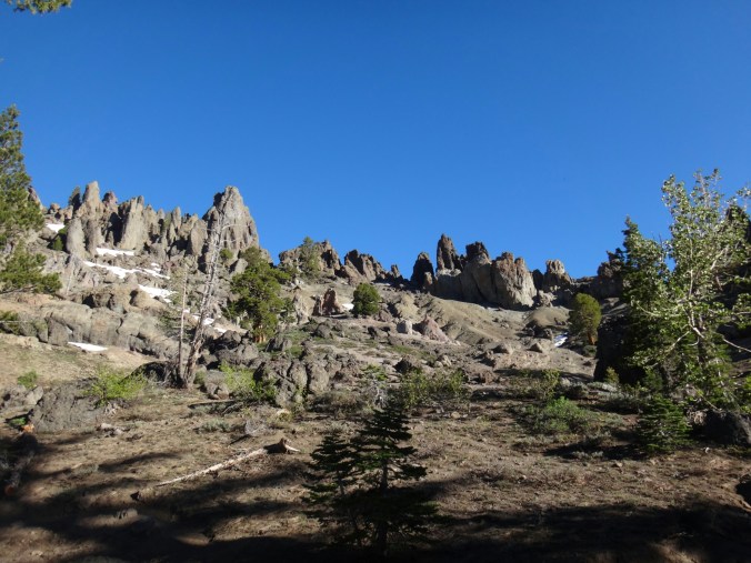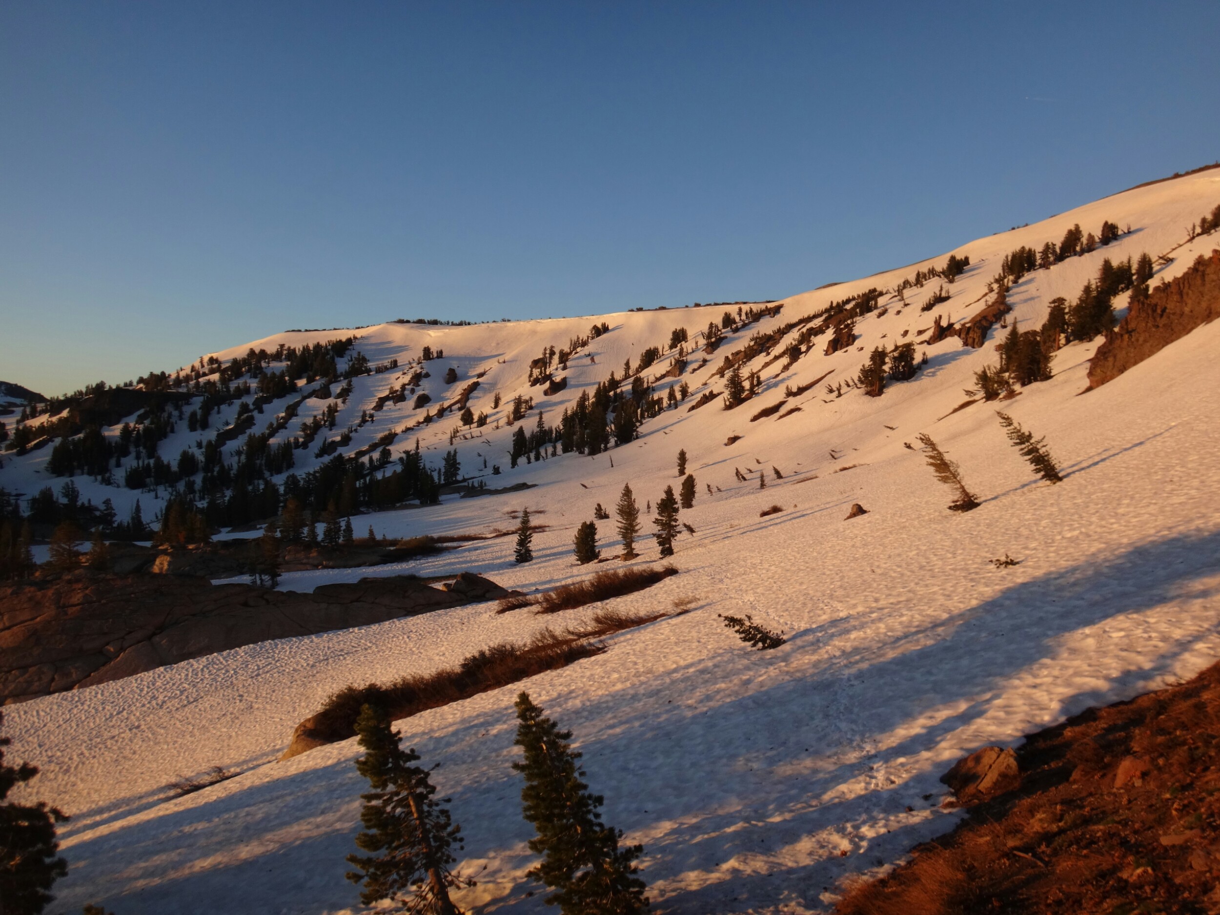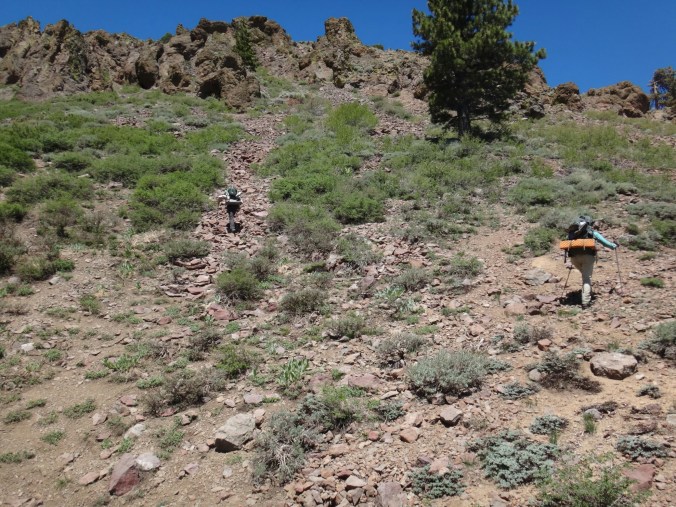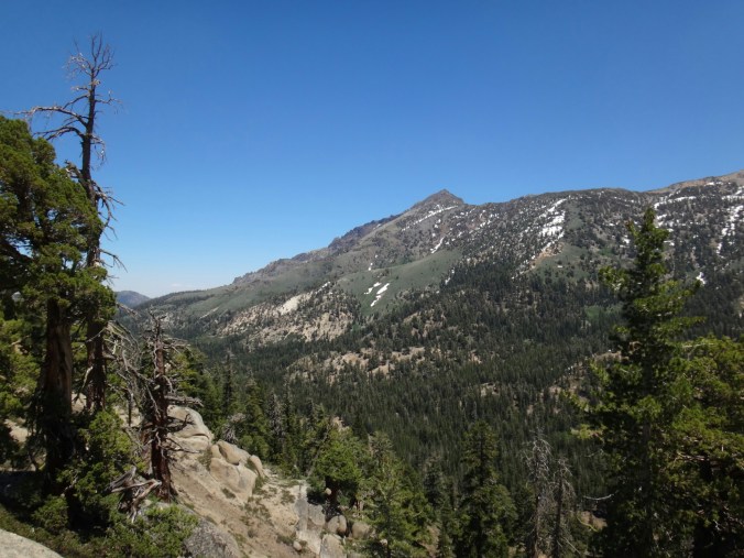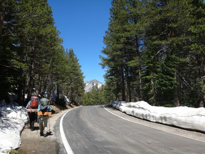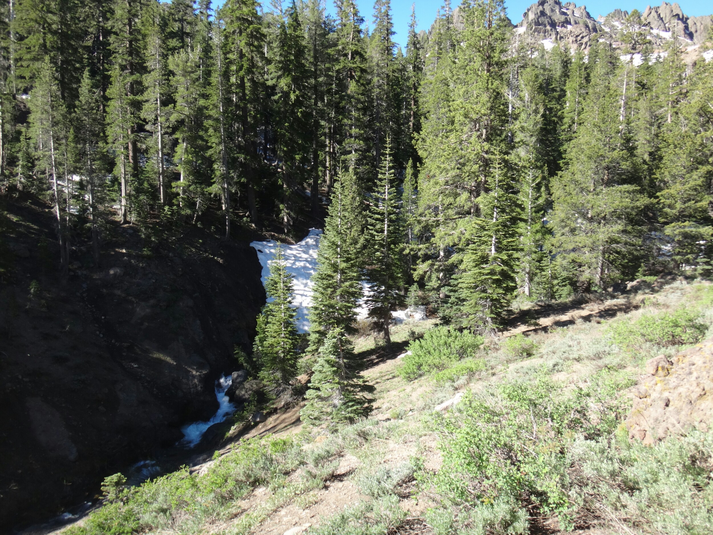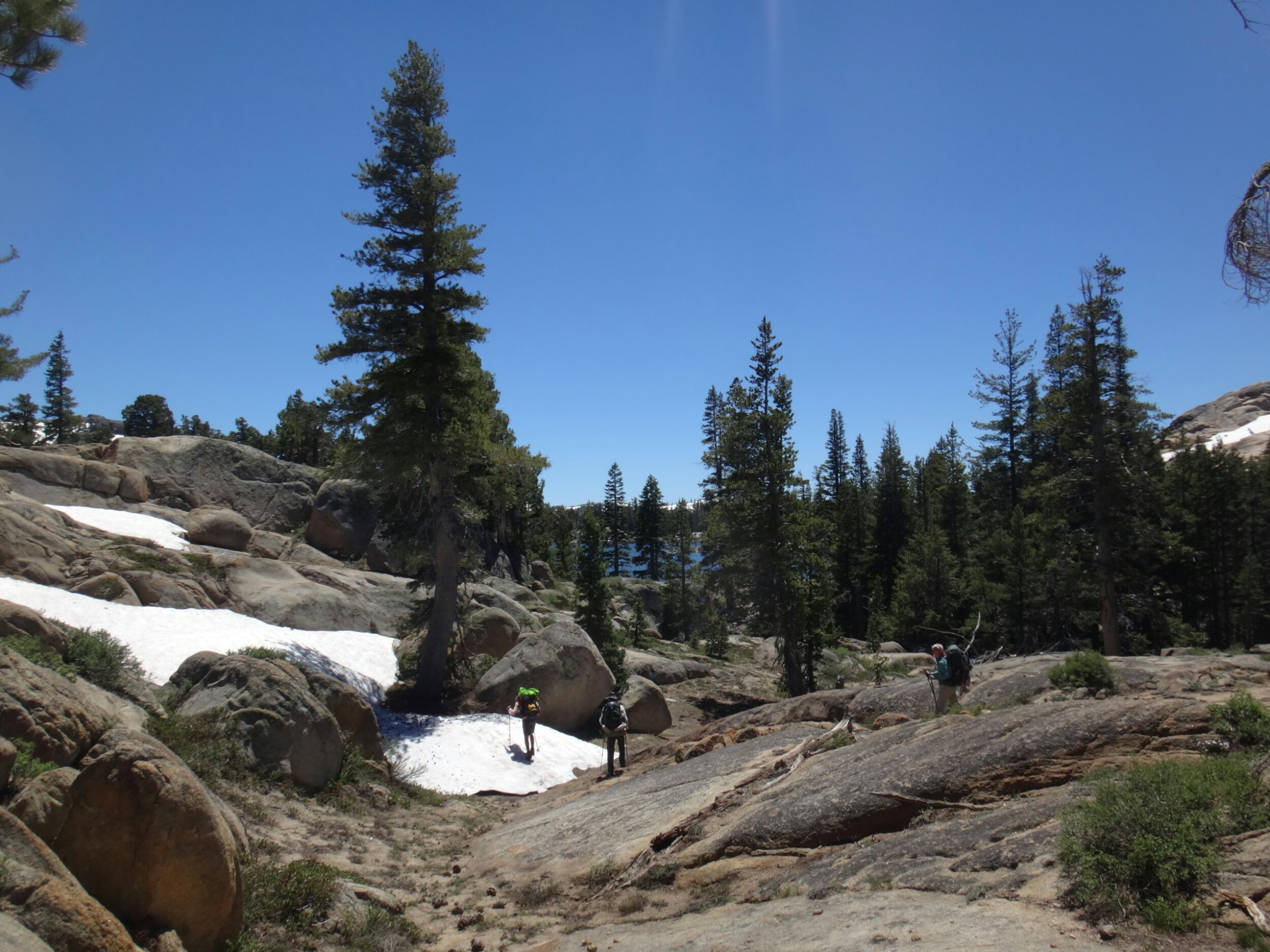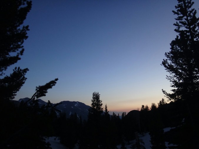 Bohh hab ich heut Nacht schlecht geträumt. War völlig verschwitzt. Naja, die Sonne ging langsam auf und hüllte die angrenzenden Bäume in rot. Wir packten unsere Sachen und ich aß noch eine Zimtschnecke zum Frühstück. Wie liefen durch ein kleine Stück Wald und fanden uns auf einer großen schneereichen Fläche wieder. Die vor uns liegenden Felsen waren feuerrot. Wir schnwenken nach rechts und treffen bald auf trockenen Trail. Allerdings hält das nur teilweise an und wir queren eisige Schneefelder. Am Horizont liegen die verschiedenen Bergketten in unterschiedlichen grautönen. Der Trail wird kurzweilig grüner und wir kommen in einen steinigen Abschnitt. Zur linken liegen hohe Türme aus hellem Stein. Unter den Füßen knirschen Steine und Sand. Hier und da stehen tolle ausgetrocknete Bäume. Wir klettern über einige Felsen nachdem wir über ein Schneefeld gelaufen sind und legen eine Pause ein. Danach kürzern wir den Trail der über Schnee am berghang entlang geht durch das Tal ab und schilddern ins Tal. Alle anderen ziehen dafür wieder ihre Steigeisen an, ich belasse es bei meinen Trailrunnern. Langsam klettern wir weiter den Berg hinauf und können auf der Ridgeline vor uns endlich viel grüne Hügel sehen. Hinter uns ist noch sehr viel weiß. Wir müssen wieder traversieren und sofort treffen wir wieder auf Schnee. Steigeisen wieder an. Steigeisen aus. Über viele Serpentinen geht es durch ein Tal hinab und hinauf. Das Gelände ist wie in der Wüste. Kahl. Wir laufen und laufen und machen gute Kilometer. Der Trail ist größtenteils schneefrei. Nach ein paar Kurven auf einem buschigen bergab mit toller Aussicht auf einen weit entfernten Wasserfall machen wie nochmals Pause unter ein paar Bäumen. Die Ameisen laufen überall. Auch auf uns herum. Nach nur wenigen Metern kommen wir an eine riesige Schneewand. Der Trail ist verschwunden. Wir entschließen uns für den sicheren Weg und steigen ins Tal ab um dann einen langen und anstrengenden Aufstieg zurück zum Trail zu nehmen. Die ganze Aktion mit erkunden und laufen hat uns für 1,4 km 1,5 Stunden gekostet. Danach waren alle bedient. Ich war total total von Moskitos zerstochen. LovelyHeart hat mir Kortisonsalbe gegeben. Das hilft sofort. Wir machen Mittagspause direkt auf dem Trail. Im Tal liegt ein toller Wald. Wir müssen ca. 30 Bäume überklettern und ein paar Flüsse überqueren. Aber nichts waghalsiges. Wir laufen ziemlich zügig und ich komme ins schwitzen. Wegen den Moskitos habe ich eine lange Unterhose an und mein langes Fleece. Nebenher läuft ein Hörspiel. Kurz vor 16 Uhr sind alle einigermaßen platt und wir laufen nur noch bis zum nächsten Fluss. Wir finden tolle Plätze nebenan und machen es uns gemütlich. Meine Socken hängen zum trocknen und wir kochen in gemeinsamer Runde. Anschließend sitzen wir noch längere Zeit vor unseren Zelten und schnacken. Griz flickt nebenher noch ein Loch in seiner Luftmatratze. Es sind noch 40 km bis zum Highway 50. Vielleicht sind wir in zwei Tagen da. 🙂