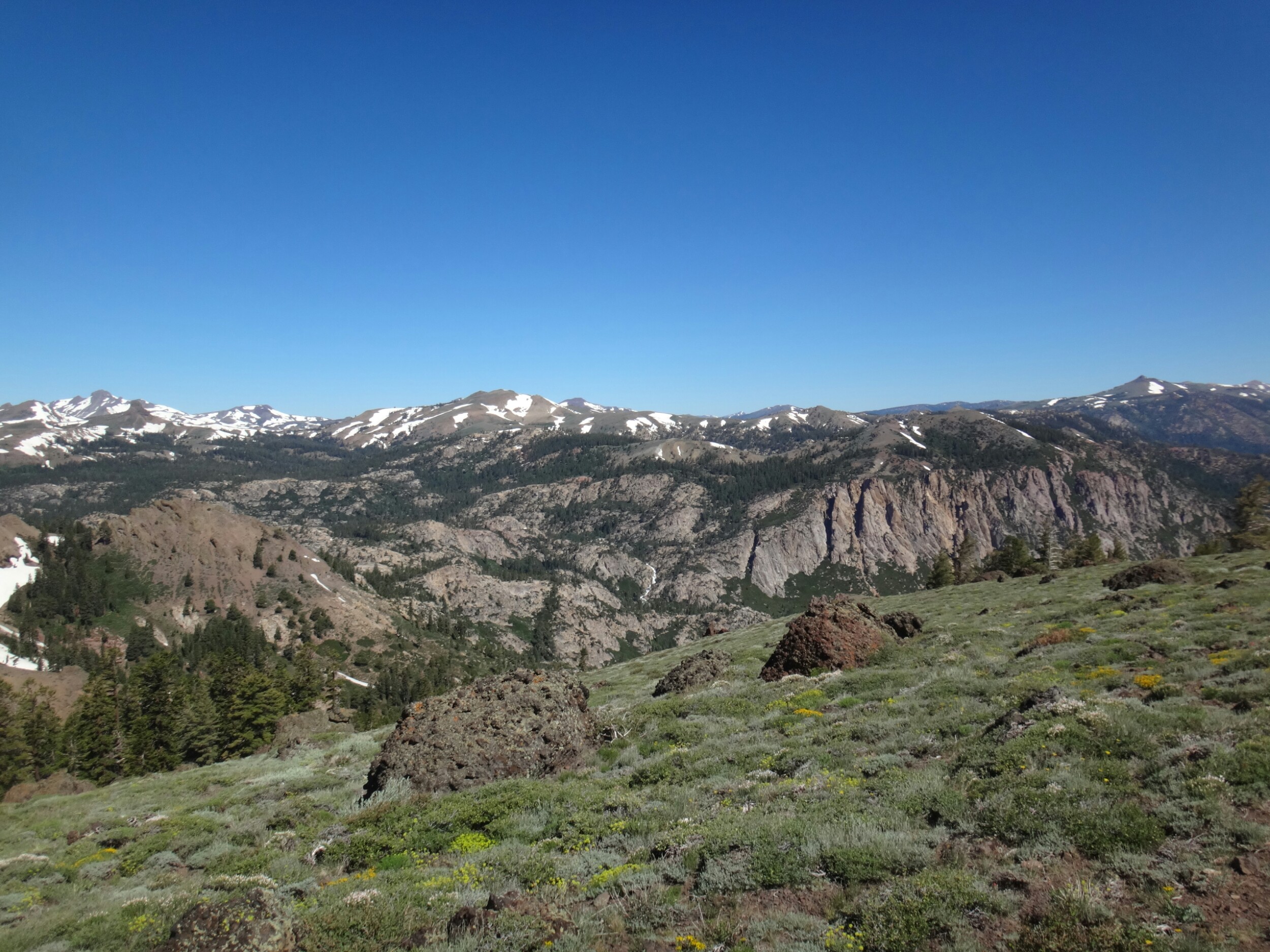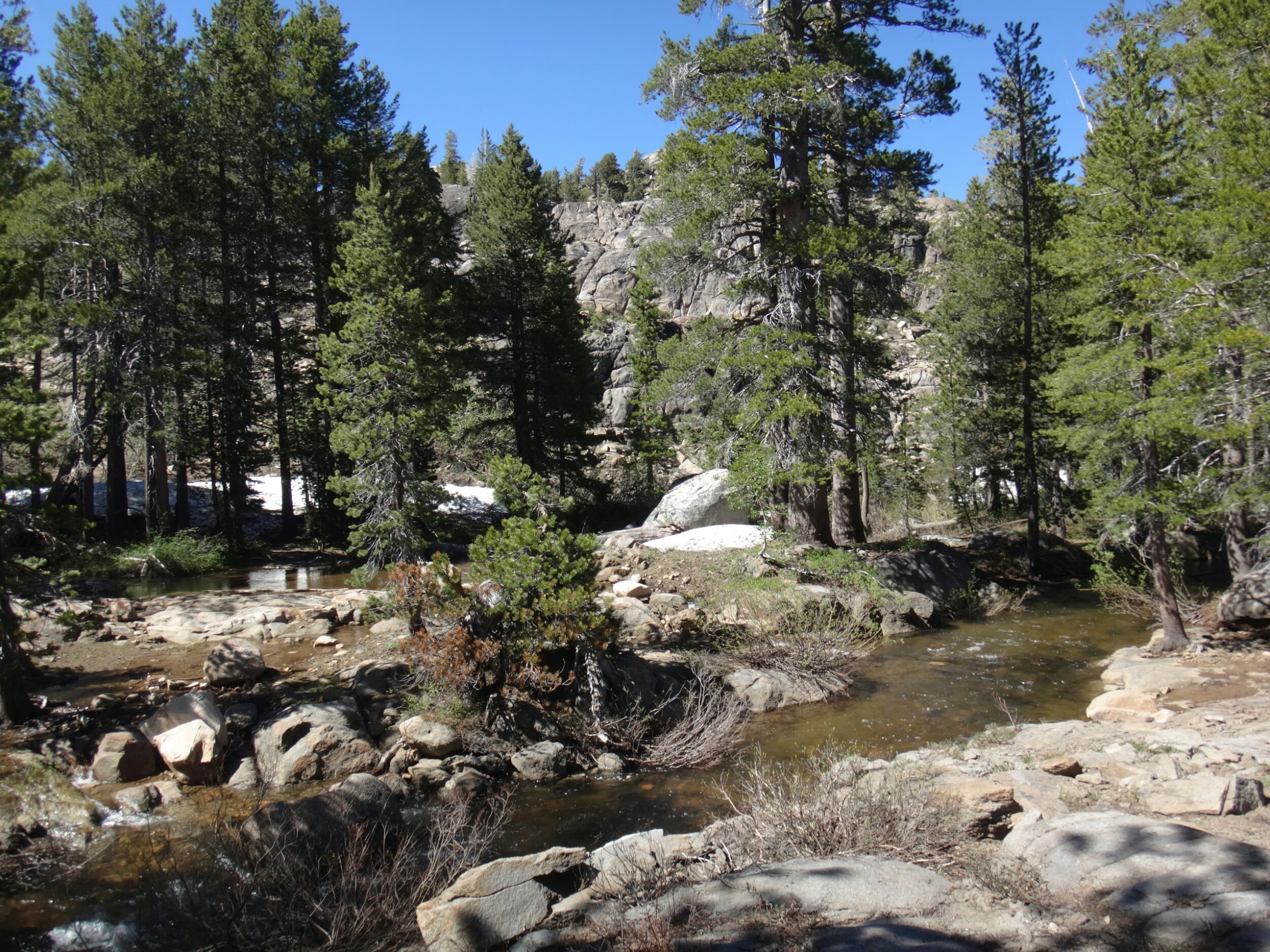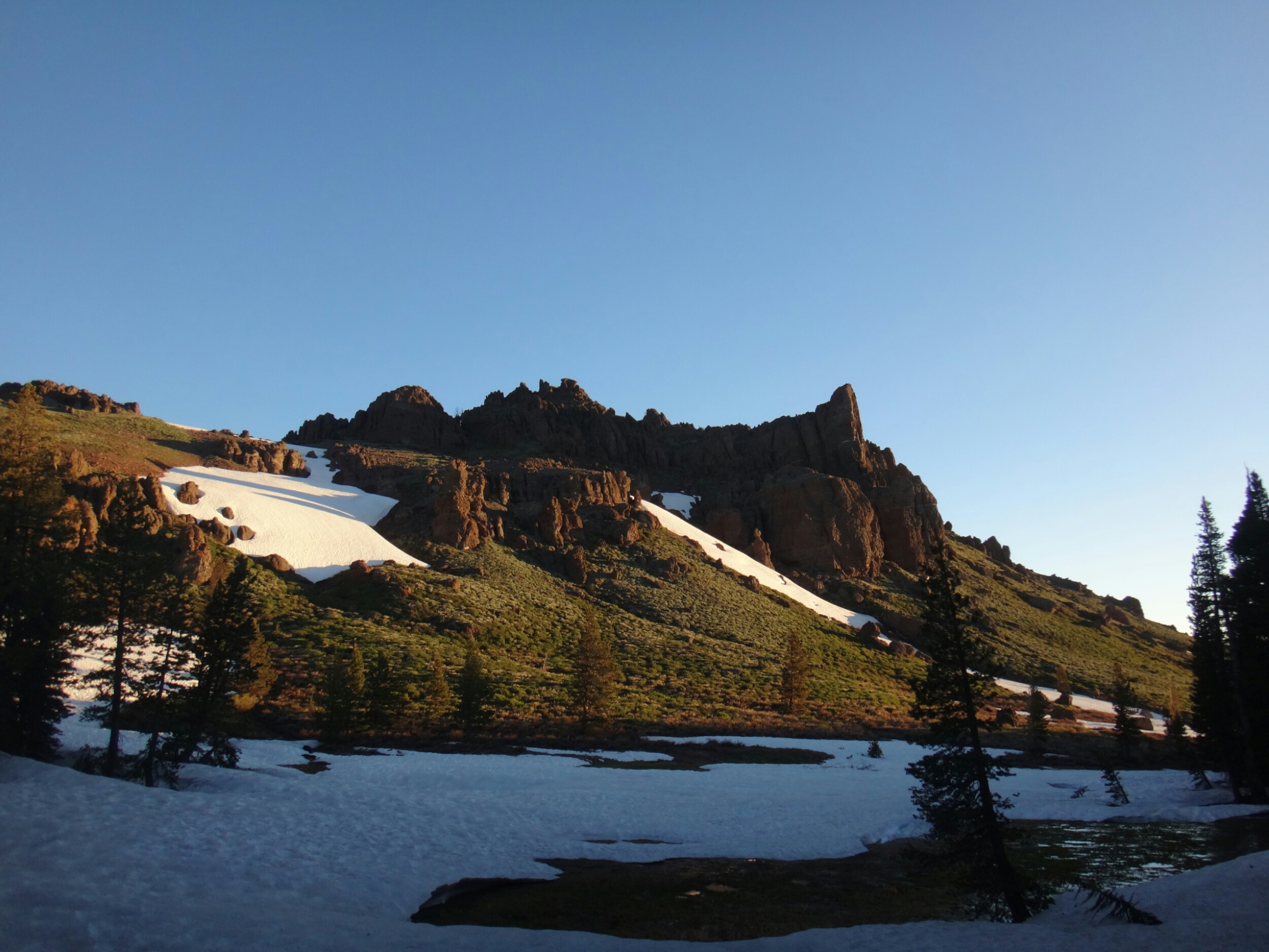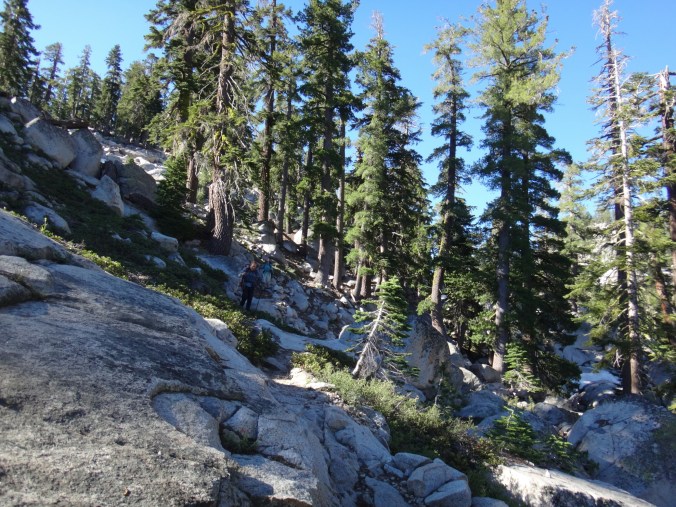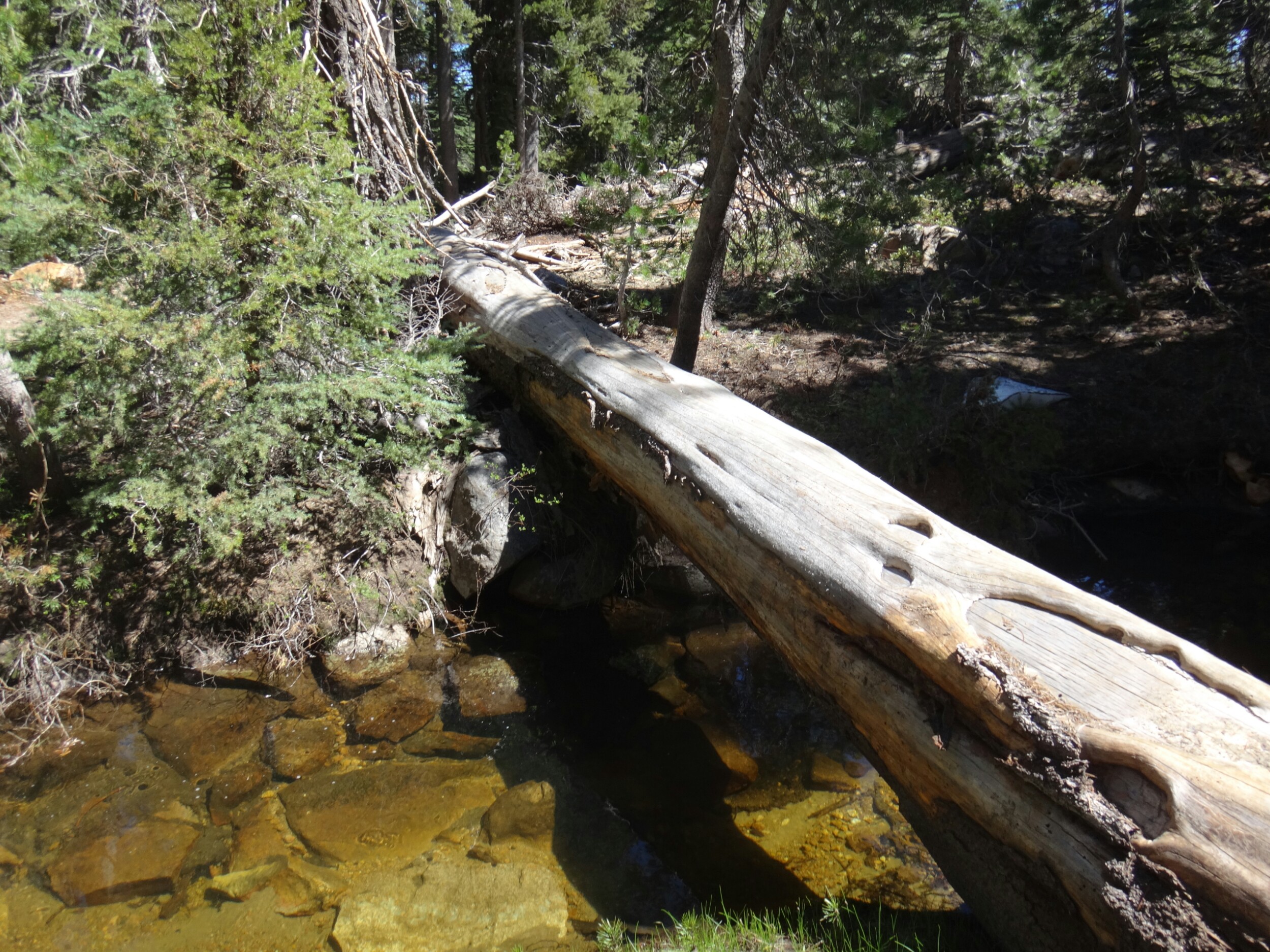 Bohh hab ich heut Nacht schlecht geträumt. War völlig verschwitzt. Naja, die Sonne ging langsam auf und hüllte die angrenzenden Bäume in rot. Wir packten unsere Sachen und ich aß noch eine Zimtschnecke zum Frühstück. Wie liefen durch ein kleine Stück Wald und fanden uns auf einer großen schneereichen Fläche wieder. Die vor uns liegenden Felsen waren feuerrot. Wir schnwenken nach rechts und treffen bald auf trockenen Trail. Allerdings hält das nur teilweise an und wir queren eisige Schneefelder. Am Horizont liegen die verschiedenen Bergketten in unterschiedlichen grautönen. Der Trail wird kurzweilig grüner und wir kommen in einen steinigen Abschnitt. Zur linken liegen hohe Türme aus hellem Stein. Unter den Füßen knirschen Steine und Sand. Hier und da stehen tolle ausgetrocknete Bäume. Wir klettern über einige Felsen nachdem wir über ein Schneefeld gelaufen sind und legen eine Pause ein. Danach kürzern wir den Trail der über Schnee am berghang entlang geht durch das Tal ab und schilddern ins Tal. Alle anderen ziehen dafür wieder ihre Steigeisen an, ich belasse es bei meinen Trailrunnern. Langsam klettern wir weiter den Berg hinauf und können auf der Ridgeline vor uns endlich viel grüne Hügel sehen. Hinter uns ist noch sehr viel weiß. Wir müssen wieder traversieren und sofort treffen wir wieder auf Schnee. Steigeisen wieder an. Steigeisen aus. Über viele Serpentinen geht es durch ein Tal hinab und hinauf. Das Gelände ist wie in der Wüste. Kahl. Wir laufen und laufen und machen gute Kilometer. Der Trail ist größtenteils schneefrei. Nach ein paar Kurven auf einem buschigen bergab mit toller Aussicht auf einen weit entfernten Wasserfall machen wie nochmals Pause unter ein paar Bäumen. Die Ameisen laufen überall. Auch auf uns herum. Nach nur wenigen Metern kommen wir an eine riesige Schneewand. Der Trail ist verschwunden. Wir entschließen uns für den sicheren Weg und steigen ins Tal ab um dann einen langen und anstrengenden Aufstieg zurück zum Trail zu nehmen. Die ganze Aktion mit erkunden und laufen hat uns für 1,4 km 1,5 Stunden gekostet. Danach waren alle bedient. Ich war total total von Moskitos zerstochen. LovelyHeart hat mir Kortisonsalbe gegeben. Das hilft sofort. Wir machen Mittagspause direkt auf dem Trail. Im Tal liegt ein toller Wald. Wir müssen ca. 30 Bäume überklettern und ein paar Flüsse überqueren. Aber nichts waghalsiges. Wir laufen ziemlich zügig und ich komme ins schwitzen. Wegen den Moskitos habe ich eine lange Unterhose an und mein langes Fleece. Nebenher läuft ein Hörspiel. Kurz vor 16 Uhr sind alle einigermaßen platt und wir laufen nur noch bis zum nächsten Fluss. Wir finden tolle Plätze nebenan und machen es uns gemütlich. Meine Socken hängen zum trocknen und wir kochen in gemeinsamer Runde. Anschließend sitzen wir noch längere Zeit vor unseren Zelten und schnacken. Griz flickt nebenher noch ein Loch in seiner Luftmatratze. Es sind noch 40 km bis zum Highway 50. Vielleicht sind wir in zwei Tagen da. 🙂