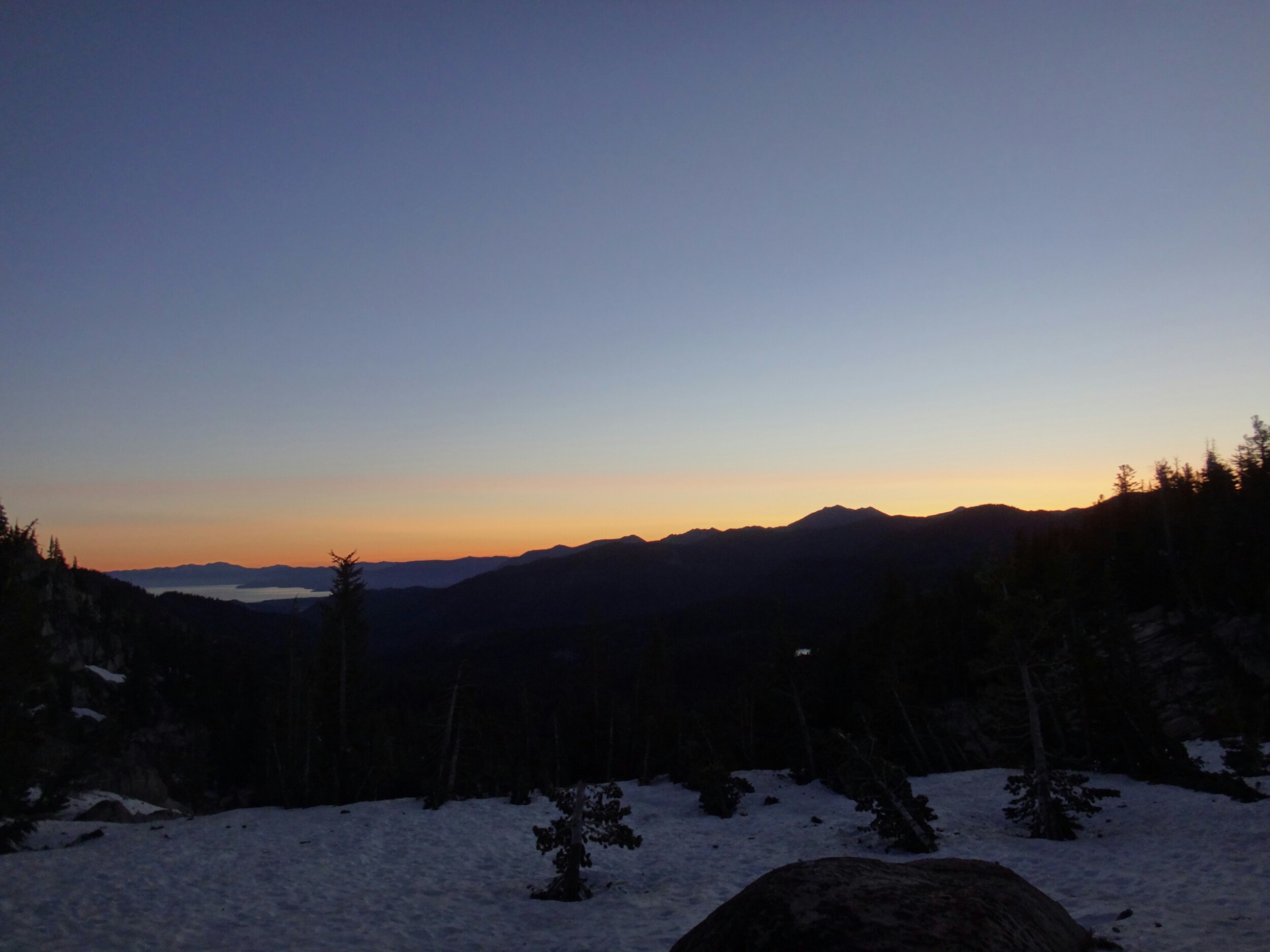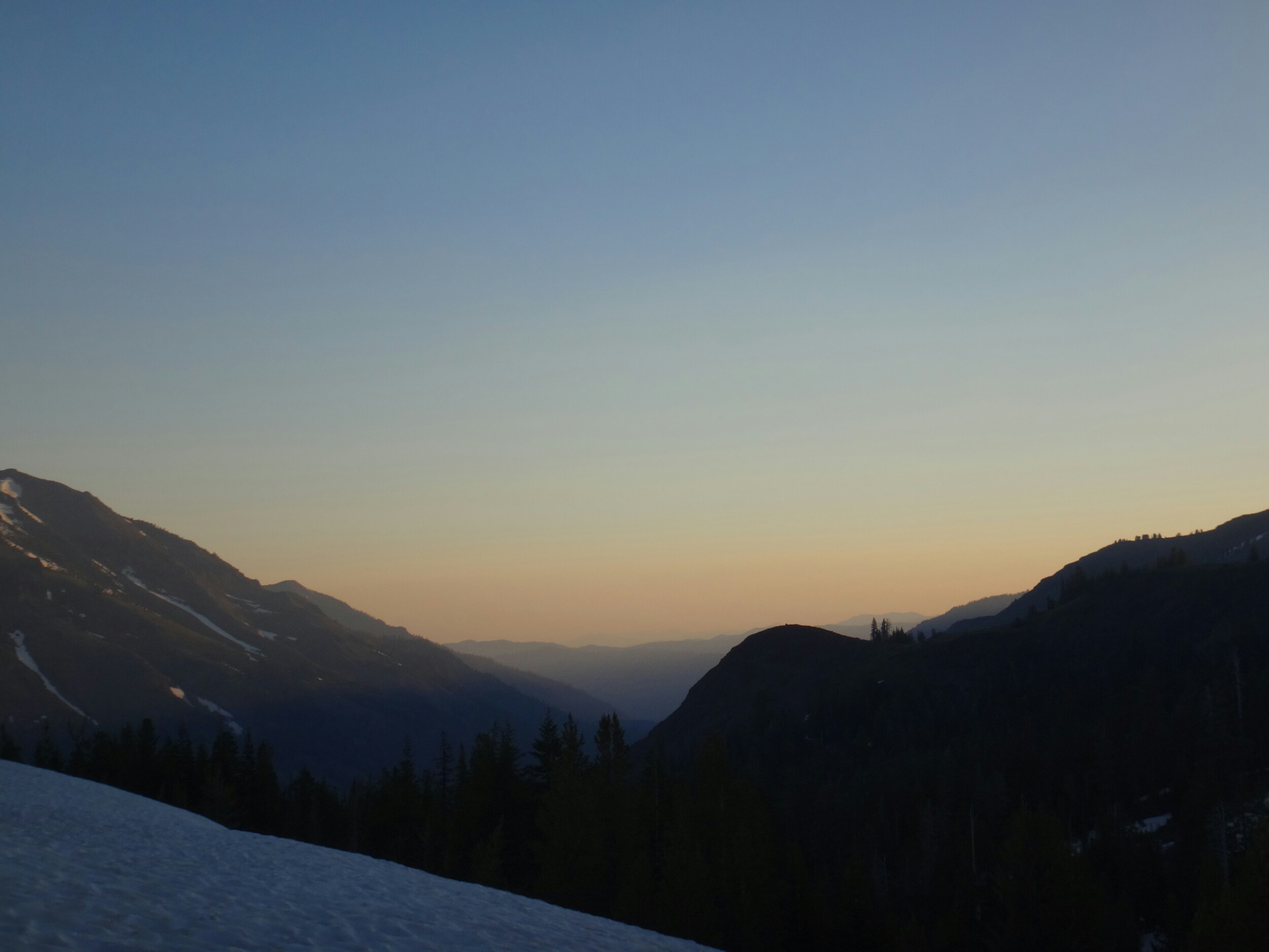 Ich hab wieder von einem Bären geträumt der die Nase durch die Zeltwand an meine. Kopf stupst. Als ich aufgewacht bin war allerdings keiner da obwohl ich in der Nacht draußen etwas laufen habe hören. Griz war ebenfalls der Meinung. Frische Spuren haben wir gestern auf jeden Fall gefunden. Nur gsnz entfernt im Wald war ein wenig vom kommenden Sonnenaufgang zu sehen während wir unsere Sachen packen. Ich war nal wieder 15 min zu früh fertig und habe mit heut den Wecker später gestellt. Wir liefen direkt mittels eines Baumstamms über den angrenzenden Fluss und mussten boch 700n bis zur Blue Lake Road hinter uns bringen. Die Helligkeit war inzwischen ausreichend und ich lief ohnehin die ganze Zeit ohne Kopflampe. Wir legten eine Delayer Pause ein und jeder war so warm dass die Regen/ oder Daunenjacke runter konnte. Nur ich warte damit immer ziemlich lange. Wir gehen in den angrenzenden Wald und treffen direkt auf massig Schnee. Also wieder Pause und Crampons an. Nach 3 Minuten stehen wir wieder auf dem trockenen Trail und wandern Richtung Nipple Peak hinauf. Es ist steinig und viel Wasser und Matsch beherrschen den Trail. Je höher wir steigen desto näher kommen wir der Sonne bis wir auf einem Schneefeld geradlinig aufsteigen und die ersten Strahlen abbekommen. Alles hüllt sich in rotes Licht und es herrscht eine tolle Stimmung. Ich werfe lange Schatten als ich über die Kuppel laufe und wir verschwinden wieder dahinter im Wald. Über Schneehügel, unseren Erzfeinden, legen wir einige Kilometer zurück und Griz legt sich zum ersten Mal heute hin. Dafür kommen wir kurze Zeit später aus dem Wald und können über offene Hügelketten die nun toll blühen die Aussicht genießen und schneefreie Kilometer machen. Auf einem Bergrücken legen wir dann gegen 7 Uhr die erste Pause ein. Ich versuche über Griz Handy Saucony Peregrin 6 zu bestellen. Allerdings idt die Lieferzeit zu lang für South Lake Tahoe und der Preis wird auch immer teuerer. 200 Dollar, in Deutschland hsbe ich 80 € bezahlt. Dabei sind die echt einfach super bequem und halten auch lang. Meine jetzigen sind an der Verse durch und reizen diejenige ebenfalls. Mal schauen. Uns überholen zwei fremde wanderer im eiltempo und wir folgen ihnen nachdem wir die Zimmer reserviert haben. Am Berg entlang immer höher queren wir noch ein großes Schneefeld das super eisig ist. Zur linken liegen viele Seen die nun das Eis brechen und langsam in ihre ursprüngliche Form zurückkehren. Es bieten sich tolle Aussichten. Grüne Wälder und Seen. Schneebedeckte Berge. Wir steigen lsngsam über ein eisiges und steiles Schneebrett bevor wir wieder auf rockenen Trail stoßen. Dann geht es wieder in eine Wald und wir kämpfen uns über Hügel und zwischen Bäumen hindurch. Wenn wir auf Schnee laufen ist die Hitze brutal. Hingegen ist die Temperatur auf dem steinigen Trail erträglich. Wir kommen wieder hinaus und laufen auf der gewohnten Ridgeline. Es idt so schön und entspannt auf diesem Trail zu laufen. Die Blumen blühen und wir legen auf einem tollen Plateau eine weitere Pause ein und genießen die Aussicht. Ins Tal laufen wir wieder quer Feld ein und überqueren einen See und mehrere Bäche bis wir über mehrere Schneefelder die Serpentinen auf der anderen Seite erreichen. Geiz fällt bis zur Hüfte in rin Schneeloch bevor es durch den eingeengten Trail weiter hinauf geht. Hier laufen nicht viele her und die Büsche ragen teilweise weit hinein. Über das größte Schneefeld für heute kommen wir zu einem See an dem wir Mittag einlegen. Gerade als wir aufbrechen wollen kommen uns 3 Tageswanderer entgegen. Bis zum Highway ist es nicht mehr weit und wir werden von 2 sehr netten Dsmen begrüßt. Wir bekommen frisches Obst, Gemüse, kalte Sodas und eine Box mit allerlei. Wie unterhalten uns, tragen uns ins Trailregister ein und verbreiten unser Video. Viele Hiker werden selbst hier noch vom Schnee verschreckt. Die Hütte war total unter Schnee verdeckt. Das teil ist mindestens 5 Meter hoch! Wir überqueren die Straße und folgen dem Trail. Es ist nun sehr sandig. Es kommen uns viele Wanderer entgegen denen wir alle Rede und Antwort stehen… Irgendwann ist mal genug erzählt und wir haben alle abgearbeitet und können den Trail genießen. Die Landschaft ist sehr weitläufig und super zu laufen. Ab und an versinken wir im Matsch. Wir erklimmen eine Hügel. Berge gibt es für uns hier nicht mehr. Berge sind weiße Riesen auf denen man sich Sonnenbrand holt, die man nicht ohne Steigeisen betritt, die man nicht ohne Eisaxt anfasst, auf denen man Respekt bekommt, die gefährlich aussehen und auch sind. Alles was hier hoch und runter geht lässt selbst unsere Füße und Muskeln zum Glück größtenteils kalt. Aber die kommen bestimmt wieder ans Kochen. Der Trail schwingt ins Tal und nun beginnt die Matschschlacht. Es fließt das Wasser und wir versinken im braunen Matsch. In einigen Flüssen können wir uns dann sauber laufen bevor es wieder losgeht. Zum Shower Lake geht es einen lsngen Berghang hinauf. Wie kämpfen uns sb vom Trail durch Marschland. Durch Sträucher und nasse Wiesen die wie Bäche sind. Im Tal lassen die Frösche alles raus was geht. Bei uns greifen die Mosquitos an. Ich werde ebenfalls Opfer. Ich hasse die Teile! Wir finden einen tollen Platz direkt am See. Dieser ist leider noch zugefroren. Wie hängen die nassen Socken auf und stellen die Schuhe in die Sonne. Dann folgt der übliche aufbau. Wir kochen zusammen und ich wasche meine Füße im Slush auf dem See. Rattler erzählt noch Stories von seiner Pilotenkarriere. Dann ist es schon spät und eine steife Briese fegt uns dann voller Vorfreude auf die Schlafsäcke in unsere Zelte.