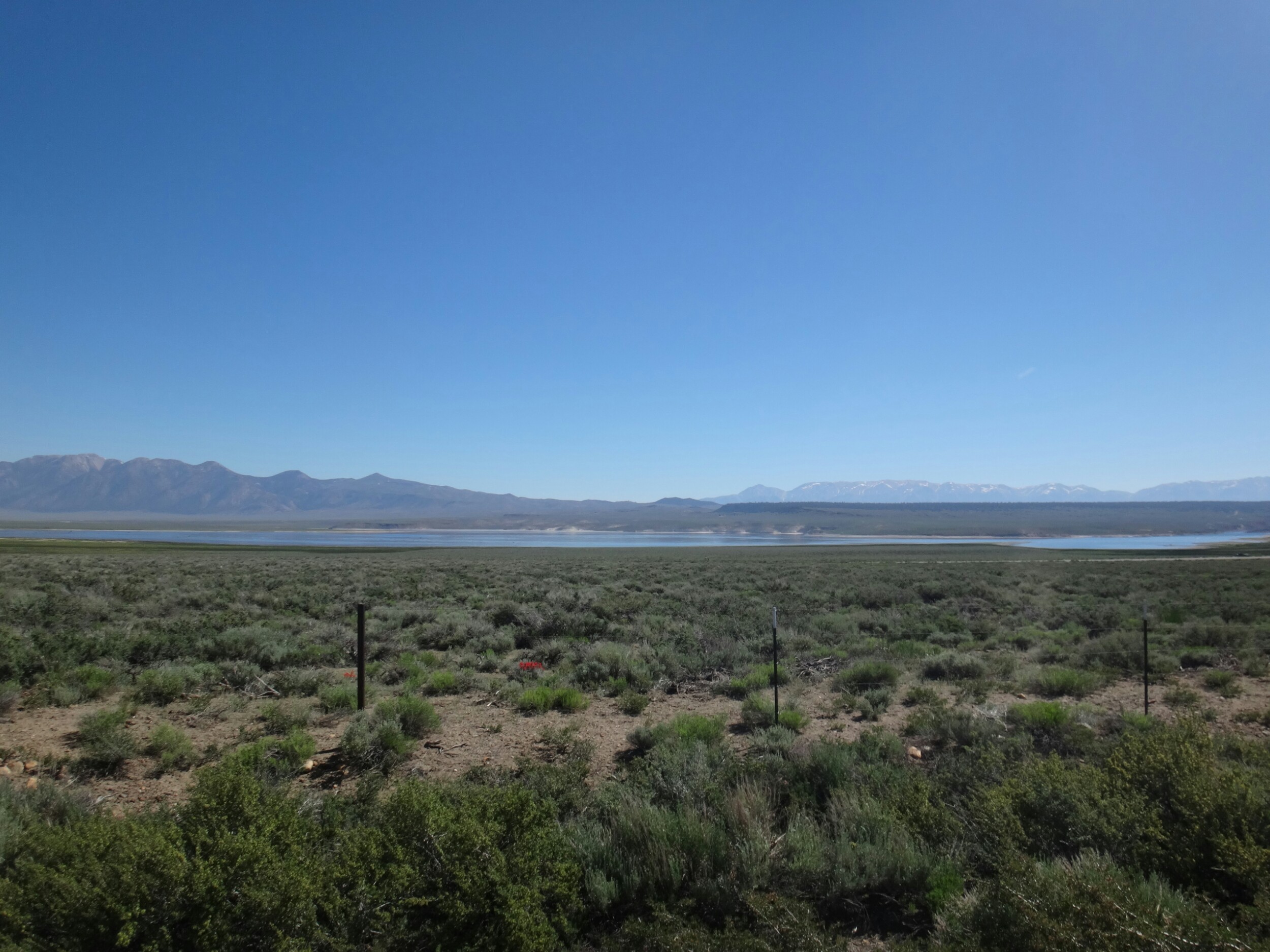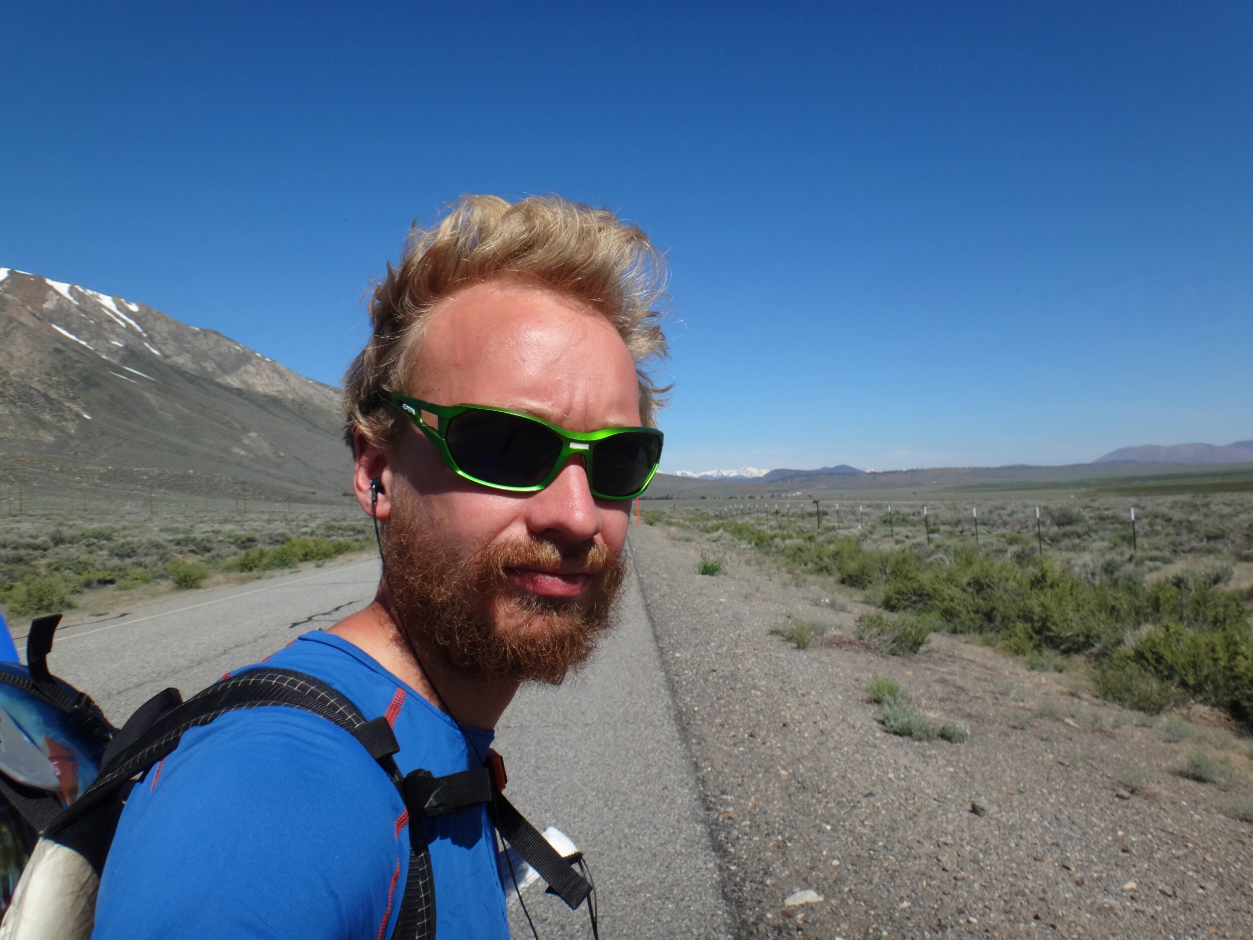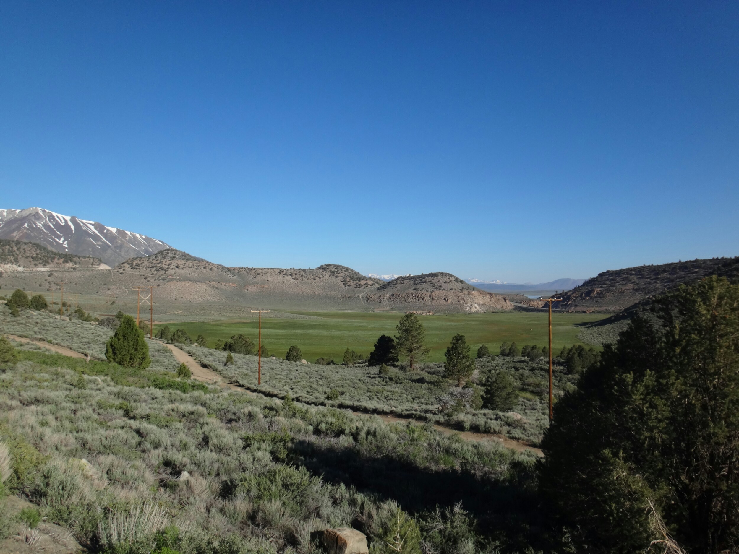 Ich bin nicht wirklich früh gestartet. Gegen 7 ging es glaube ich los. Das selbe Trauerspiel wie gestern. Straßen die niemals enden. Es ist einfach ernüchternd und die Schmerzen verhelfen nicht gerade bei der Motivationsförderung. Allerdings ist es hier sehr schön und vor dem Highway liegt eine riesige Wiese wie sie eigentlich auch in den High Sierras öfters zu sehen sein sollte. Ich winke jedem Auto und Fahrradfahrer zu. Wer weiß, vielleicht wohnt einer direkt hier und lädt mich später auf ein kaltes Getränk ein 😉
