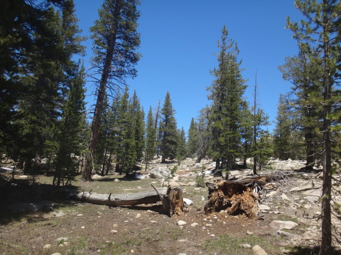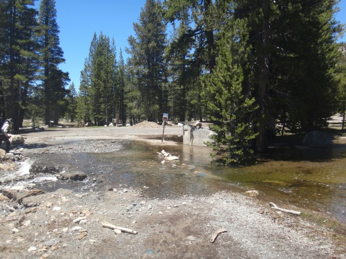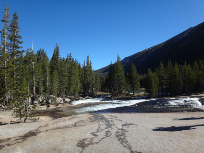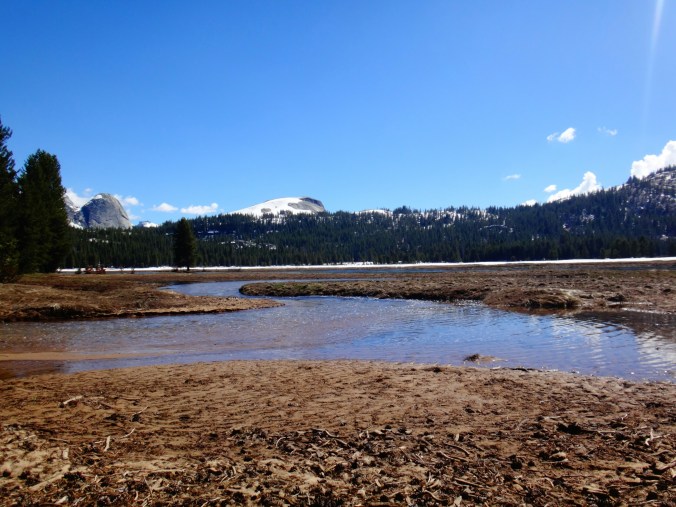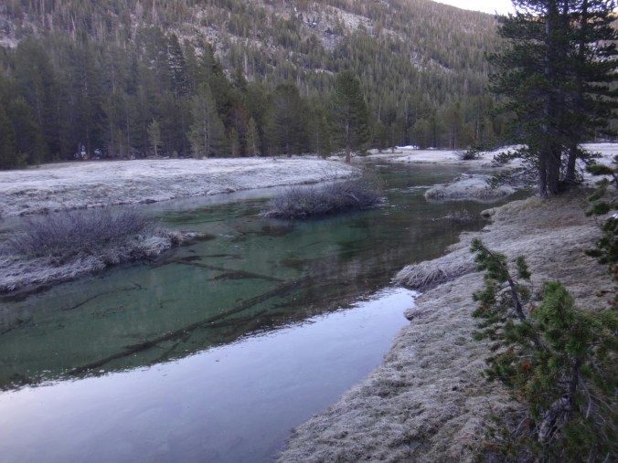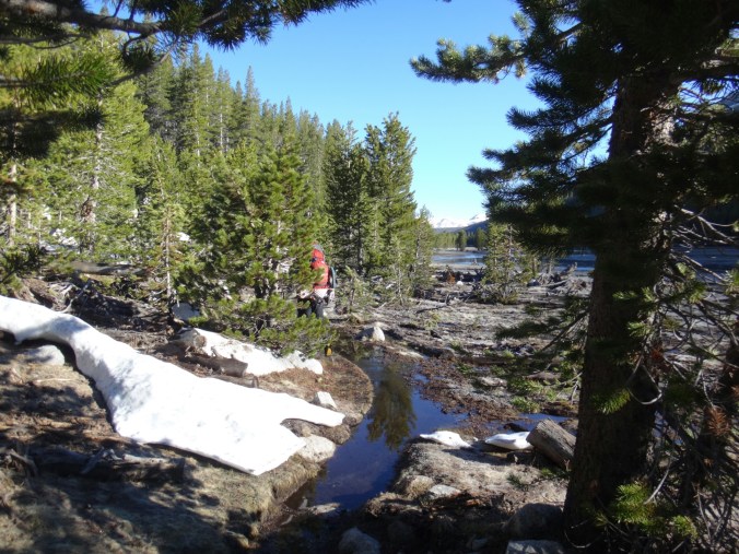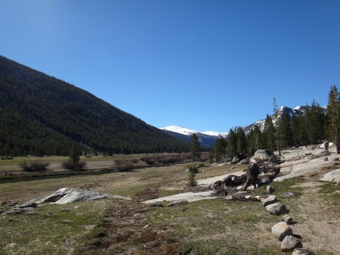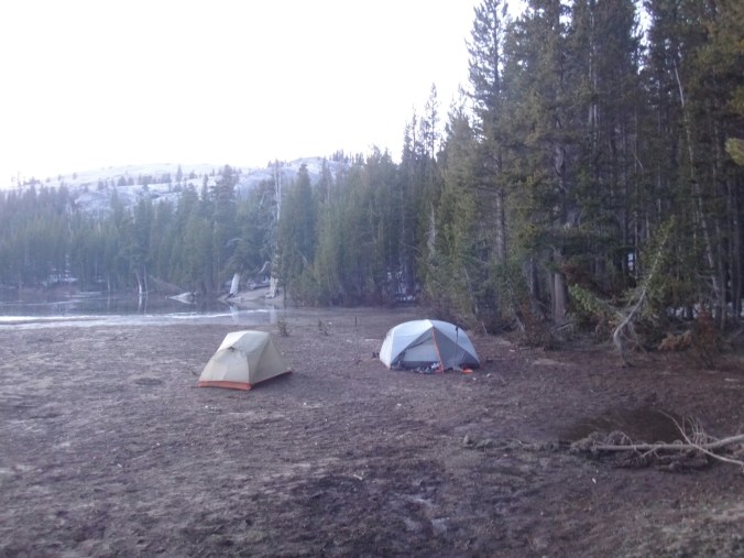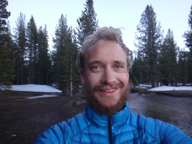 Habe beim einschlafen von Bären geträumt. Mit Kopfhörer konnte ich die nächtliche geräuschkulisse dämpfen und habe zum ersten mal fast durch geschlafen. Um 4.20 dann wieder aufstehen. Es ist nicht so kalt wie gestern. Der Mond steht noch über den Bergen als wir gegen 5 los ziehen. Ich führe die Gruppe durch rin Waldstück hinab zum Fluss. Diesen können wir auf einer Holzbrücke überqueren und wir laufen über Schnee weiter am Fluss entlang. Wir sind ein wenig ab vom Trail und ich fsnge an links den Berg zu besteigen. Wir passieren einige enge Stellen und steile Passagen. Als das Tal schon unter unseren Füßen müssen wir nochmals einen langen und steilen Hang zwischen zwei Felsformationen absteigen. Nicht alle sind mit dieser Situation merklich zufrieden und setzen ein wenig Angstschweiß im Gesicht an. Aber wir kommen alle heile und ohne Sturz unten an. Hier treffen wir auch wieder auf Spuren den wir in den Wald folgen. An einem schönen Platz machen wir nach einer Stunde und 1,7 km die erste Pause. Die Sonne ist noch nicht aufgegangen und es wird kälter. Die letzten paar Schritte ins Tal suchen wir uns zwischen Traul und Schnee immer wieder aufs neue. Das Tal ist wunderschön. Ebene Grasflächen. Ein Fluss der sich schlängelt und kristalklar den Flussboden zeigt. Rechts und links hohe Berge mit vielen Steinen und Bäumen. Wir laufen durch so gut es geht auf einem markiertem Trail der aber sehr oft unter Wasser steht. Der Weg ist mit dem Spaten ausgestochen. Immer wieder kommen wir durch kleine Tannenschonungen und hier und da kommen Felsen aus dem Boden. Gegen 7 geht in Tal auch die Sonne auf und der Ort verschönert sich nochmals um ein vielfaches. Von den leicht gefrorenen Tümpeln steigt der Nebel hinauf und die ersten Murneltiere schauen aus ohren Behausung. Wir laufen so voller Freunde einige Kilometer durch das Tal welches sich sehr lang zieht. An einer tollen Wasserrutsche aus Granit machen wir in der Sonne pause. RockDoc hat Probleme mit ihrem Knie und wird von Griz mit Kinetischem Bandagen betreut. Wir laufen wieter und laufen nun auch öfters über glatte Festplatten. Durch einen dichten Wald verlieren wir unter zu viel Schnee den Trail und landen wieder auf einer großen wassergetränkten Wiese. Rechts läuft ein junger Hirsch. Wir warten auf RockDoc und Griz und machen wieder eine Pause. Wir queren einige Flüsse auf Baumstämmen oder Brücken. Da ich sowieso nasse Füße habe laufe ich durch alles hindurch. Nach dem Lyell Creek legen wir unter einem Baum die Mittagspause ein. Auf der naheliegenden Straße die noch gesperrt ist treffen wir zwei Ranger. Kurzer Smaltalk über die gefluteten und zerstörten Brücken vor uns und wir laden am Trailparkplatz unseren Müll in die Abfalleimer. Es geht weiter über große Wiesen. Links liegen schneebedeckte Berge und große Granitpfeiler. Auf der anschließenden Schotterstraße treffen wir noch zig Rehe an die auf den benachbarten Wiesen stehen. Das Gelände wird jetzt steiniger. Wir laufen über Steinstufen und an Nadelbäumen vorbei die insgesamt ein stimmiges Bild abgeben wie ich mir es für diesen Part auch vorgestellt habe. Leider stoßen wir immer wieder auf größere Schneefelder. Die kalten Flüsse sind hier zum Glück nicht zu hoch und wild. Neben uns liegt aber der Tuolumne der mindestens doppelt so groß wie normal ist. Wir laufen und laufen und Griz meldet Erschöpfung an. Wir queren noch den letzten Fluss für heute und schlagen die Zelte direkt dahinter und am Tuolumne River auf. Wie kühlen unsere Füße im Wasser und genießen die Sonne. Bauen die Zelte auf und kochen gemeinsam vor meinem Zelt. Danach macht sich jeder fertig und wir verschwinden im Zelt. Ich hatte das Gefühl, dass der überquerte Fluss während unserer Anwesenheit ansteigt und hab eine Markierung gesetzt. Und tatsächlich. Er steigt und steigt. Wir haben natürlich alle ein paar Meter weiter auf gerade getrocknetem Flussbett unsere Zelte aufgebaut. Ich beobachten das Wasser und muss wahrscheinlich auch mal heut Nacht kurz den Pegel checken 😉