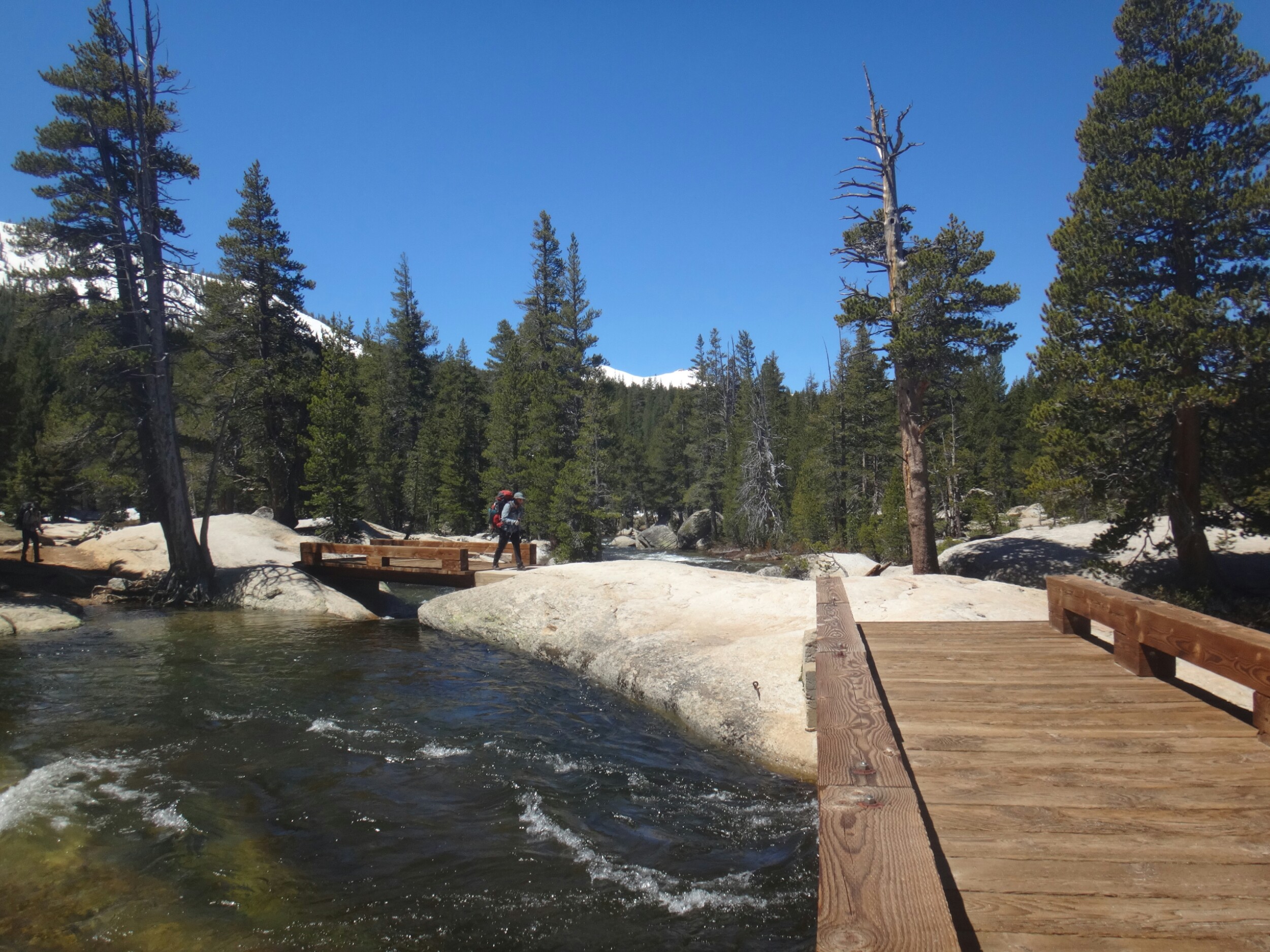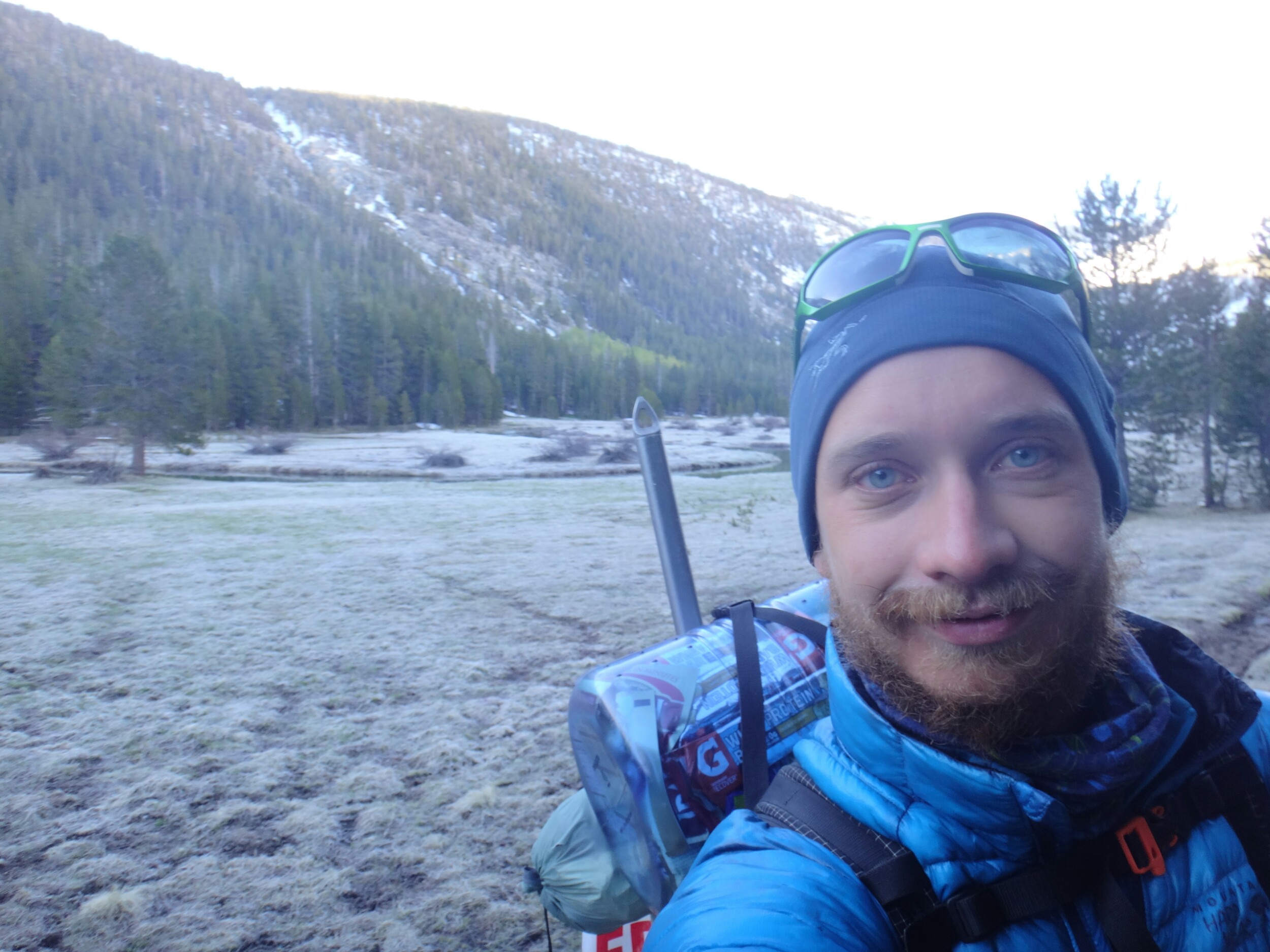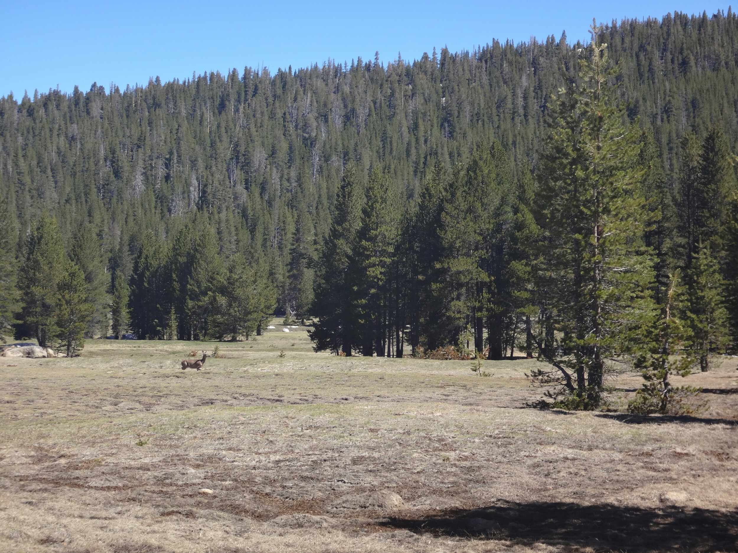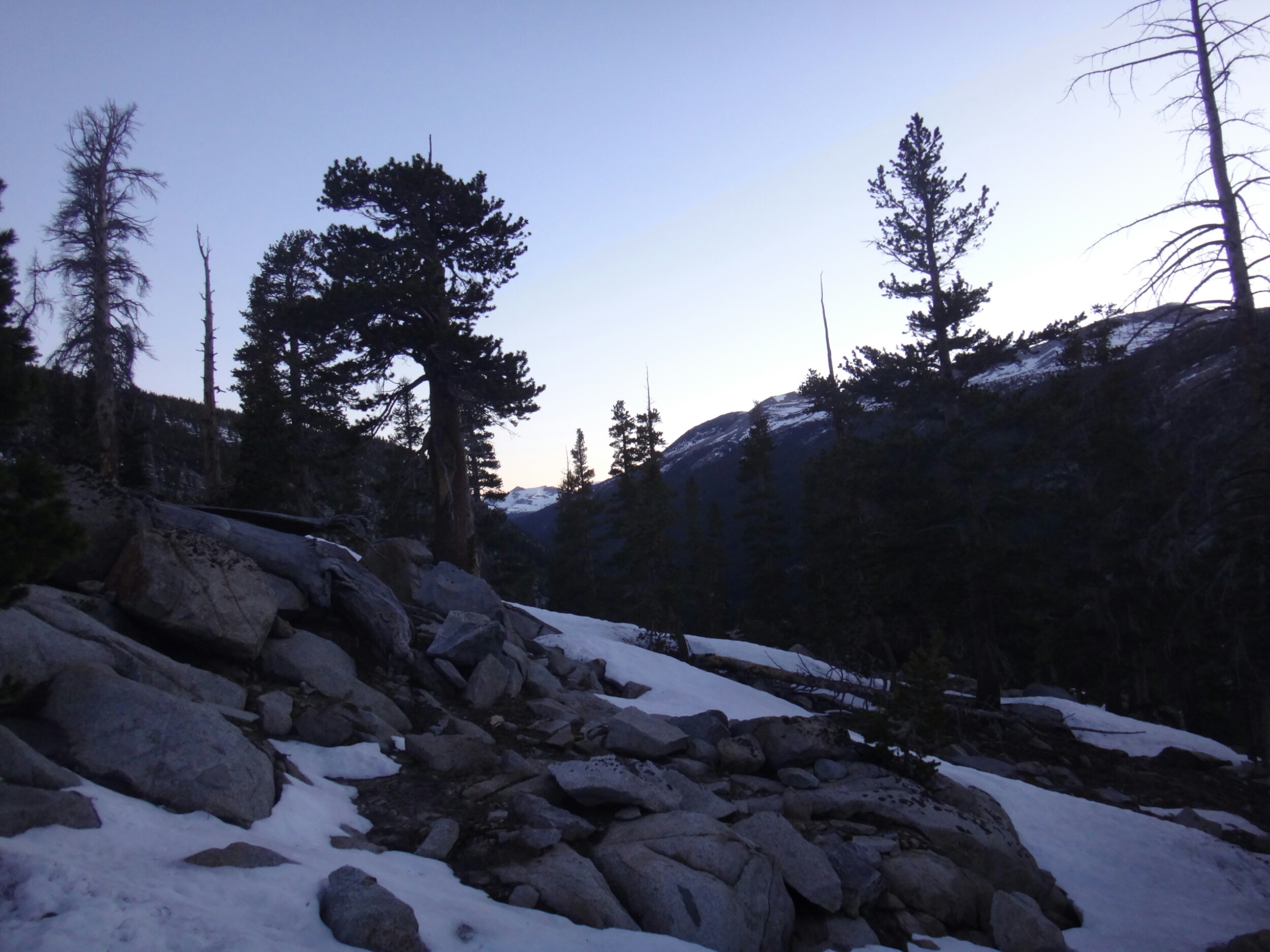 Habe beim einschlafen von Bären geträumt. Mit Kopfhörer konnte ich die nächtliche geräuschkulisse dämpfen und habe zum ersten mal fast durch geschlafen. Um 4.20 dann wieder aufstehen. Es ist nicht so kalt wie gestern. Der Mond steht noch über den Bergen als wir gegen 5 los ziehen. Ich führe die Gruppe durch rin Waldstück hinab zum Fluss. Diesen können wir auf einer Holzbrücke überqueren und wir laufen über Schnee weiter am Fluss entlang. Wir sind ein wenig ab vom Trail und ich fsnge an links den Berg zu besteigen. Wir passieren einige enge Stellen und steile Passagen. Als das Tal schon unter unseren Füßen müssen wir nochmals einen langen und steilen Hang zwischen zwei Felsformationen absteigen. Nicht alle sind mit dieser Situation merklich zufrieden und setzen ein wenig Angstschweiß im Gesicht an. Aber wir kommen alle heile und ohne Sturz unten an. Hier treffen wir auch wieder auf Spuren den wir in den Wald folgen. An einem schönen Platz machen wir nach einer Stunde und 1,7 km die erste Pause. Die Sonne ist noch nicht aufgegangen und es wird kälter. Die letzten paar Schritte ins Tal suchen wir uns zwischen Traul und Schnee immer wieder aufs neue. Das Tal ist wunderschön. Ebene Grasflächen. Ein Fluss der sich schlängelt und kristalklar den Flussboden zeigt. Rechts und links hohe Berge mit vielen Steinen und Bäumen. Wir laufen durch so gut es geht auf einem markiertem Trail der aber sehr oft unter Wasser steht. Der Weg ist mit dem Spaten ausgestochen. Immer wieder kommen wir durch kleine Tannenschonungen und hier und da kommen Felsen aus dem Boden. Gegen 7 geht in Tal auch die Sonne auf und der Ort verschönert sich nochmals um ein vielfaches. Von den leicht gefrorenen Tümpeln steigt der Nebel hinauf und die ersten Murneltiere schauen aus ohren Behausung. Wir laufen so voller Freunde einige Kilometer durch das Tal welches sich sehr lang zieht. An einer tollen Wasserrutsche aus Granit machen wir in der Sonne pause. RockDoc hat Probleme mit ihrem Knie und wird von Griz mit Kinetischem Bandagen betreut. Wir laufen wieter und laufen nun auch öfters über glatte Festplatten. Durch einen dichten Wald verlieren wir unter zu viel Schnee den Trail und landen wieder auf einer großen wassergetränkten Wiese. Rechts läuft ein junger Hirsch. Wir warten auf RockDoc und Griz und machen wieder eine Pause. Wir queren einige Flüsse auf Baumstämmen oder Brücken. Da ich sowieso nasse Füße habe laufe ich durch alles hindurch. Nach dem Lyell Creek legen wir unter einem Baum die Mittagspause ein. Auf der naheliegenden Straße die noch gesperrt ist treffen wir zwei Ranger. Kurzer Smaltalk über die gefluteten und zerstörten Brücken vor uns und wir laden am Trailparkplatz unseren Müll in die Abfalleimer. Es geht weiter über große Wiesen. Links liegen schneebedeckte Berge und große Granitpfeiler. Auf der anschließenden Schotterstraße treffen wir noch zig Rehe an die auf den benachbarten Wiesen stehen. Das Gelände wird jetzt steiniger. Wir laufen über Steinstufen und an Nadelbäumen vorbei die insgesamt ein stimmiges Bild abgeben wie ich mir es für diesen Part auch vorgestellt habe. Leider stoßen wir immer wieder auf größere Schneefelder. Die kalten Flüsse sind hier zum Glück nicht zu hoch und wild. Neben uns liegt aber der Tuolumne der mindestens doppelt so groß wie normal ist. Wir laufen und laufen und Griz meldet Erschöpfung an. Wir queren noch den letzten Fluss für heute und schlagen die Zelte direkt dahinter und am Tuolumne River auf. Wie kühlen unsere Füße im Wasser und genießen die Sonne. Bauen die Zelte auf und kochen gemeinsam vor meinem Zelt. Danach macht sich jeder fertig und wir verschwinden im Zelt. Ich hatte das Gefühl, dass der überquerte Fluss während unserer Anwesenheit ansteigt und hab eine Markierung gesetzt. Und tatsächlich. Er steigt und steigt. Wir haben natürlich alle ein paar Meter weiter auf gerade getrocknetem Flussbett unsere Zelte aufgebaut. Ich beobachten das Wasser und muss wahrscheinlich auch mal heut Nacht kurz den Pegel checken 😉