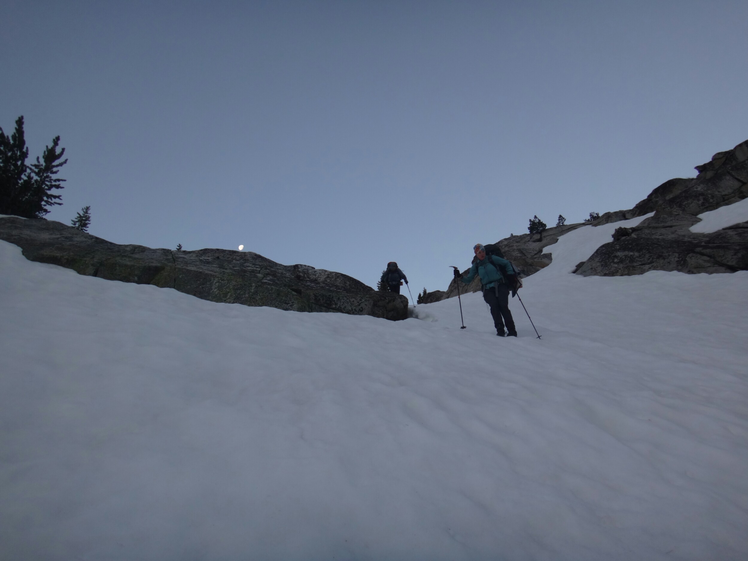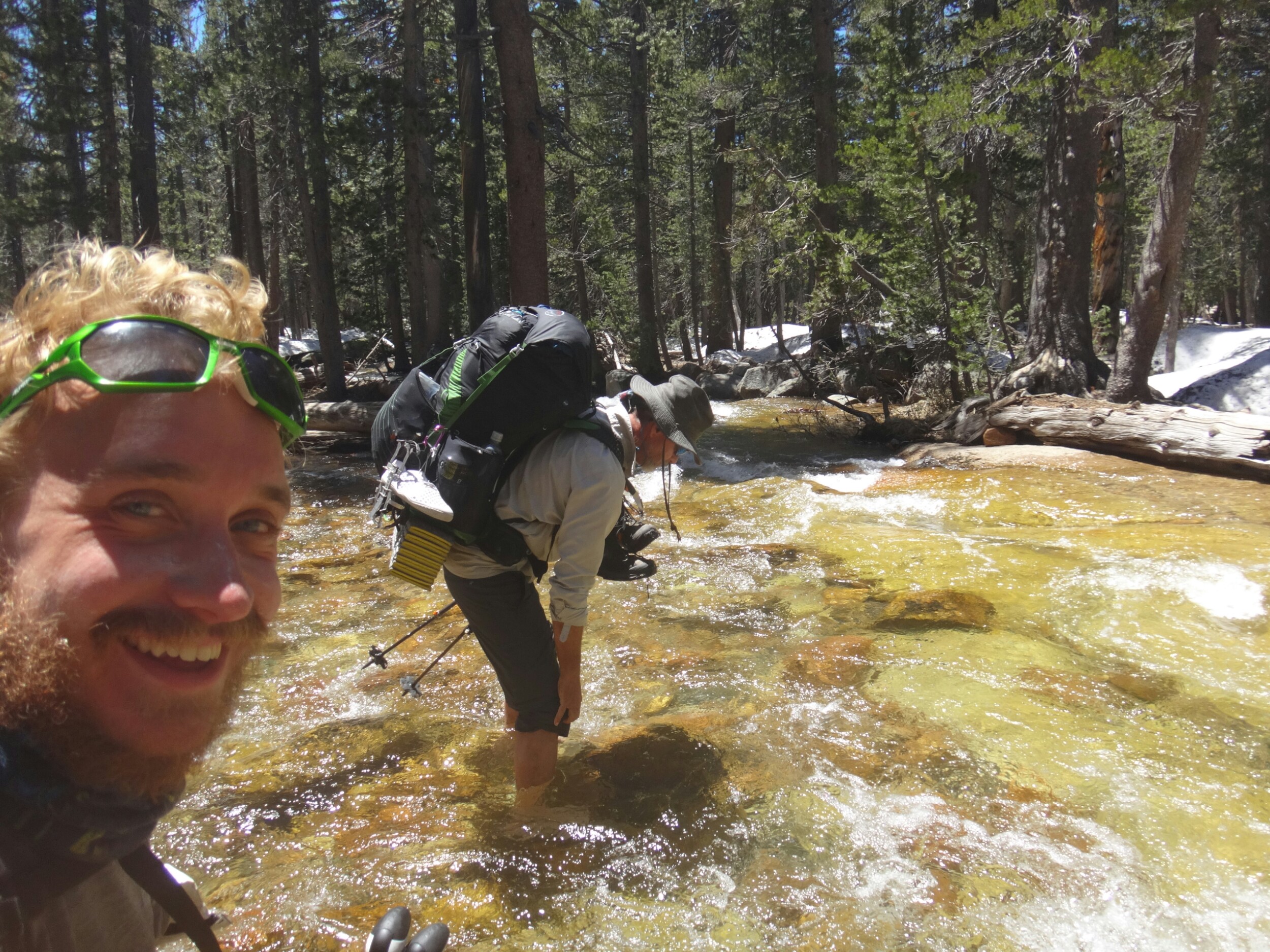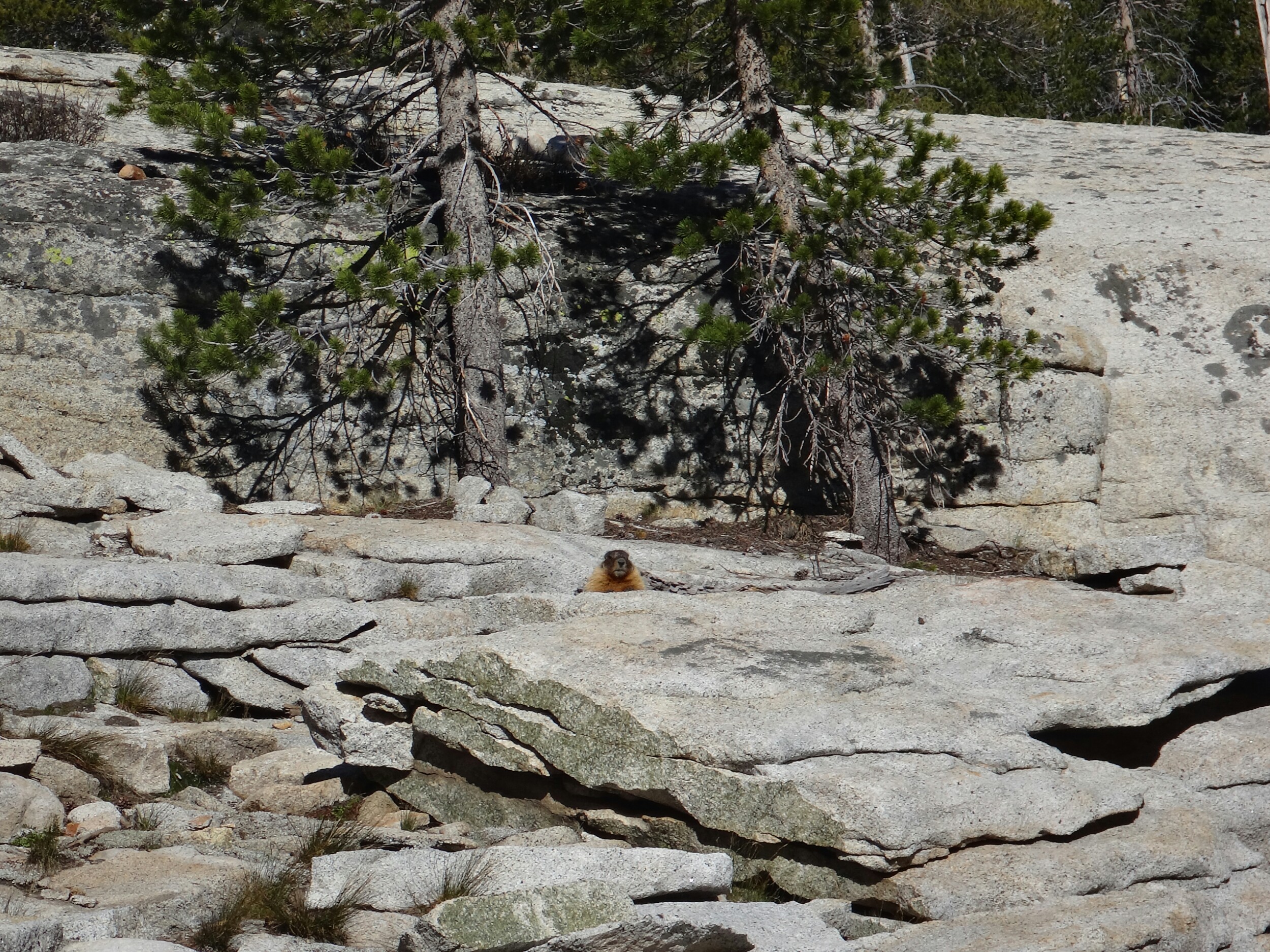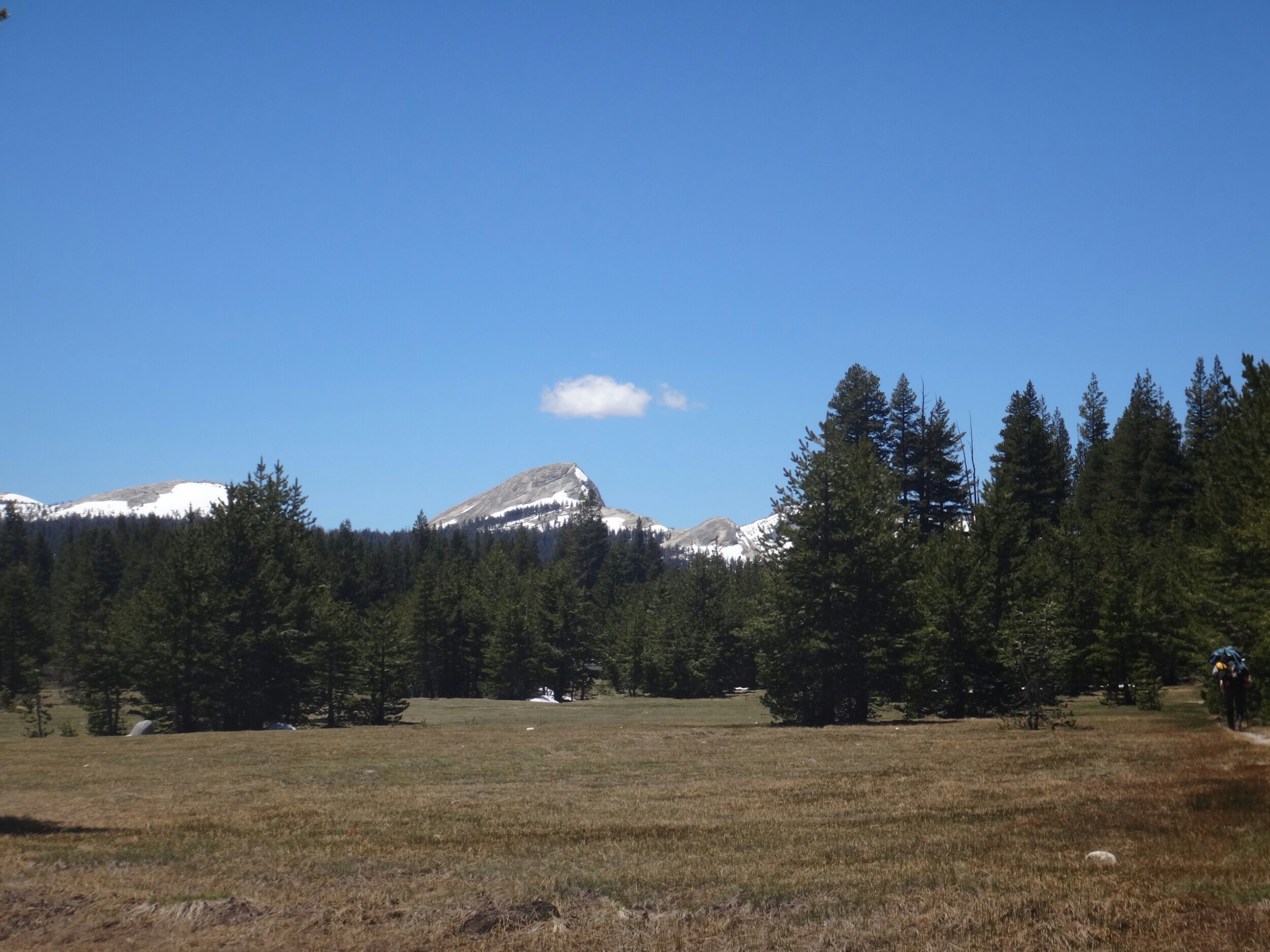Habe beim einschlafen von Bären geträumt. Mit Kopfhörer konnte ich die nächtliche geräuschkulisse dämpfen und habe zum ersten mal fast durch geschlafen. Um 4.20 dann wieder aufstehen. Es ist nicht so kalt wie gestern. Der Mond steht noch über den Bergen als wir gegen 5 los ziehen. Ich führe die Gruppe durch rin Waldstück hinab zum Fluss. Diesen können wir auf einer Holzbrücke überqueren und wir laufen über Schnee weiter am Fluss entlang. Wir sind ein wenig ab vom Trail und ich fsnge an links den Berg zu besteigen. Wir passieren einige enge Stellen und steile Passagen. Als das Tal schon unter unseren Füßen müssen wir nochmals einen langen und steilen Hang zwischen zwei Felsformationen absteigen. Nicht alle sind mit dieser Situation merklich zufrieden und setzen ein wenig Angstschweiß im Gesicht an. Aber wir kommen alle heile und ohne Sturz unten an. Hier treffen wir auch wieder auf Spuren den wir in den Wald folgen. An einem schönen Platz machen wir nach einer Stunde und 1,7 km die erste Pause. Die Sonne ist noch nicht aufgegangen und es wird kälter. Die letzten paar Schritte ins Tal suchen wir uns zwischen Traul und Schnee immer wieder aufs neue. Das Tal ist wunderschön. Ebene Grasflächen. Ein Fluss der sich schlängelt und kristalklar den Flussboden zeigt. Rechts und links hohe Berge mit vielen Steinen und Bäumen. Wir laufen durch so gut es geht auf einem markiertem Trail der aber sehr oft unter Wasser steht. Der Weg ist mit dem Spaten ausgestochen. Immer wieder kommen wir durch kleine Tannenschonungen und hier und da kommen Felsen aus dem Boden. Gegen 7 geht in Tal auch die Sonne auf und der Ort verschönert sich nochmals um ein vielfaches. Von den leicht gefrorenen Tümpeln steigt der Nebel hinauf und die ersten Murneltiere schauen aus ohren Behausung. Wir laufen so voller Freunde einige Kilometer durch das Tal welches sich sehr lang zieht. An einer tollen Wasserrutsche aus Granit machen wir in der Sonne pause. RockDoc hat Probleme mit ihrem Knie und wird von Griz mit Kinetischem Bandagen betreut. Wir laufen wieter und laufen nun auch öfters über glatte Festplatten. Durch einen dichten Wald verlieren wir unter zu viel Schnee den Trail und landen wieder auf einer großen wassergetränkten Wiese. Rechts läuft ein junger Hirsch. Wir warten auf RockDoc und Griz und machen wieder eine Pause. Wir queren einige Flüsse auf Baumstämmen oder Brücken. Da ich sowieso nasse Füße habe laufe ich durch alles hindurch. Nach dem Lyell Creek legen wir unter einem Baum die Mittagspause ein. Auf der naheliegenden Straße die noch gesperrt ist treffen wir zwei Ranger. Kurzer Smaltalk über die gefluteten und zerstörten Brücken vor uns und wir laden am Trailparkplatz unseren Müll in die Abfalleimer. Es geht weiter über große Wiesen. Links liegen schneebedeckte Berge und große Granitpfeiler. Auf der anschließenden Schotterstraße treffen wir noch zig Rehe an die auf den benachbarten Wiesen stehen. Das Gelände wird jetzt steiniger. Wir laufen über Steinstufen und an Nadelbäumen vorbei die insgesamt ein stimmiges Bild abgeben wie ich mir es für diesen Part auch vorgestellt habe. Leider stoßen wir immer wieder auf größere Schneefelder. Die kalten Flüsse sind hier zum Glück nicht zu hoch und wild. Neben uns liegt aber der Tuolumne der mindestens doppelt so groß wie normal ist. Wir laufen und laufen und Griz meldet Erschöpfung an. Wir queren noch den letzten Fluss für heute und schlagen die Zelte direkt dahinter und am Tuolumne River auf. Wie kühlen unsere Füße im Wasser und genießen die Sonne. Bauen die Zelte auf und kochen gemeinsam vor meinem Zelt. Danach macht sich jeder fertig und wir verschwinden im Zelt. Ich hatte das Gefühl, dass der überquerte Fluss während unserer Anwesenheit ansteigt und hab eine Markierung gesetzt. Und tatsächlich. Er steigt und steigt. Wir haben natürlich alle ein paar Meter weiter auf gerade getrocknetem Flussbett unsere Zelte aufgebaut. Ich beobachten das Wasser und muss wahrscheinlich auch mal heut Nacht kurz den Pegel checken 😉