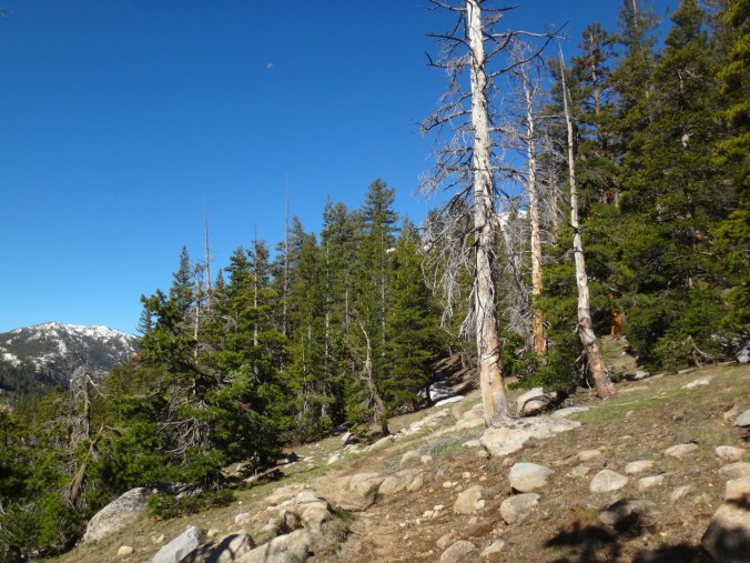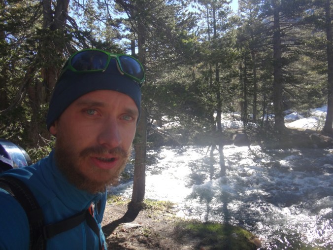 Wir sind um 5 aufgestanden und der erste Blick galt dem McCabe Fluss. Er sah niedriger aus als gestern. Die Anspannung war förmlich zu greifen. Wir packten und standen um 6 am Fluss bereit um die anderen zu treffen. RockDoc war bereit die Überquerung durchzuziehen. Wir gestikulieren mit Zeichensprache über den Fluss da es so laut ist und man kein Wort versteht. Wir warten noch bis die Sonne draußen ist. Wir haben null Grad. Wir warten also auf den Sonnenaufgang und die Anspannung wächst und wächst. Ich laufe die meiste Zeit im Kreis um mich warm zu halten und unterdrücke den ständigen Drang pinkeln zu müssen. Als die Sonne noch ein paar Meter weg ist ziehen sich Rattler und Griz bereits aus und starten die Überquerung. Sie schaffen es zu uns und begrüßen uns mit einer feuchten Unarmung. Nachdem sich die beiden ein wenig aufgewärmt haben fangen Rattler und ich an. Das Wasser fühlt sich warm an. Das kommt davon wenn man bei null Grad in Unterhose wartet. Aber es wurde schnell kalt. Schritt für Schritt. Immer tiefer in die schäumenden Passagen laufe ich mit dem Rücken zum Fluss und Rattler schaut aufwärts. So können wir die starken Kräfte der Stromschnellen bezwingen. Ich suche einen sicheren Stand bevor ich Rattler das Zeichen gebe weiter zu laufen. Wir kommen in den letzten richtig schnellen und tiefen Abschnitt. Mein rechter Schuh wird mir von der Strömung ausgezogen und schwimmt davon. Ich spüre nur noch Schmerzen. Die Kälte nimmt überhand und der Fuß sucht halt auf kleinen Felsen. Kurz bevor wir das Ufer erreichen spüre ich nichts mehr unterhalb der Hüfte. Meine Unterhose und T-Shirt sind nass. Ich laufe aus dem Wasser und mich überkommt ein noch nie dagewesener Schmerz. Es war so arsch kalt. Ich setzte mich und bin den Tränen nahe. Dann reibe ich langsam meine Oberschenkel in der Sonne. Die Füße spüre ich immer noch nicht. In der Zeit kommt auch RockDoc erfolgreich über den Fluss mit Griz. Sie sieht noch mitgenommer aus als ich. LovelyHeart kümmert sich um sie und sie wird mit Wärmepads aufgewärmt. Ich laufe langsam und barfuß über den Waldboden. Meine Füße sind kreideweiß. Die rechte Verse blutet ein wenig. Nur langsam kehrt etwas wärme zurück und ich ziehe kurze Hose und Schuhe an. Wir wärmen uns alle noch ein wenig und packen zusammen. Wir laufen zum nächsten Fluss. Return Creek. In nur 5 min sind wir an der Überquerung angekommen. Gestern ist übrigens noch Eric D. aufgetaucht. Der begleitet uns. Er macht die Überquerung solo. Wir suchen noch nach einer guten Stelle. Er war bis zur Hüfte drin. Das heißt trockene Unterhose aus und nasse wieder an. Rattler und LovelyHeart, danach Griz, RockDoc und ich queren den Fluss. Er ist tiefer und die Strömung lässt RockDoc fast aus den Latschen kippen. Auch hier wieder alle am zittern. Aber die Sonne ist jetzt schon stark und wir wärmen uns auf. Wir wollen uns fertig machen. Ich suche meine Mikrospikes und muss feststellen das ich sie ausgezogen habe um in die Schuhe zu kommen nachdem ich den ersten Fluss überquert habe. Die brauche ich, auch wenn ich Zuspruch benötige um nochmals in den Fluss zu gehen. Griz und ich gehen halt nochmal zurück und ich renne schnell die Mikrospikes holen. Und wieder durch den Fluss. Ohh man. Als wir dann endlich alle fertig sind steigen wir zum Spiller Fluss auf. Leicht am Hang laufen wir erst über Schnee und dann meist durch traumhaftes Gelände. Wir hören den Fluss schon von weitem. Auch hier queren wir wie bereits zuvor durchgeführt ohne Verluste. Es war zwar wieder sehr stark aber wir sind inzwischen sicherer zu dritt und können uns zu 110% auf die anderen verlassen. Auch hier machen wir eine ausgiebige Pause. Es sind zwar erst 2 km geschafft aber wir fühlen uns alle gerädert. Es geht einen wirklich steilen Hang hinauf und ich versuche so angenehm wie möglich zwischen den hohen Nadelbäumen an Höhe zu gewinnen. Es war kein Zuckerschlecken und die Sonne ist heute wieder richtig agressiv. Unter ein paar Bäumen machen wir eine kurze Pause bevor wir zur Mittagspause am See aufbrechen. Eric D. führt an und saust davon. Er ist schnell doch leider nimmt er das falsche Tal und wir müssen am Ende ca.45min extra bergauf und zurück auf den Trail laufen. Alle pusten sowieso schon aus den Löchern und dann das. Wir nagen an unseren Reserven und als wir zurück auf dem Trail sind und immer noch einige Meter bis zum See vorunsliegen beschließe ich auf der Stelle auf ein paar trockenen Steinen und Stellen die Mittagspause einzuläuten. Das kann jetzt jeder gebrauchen. Wir pausieren und erholen uns ein wenig. Wir lassen den See links liegen und queren über die Ridgeline. Es geht jetzt ins Tal hinab zum Matterhorn Creek. Rattler führt uns den beängstigenden steilen Berghang hinab. Wir müssen die Versen tief in den Schnee hauen damit wir überhaupt absteigen können. Wir kloppen so unsere Füße für 1,5 Stunden in den Schnee bis wir nochmal durch einen kleinen Nadelwald Klettereinlagen zwischen Bäumen, Felsen und Schneelöchern einfordern. RockDoc stürzt und ich laufe wieder bergauf. Aber ohne Rucksack. Nachdem sie sich irgendwie wieder zwischen Baumstümpfen und Schnee aufgerichtet hat versucht sie die letzten 4 Meter, sehr steil, abzusteigen. Da es nicht gelingt kommt sie wieder hoch und ich nehme ihren Rucksack den sie schon runter rutschen lassen wollte. Alles gut. LovelyHeart bricht auch noch über einem Fluss ein. Aber alle sind wohl auf als wir gleich danach die Talsohle unter unseren Füßen spüren. Der Matterhorn Creek ist zwar höher als normal sieht aber machbar aus. Ich fackel nicht lange und als ich die tiefe getestet habe bin ich gleich allein weiter durch. Kurz vor Schluss wurde es nochmals richtig anstrengend gegen die Strömung zu kämpfen aber ich habs gepackt. Die anderen ziehen sich auf der anderen Seite noch um während ich mit Eric D. in der Sonne sitzte. Als Pärchen kommen die anderen dann auch über den Fluss und ich helfe Rock