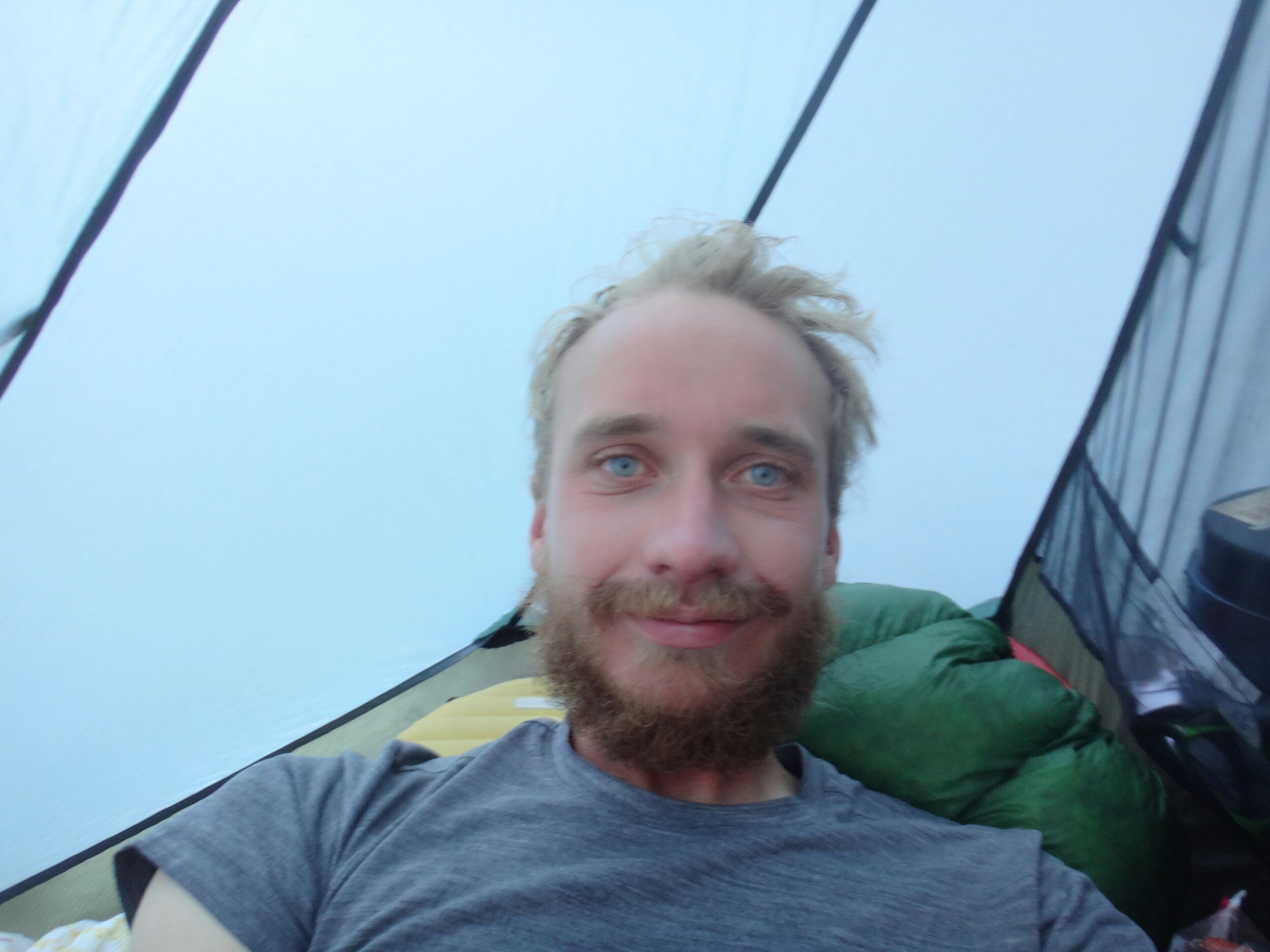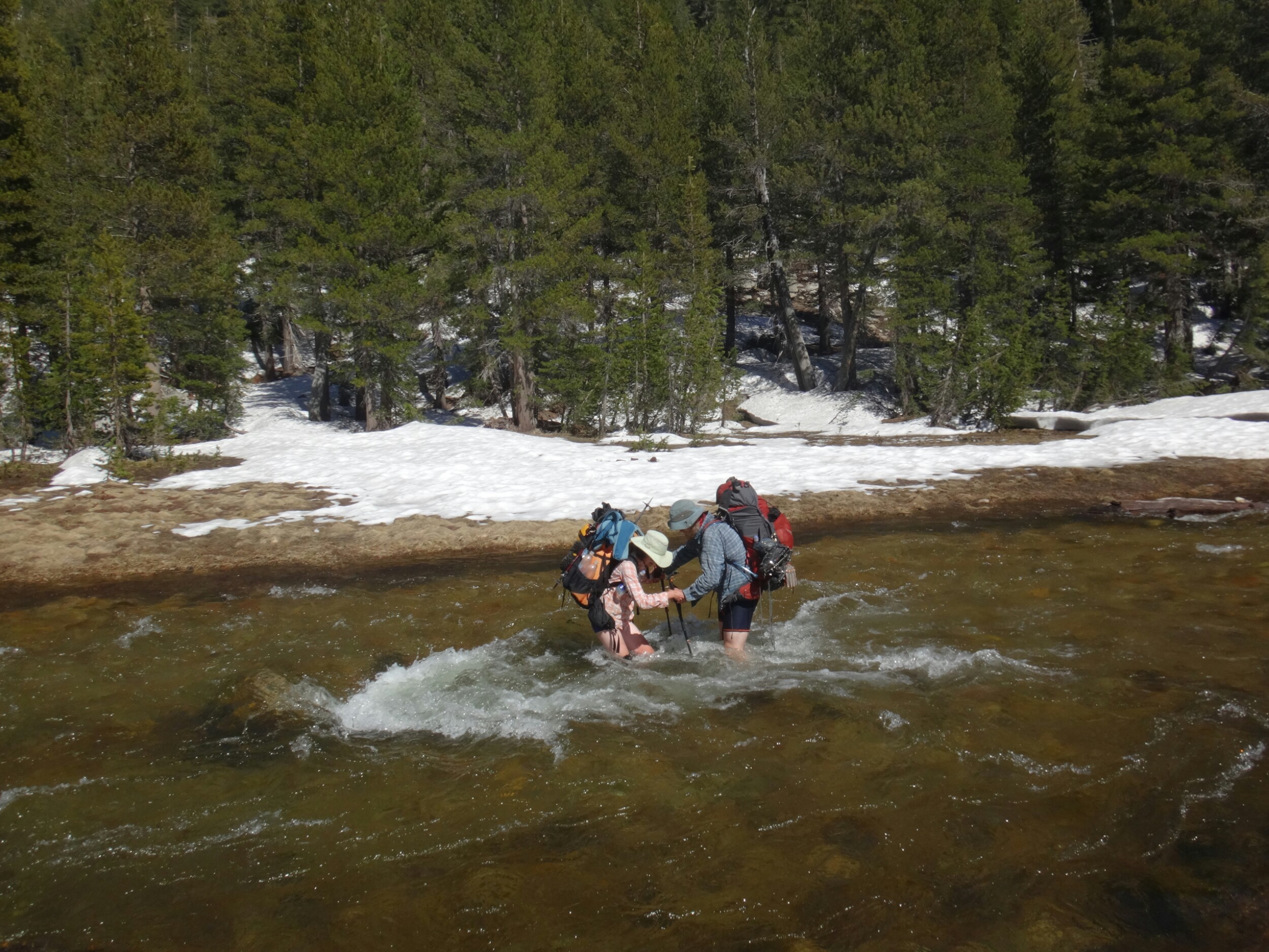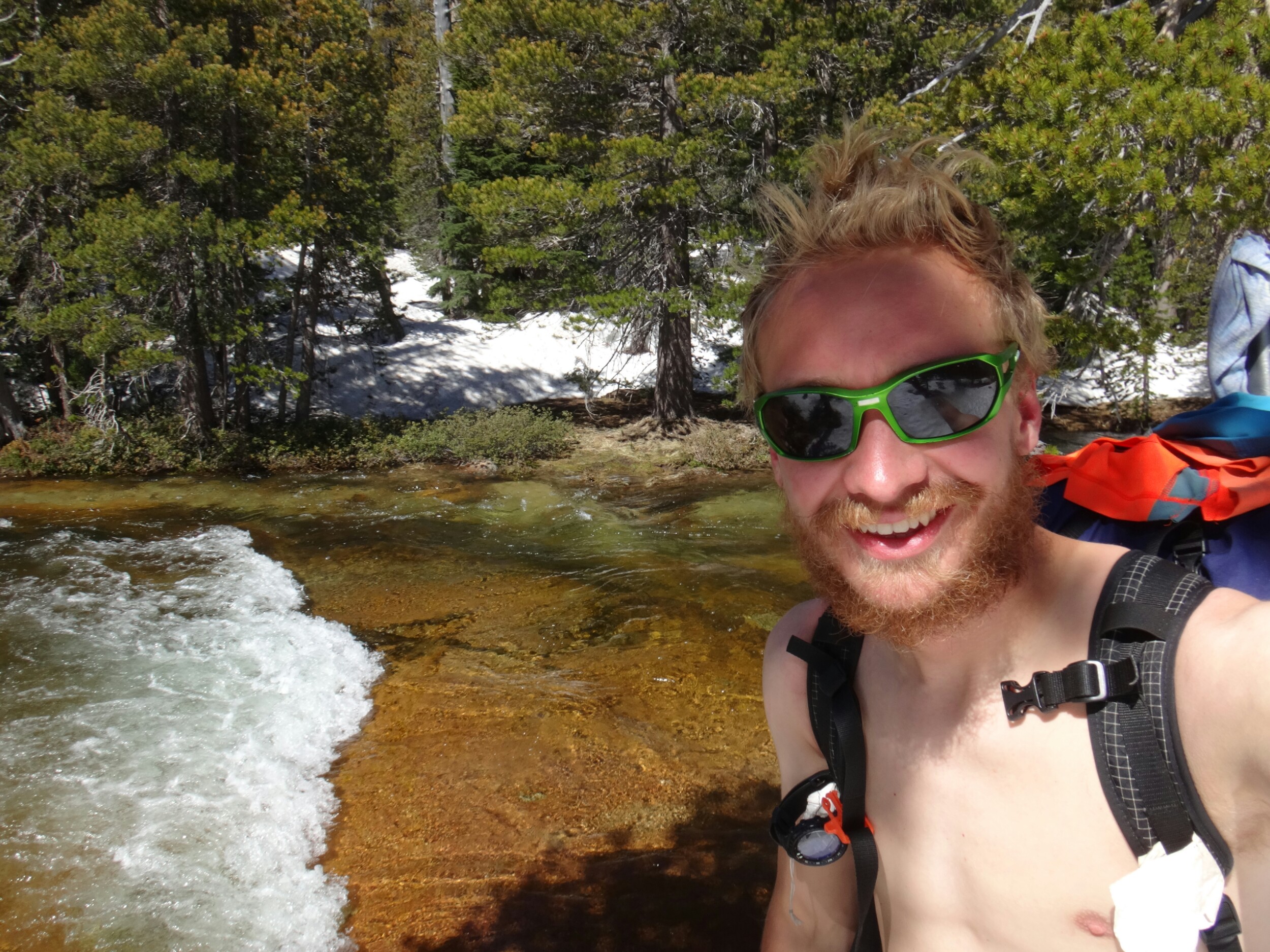 Wir sind um 5 aufgestanden und der erste Blick galt dem McCabe Fluss. Er sah niedriger aus als gestern. Die Anspannung war förmlich zu greifen. Wir packten und standen um 6 am Fluss bereit um die anderen zu treffen. RockDoc war bereit die Überquerung durchzuziehen. Wir gestikulieren mit Zeichensprache über den Fluss da es so laut ist und man kein Wort versteht. Wir warten noch bis die Sonne draußen ist. Wir haben null Grad. Wir warten also auf den Sonnenaufgang und die Anspannung wächst und wächst. Ich laufe die meiste Zeit im Kreis um mich warm zu halten und unterdrücke den ständigen Drang pinkeln zu müssen. Als die Sonne noch ein paar Meter weg ist ziehen sich Rattler und Griz bereits aus und starten die Überquerung. Sie schaffen es zu uns und begrüßen uns mit einer feuchten Unarmung. Nachdem sich die beiden ein wenig aufgewärmt haben fangen Rattler und ich an. Das Wasser fühlt sich warm an. Das kommt davon wenn man bei null Grad in Unterhose wartet. Aber es wurde schnell kalt. Schritt für Schritt. Immer tiefer in die schäumenden Passagen laufe ich mit dem Rücken zum Fluss und Rattler schaut aufwärts. So können wir die starken Kräfte der Stromschnellen bezwingen. Ich suche einen sicheren Stand bevor ich Rattler das Zeichen gebe weiter zu laufen. Wir kommen in den letzten richtig schnellen und tiefen Abschnitt. Mein rechter Schuh wird mir von der Strömung ausgezogen und schwimmt davon. Ich spüre nur noch Schmerzen. Die Kälte nimmt überhand und der Fuß sucht halt auf kleinen Felsen. Kurz bevor wir das Ufer erreichen spüre ich nichts mehr unterhalb der Hüfte. Meine Unterhose und T-Shirt sind nass. Ich laufe aus dem Wasser und mich überkommt ein noch nie dagewesener Schmerz. Es war so arsch kalt. Ich setzte mich und bin den Tränen nahe. Dann reibe ich langsam meine Oberschenkel in der Sonne. Die Füße spüre ich immer noch nicht. In der Zeit kommt auch RockDoc erfolgreich über den Fluss mit Griz. Sie sieht noch mitgenommer aus als ich. LovelyHeart kümmert sich um sie und sie wird mit Wärmepads aufgewärmt. Ich laufe langsam und barfuß über den Waldboden. Meine Füße sind kreideweiß. Die rechte Verse blutet ein wenig. Nur langsam kehrt etwas wärme zurück und ich ziehe kurze Hose und Schuhe an. Wir wärmen uns alle noch ein wenig und packen zusammen. Wir laufen zum nächsten Fluss. Return Creek. In nur 5 min sind wir an der Überquerung angekommen. Gestern ist übrigens noch Eric D. aufgetaucht. Der begleitet uns. Er macht die Überquerung solo. Wir suchen noch nach einer guten Stelle. Er war bis zur Hüfte drin. Das heißt trockene Unterhose aus und nasse wieder an. Rattler und LovelyHeart, danach Griz, RockDoc und ich queren den Fluss. Er ist tiefer und die Strömung lässt RockDoc fast aus den Latschen kippen. Auch hier wieder alle am zittern. Aber die Sonne ist jetzt schon stark und wir wärmen uns auf. Wir wollen uns fertig machen. Ich suche meine Mikrospikes und muss feststellen das ich sie ausgezogen habe um in die Schuhe zu kommen nachdem ich den ersten Fluss überquert habe. Die brauche ich, auch wenn ich Zuspruch benötige um nochmals in den Fluss zu gehen. Griz und ich gehen halt nochmal zurück und ich renne schnell die Mikrospikes holen. Und wieder durch den Fluss. Ohh man. Als wir dann endlich alle fertig sind steigen wir zum Spiller Fluss auf. Leicht am Hang laufen wir erst über Schnee und dann meist durch traumhaftes Gelände. Wir hören den Fluss schon von weitem. Auch hier queren wir wie bereits zuvor durchgeführt ohne Verluste. Es war zwar wieder sehr stark aber wir sind inzwischen sicherer zu dritt und können uns zu 110% auf die anderen verlassen. Auch hier machen wir eine ausgiebige Pause. Es sind zwar erst 2 km geschafft aber wir fühlen uns alle gerädert. Es geht einen wirklich steilen Hang hinauf und ich versuche so angenehm wie möglich zwischen den hohen Nadelbäumen an Höhe zu gewinnen. Es war kein Zuckerschlecken und die Sonne ist heute wieder richtig agressiv. Unter ein paar Bäumen machen wir eine kurze Pause bevor wir zur Mittagspause am See aufbrechen. Eric D. führt an und saust davon. Er ist schnell doch leider nimmt er das falsche Tal und wir müssen am Ende ca.45min extra bergauf und zurück auf den Trail laufen. Alle pusten sowieso schon aus den Löchern und dann das. Wir nagen an unseren Reserven und als wir zurück auf dem Trail sind und immer noch einige Meter bis zum See vorunsliegen beschließe ich auf der Stelle auf ein paar trockenen Steinen und Stellen die Mittagspause einzuläuten. Das kann jetzt jeder gebrauchen. Wir pausieren und erholen uns ein wenig. Wir lassen den See links liegen und queren über die Ridgeline. Es geht jetzt ins Tal hinab zum Matterhorn Creek. Rattler führt uns den beängstigenden steilen Berghang hinab. Wir müssen die Versen tief in den Schnee hauen damit wir überhaupt absteigen können. Wir kloppen so unsere Füße für 1,5 Stunden in den Schnee bis wir nochmal durch einen kleinen Nadelwald Klettereinlagen zwischen Bäumen, Felsen und Schneelöchern einfordern. RockDoc stürzt und ich laufe wieder bergauf. Aber ohne Rucksack. Nachdem sie sich irgendwie wieder zwischen Baumstümpfen und Schnee aufgerichtet hat versucht sie die letzten 4 Meter, sehr steil, abzusteigen. Da es nicht gelingt kommt sie wieder hoch und ich nehme ihren Rucksack den sie schon runter rutschen lassen wollte. Alles gut. LovelyHeart bricht auch noch über einem Fluss ein. Aber alle sind wohl auf als wir gleich danach die Talsohle unter unseren Füßen spüren. Der Matterhorn Creek ist zwar höher als normal sieht aber machbar aus. Ich fackel nicht lange und als ich die tiefe getestet habe bin ich gleich allein weiter durch. Kurz vor Schluss wurde es nochmals richtig anstrengend gegen die Strömung zu kämpfen aber ich habs gepackt. Die anderen ziehen sich auf der anderen Seite noch um während ich mit Eric D. in der Sonne sitzte. Als Pärchen kommen die anderen dann auch über den Fluss und ich helfe Rock