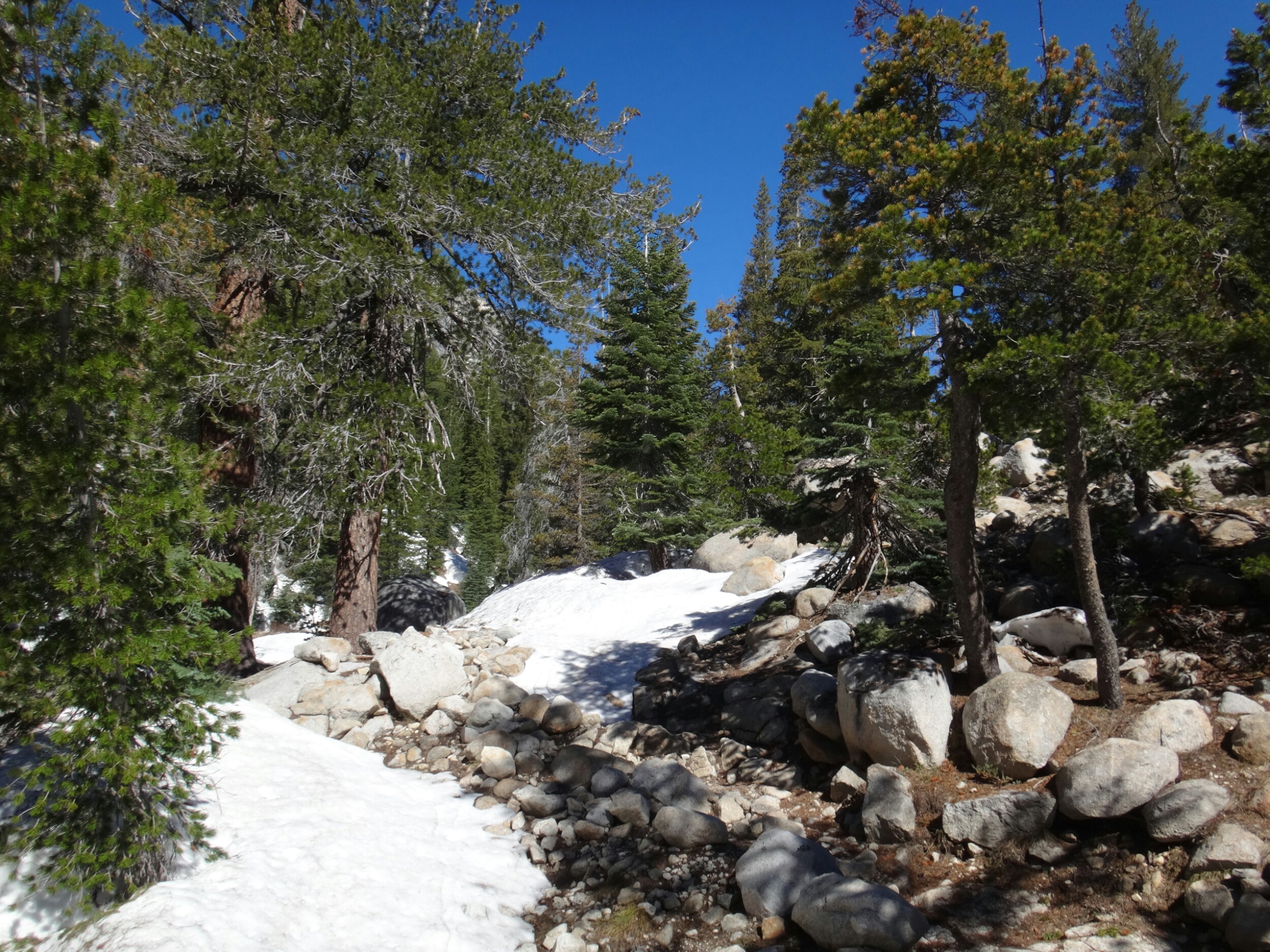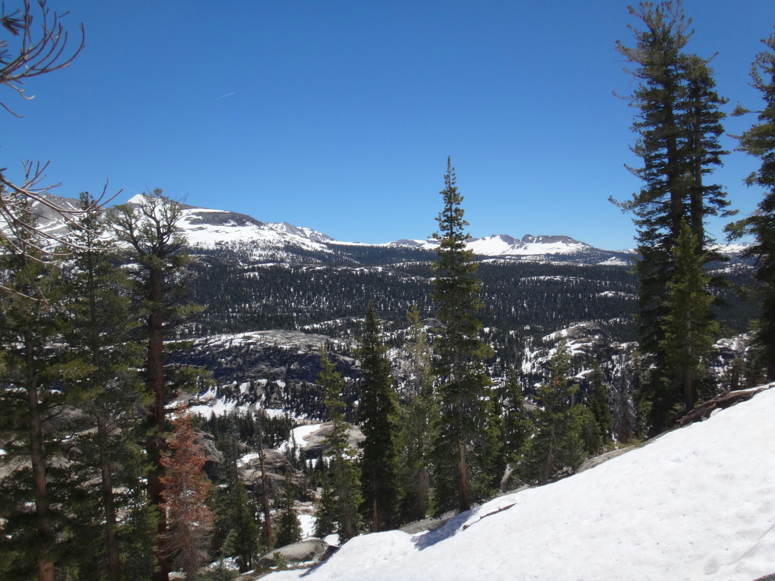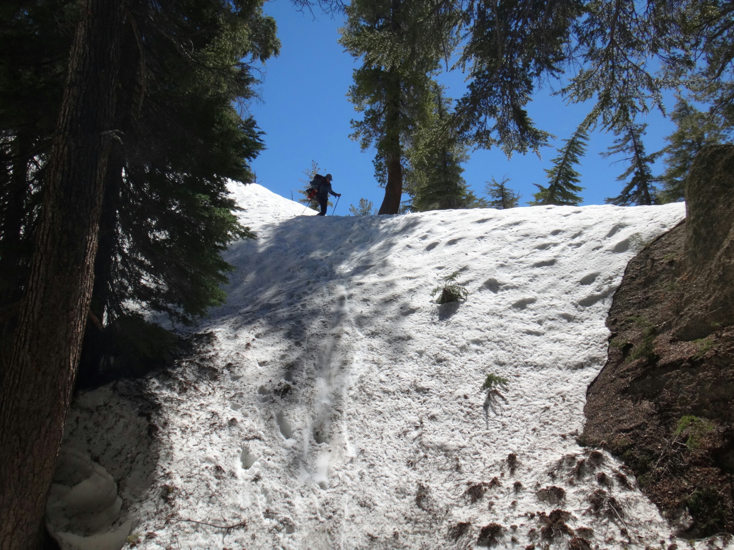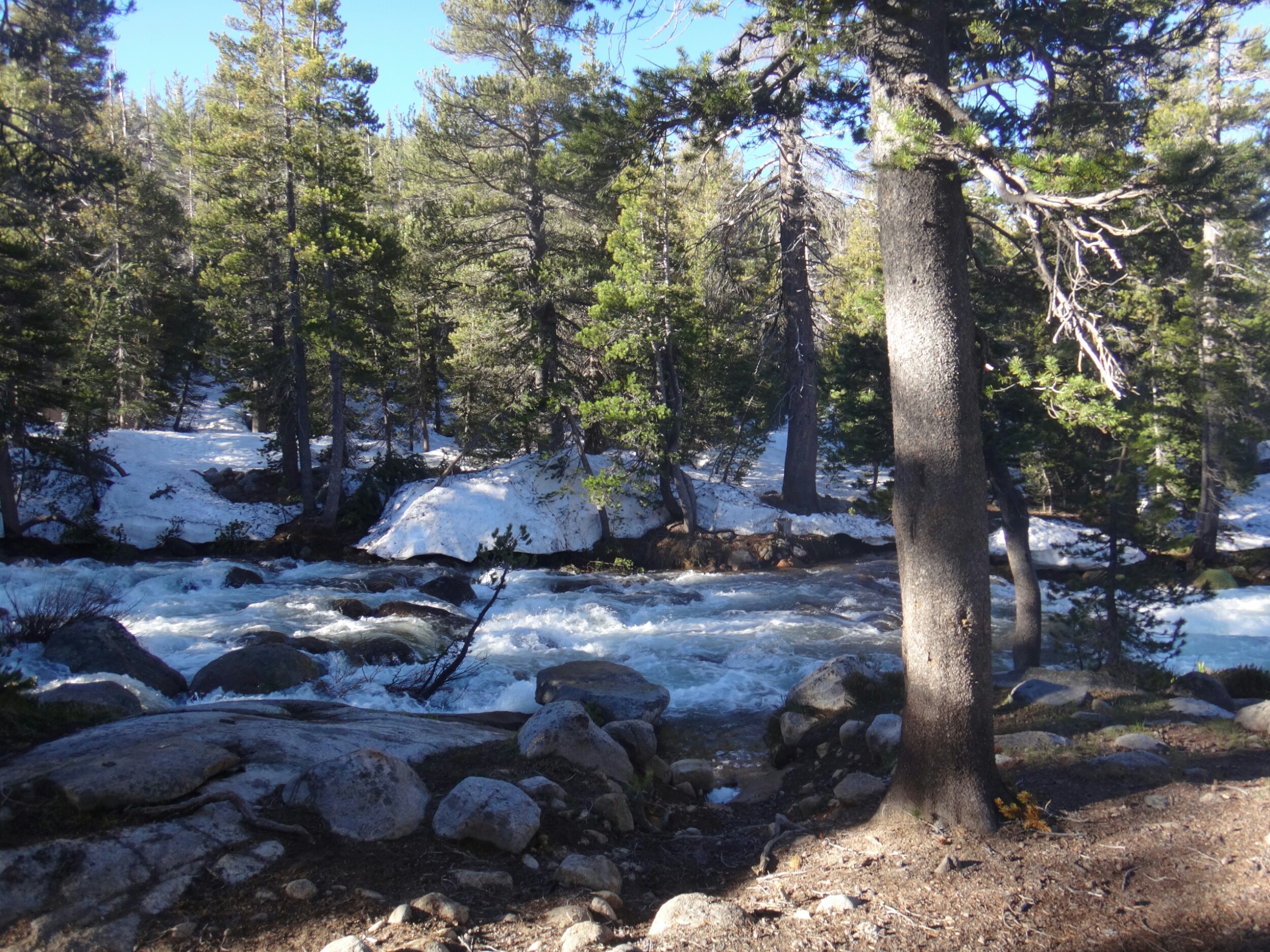 Wir sind um 5 aufgestanden und der erste Blick galt dem McCabe Fluss. Er sah niedriger aus als gestern. Die Anspannung war förmlich zu greifen. Wir packten und standen um 6 am Fluss bereit um die anderen zu treffen. RockDoc war bereit die Überquerung durchzuziehen. Wir gestikulieren mit Zeichensprache über den Fluss da es so laut ist und man kein Wort versteht. Wir warten noch bis die Sonne draußen ist. Wir haben null Grad. Wir warten also auf den Sonnenaufgang und die Anspannung wächst und wächst. Ich laufe die meiste Zeit im Kreis um mich warm zu halten und unterdrücke den ständigen Drang pinkeln zu müssen. Als die Sonne noch ein paar Meter weg ist ziehen sich Rattler und Griz bereits aus und starten die Überquerung. Sie schaffen es zu uns und begrüßen uns mit einer feuchten Unarmung. Nachdem sich die beiden ein wenig aufgewärmt haben fangen Rattler und ich an. Das Wasser fühlt sich warm an. Das kommt davon wenn man bei null Grad in Unterhose wartet. Aber es wurde schnell kalt. Schritt für Schritt. Immer tiefer in die schäumenden Passagen laufe ich mit dem Rücken zum Fluss und Rattler schaut aufwärts. So können wir die starken Kräfte der Stromschnellen bezwingen. Ich suche einen sicheren Stand bevor ich Rattler das Zeichen gebe weiter zu laufen. Wir kommen in den letzten richtig schnellen und tiefen Abschnitt. Mein rechter Schuh wird mir von der Strömung ausgezogen und schwimmt davon. Ich spüre nur noch Schmerzen. Die Kälte nimmt überhand und der Fuß sucht halt auf kleinen Felsen. Kurz bevor wir das Ufer erreichen spüre ich nichts mehr unterhalb der Hüfte. Meine Unterhose und T-Shirt sind nass. Ich laufe aus dem Wasser und mich überkommt ein noch nie dagewesener Schmerz. Es war so arsch kalt. Ich setzte mich und bin den Tränen nahe. Dann reibe ich langsam meine Oberschenkel in der Sonne. Die Füße spüre ich immer noch nicht. In der Zeit kommt auch RockDoc erfolgreich über den Fluss mit Griz. Sie sieht noch mitgenommer aus als ich. LovelyHeart kümmert sich um sie und sie wird mit Wärmepads aufgewärmt. Ich laufe langsam und barfuß über den Waldboden. Meine Füße sind kreideweiß. Die rechte Verse blutet ein wenig. Nur langsam kehrt etwas wärme zurück und ich ziehe kurze Hose und Schuhe an. Wir wärmen uns alle noch ein wenig und packen zusammen. Wir laufen zum nächsten Fluss. Return Creek. In nur 5 min sind wir an der Überquerung angekommen. Gestern ist übrigens noch Eric D. aufgetaucht. Der begleitet uns. Er macht die Überquerung solo. Wir suchen noch nach einer guten Stelle. Er war bis zur Hüfte drin. Das heißt trockene Unterhose aus und nasse wieder an. Rattler und LovelyHeart, danach Griz, RockDoc und ich queren den Fluss. Er ist tiefer und die Strömung lässt RockDoc fast aus den Latschen kippen. Auch hier wieder alle am zittern. Aber die Sonne ist jetzt schon stark und wir wärmen uns auf. Wir wollen uns fertig machen. Ich suche meine Mikrospikes und muss feststellen das ich sie ausgezogen habe um in die Schuhe zu kommen nachdem ich den ersten Fluss überquert habe. Die brauche ich, auch wenn ich Zuspruch benötige um nochmals in den Fluss zu gehen. Griz und ich gehen halt nochmal zurück und ich renne schnell die Mikrospikes holen. Und wieder durch den Fluss. Ohh man. Als wir dann endlich alle fertig sind steigen wir zum Spiller Fluss auf. Leicht am Hang laufen wir erst über Schnee und dann meist durch traumhaftes Gelände. Wir hören den Fluss schon von weitem. Auch hier queren wir wie bereits zuvor durchgeführt ohne Verluste. Es war zwar wieder sehr stark aber wir sind inzwischen sicherer zu dritt und können uns zu 110% auf die anderen verlassen. Auch hier machen wir eine ausgiebige Pause. Es sind zwar erst 2 km geschafft aber wir fühlen uns alle gerädert. Es geht einen wirklich steilen Hang hinauf und ich versuche so angenehm wie möglich zwischen den hohen Nadelbäumen an Höhe zu gewinnen. Es war kein Zuckerschlecken und die Sonne ist heute wieder richtig agressiv. Unter ein paar Bäumen machen wir eine kurze Pause bevor wir zur Mittagspause am See aufbrechen. Eric D. führt an und saust davon. Er ist schnell doch leider nimmt er das falsche Tal und wir müssen am Ende ca.45min extra bergauf und zurück auf den Trail laufen. Alle pusten sowieso schon aus den Löchern und dann das. Wir nagen an unseren Reserven und als wir zurück auf dem Trail sind und immer noch einige Meter bis zum See vorunsliegen beschließe ich auf der Stelle auf ein paar trockenen Steinen und Stellen die Mittagspause einzuläuten. Das kann jetzt jeder gebrauchen. Wir pausieren und erholen uns ein wenig. Wir lassen den See links liegen und queren über die Ridgeline. Es geht jetzt ins Tal hinab zum Matterhorn Creek. Rattler führt uns den beängstigenden steilen Berghang hinab. Wir müssen die Versen tief in den Schnee hauen damit wir überhaupt absteigen können. Wir kloppen so unsere Füße für 1,5 Stunden in den Schnee bis wir nochmal durch einen kleinen Nadelwald Klettereinlagen zwischen Bäumen, Felsen und Schneelöchern einfordern. RockDoc stürzt und ich laufe wieder bergauf. Aber ohne Rucksack. Nachdem sie sich irgendwie wieder zwischen Baumstümpfen und Schnee aufgerichtet hat versucht sie die letzten 4 Meter, sehr steil, abzusteigen. Da es nicht gelingt kommt sie wieder hoch und ich nehme ihren Rucksack den sie schon runter rutschen lassen wollte. Alles gut. LovelyHeart bricht auch noch über einem Fluss ein. Aber alle sind wohl auf als wir gleich danach die Talsohle unter unseren Füßen spüren. Der Matterhorn Creek ist zwar höher als normal sieht aber machbar aus. Ich fackel nicht lange und als ich die tiefe getestet habe bin ich gleich allein weiter durch. Kurz vor Schluss wurde es nochmals richtig anstrengend gegen die Strömung zu kämpfen aber ich habs gepackt. Die anderen ziehen sich auf der anderen Seite noch um während ich mit Eric D. in der Sonne sitzte. Als Pärchen kommen die anderen dann auch über den Fluss und ich helfe Rock