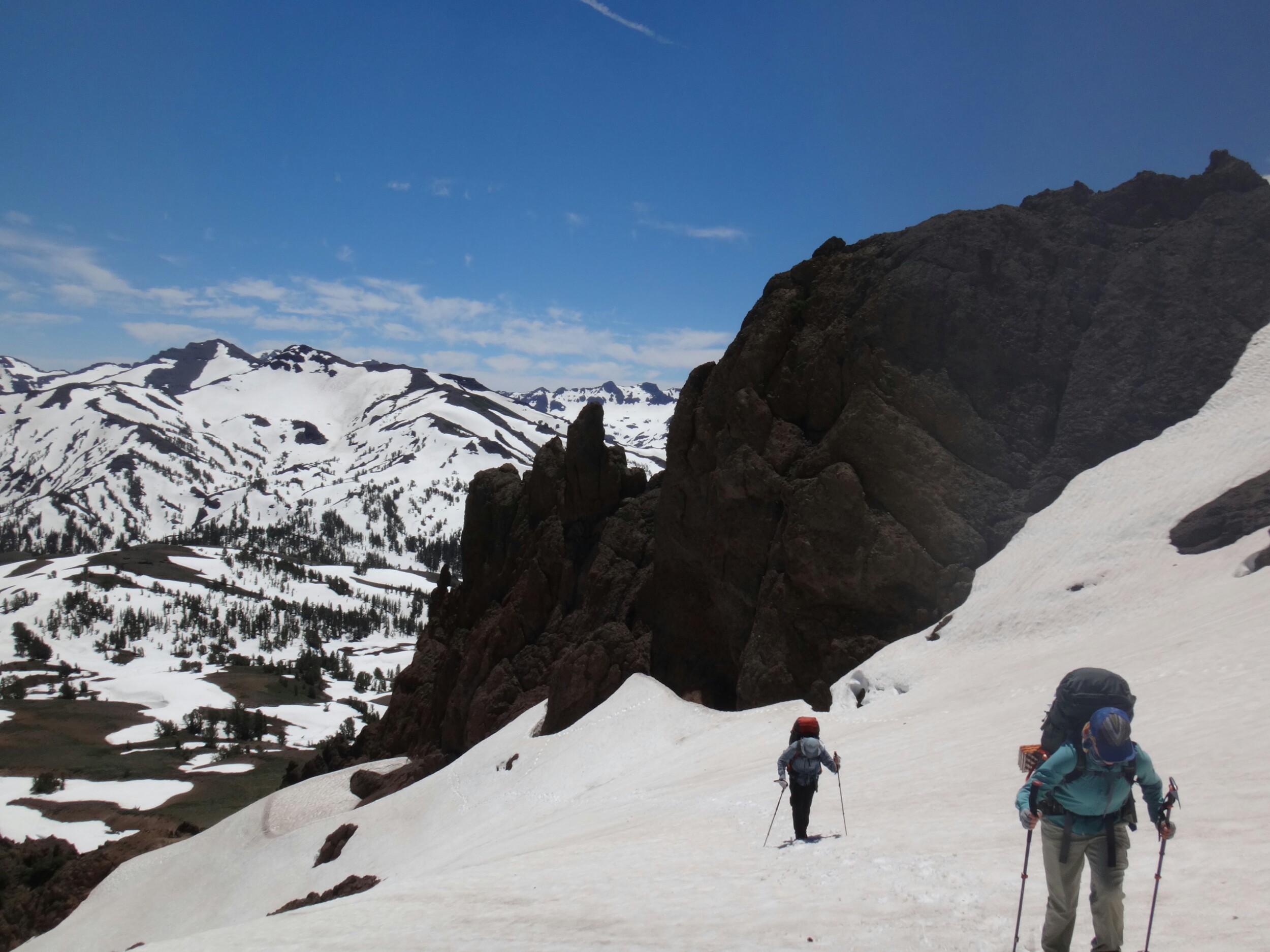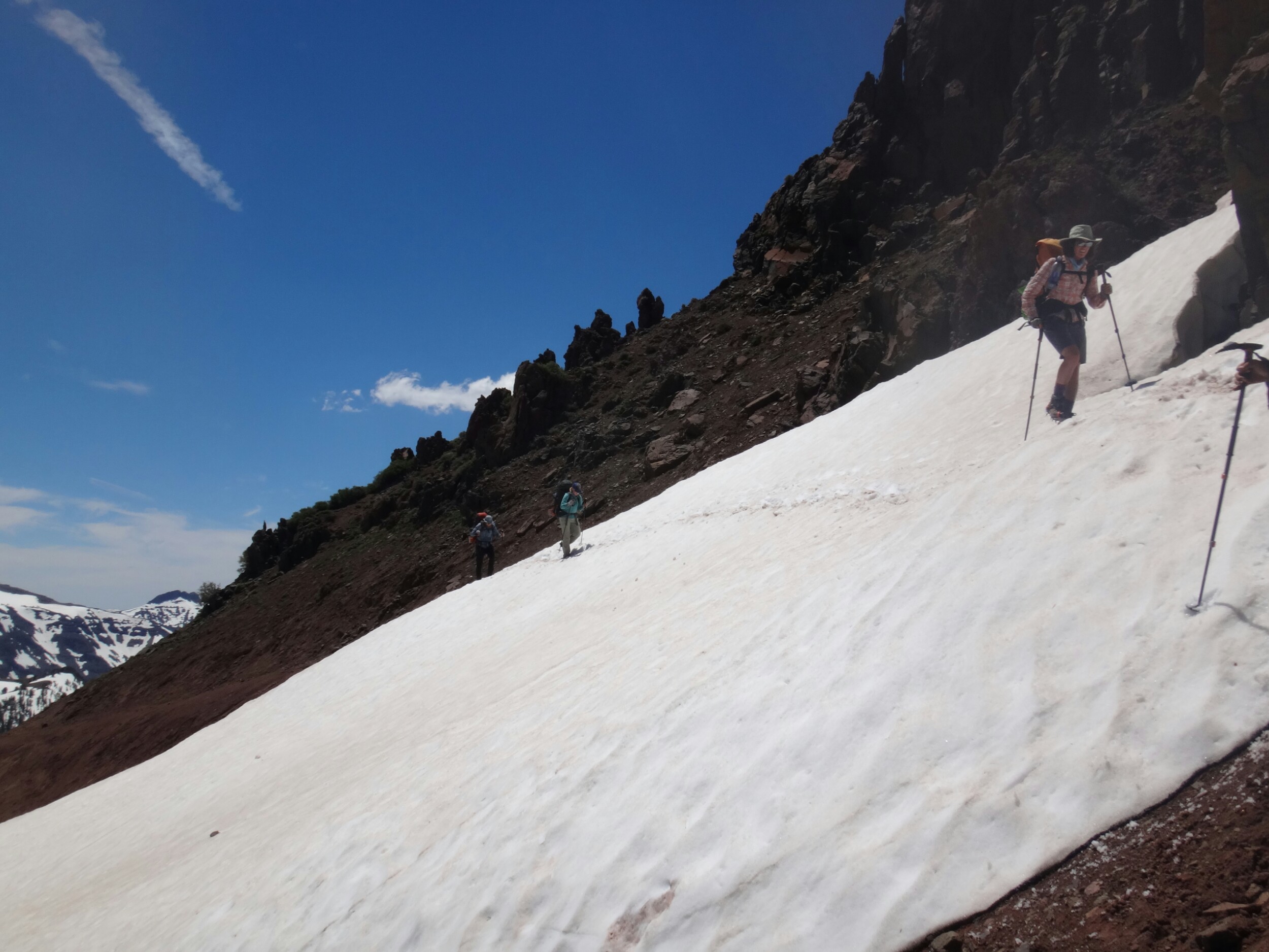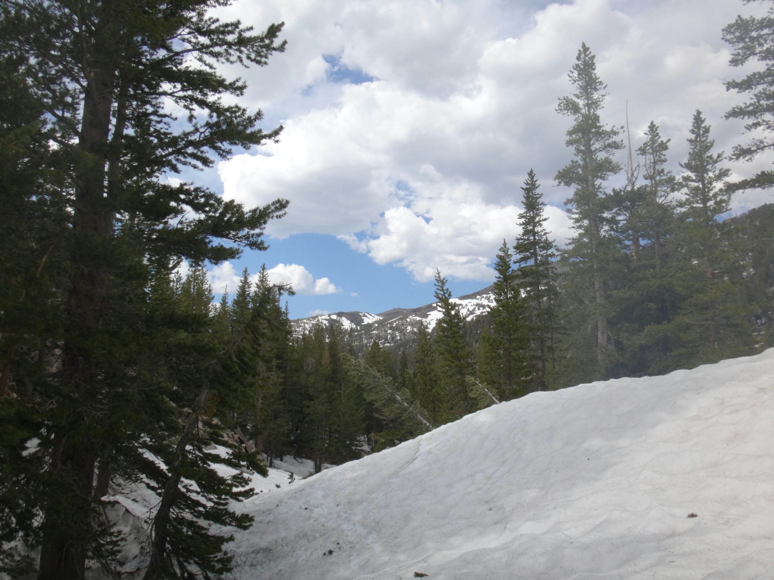Bis wir mal zum Hitchen kamen musdte noch so einiges erledigt werden. Bereits um 5 habe ich die restlichen Bilder hochgeladen. Danach gab es beim Bäcker Cappuccino und Croissant. Wie verfolgten die Kommentare auf unserem Video und ich packte meine Sachen. Ich habe gefühlt zu viel zu essen. Gegen 10 stehen wir an der Hauptstraße mit einem Schild Sonora Pass. Wir telefonieren mit einem Trailangel und sind gegen 11 auf dem Trail. Die Sonne ist schon brutal. Mit dem ganzen Zeug auf dem Rücken laufe ich nur langsam. Wir schlagen geradeaus direkt auf den Berg und folgen dann dem Trail. In regelmäßigen Abständen müssen wir lange Schneebretter überqueren. Als wir mit dem Abschnitt fertig sind legen wir Mittagspause ein. Ich esse meine Pizza die ich gestern geholt habe. Danach wieder eine endlose Traverse Richtung Tal was zu unserer linken liegt. Mir geht es so langsam immer schlechter. Mein Magen fühlt sich übel an und ich bekomme Kopfschmerzen. Nicht so mein Tag und ich quäle mich mehr den Trail hinunter. Zur linken ziehen Wolken auf und wie laufen durch das verschneite Tal weiter an einem Fluss entlang der unter uns fließt. Gegen 16 Uhr, die Wolken werden immer schlimmer, suchen wir uns einen trockenen Platz. Wir queren auf ein paar Schneebrücken den nun reißenddn Fluss und finden dort trockene Flecken Waldboden. Alle bauen schnell ihre Zelte auf. Danach vergrabe ich die Pizza hundert Meter von unsererm Platz. Ich mache mir noch eine Suppe und verschwinde dann früh im Bett. Weniger Minuten später, Donner ist schon lsnge zu hören, fängt es an zu hageln. Es prasselt nur so vom Himmel und es bilden sich auch noch Pfützen in meinem Zelt. Diese liegen allerdings unter meiner Luftmatratze und ich versuche mich einfach nicht mehr so viel zu bewegen und schlafe dann ein.