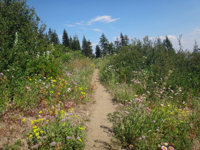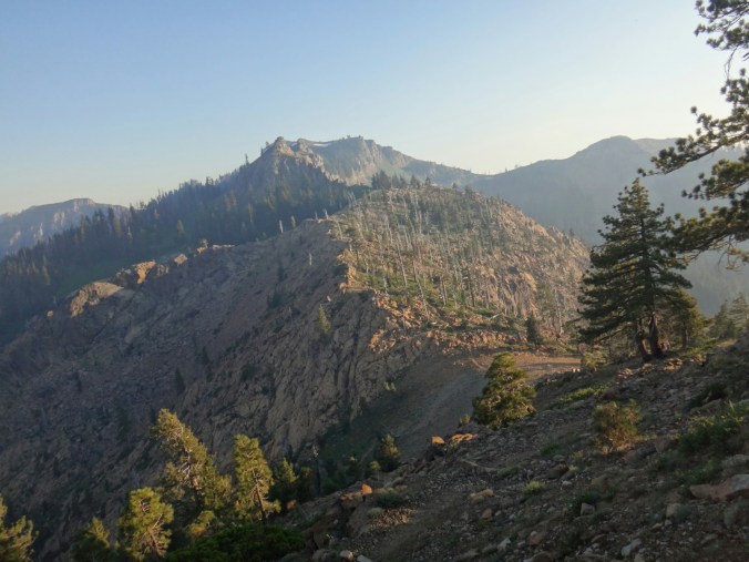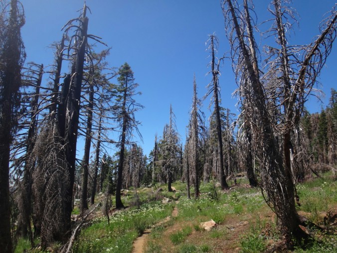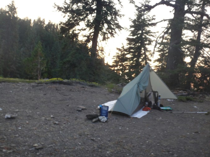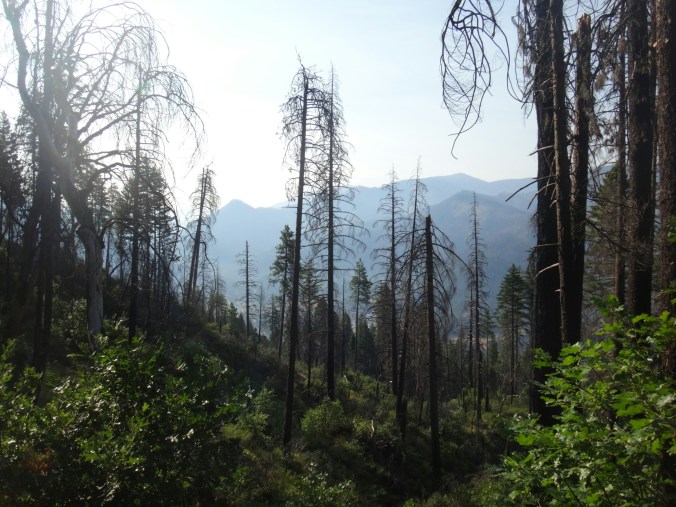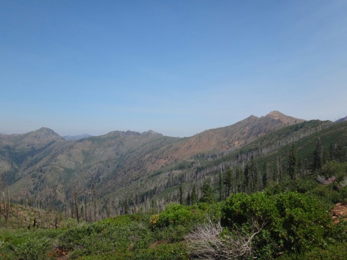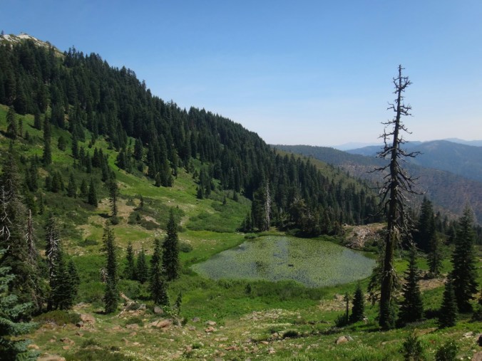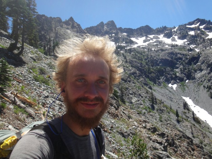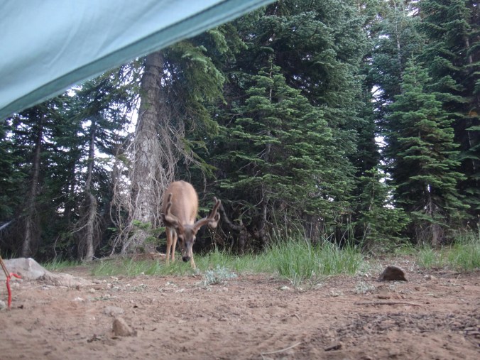 Ich hab mich einfach wieder umgedreht als die ersten an mir vorbei zogen. Dachte schon ich bin super spät dran. Nach einem Blick auf die Uhr konnte ich aber schon um 7.00 auf den Trail. Ich passierte den 1600 Meilen Marker und folgte dem Berg hinauf. Auf dem Bergrücken standen noch 2 Zelte in der Sonne und ich war froh auf der anderen Seite im Schatten zu laufen. Es ging immer leicht bergauf und ab. In den Tälern lag noch der Nebel. Aus einem Tal nicht weit entfernt stieg noch zusätzlich Rauch. Hier brennt es an einigen Stellen. Ich laufe den ganzen Tag am Berg entlang. Es idt wieder heiß. Gegen Mittag komme ich am einen See und kann Mittag im Schatten machen. Die Seen sind alle super klar aber bis auf ein paar Eidechsen sehe ich nichts schwimmen. Das Gelände ist ziemlich raff. Viele Steine und Wasser auf dieser Seite des Berges. Ich muss über ein Schneefeld wieder hoch um auf der anderen Seite weiter zu kommen. In der Ferne sehe ich die Marble Mountains. 2 weiße Berge die aus der Umgebung hinausstechen. Im Marble Tal gibt es eine Rainger Hütte an der ich kurz Rast mache und am Nachmittag endlich mal wieder ein paar Wanderer treffe. Von hier ist es nicht mehr mega weit und ich bin dem nicht abgeneigt. Allerdings geht es ersr wieder einige hundert Meter hinauf. Über mir fliegen die Löschhubschrauber ihre Einsätze. Der Wald wird ziemlich düster und die zu überquerenden Schneefelder tragen ihren Schatten dazu bei. Tief im Gras versunken laufe ich weiter. Ich treffe auf OptimisticTourtle bevor ich an einem See drei weitere Wanderer treffe. Aber ich will noch ein wenig höher und auf einer Ridgelinen pennen. Dort oben stürmt es aber ordentlich und ich koche nur schnell Abendessen bevor ich weiter ziehen muss. Leider wieder 100 Meter hinauf. Aber das geht schnell. Hier gehts in einem schönen Wald, abwechselnd zu Gras, über en Bergrücken. Zwischen ein paar Bäumen schlage ich mein Zelt auf. Gegen 20 Uhr liege ich in Bett. Zum Glück habe ich vor mein Zelt gepinkelt. Jetzt kann ich aus dem Schlafsack Bilder von einem jungen Hirsch schießen der Salzdurst hat. Allerdings läuft erndie halbe Nacht um mein Zelt. Ich schlafe trotzdem gut. Meine Schienbeine sind sind immer noch top. Allerdings hat mein rechtes Knie ab und an mal geschmerz. Aber man hat ja immer etwas das weh tut.