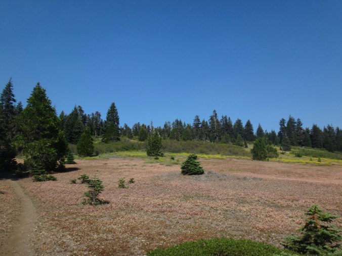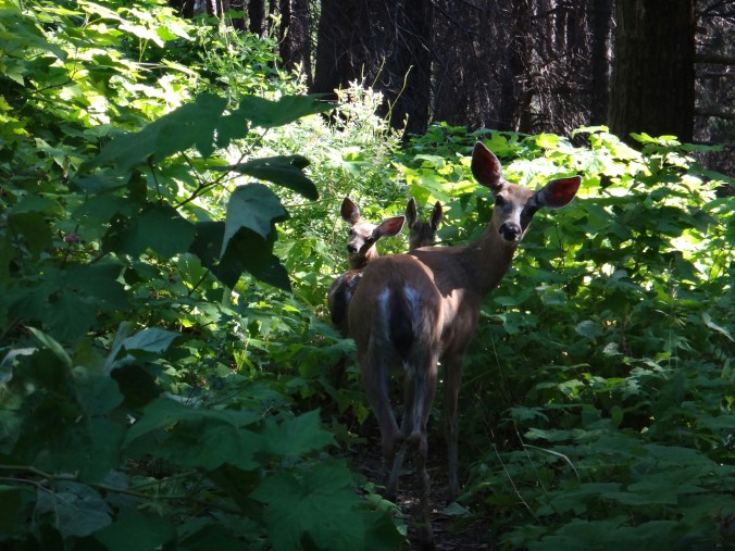 Zum Sonnenaufgang hab ichbes gerad noch raus geschafft. War aber trotzdem gemütlich. Um 6.40 gings los. Wieder am Berghang ging es seicht durch Wiesen und Wälder. Ich traf auf ein Reh das aber schnell verschwand. Der folgende Abstieg zog sich dann bis ins Tal über 1700hm und 35 km lang. Als ich mich einen Zeltplatz nährete sah ich gerade noch einen riesen Schwarzbären der allerdings braun war. Er schaute mich an und verschwand dann den Berg hinab. Ich zückte meine Kamera traf ihn aber nicht wieder an als ich langsam den selben Berg hinab stieg. Dafür traf ich zwischen dichten Buschwerk ein Reh mit ihren Kizz. Mein rechtes Knie startet im weiteren Abstieg wirklich zu schmerzen. Beim anheben und einknicken des Knies ist irgend etwas an der rechten Seite nicht in Ordnung. Aber bis zum Seiad Valley Campground sind es noch ca. 18 km. Das Tal macht mich im weiteren also echt fertig. Ich mache viele Pausen die gut tun. Aber danach geht’s fast kaum voran bis alles wieder warm ist. Echt mies. Am besten gehts wenn das Bein lang ist. Aber so kommt man hier nicht voran. Auch als ich aus dem Wald bin wird es nicht gerad besser. Es sind noch 10 km im Tal über Schotter- und Asphaltstraße. Es zieht sich ewig und bei 38 Grad im Schatten wird man langsam gebraten. Der große Fluss sieht sehr verführerisch aus. Zum Glück sorgen am Wegesrand unzählige Brommbeeren für ein wenig Abwechselung. Im Campground angekommen lege ich mein Bein hoch und verdrücke zuerdt 1,5 L Eiscreme. Dann gehts duschen und waschen. Ich warte auf Morgen um zu schauen wie es mit dem Knie geht. Eigentlich wollte ich heut noch 10 km laufen. War schließlich erst halb 4 als ich hier ankam. Das nervt echt. Aber was soll man machen. Immerhin gibts hier kalte Getränke. 😉